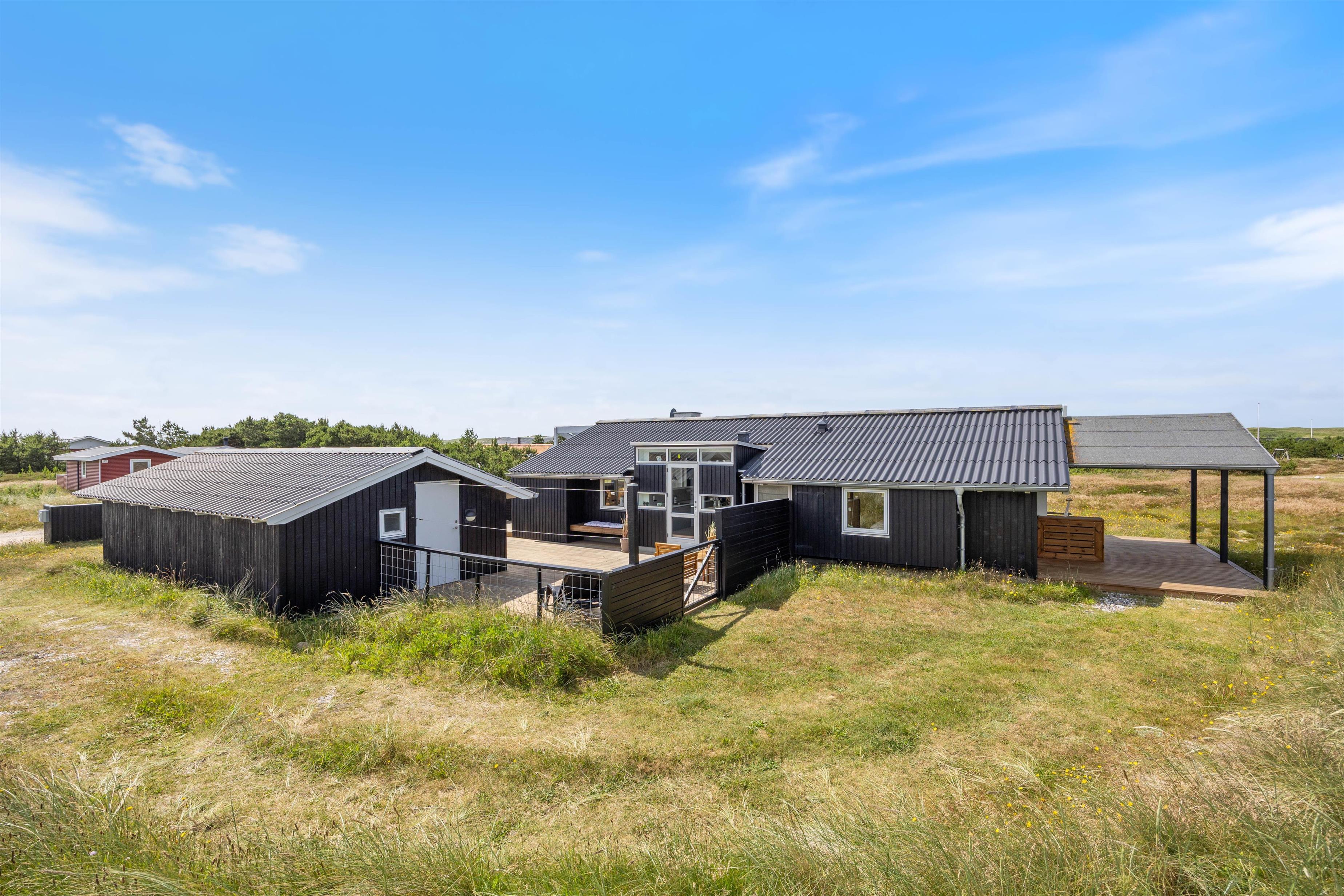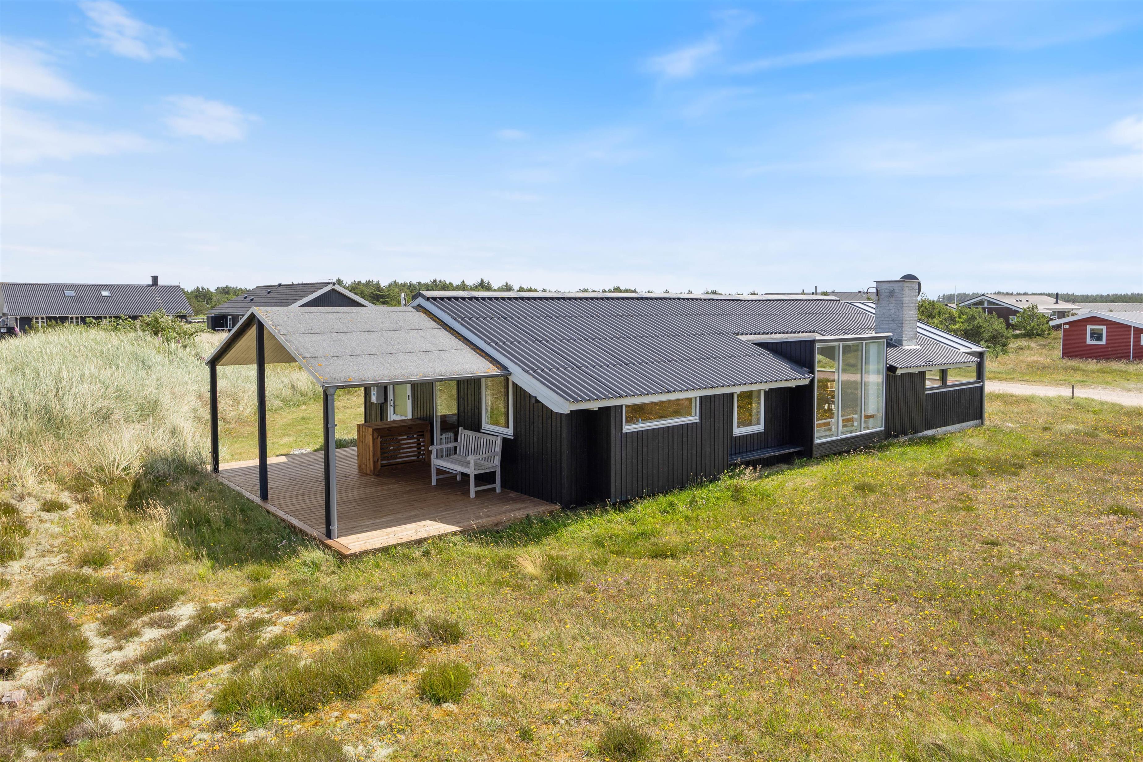 Feriehuset ligger på en stor, naturpræget grund, og udenfor venter en skøn, lukket terrasse med havemøbler, liggestole og grill. Her er der masser af plads til at slappe af, nyde solen og tilbringe lange sommerdage i fred og ro. Den lukkede terrasse gør det også trygt og praktisk for børnefamilier eller jer, der har en lille hund med på ferie.