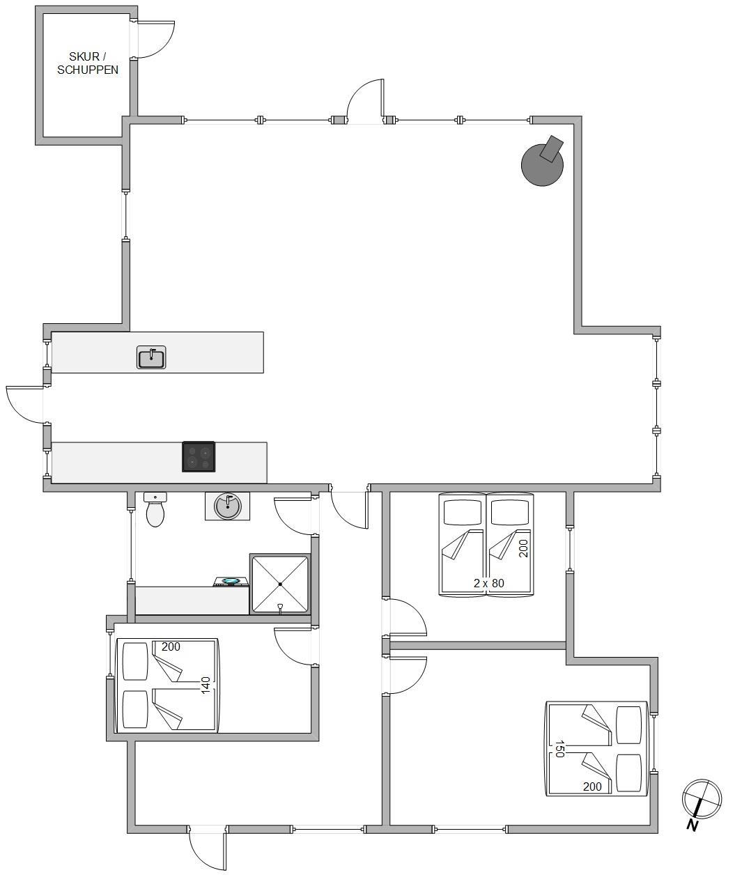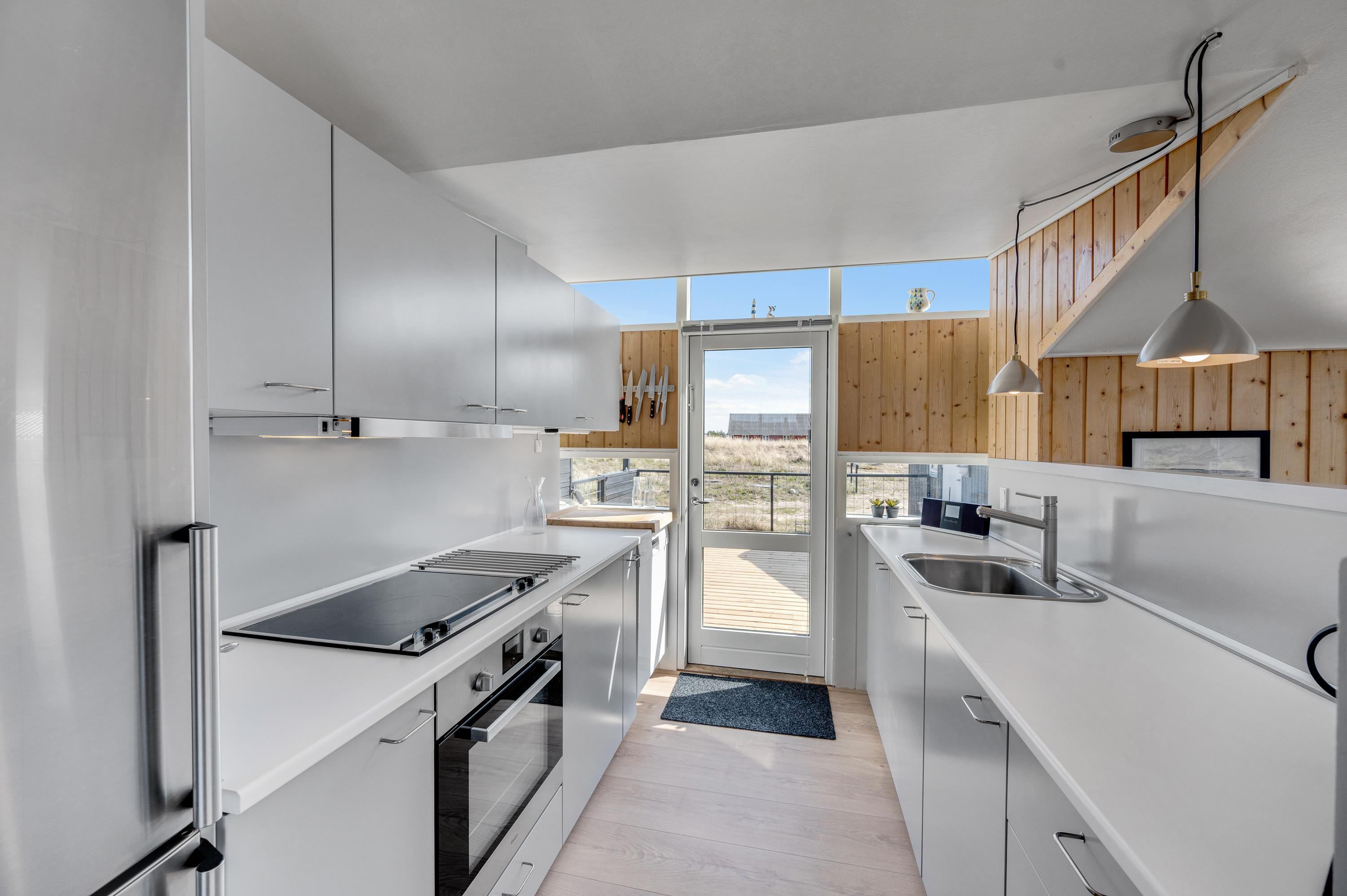 Køkkenet ligger i åben forbindelse med stuen og er enkelt, men veludstyret, så I nemt kan tilberede dagens måltider sammen. Indretningen i hele sommerhuset er enkel og hjemlig – helt perfekt, hvis I ønsker at trække stikket og være fuldt til stede i nuet, væk fra hverdagens krav og travlhed.