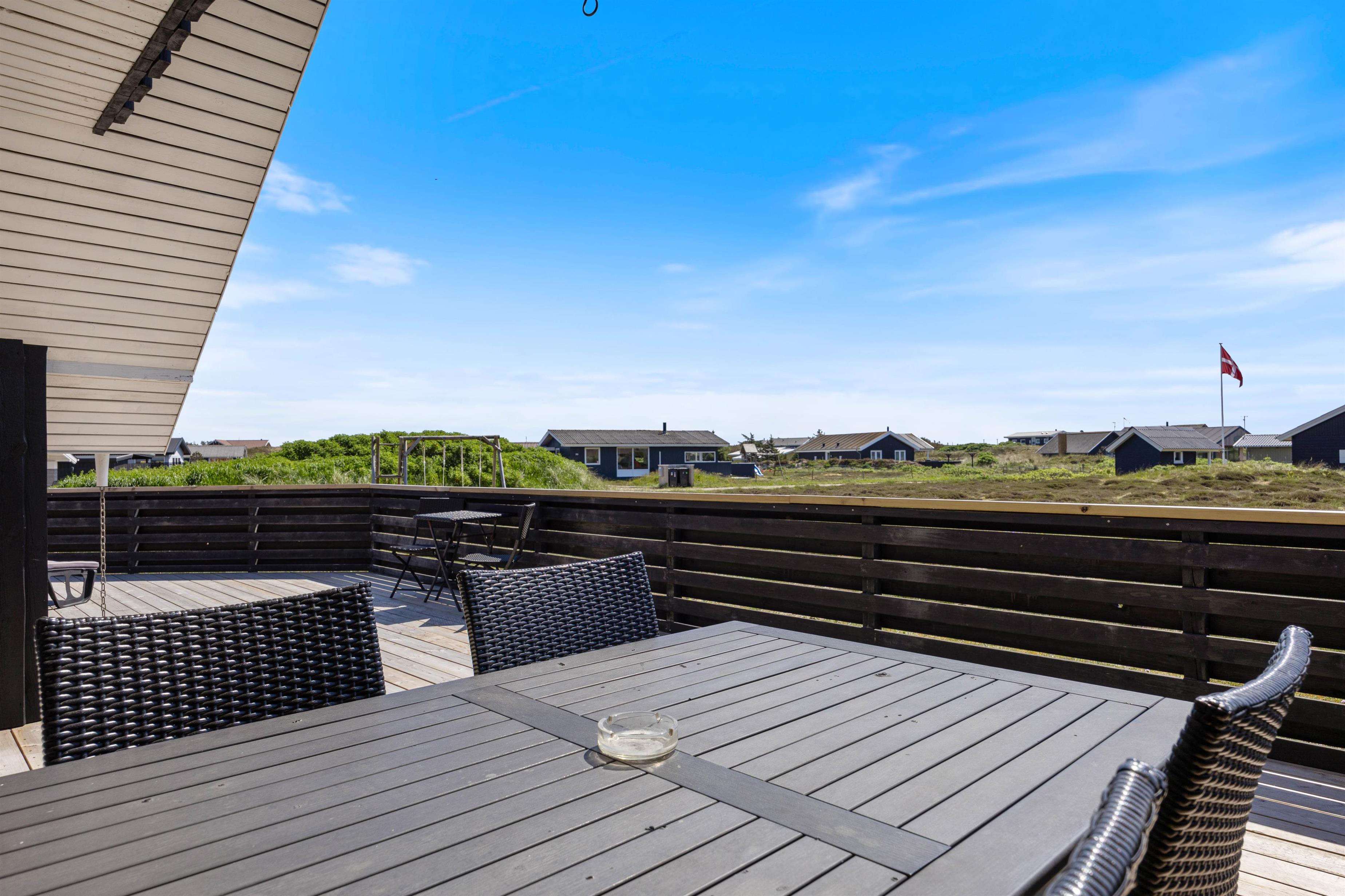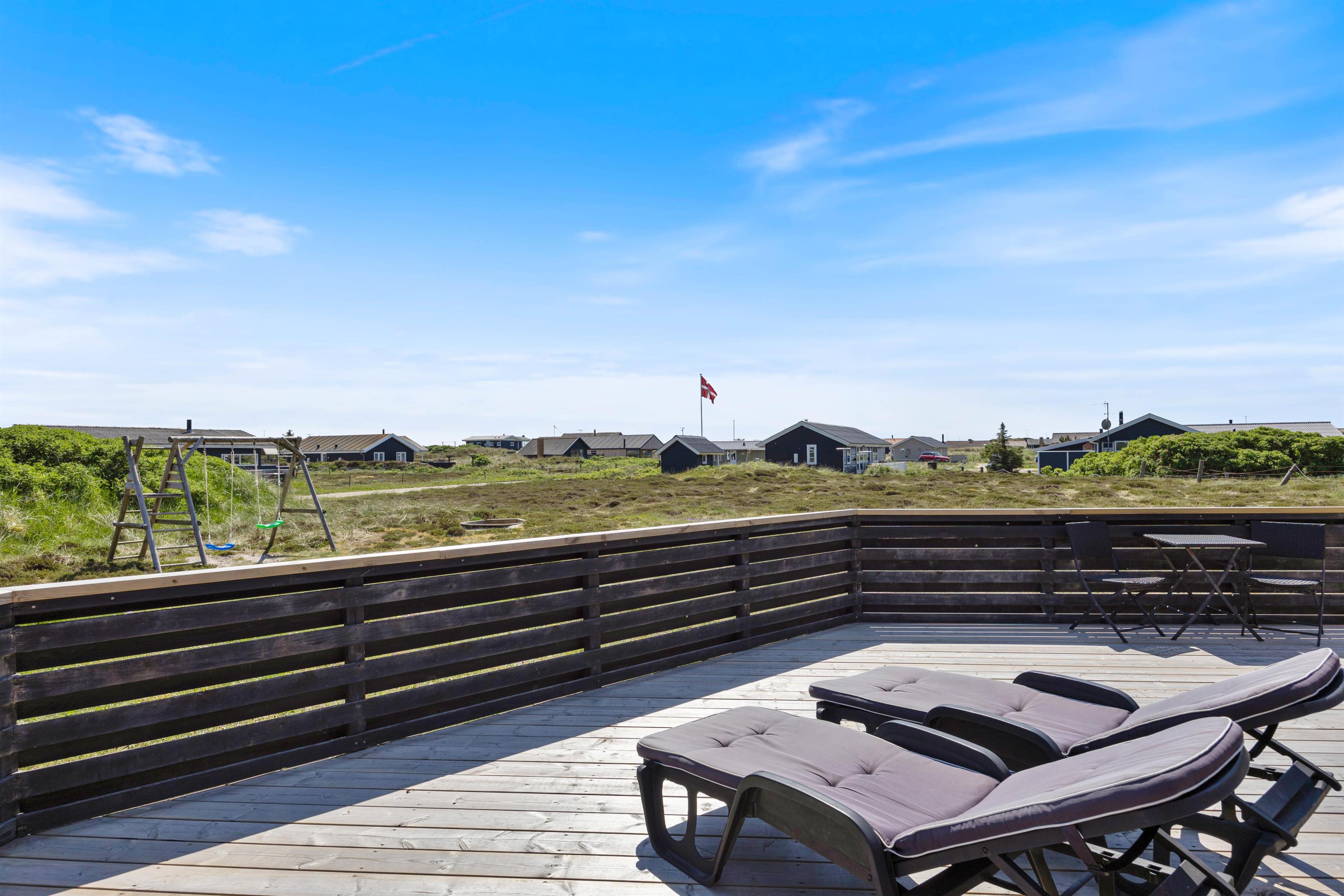 Sommerhuset har en dejlig, stor og lukket terrasse mod syd og sydøst, så den kan bruges fra morgen til aften. Her kan børnene og hunden trygt løbe frit omkring. De mindste kan desuden benytte sig af grundens sandkasse og gyngestativ, mens forældrene slapper af på liggestolene.