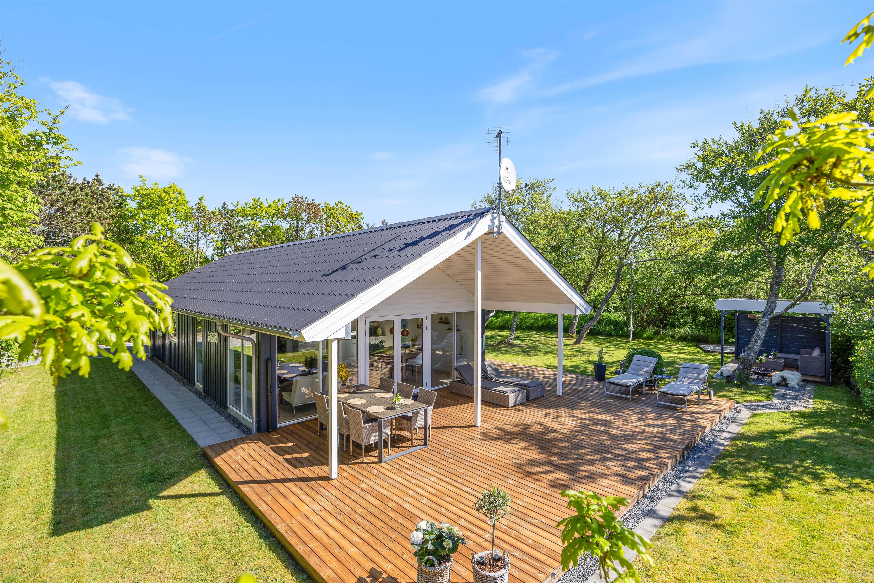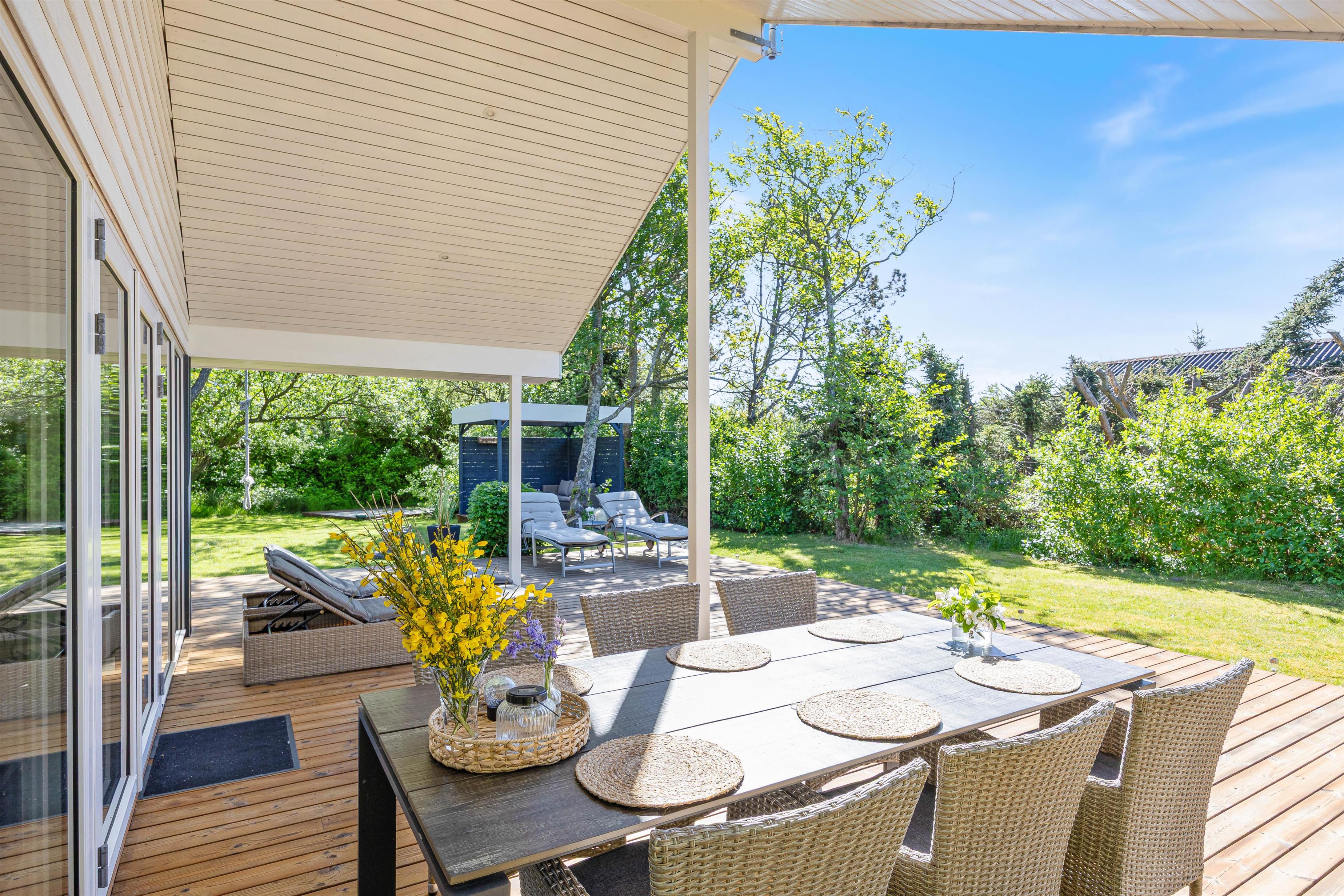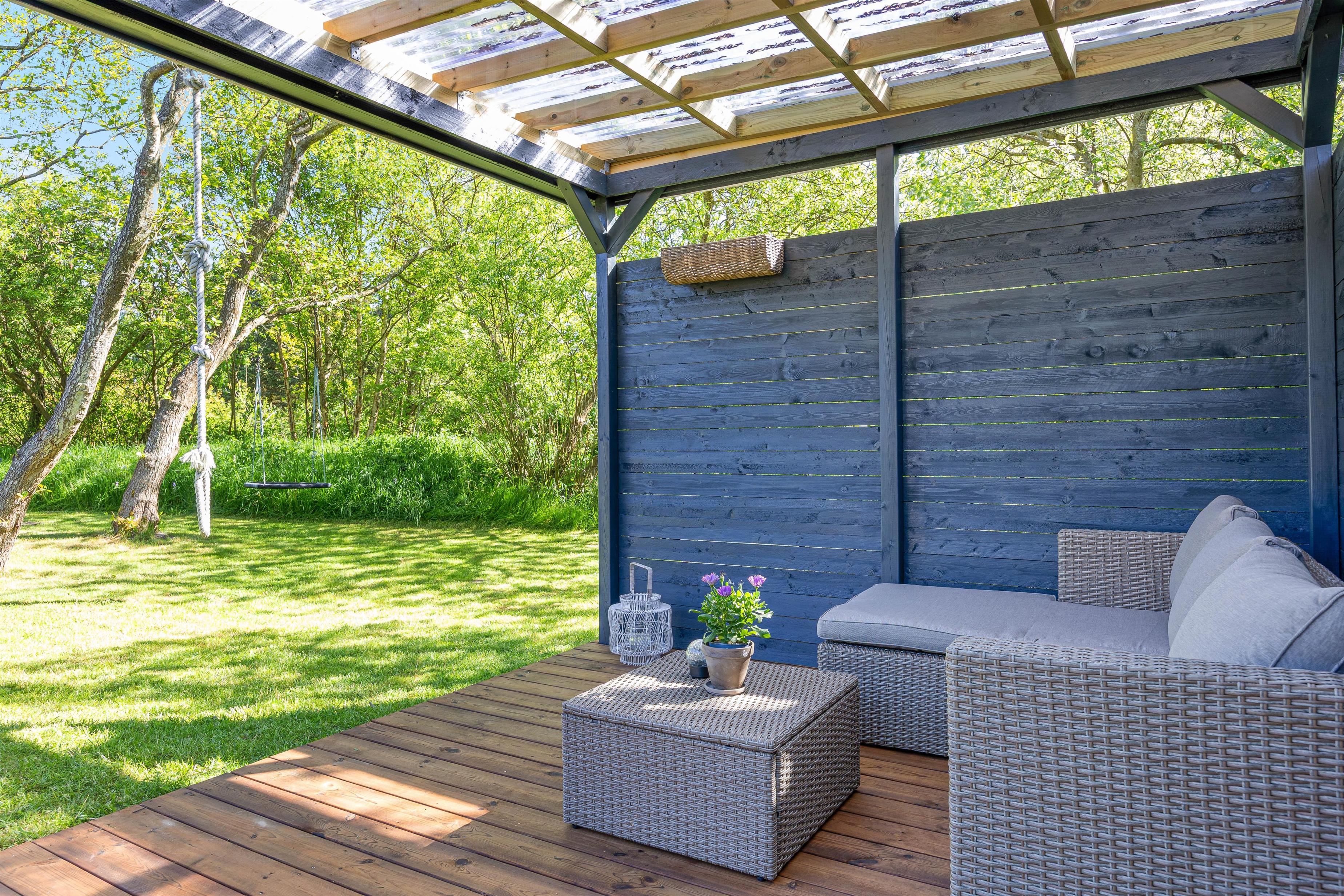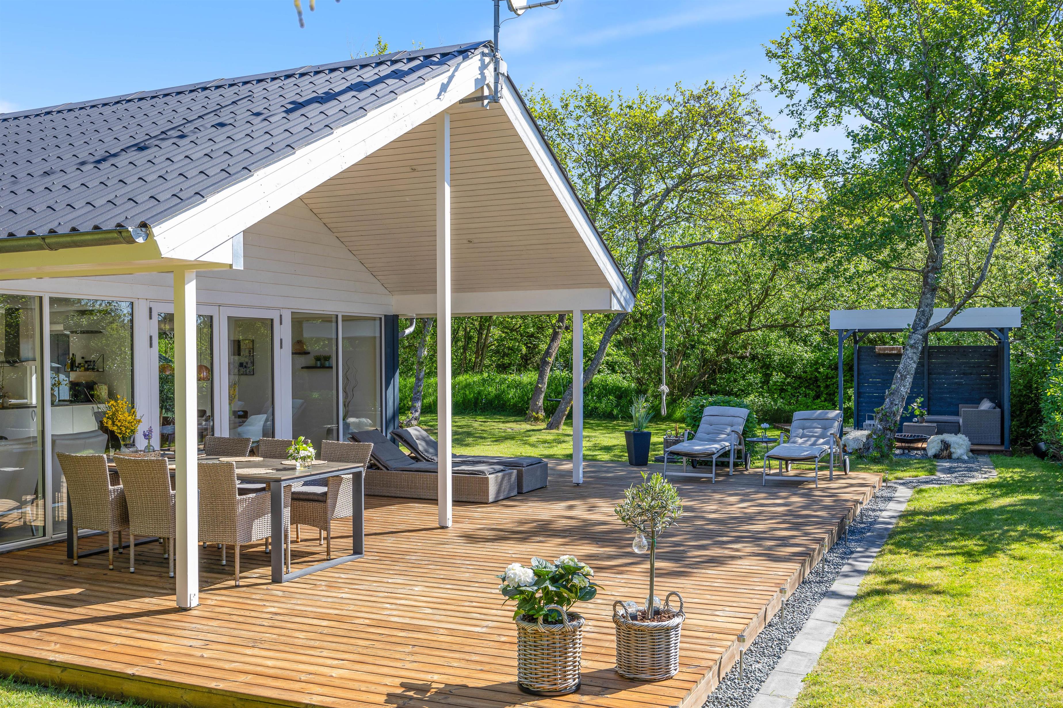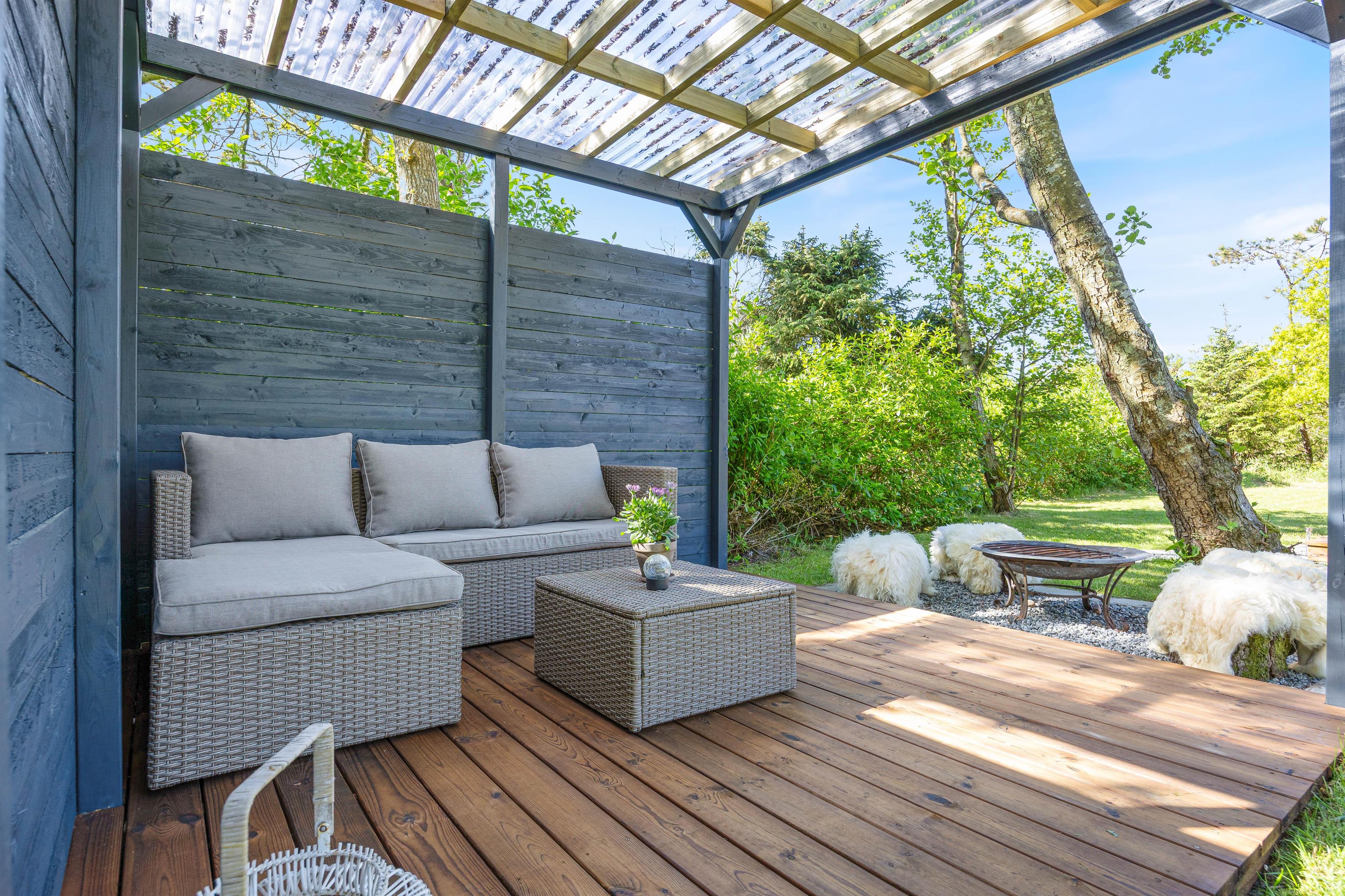 Fra stuen har I direkte udgang til den sydvendte terrasse, som er afskærmet og overdækket. Her kan I nyde middagssolen og slutte dagen af med et lækkert grillmåltid, imens solen går ned i vest. Grunden ligger på en stikvej og er omringet af træer, så I ugeneret kan sidde på terrassen. Aftenen kan sluttes af ved det hyggelige bålsted med snobrød og skumfiduser.