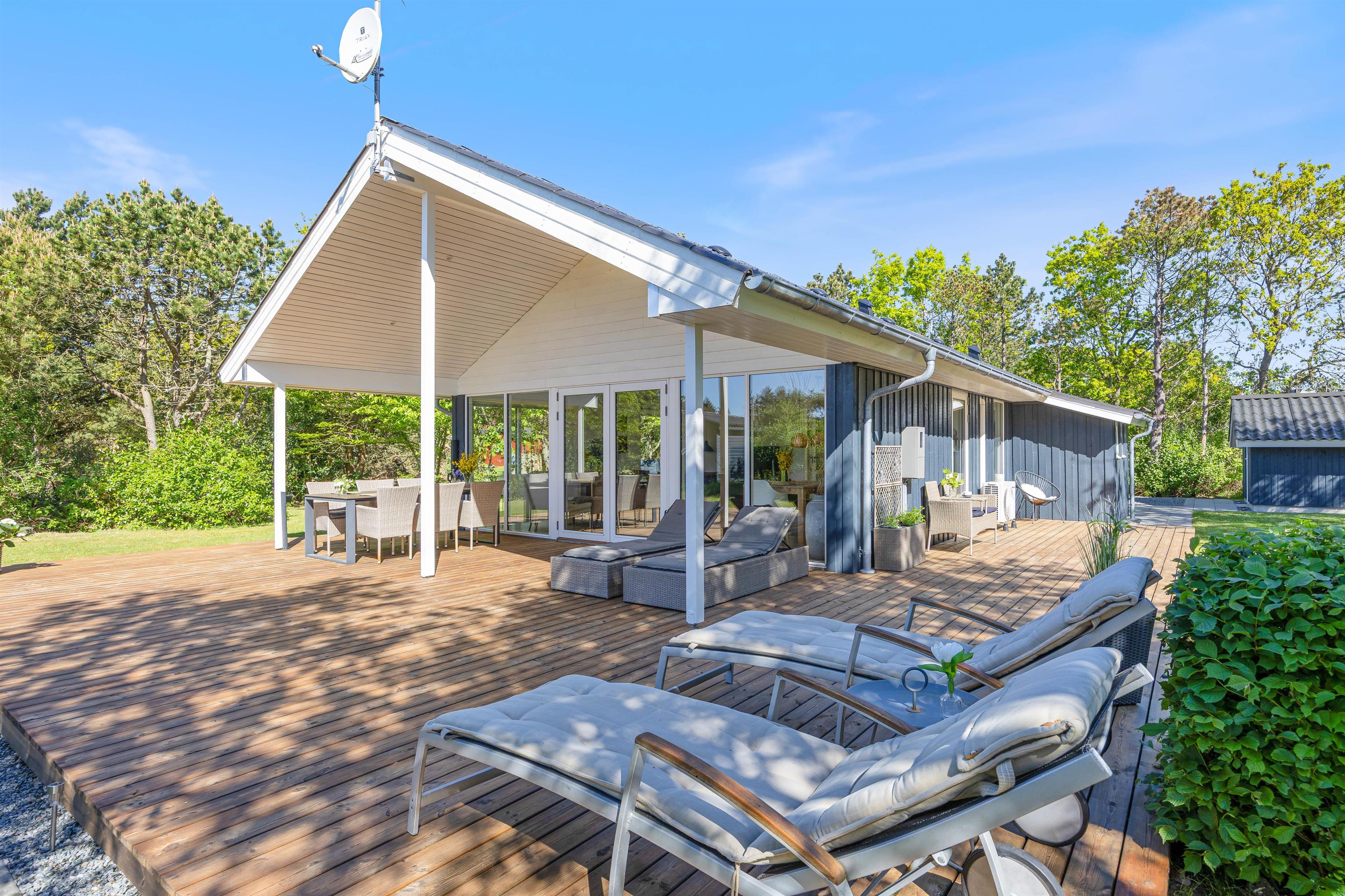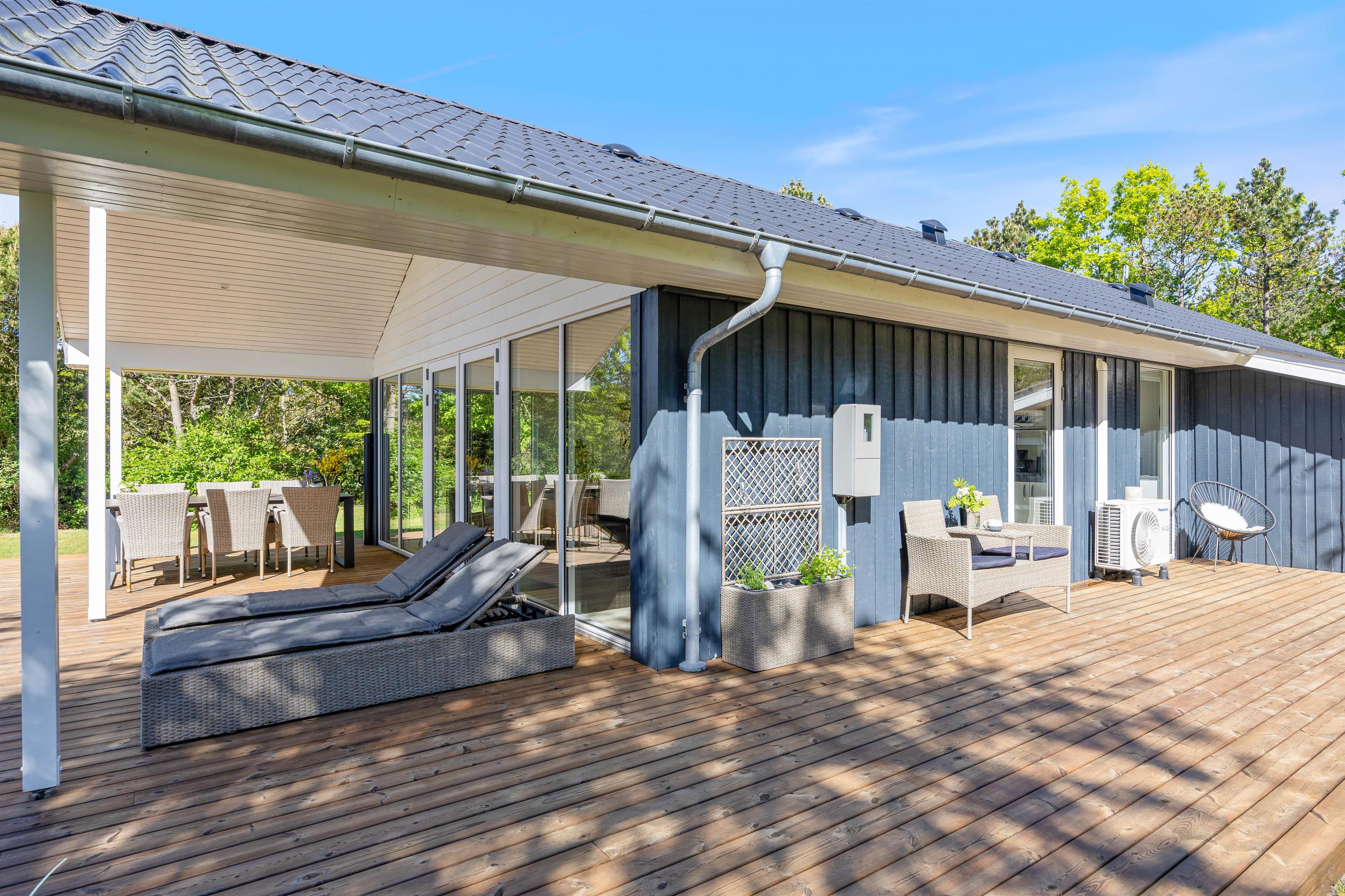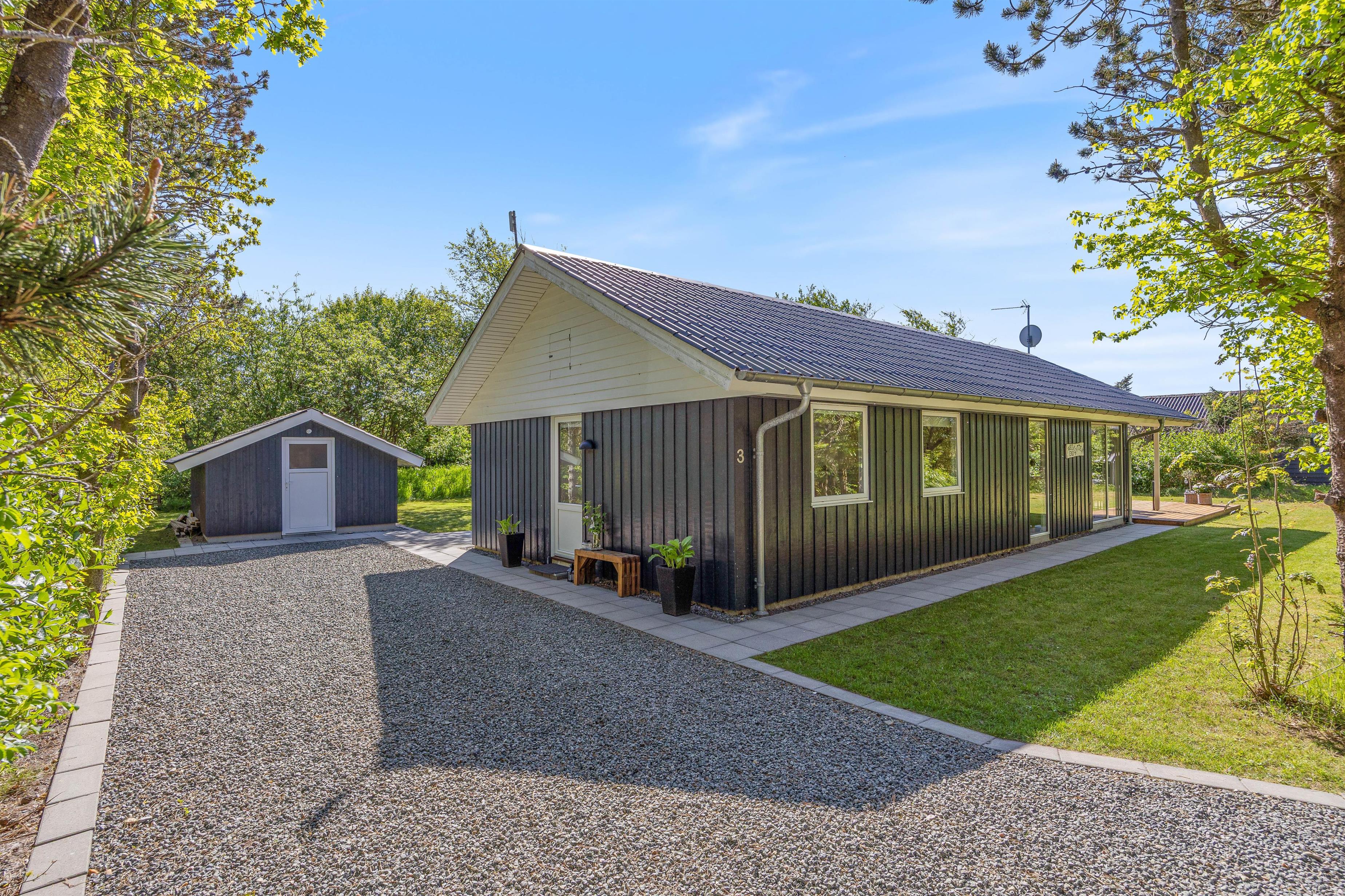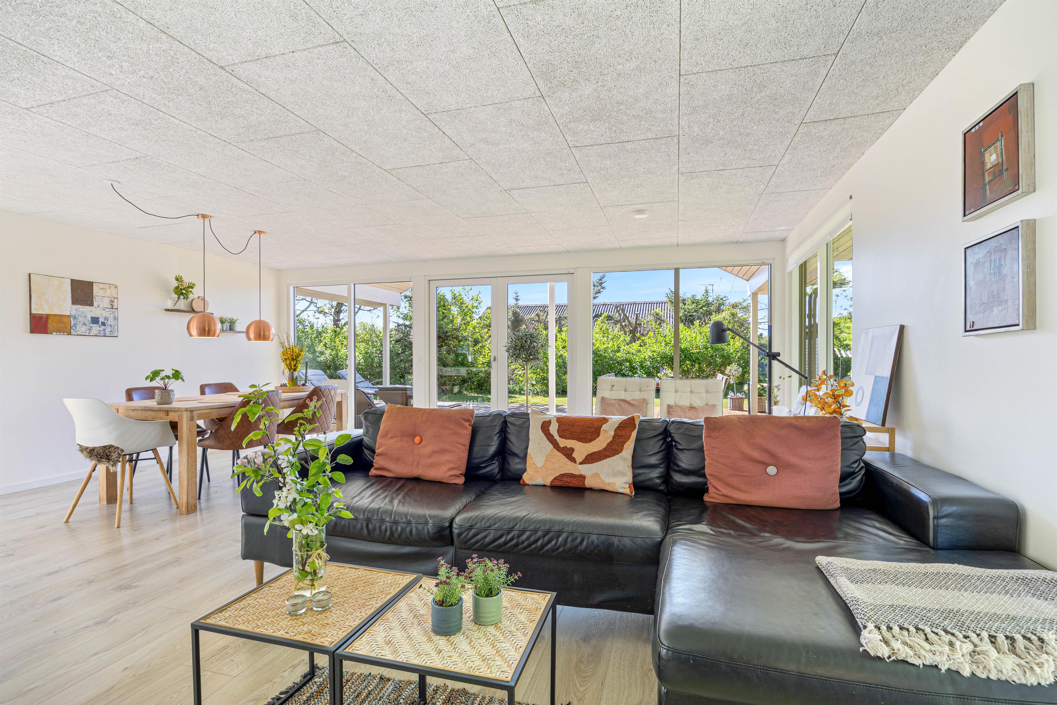 De store vinduer i opholdsrummet skaber et godt lysindfald, som gør rummet lyst og indbydende. Herfra har I også en fin udsigt til den skønne naturgrund, hvor børnene kan lege, imens I laver et lækkert aftensmåltid. I feriehuset er der desuden 3 gode soveværelser, hvor I kan slappe af og få en god nats søvn, inden morgendagens aktiviteter skal begynde. Derudover har badeværelset gulvvarme, og her finder I også vaskemaskine samt tørretumbler, så I har mulighed for at vaske tøj under ferien.