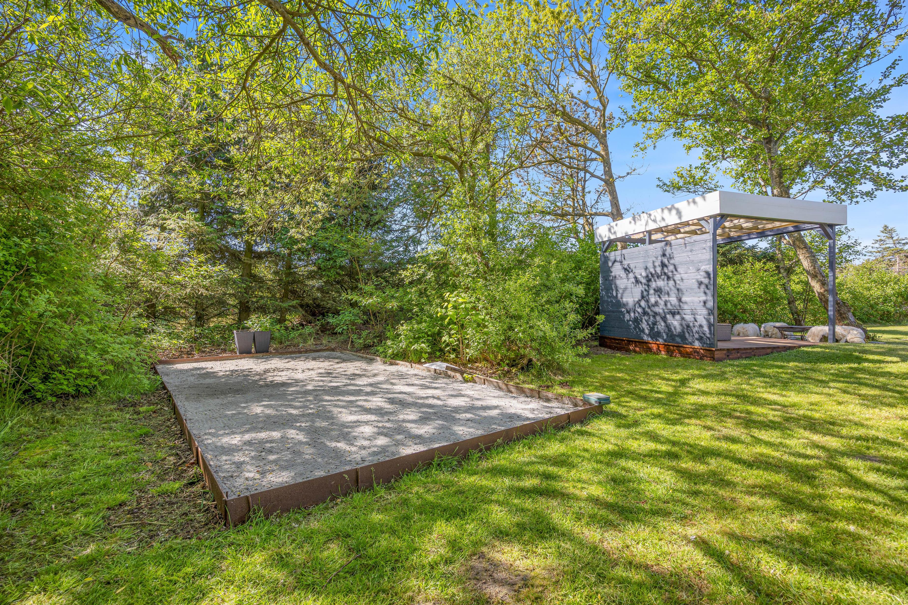 Naturgrunden er udstyret med en gynge til de yngste samt en udebruser (kan benyttes fra april til november). Her kan I skylle jer efter en god dag på stranden, som ligger 850 meter fra sommerhuset – måske I har været en tur i bølgen blå? Og som et ekstra plus er der en petanquebane på grunden, hvor I kan få mange timer til at gå med en spændende turnering.