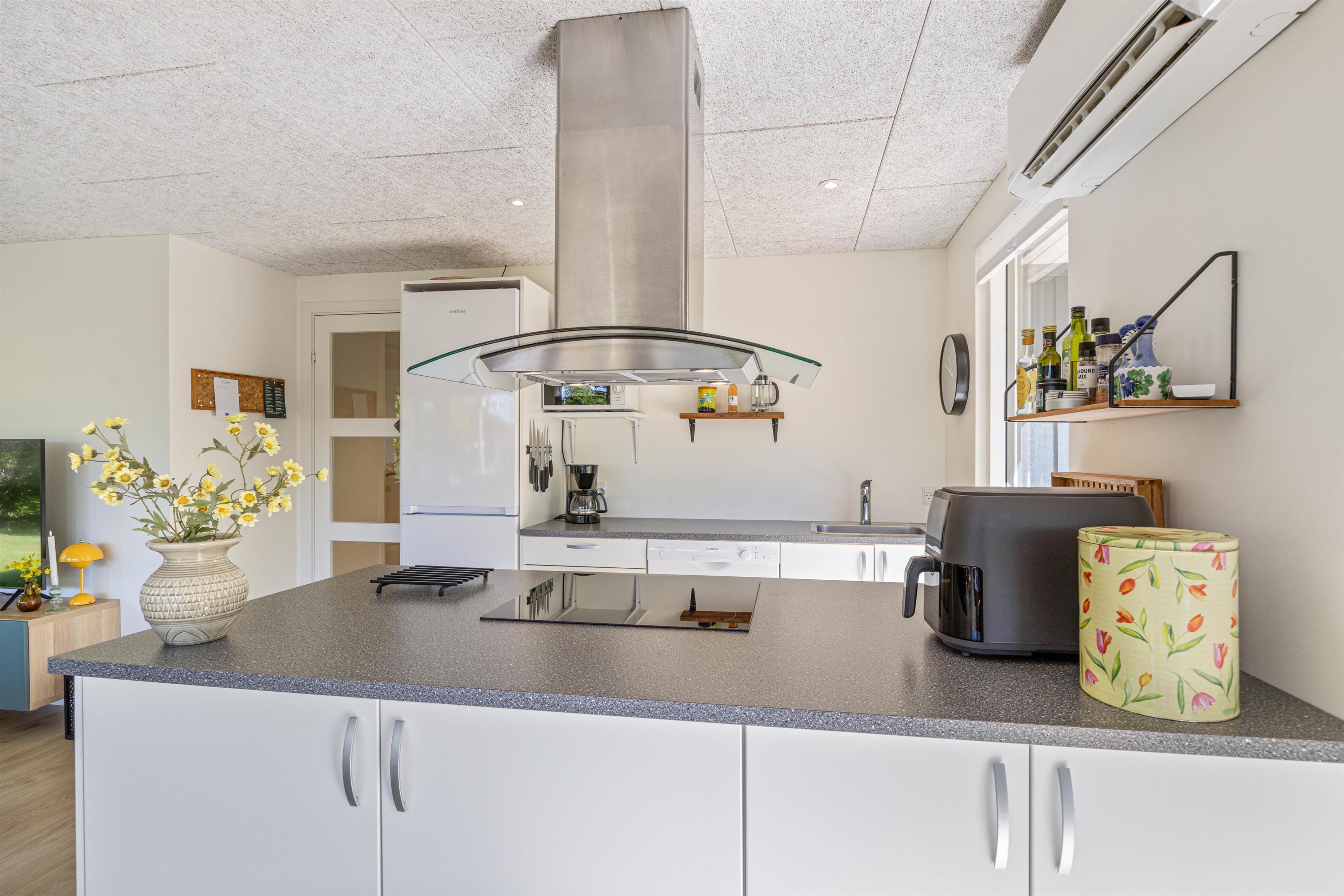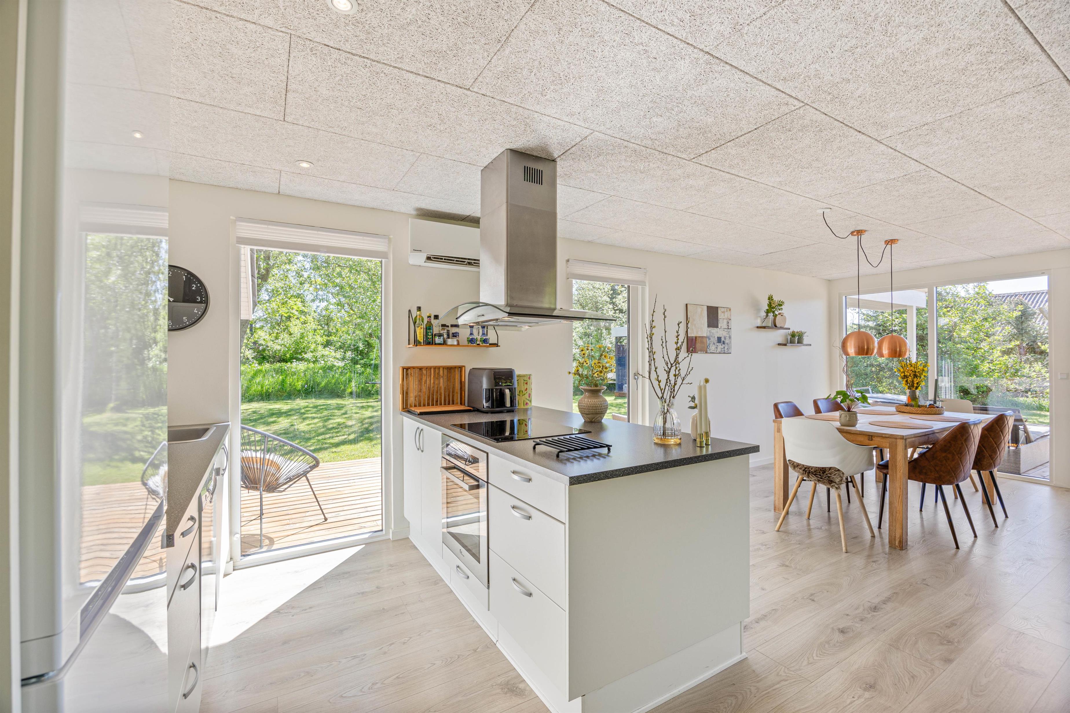 Sommerhuset til 6 personer har et fantastisk opholdsrum, hvor stuen ligger i åben forbindelse med køkkenet. Her er der plads til, at hele familien kan samles til hyggelige stunder. Her er mulighed for at se danske tv-kanaler, men der er også en chromecast til rådighed, så I kan streame jeres yndlingsfilm direkte fra telefonen.