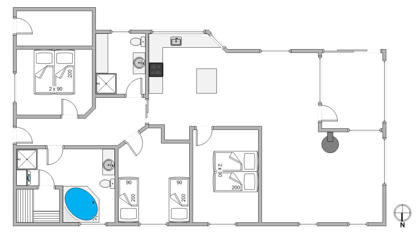 De 2 badeværelser med gulvvarme og brusekabine betyder, at I ikke behøver at stå i kø til morgenbadet, og det ene har sin egen wellnessafdeling med spa og sauna. Der er både vaskemaskine og tørretumbler i sommerhuset.