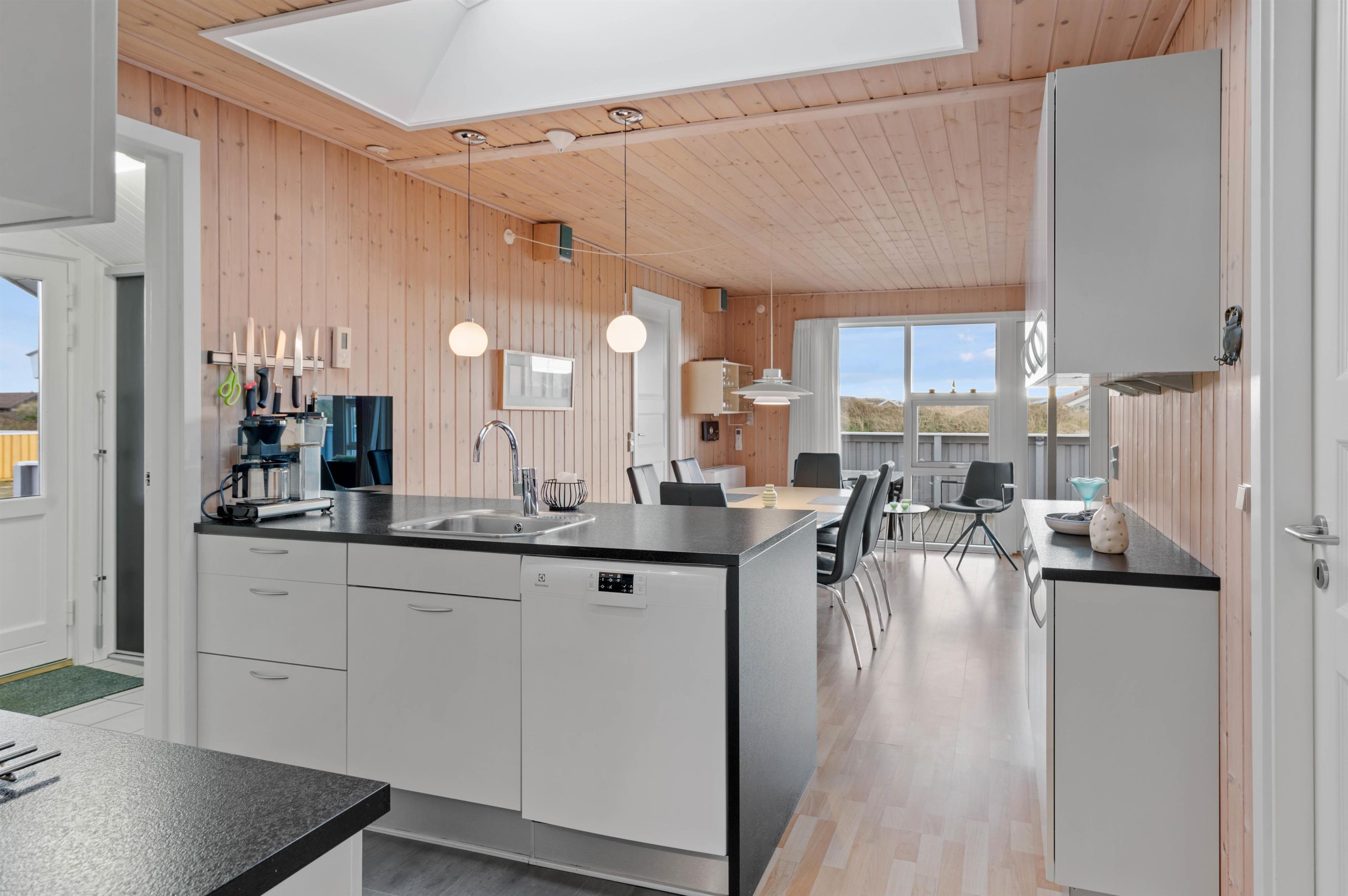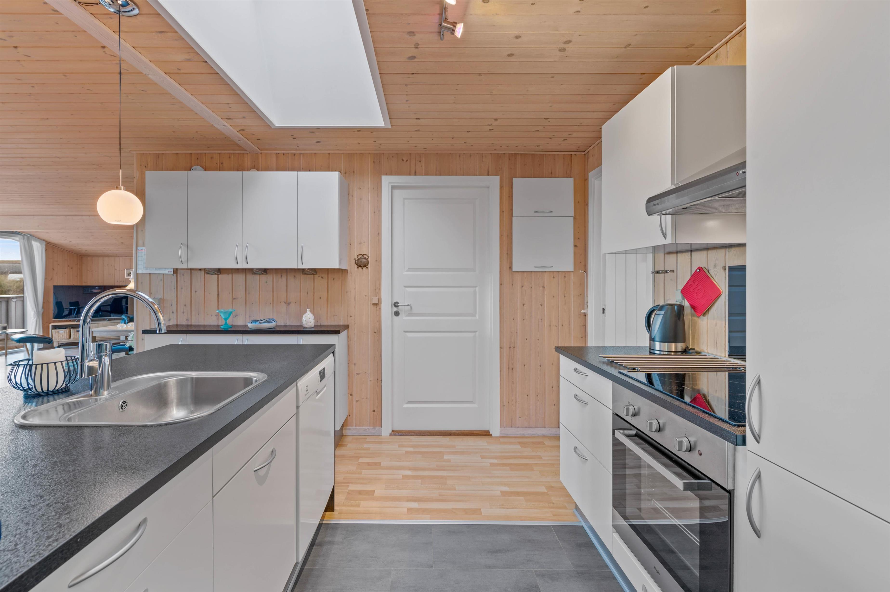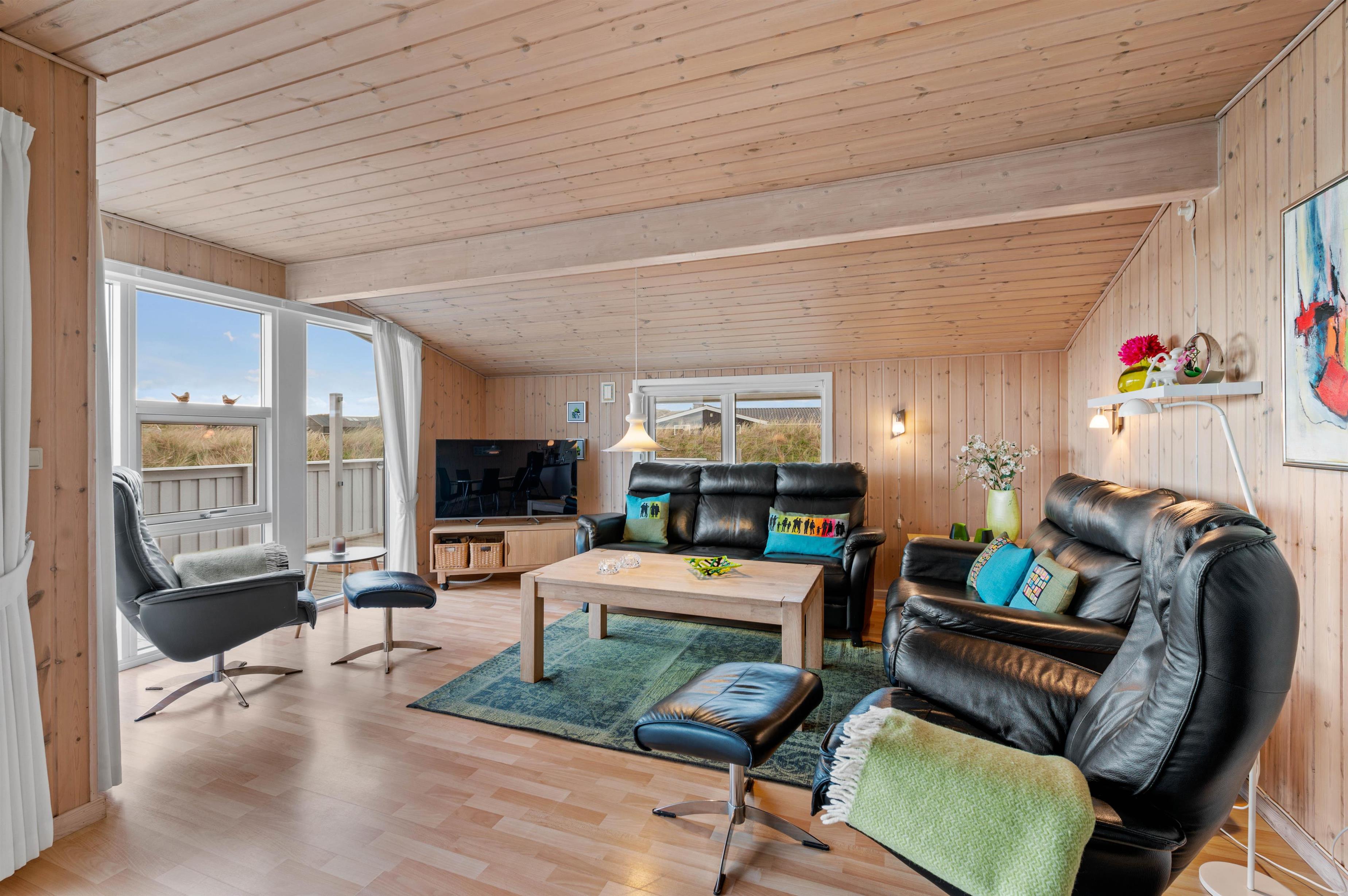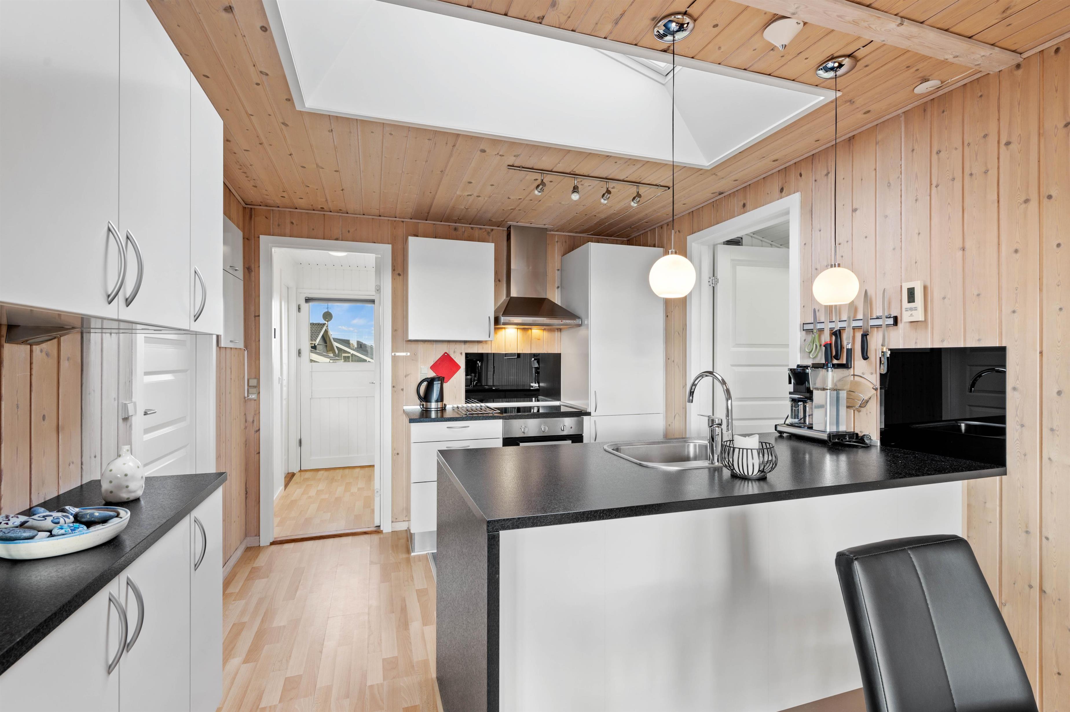 Sommerhusets indretning er overordnet meget lys og venlig med træbeklædte vægge og lofter - her vil I hurtigt føle jer hjemme.
