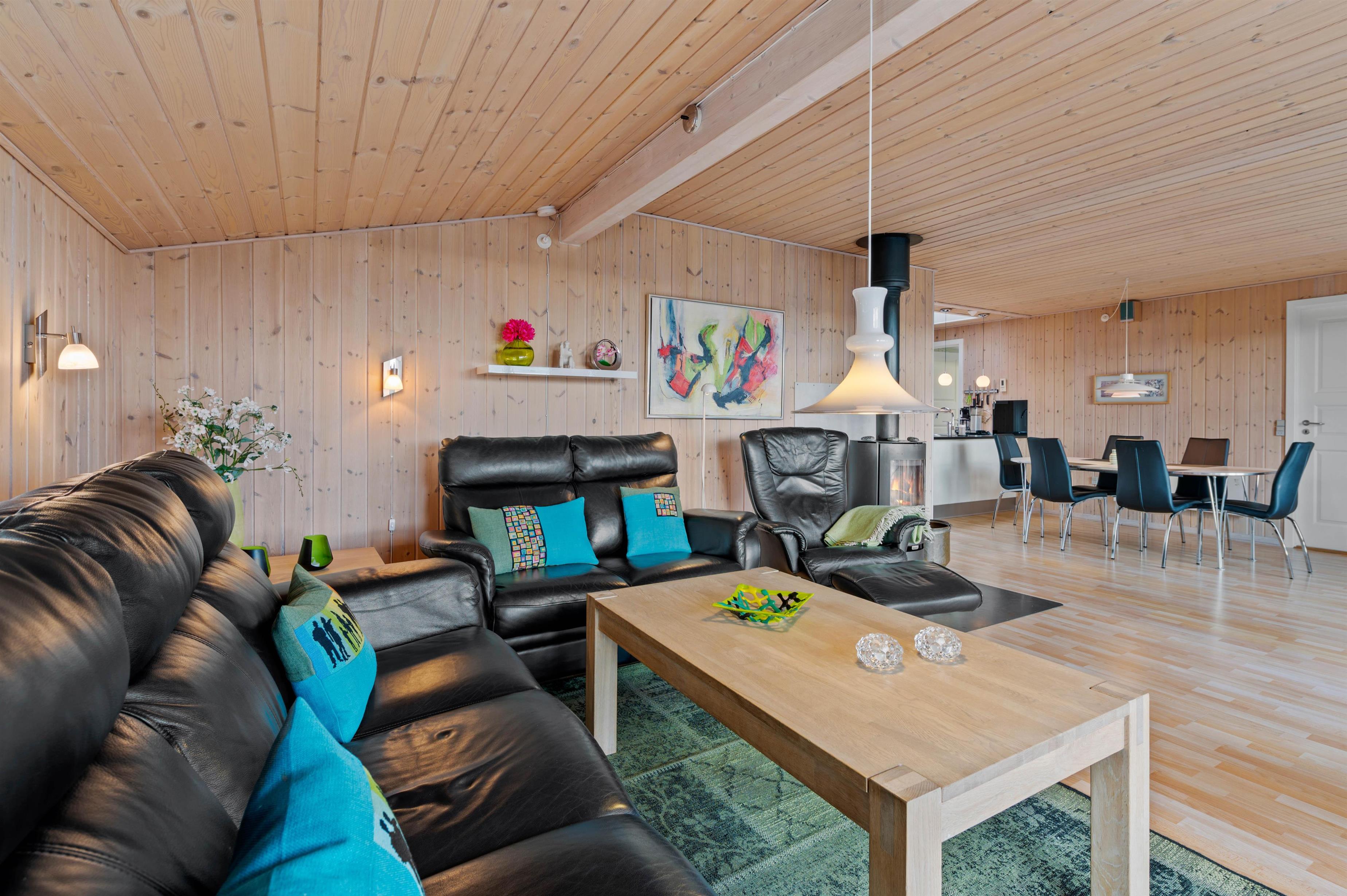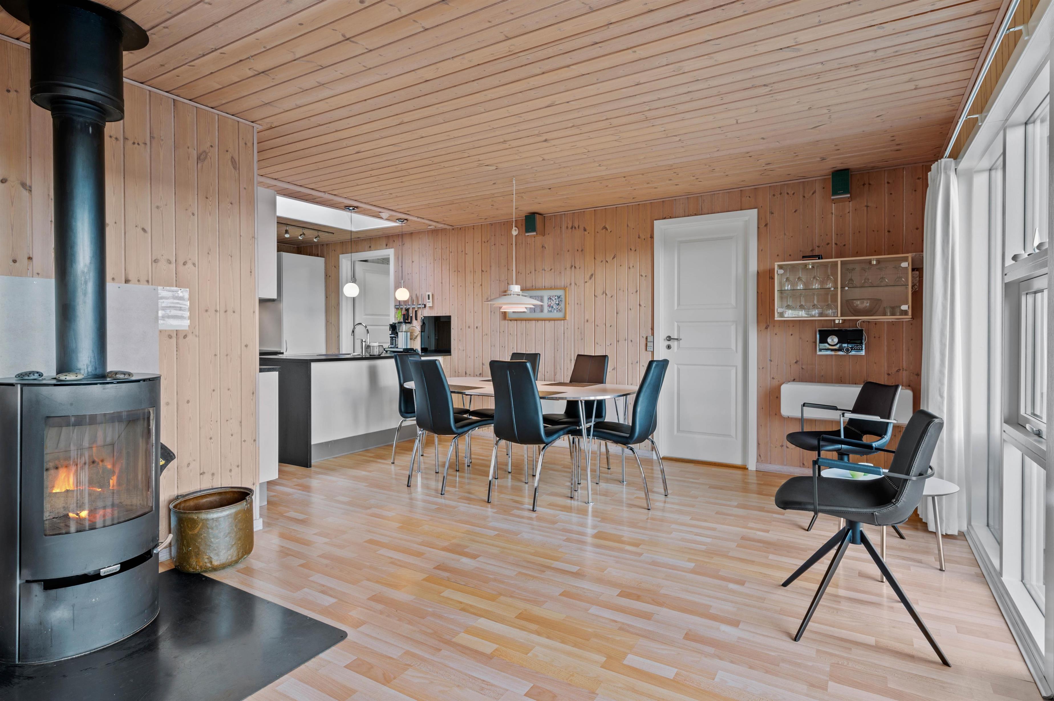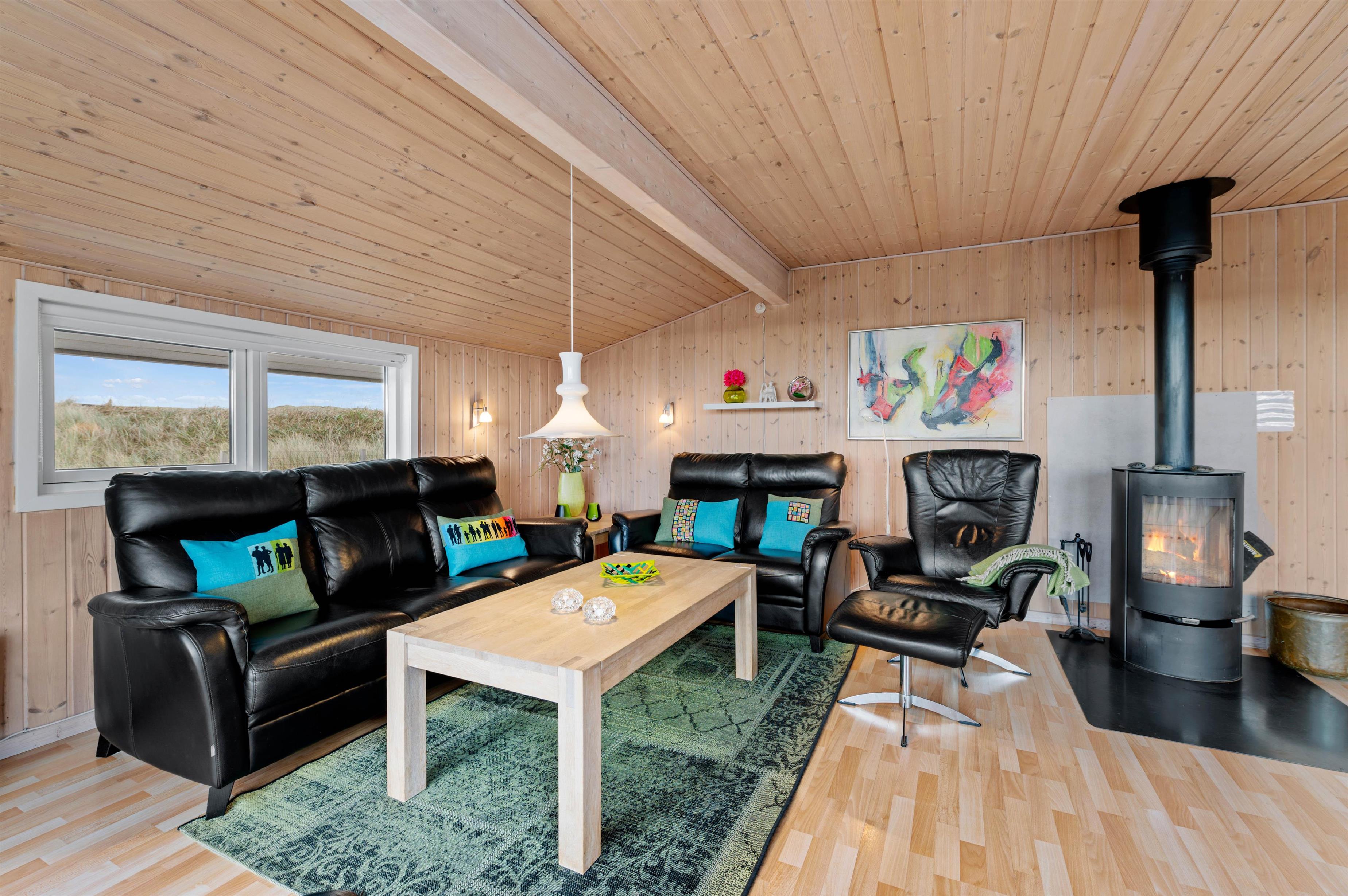Opholdsstuen er hyggeligt indrettet med komfortable møbler, brændeovn, fladskærms-tv, dvd-afspiller og radio med cd-afspiller. Der er desuden gratis internetadgang i sommerhuset og den energibesparende varmepumpe sørger for, at eludgifterne ikke bliver for høje, og I kan nyde en behagelig temperatur i opholdsrummet.