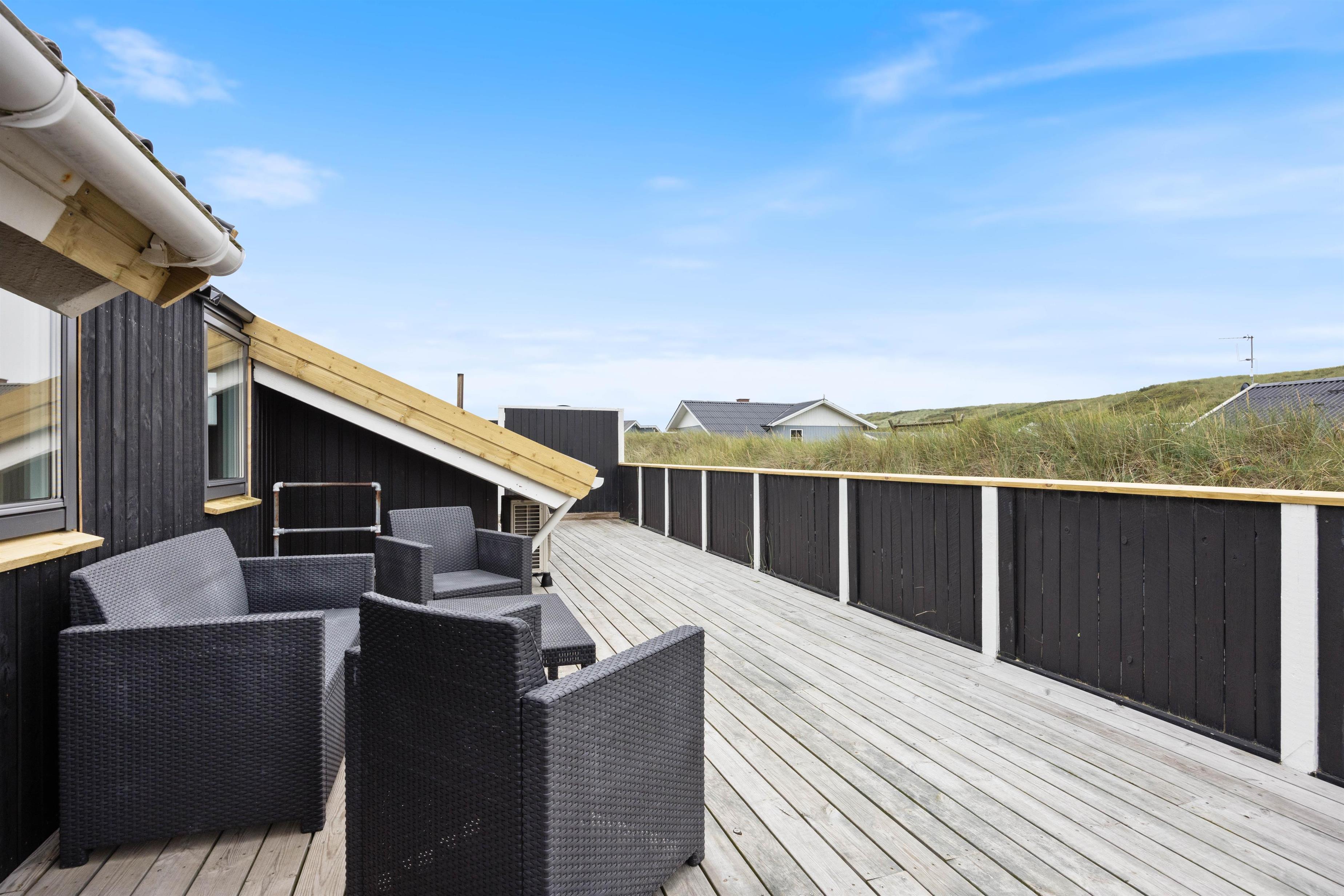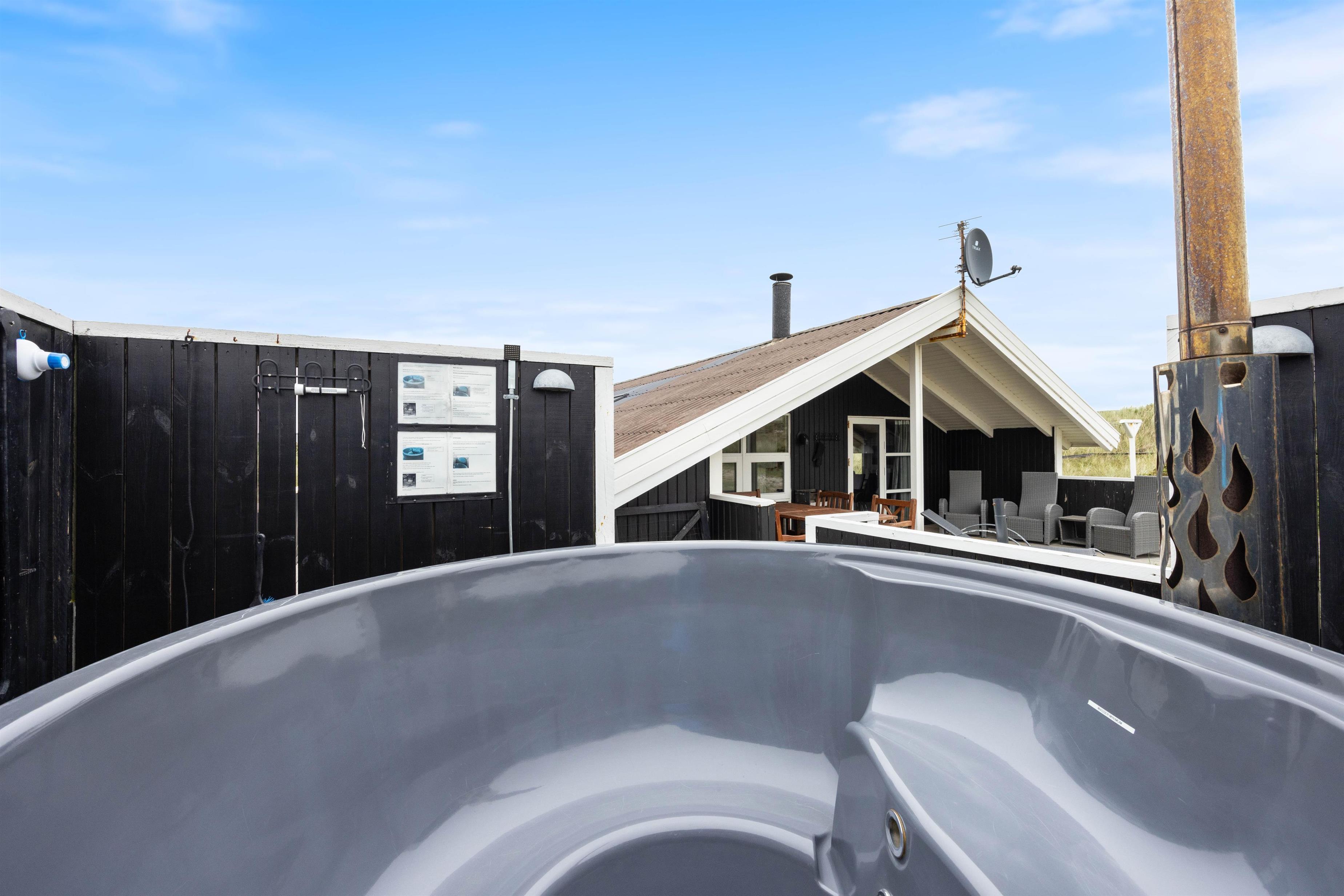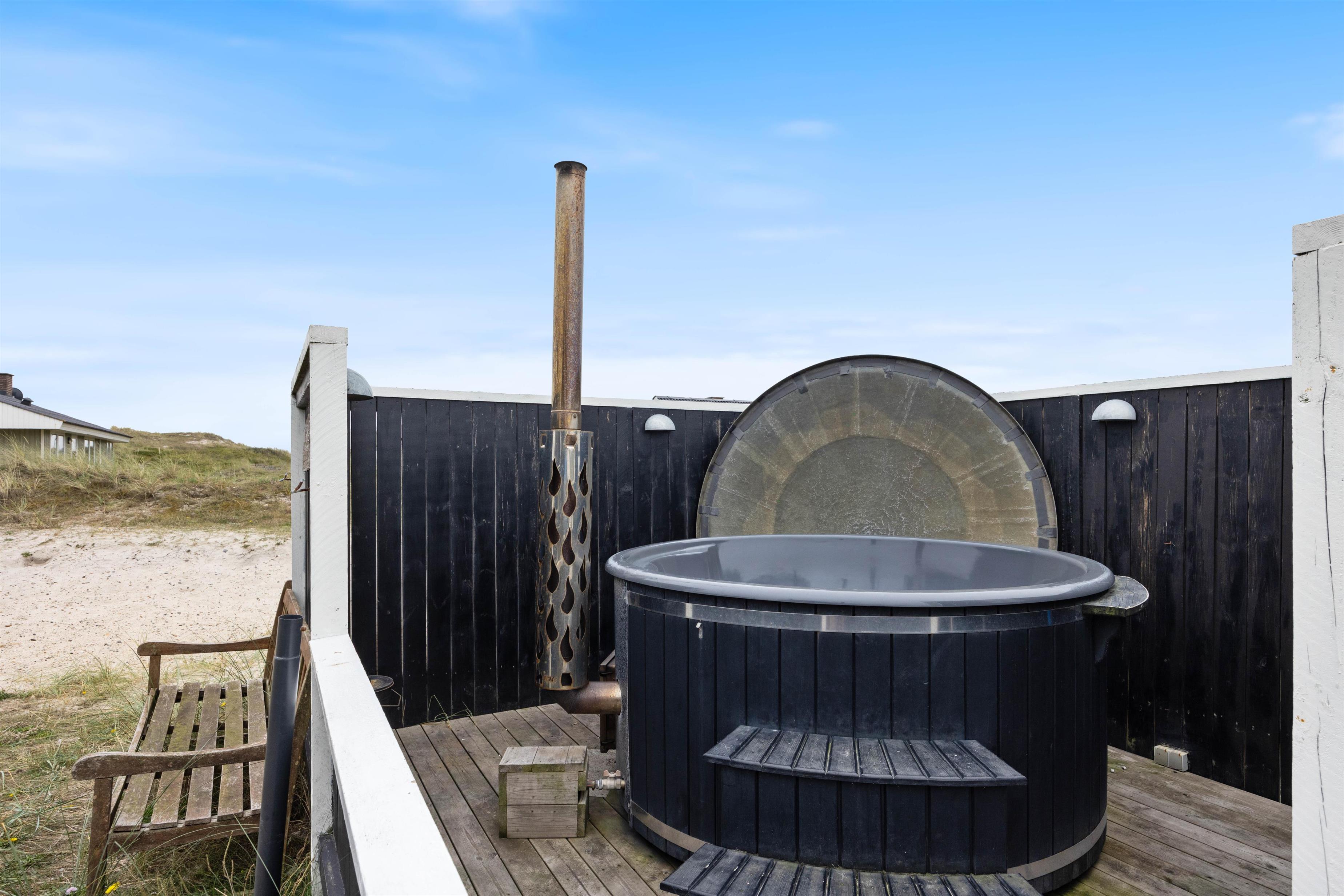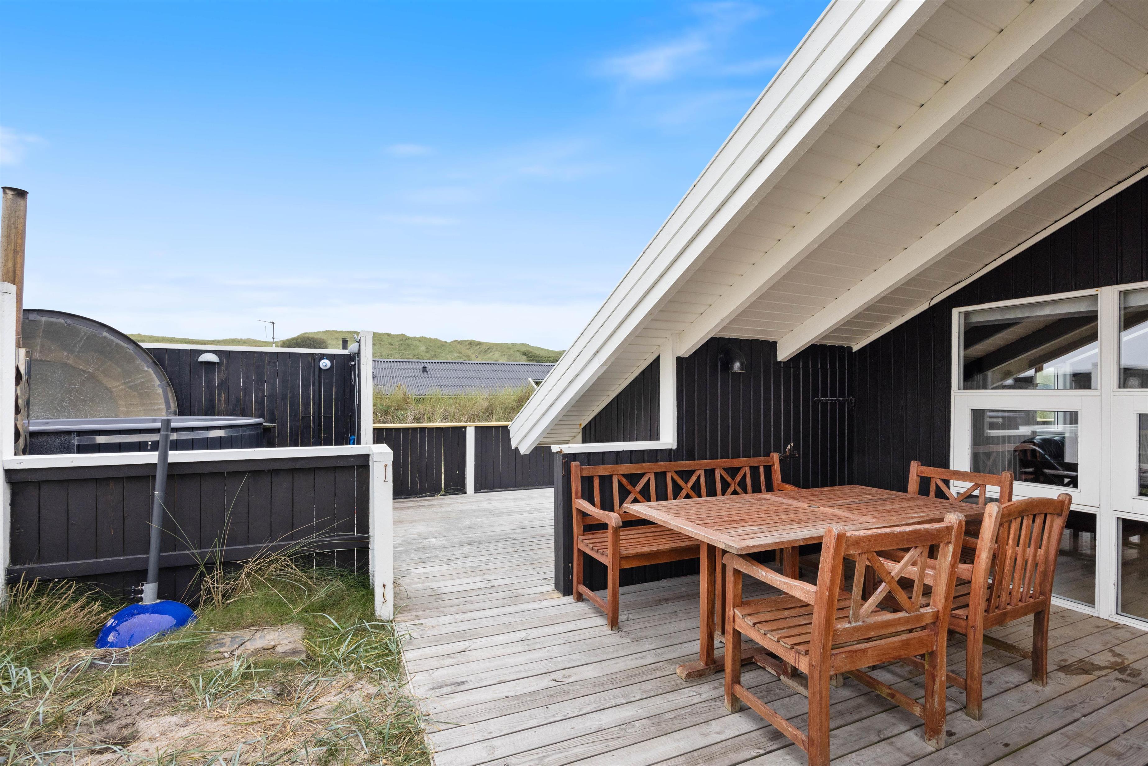 Huset er omgivet af en stor lukket terrasse mod øst, syd og vest, hvor man nemt kan lade både børn og hunde lege frit. På terrassen finder man også et vildmarksbad, hvor der kan sidde op til 6 personer og måske nyde en stjerneklar aften nede fra det varme vand og med Vesterhavets brusen i baggrunden.