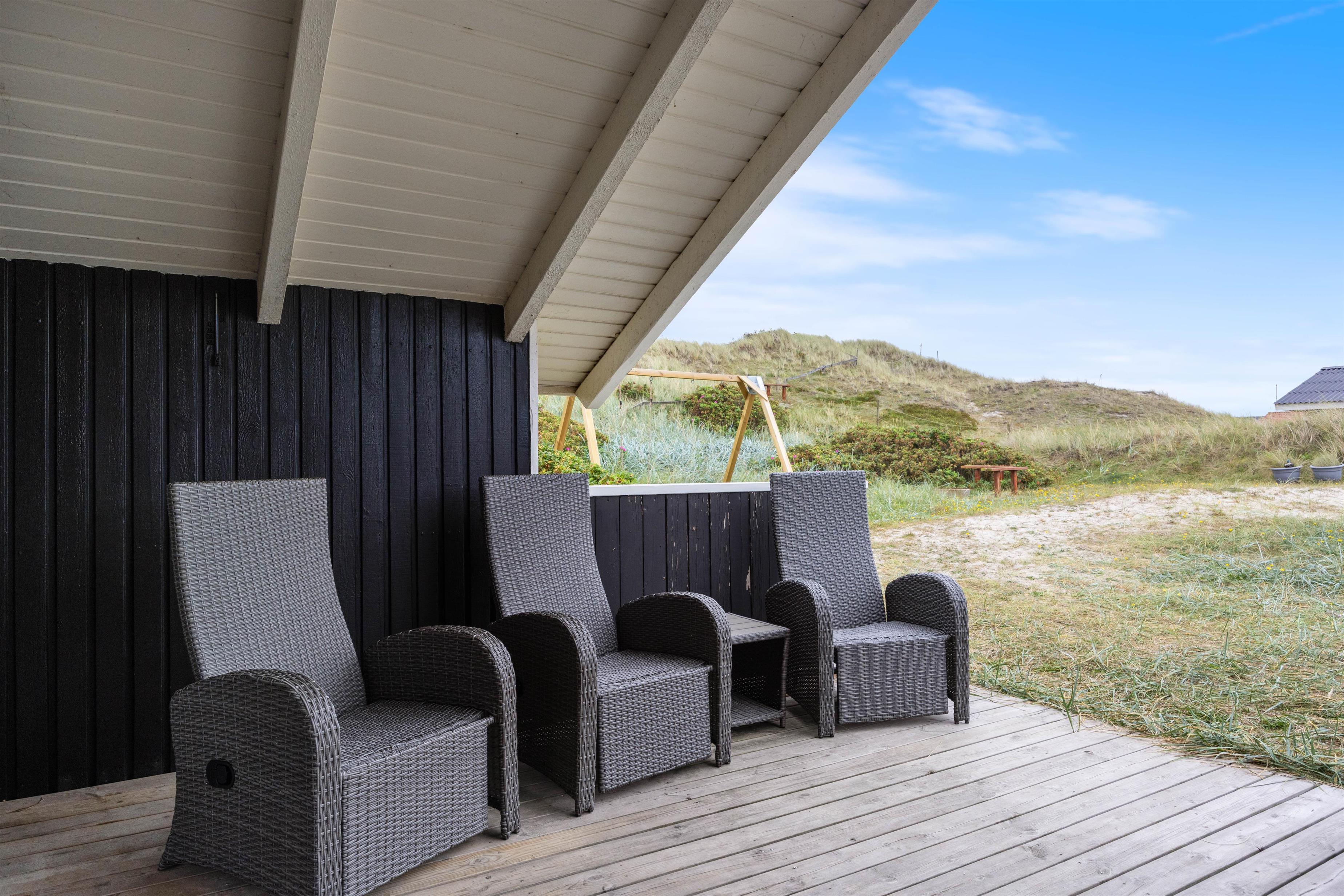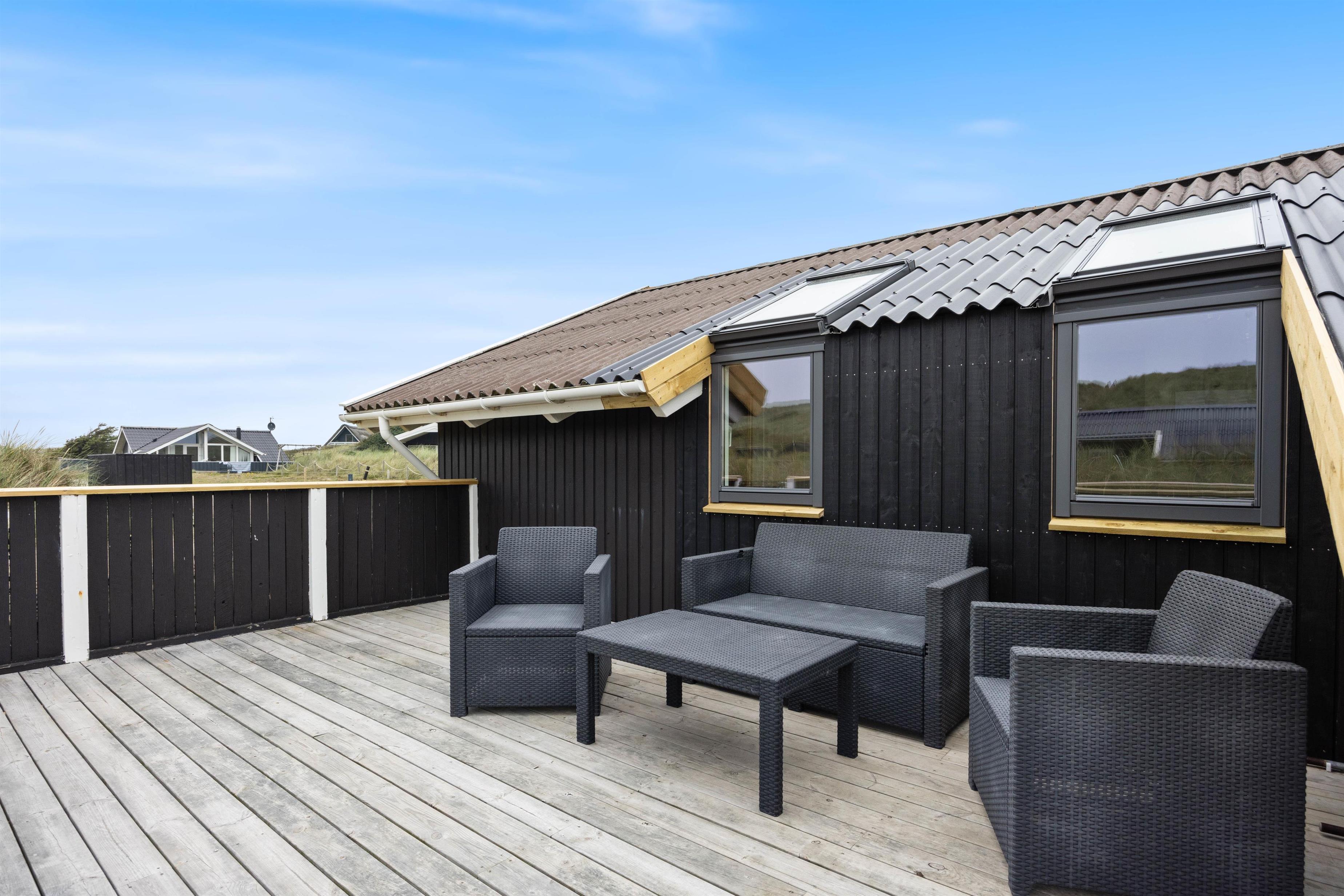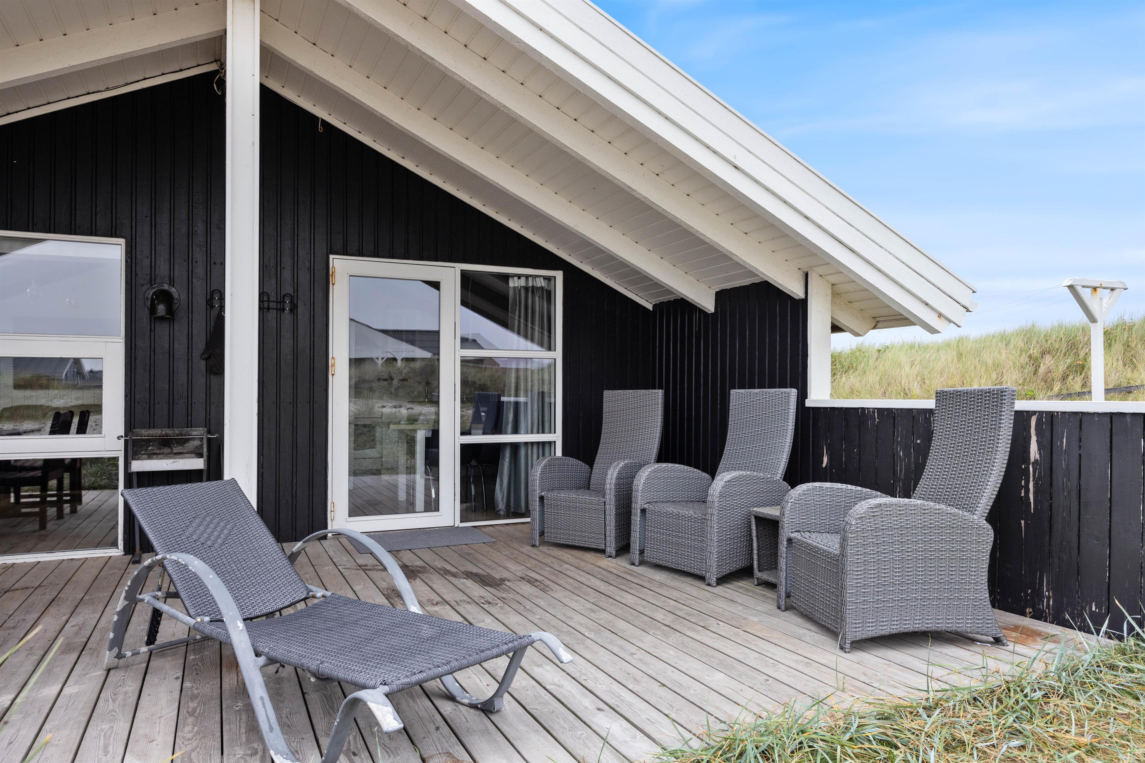 Huset er omgivet af en stor lukket terrasse mod øst, syd og vest, hvor man nemt kan lade både børn og hunde lege frit. På terrassen finder man også et vildmarksbad, hvor der kan sidde op til 6 personer og måske nyde en stjerneklar aften nede fra det varme vand og med Vesterhavets brusen i baggrunden.