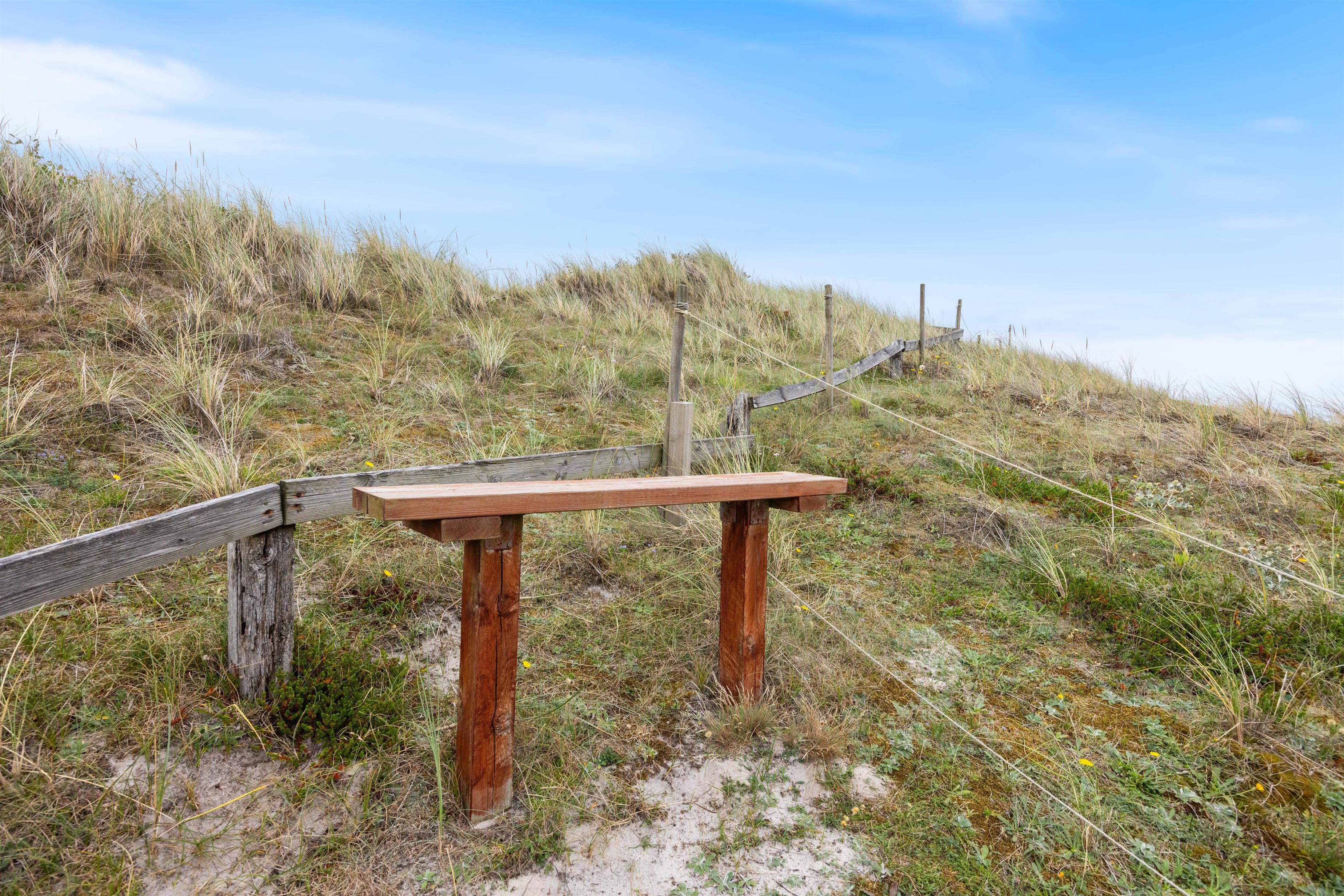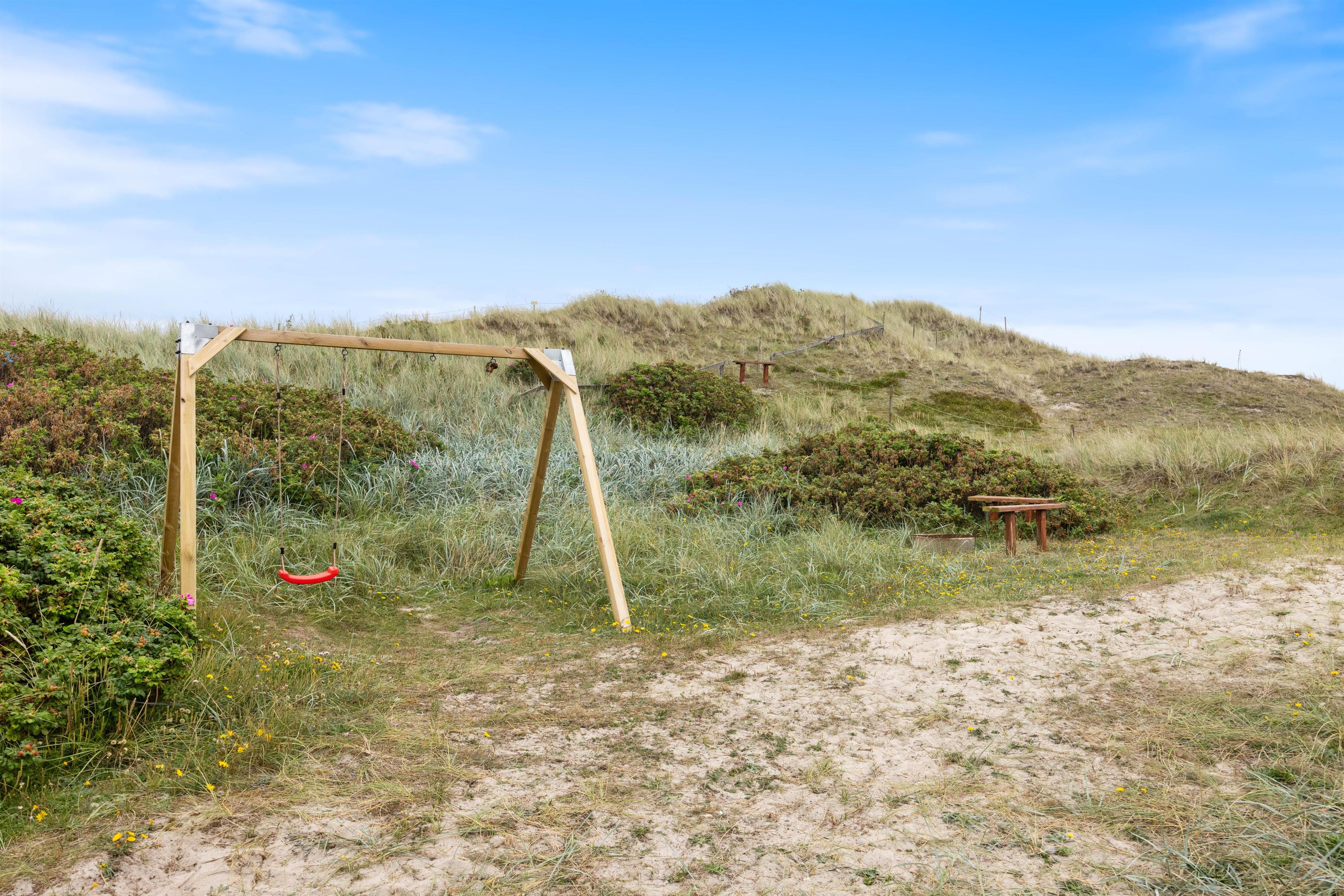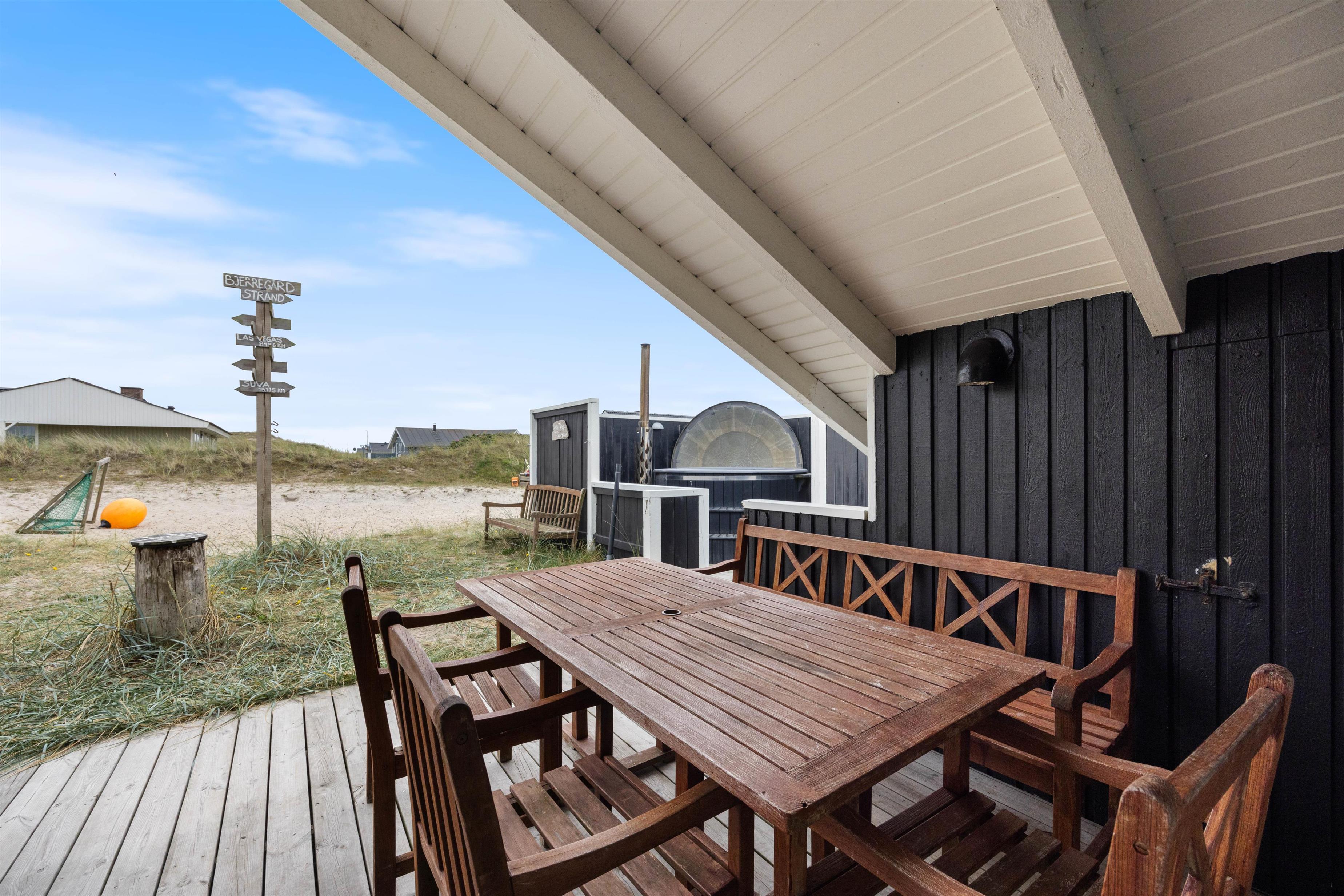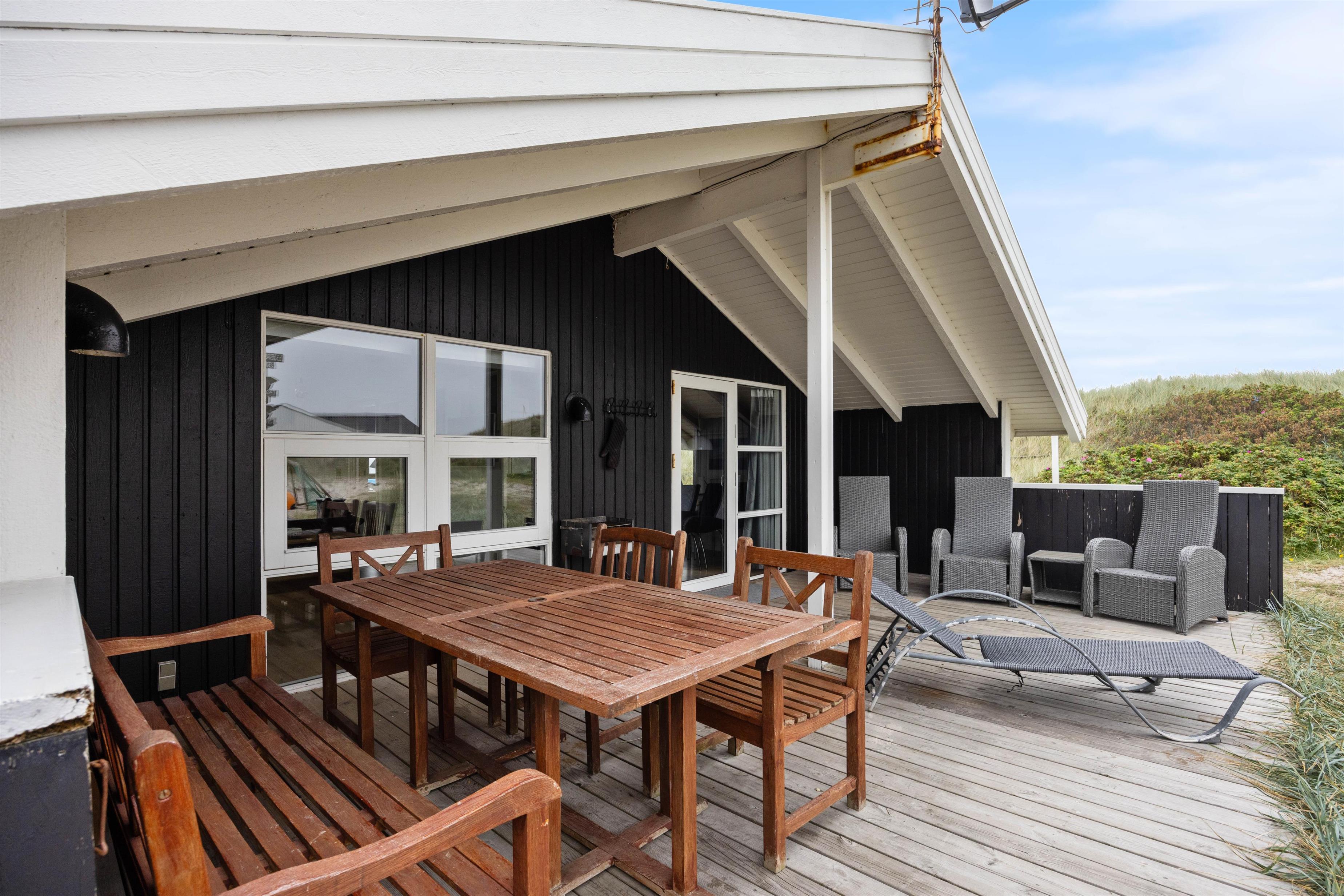 Huset er omgivet af en stor lukket terrasse mod øst, syd og vest, hvor man nemt kan lade både børn og hunde lege frit. På terrassen finder man også et vildmarksbad, hvor der kan sidde op til 6 personer og måske nyde en stjerneklar aften nede fra det varme vand og med Vesterhavets brusen i baggrunden.
