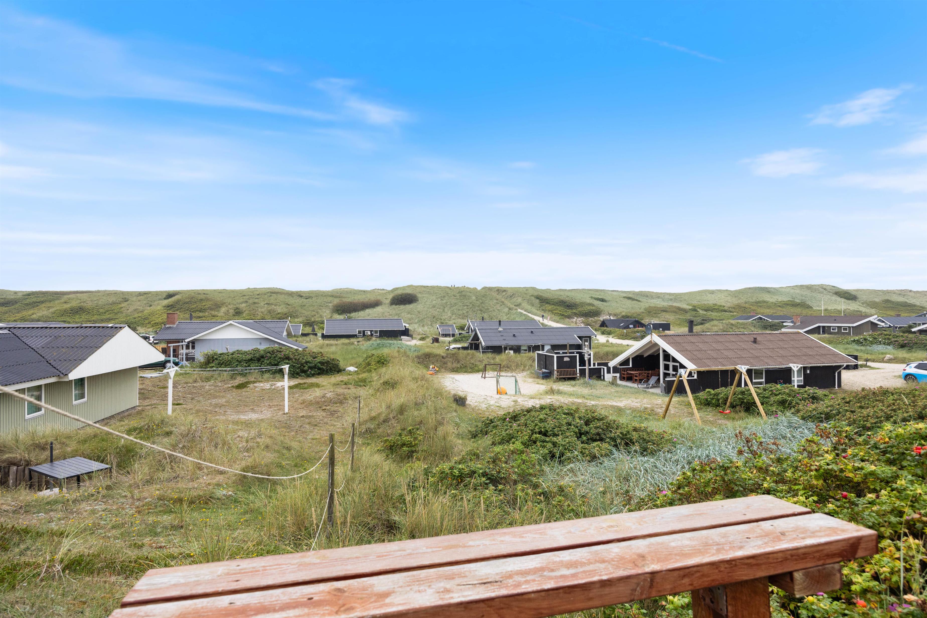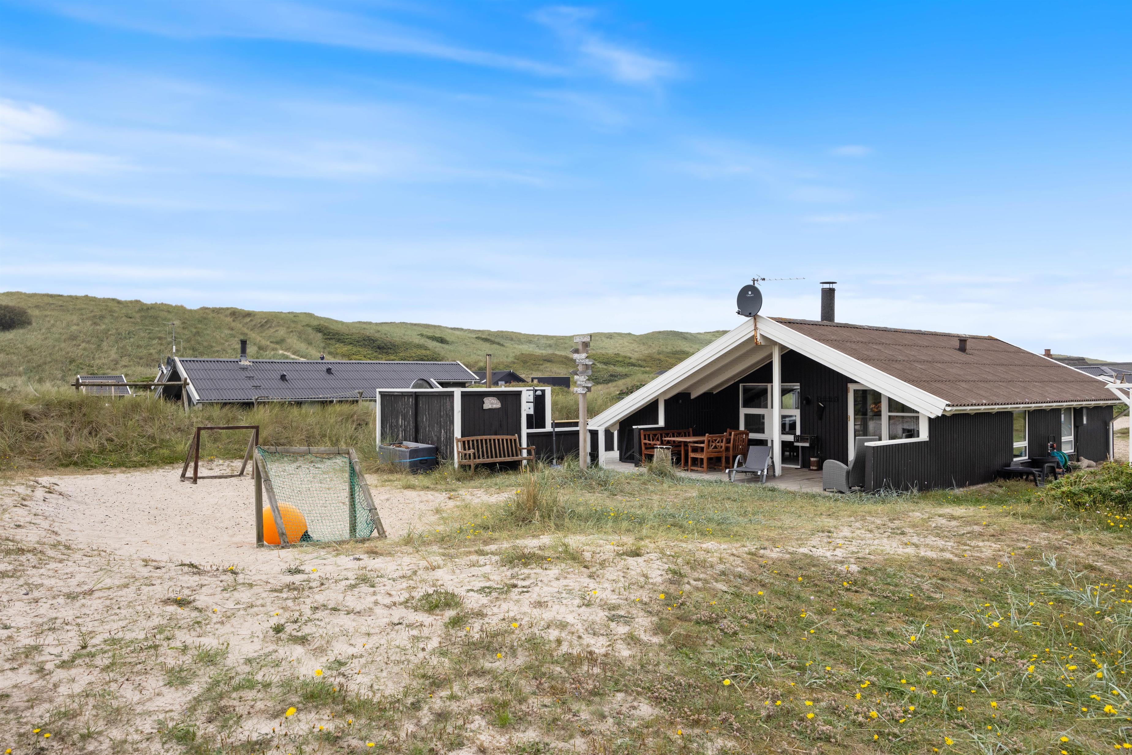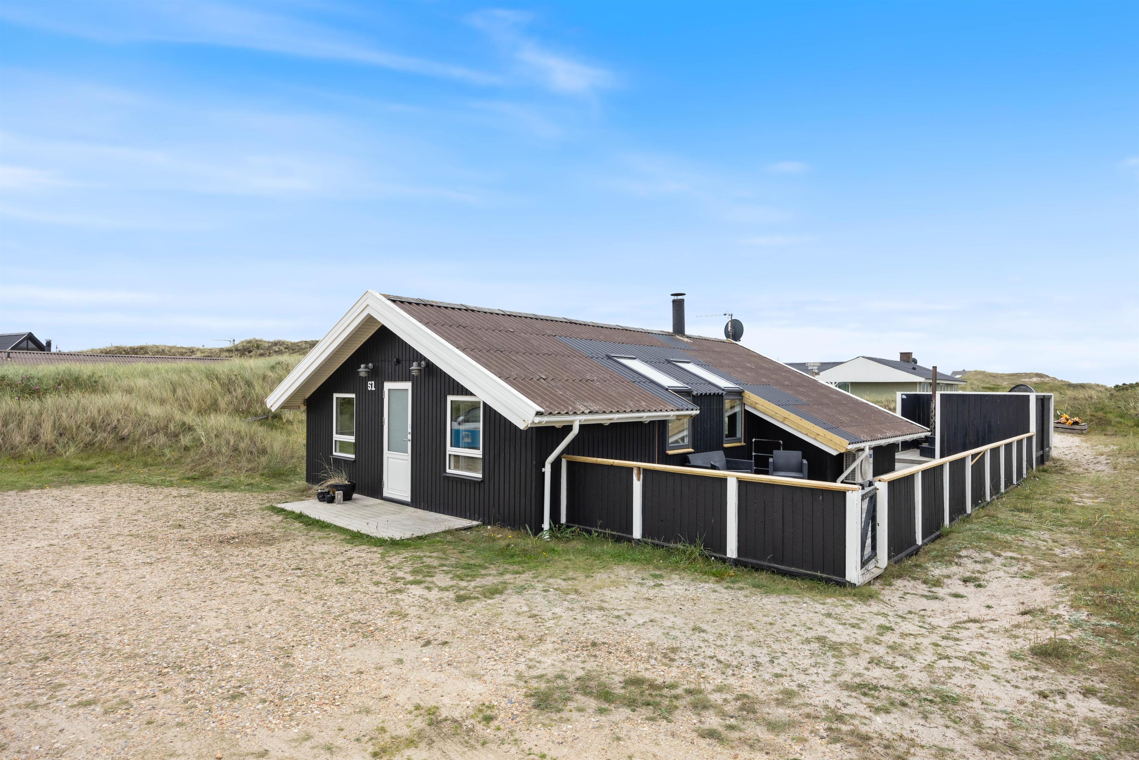 Her på Julianevej 51 i Bjerregård, midt i klitterne og kun 150 meter fra det brusende Vesterhav, finder I dette skønne feriehus. Huset ligger på en natur/klit-grund og på den lukkede terrasse kan man sidde i vildtmarksbadet og nyde solnedgangen over klitterne – måske med et enkelt glas vin.