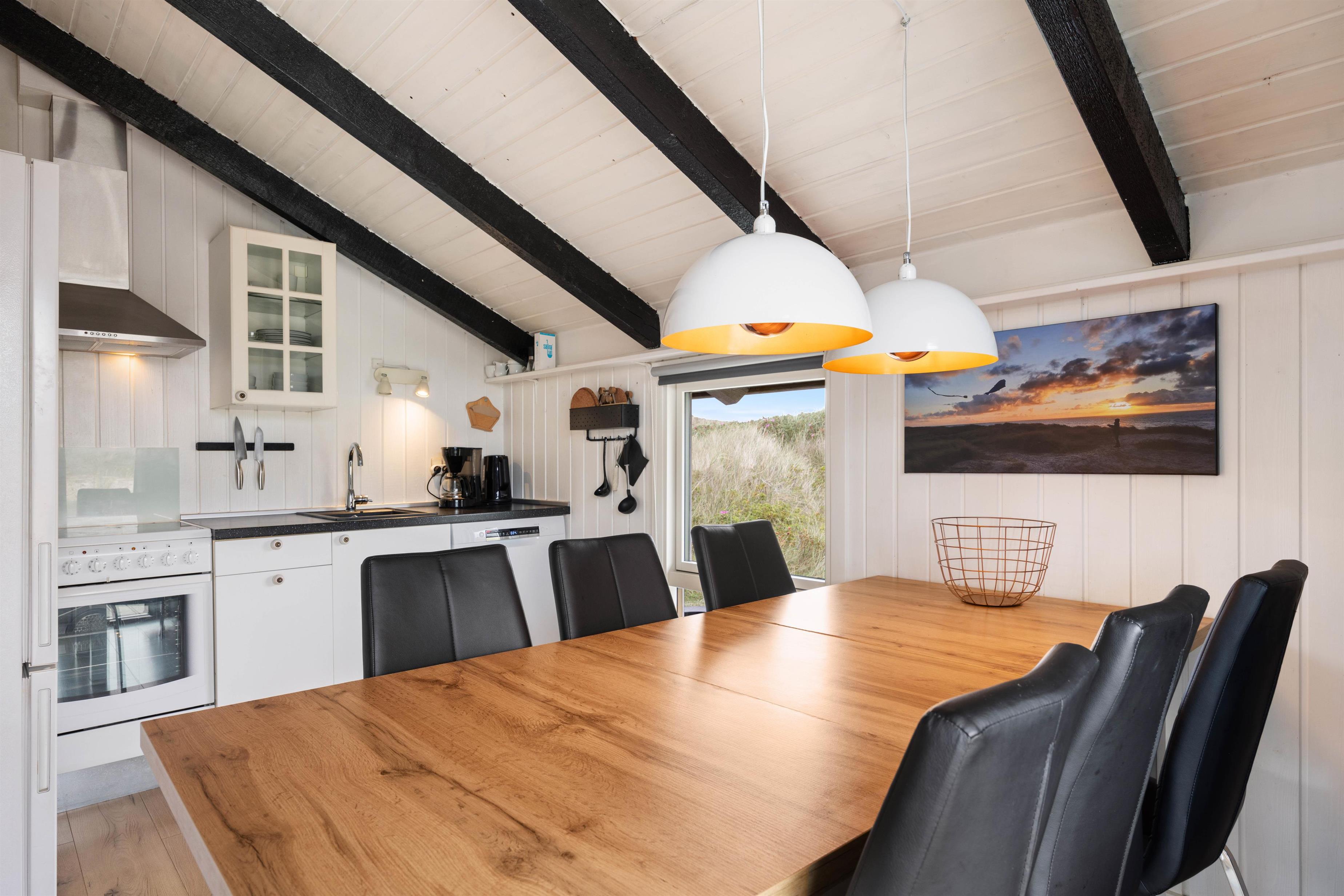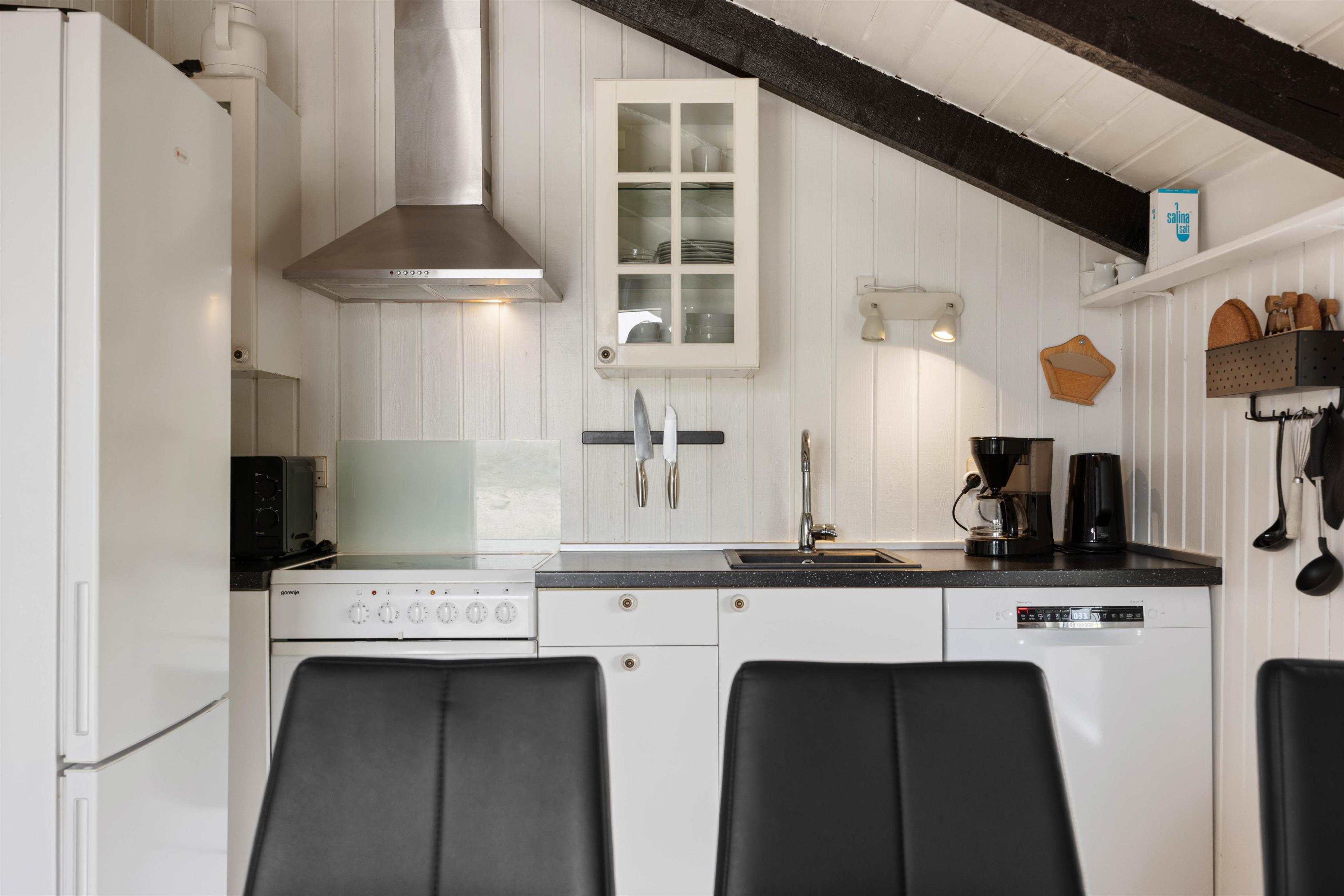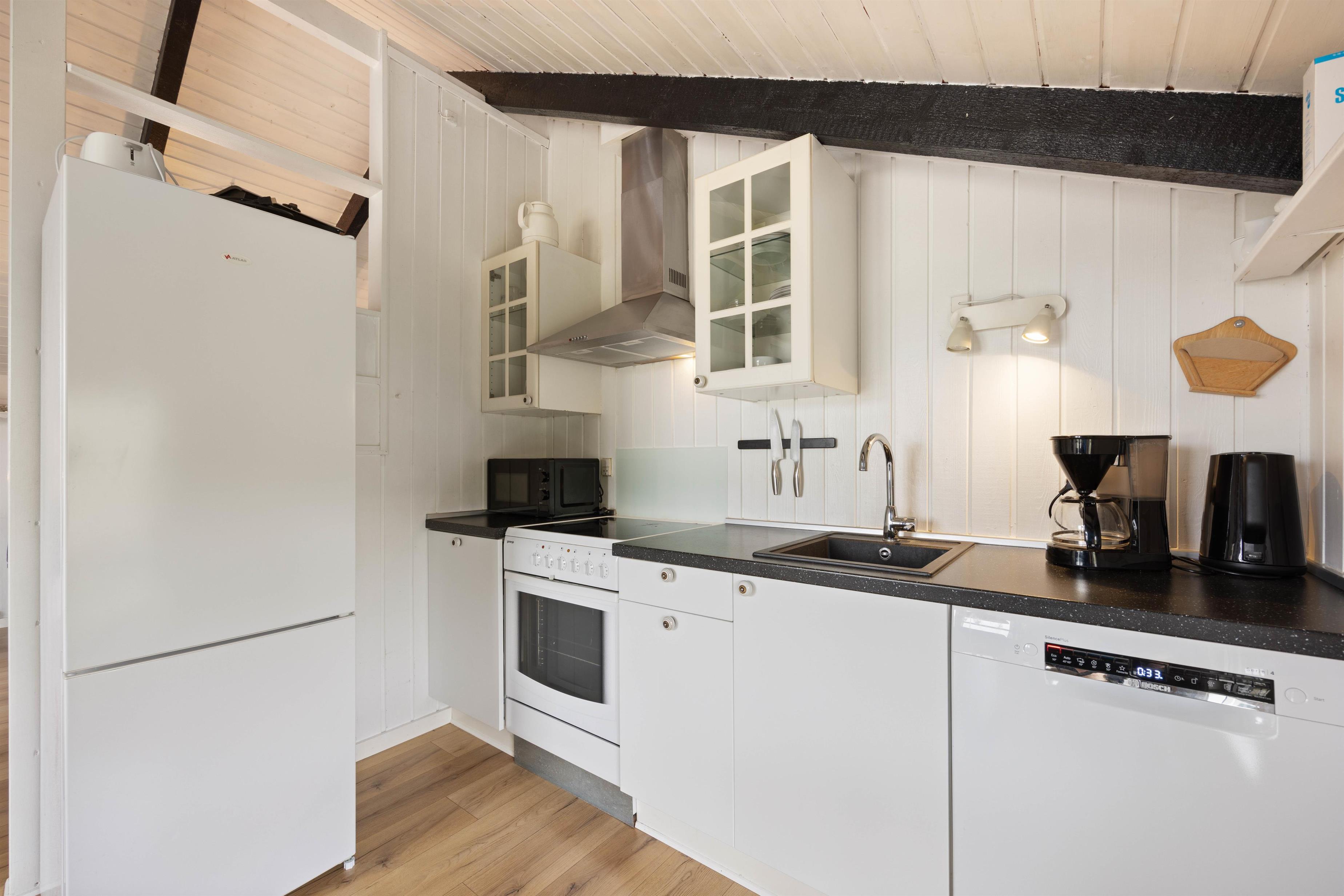 Hjertet i huset er det lyse og hyggelige opholdsrum, hvor der er åbent til den praktisk indrettede køkkenafdeling, hvor man finder fryser (60L), mikroovn og opvaskemaskine.