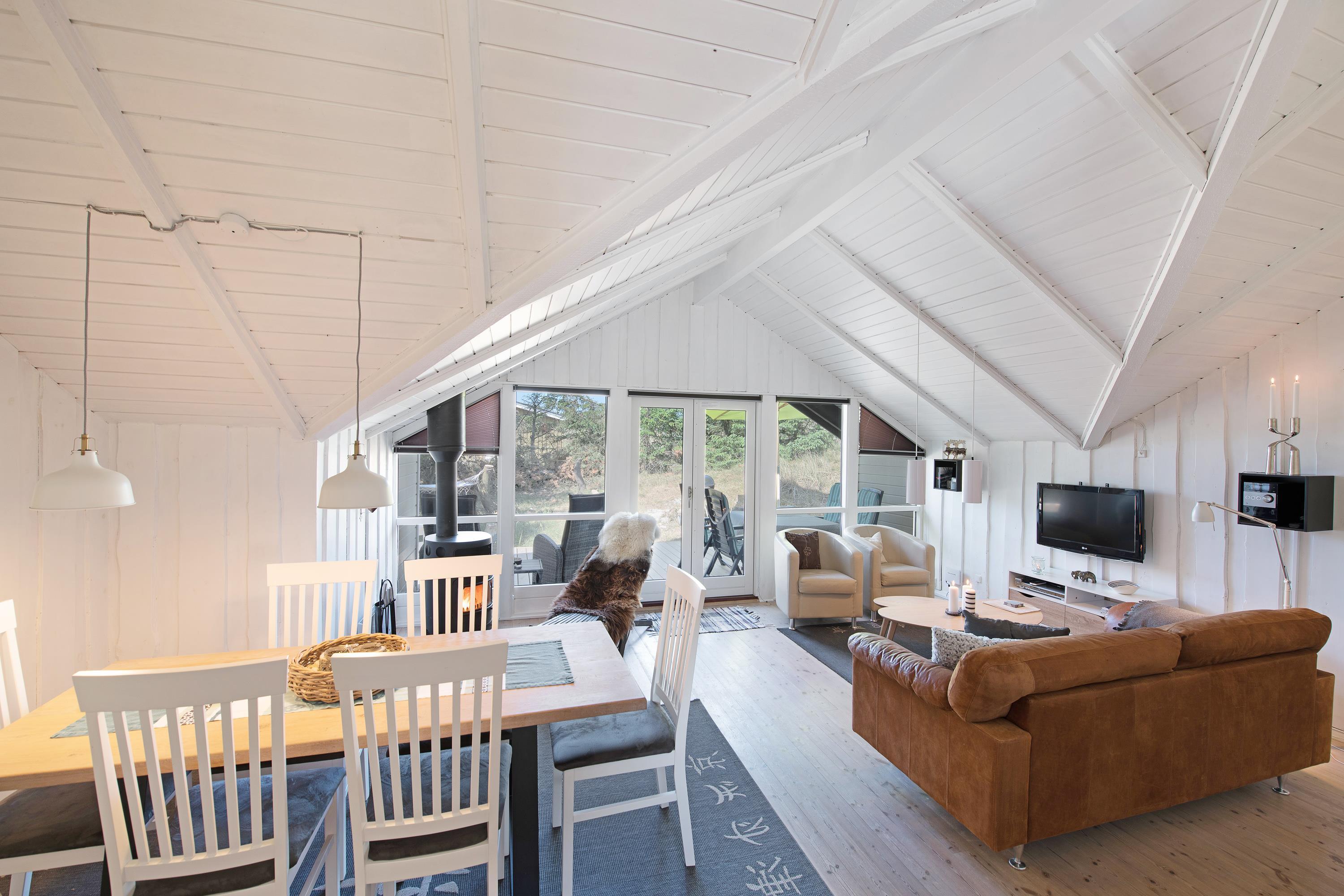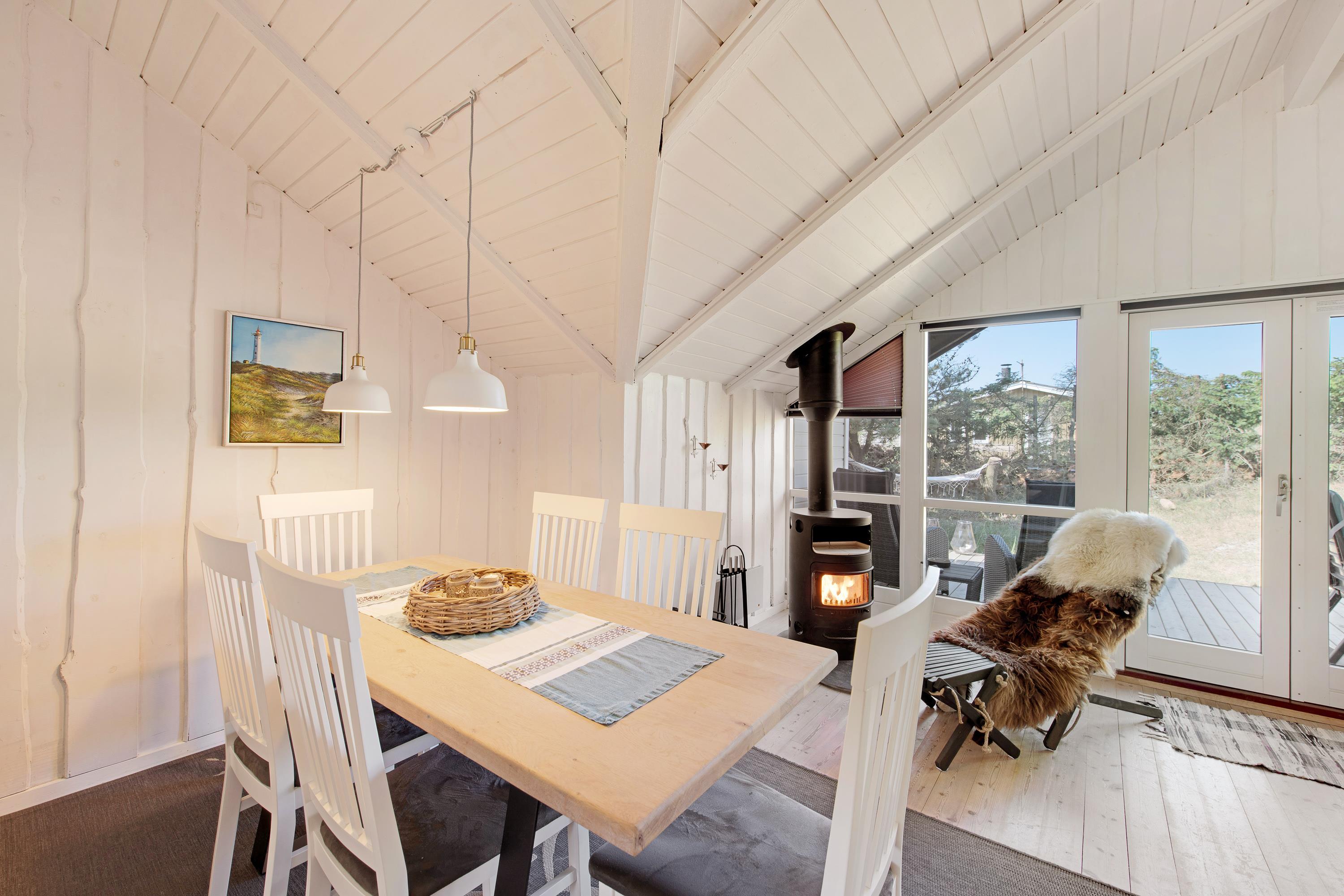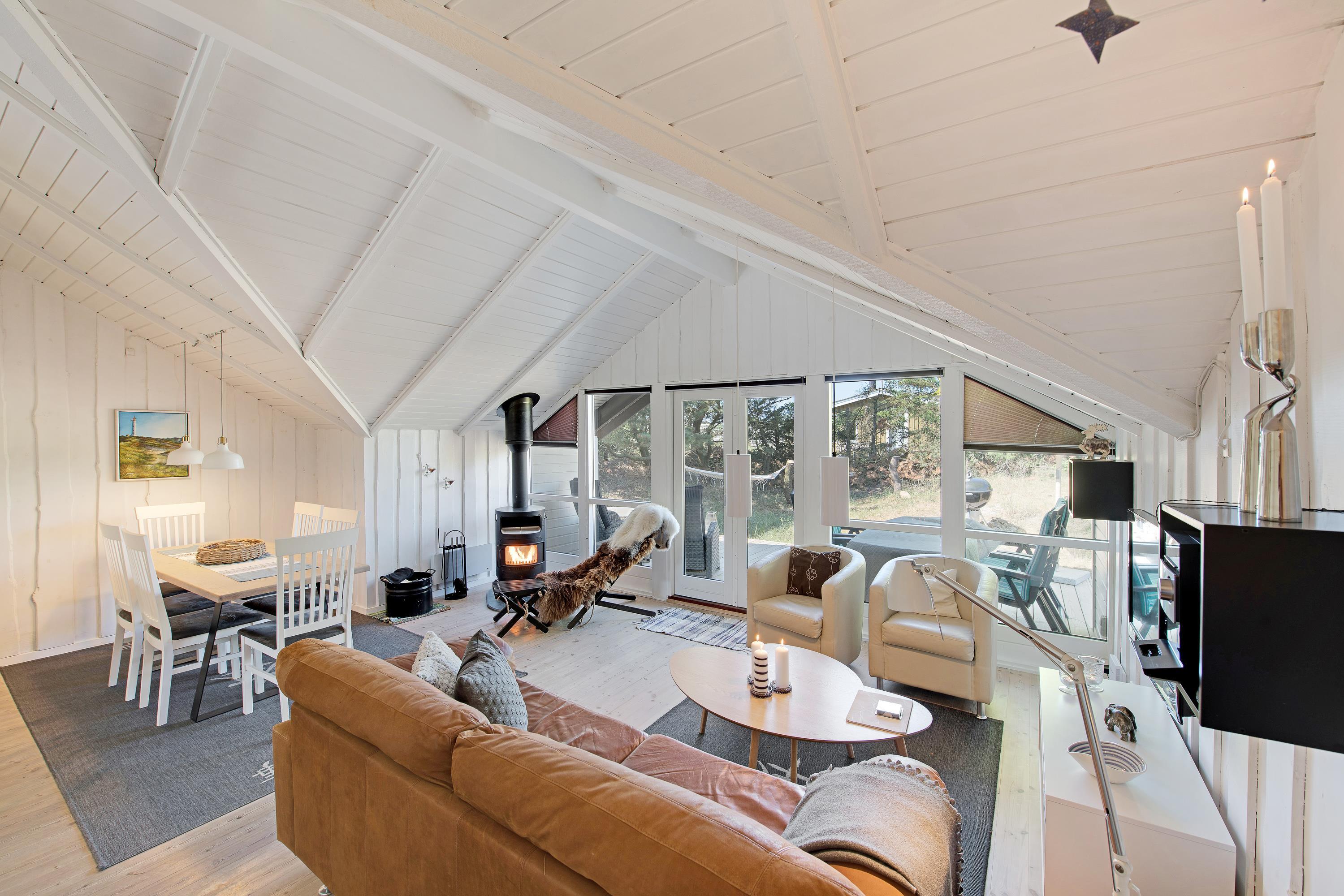 På den 1.200 m² store kuperede naturgrund, som delvist er omgivet af træer, ligger dette skønne og hyggelige feriehus. Feriehuset er lyst, venligt og indbydende indrettet, og det naturlige samlingspunkt er det åbne opholds- og spiserum, som er direkte forbundet med det moderne køkken. På kølige dage kan I hygge jer foran brændeovnen. I både badeværelset og gæstetoilettet sørger gulvvarme for behagelig varme. En spa og en sauna inviterer desuden til afslappende timer – den perfekte afslutning på en lang gåtur i den friske havluft ved Vesterhavet. Feriehuset har 3 lyse og rummelige dobbeltværelser. Derudover finder I en fryser (85 L), vaskemaskine, tørretumbler, opvaskemaskine samt et praktisk bryggers.