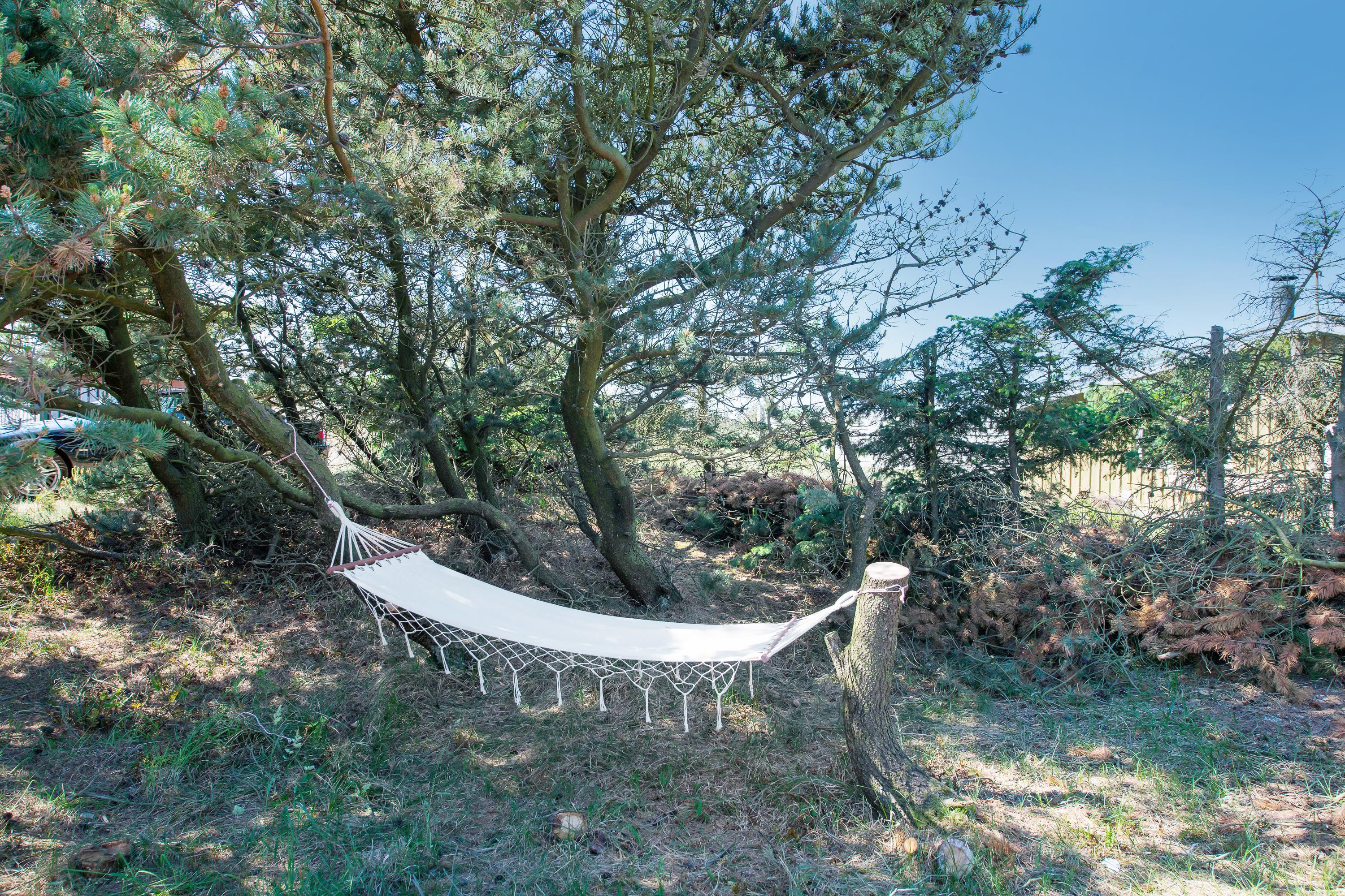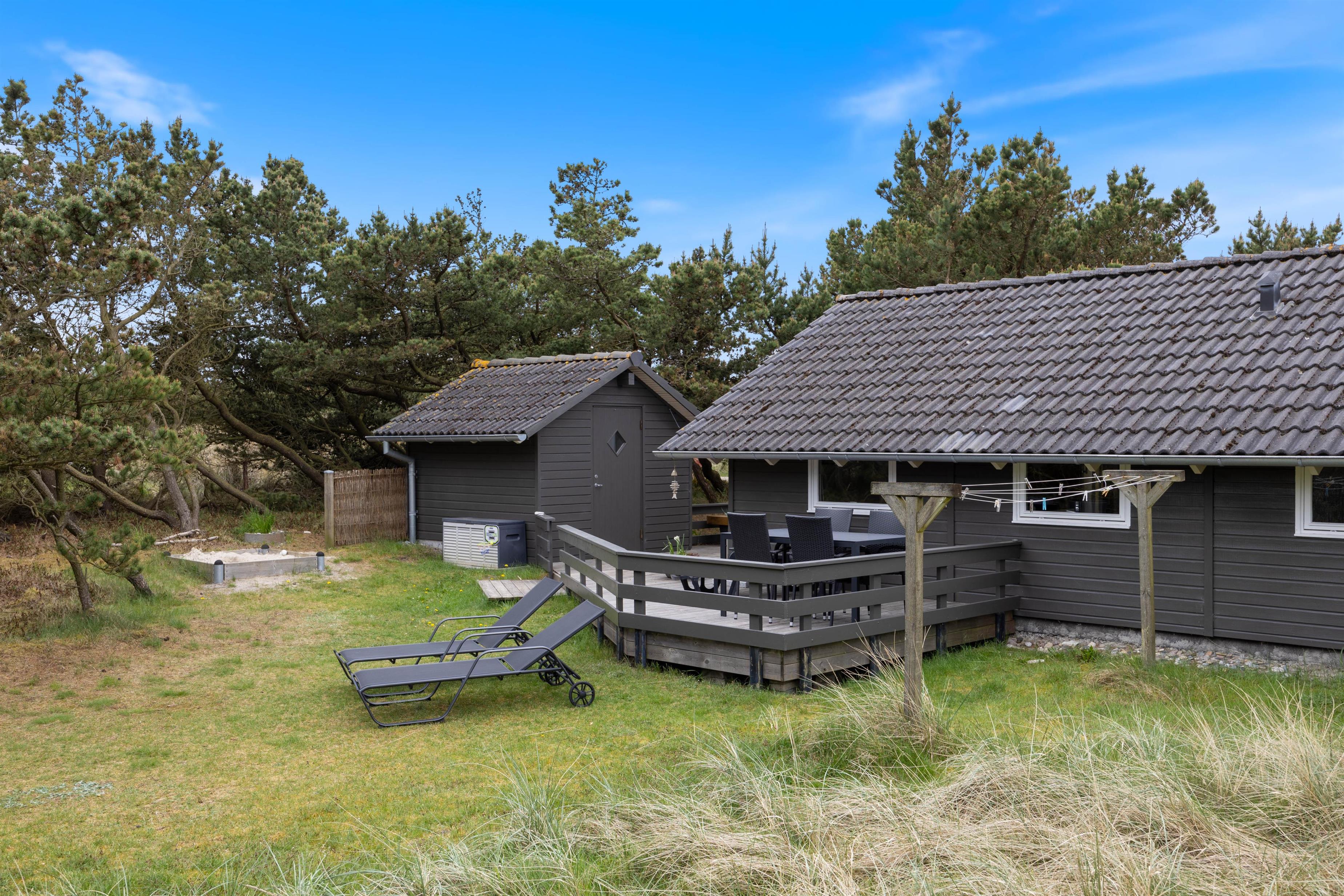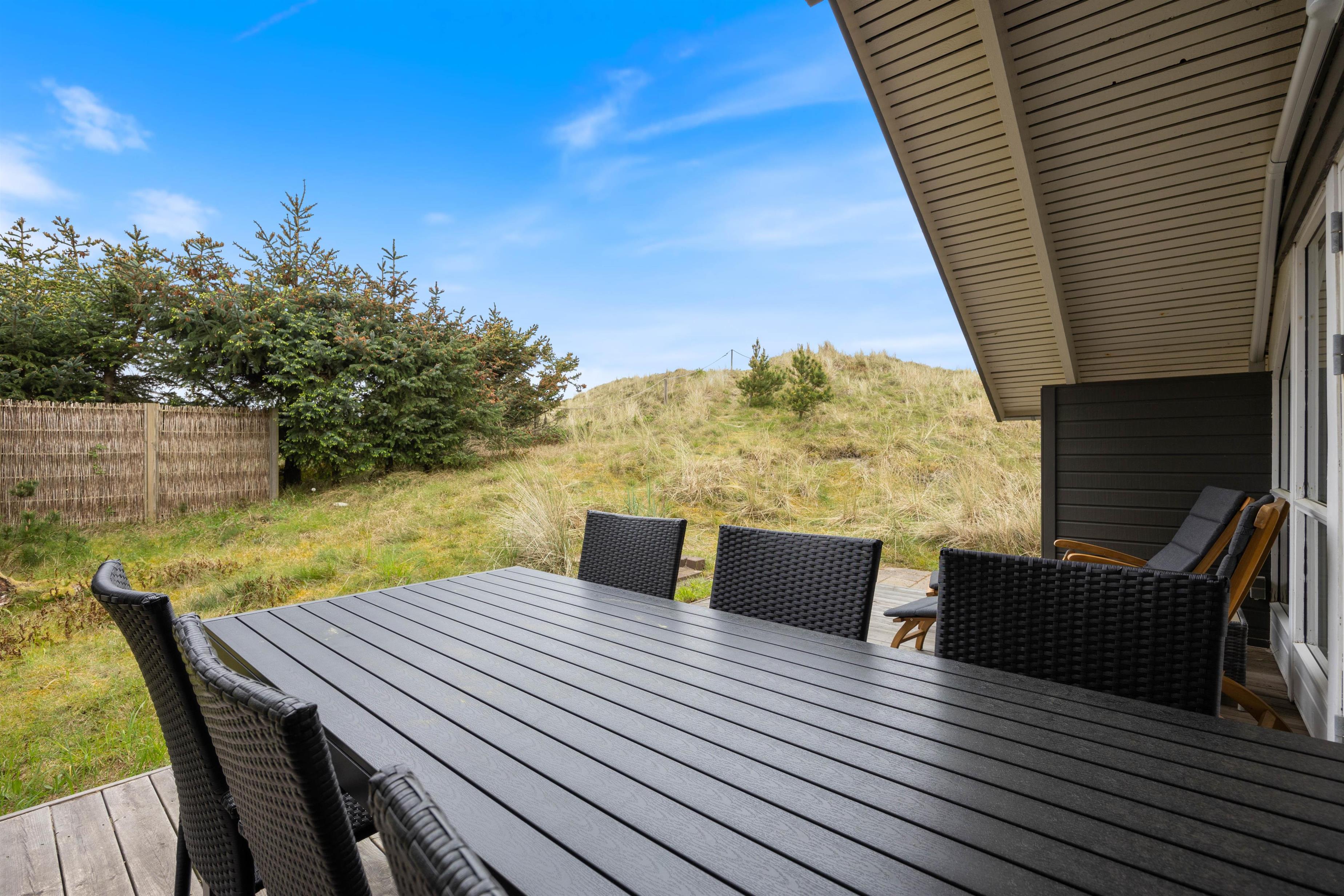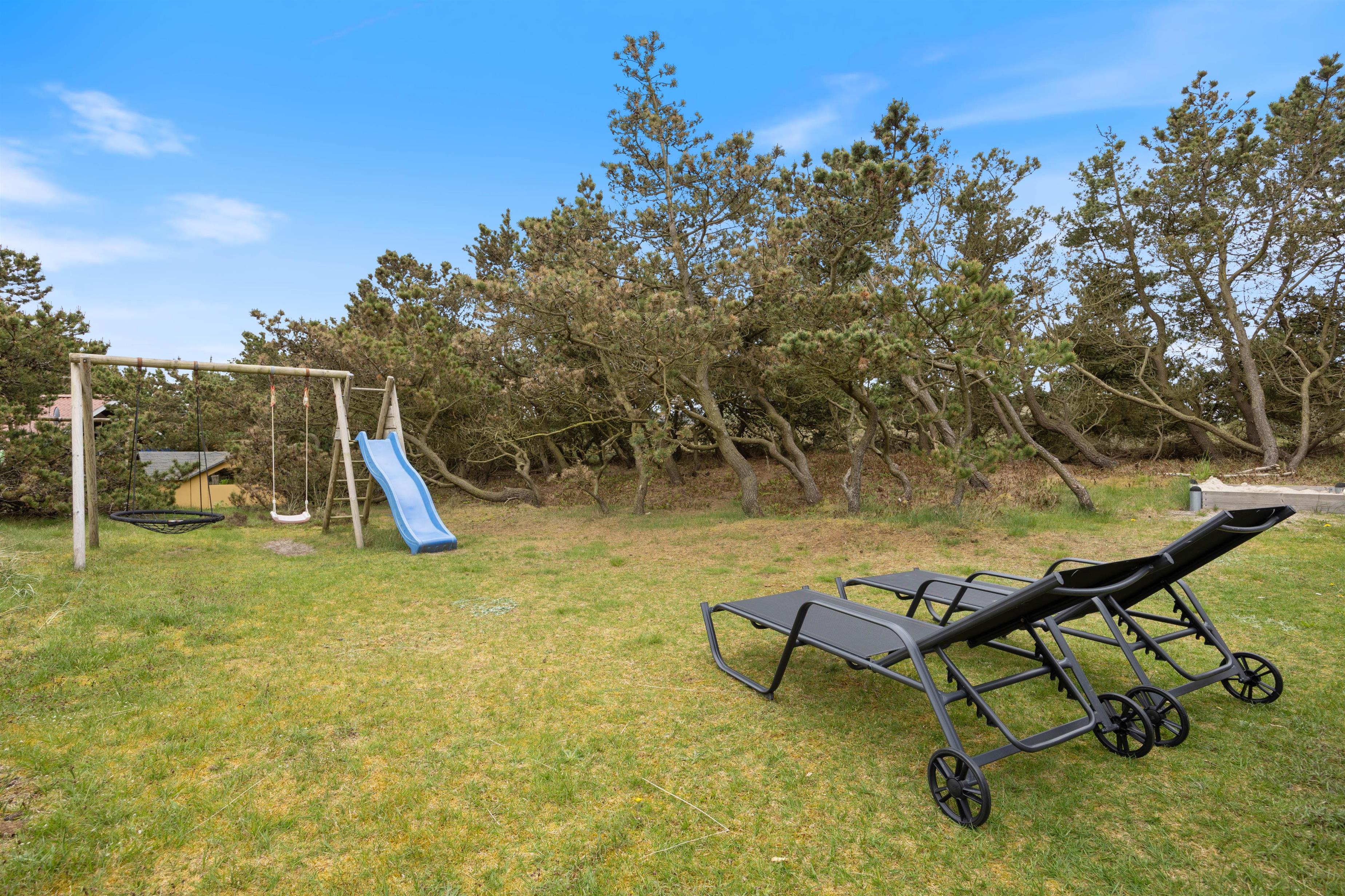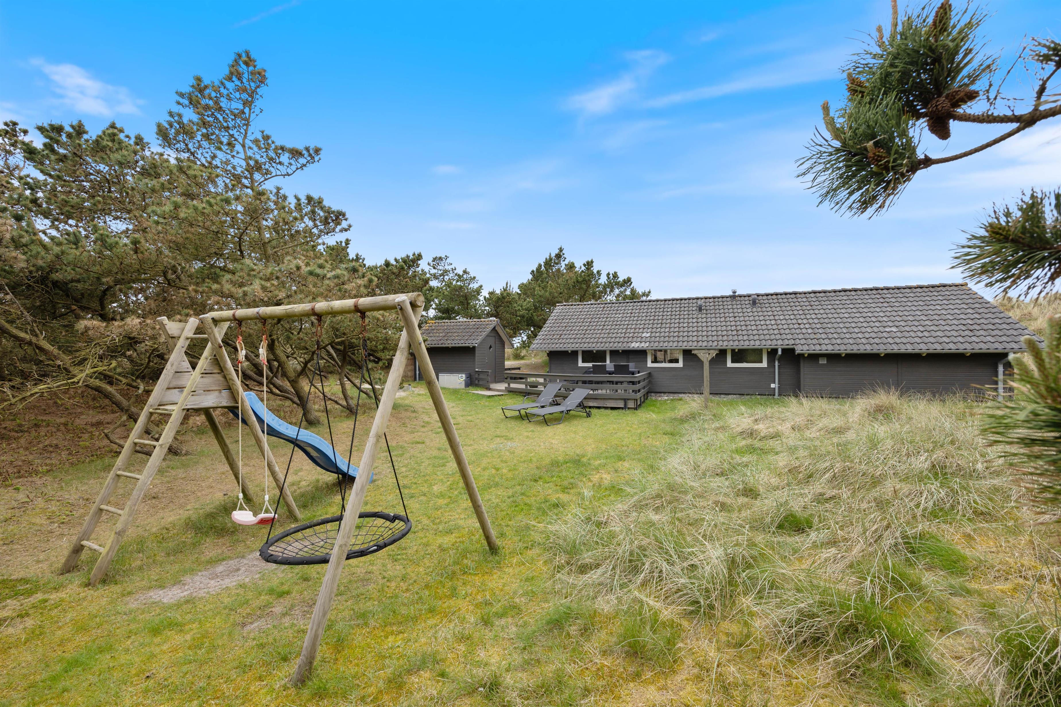 Til huset hører en stor træterrasse, der strækker sig rundt om 3 sider af feriehuset. En del af terrassen er afskærmet og overdækket – ideelt til at sidde ude på mere blæsende dage eller til at nyde skyggen. Forskellige havemøbler indbyder til at nyde solen morgen, middag og aften. Til hyggelige stunder står der også en grill til rådighed – perfekt til lune sommeraftener i den friske havluft. Også familiens yngste kan glæde sig. Her venter nemlig både gynger og sandkasse - så leg i det fri er garanteret. Dette feriehus med sin dejlige beliggenhed er som skabt til en afslappende familieferie, hvor komfort og natur går hånd i hånd.