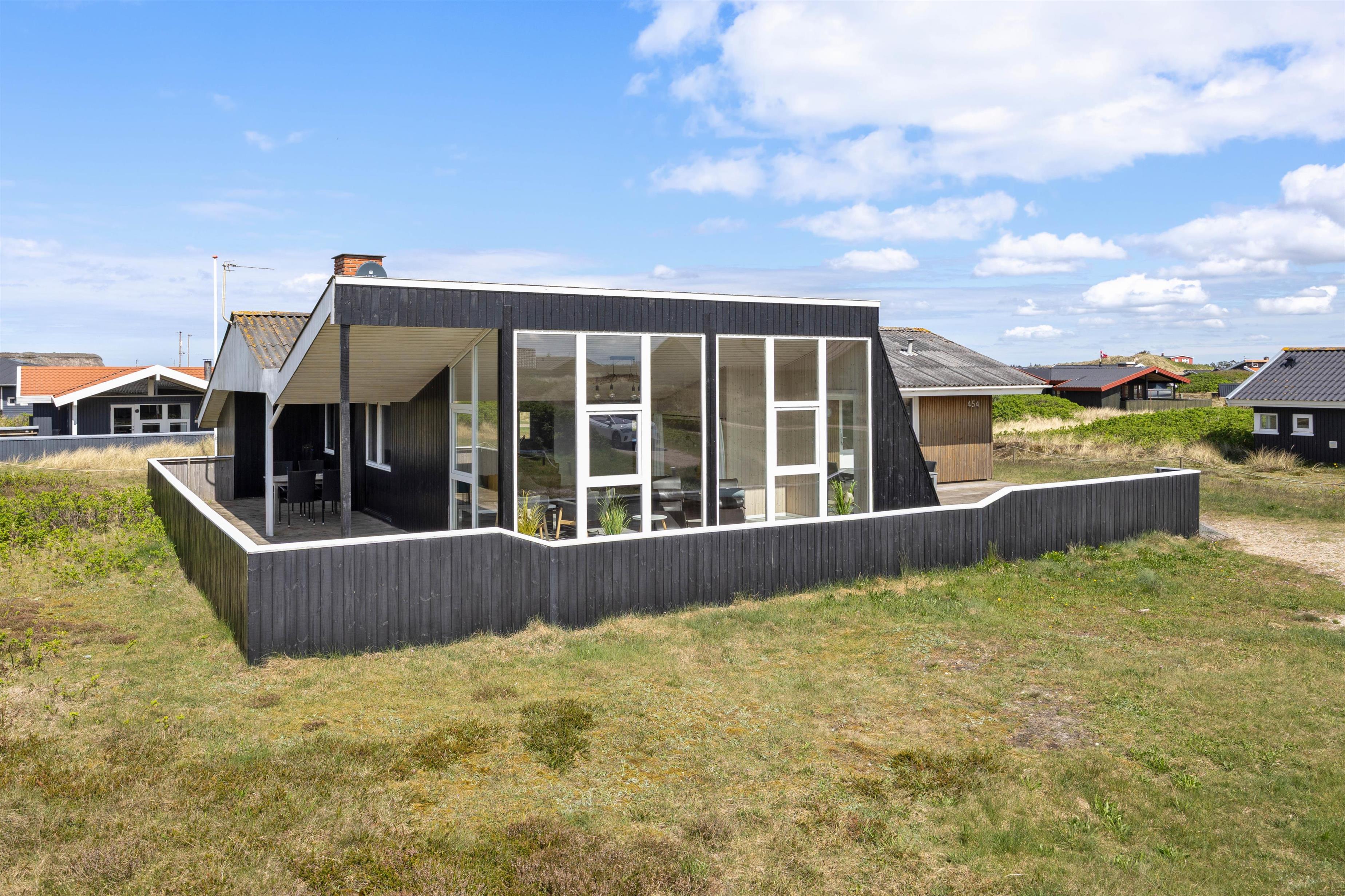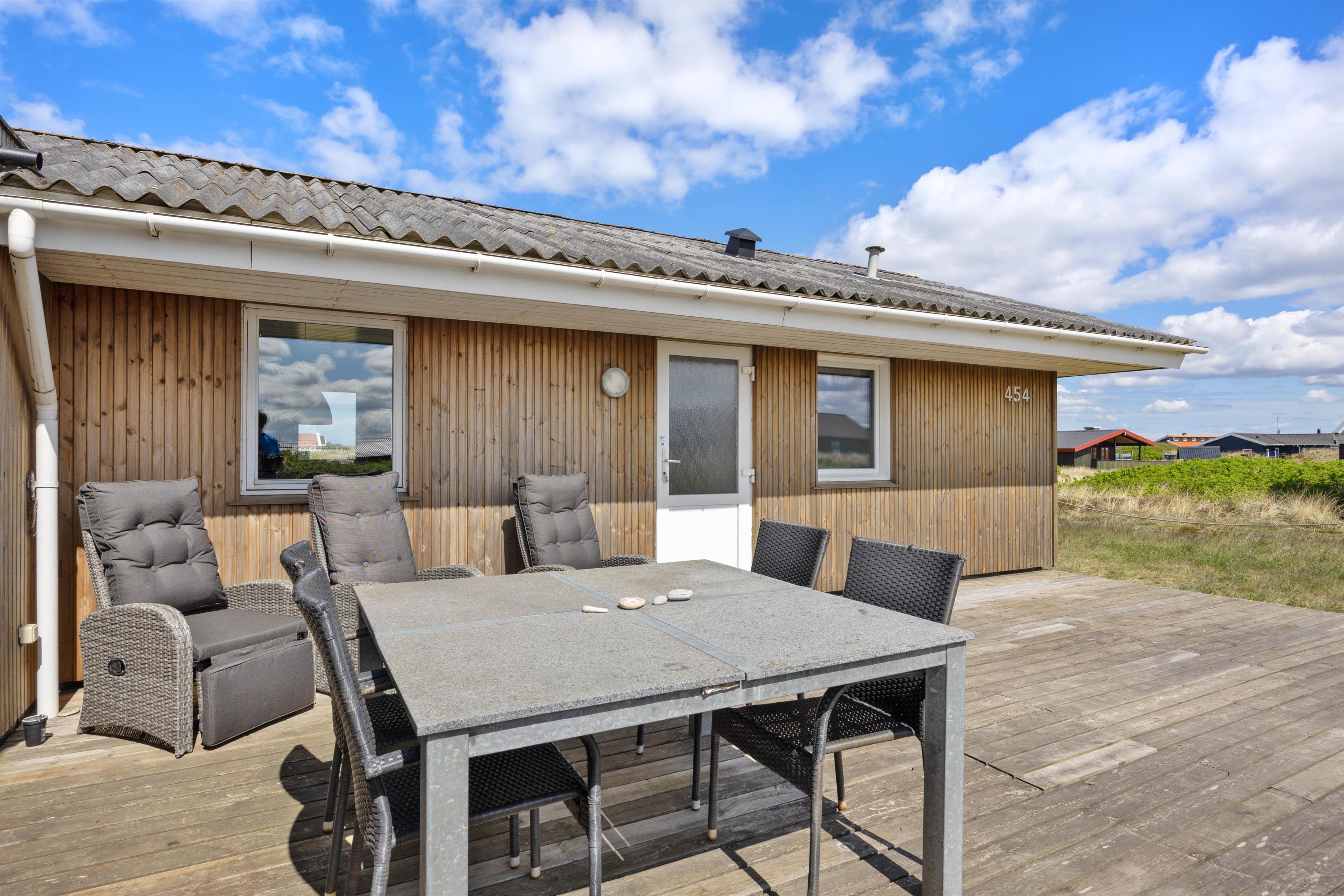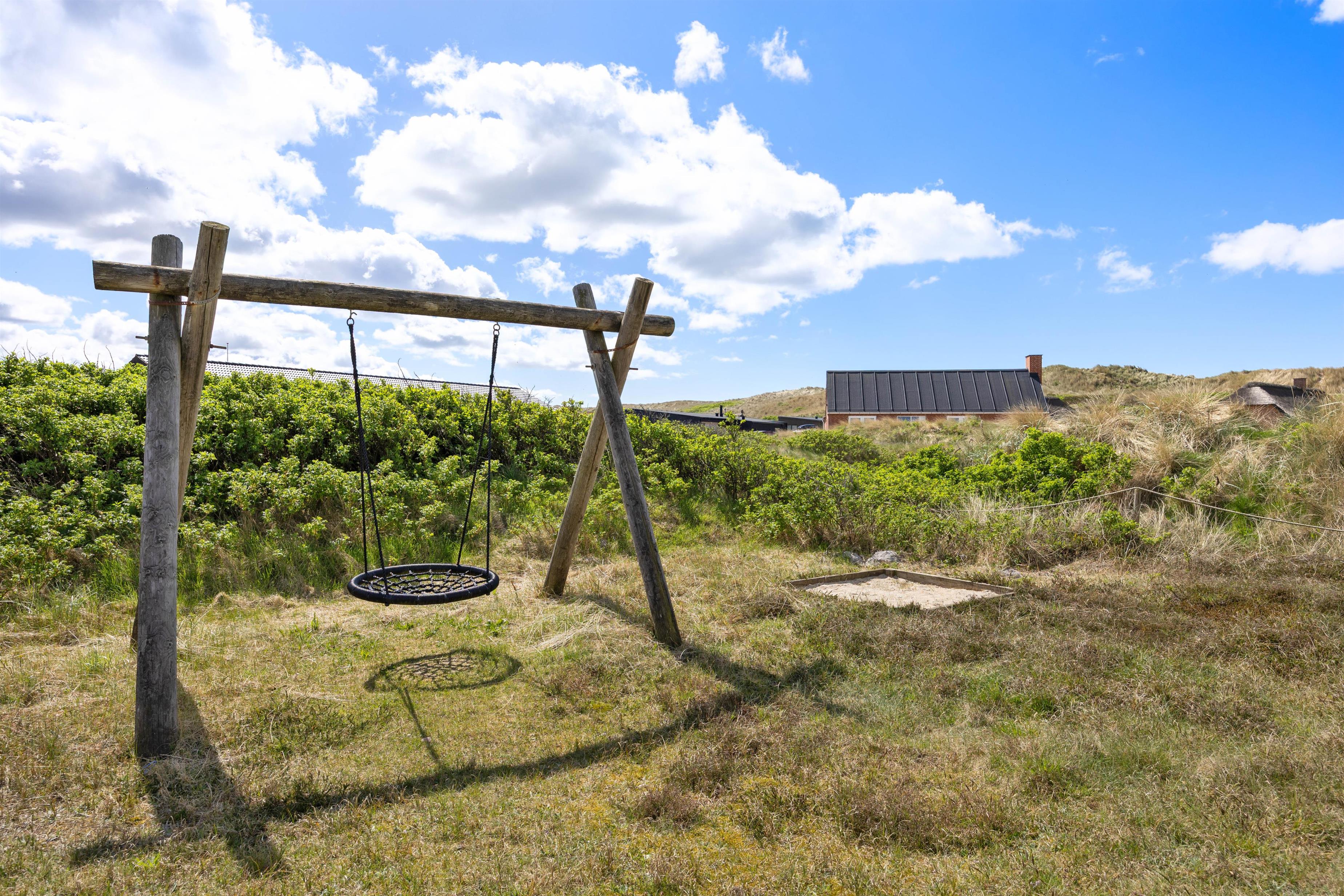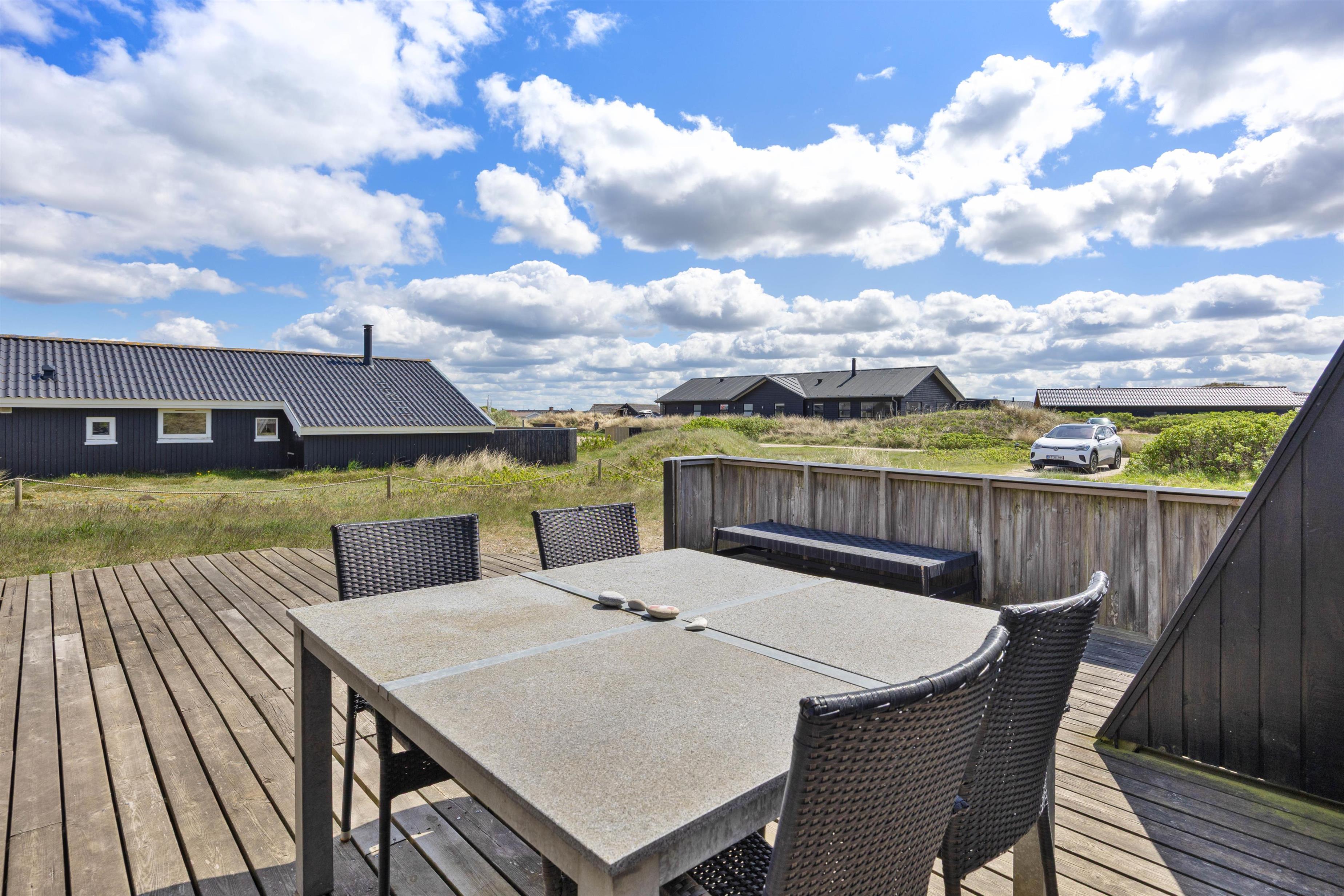 Sommerhuset er beliggende på en stor naturgrund i det storslåede klit- og hedelandskab på Holmsland Klit på Danmarks vestkyst. På den store og delvist overdækkede terrasse kan I i fred og ro nyde naturen og den friske vesterhavsluft. Her finder I naturligvis havemøbler, liggestole og en grill, som gør feriemadlavningen til en fornøjelse.