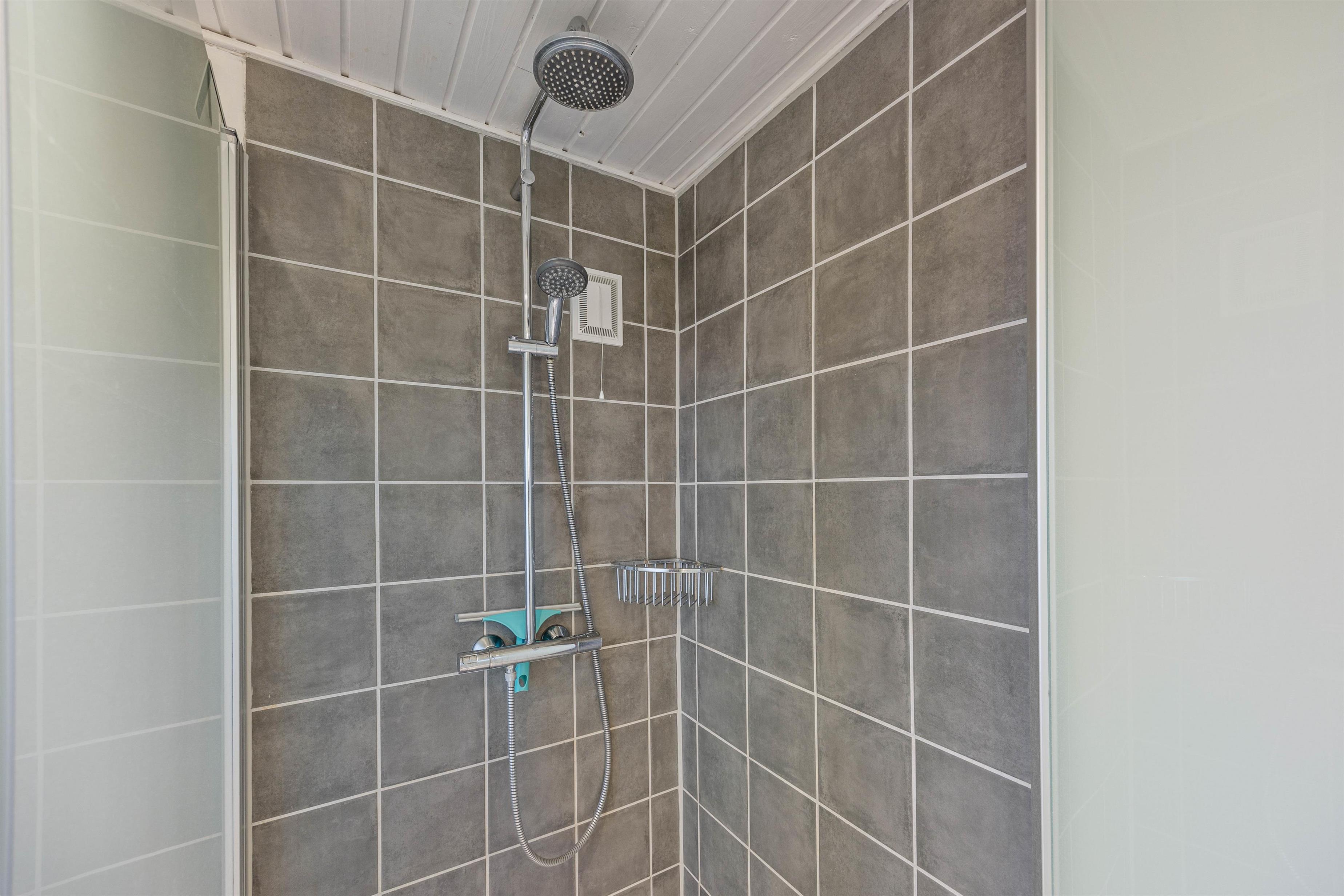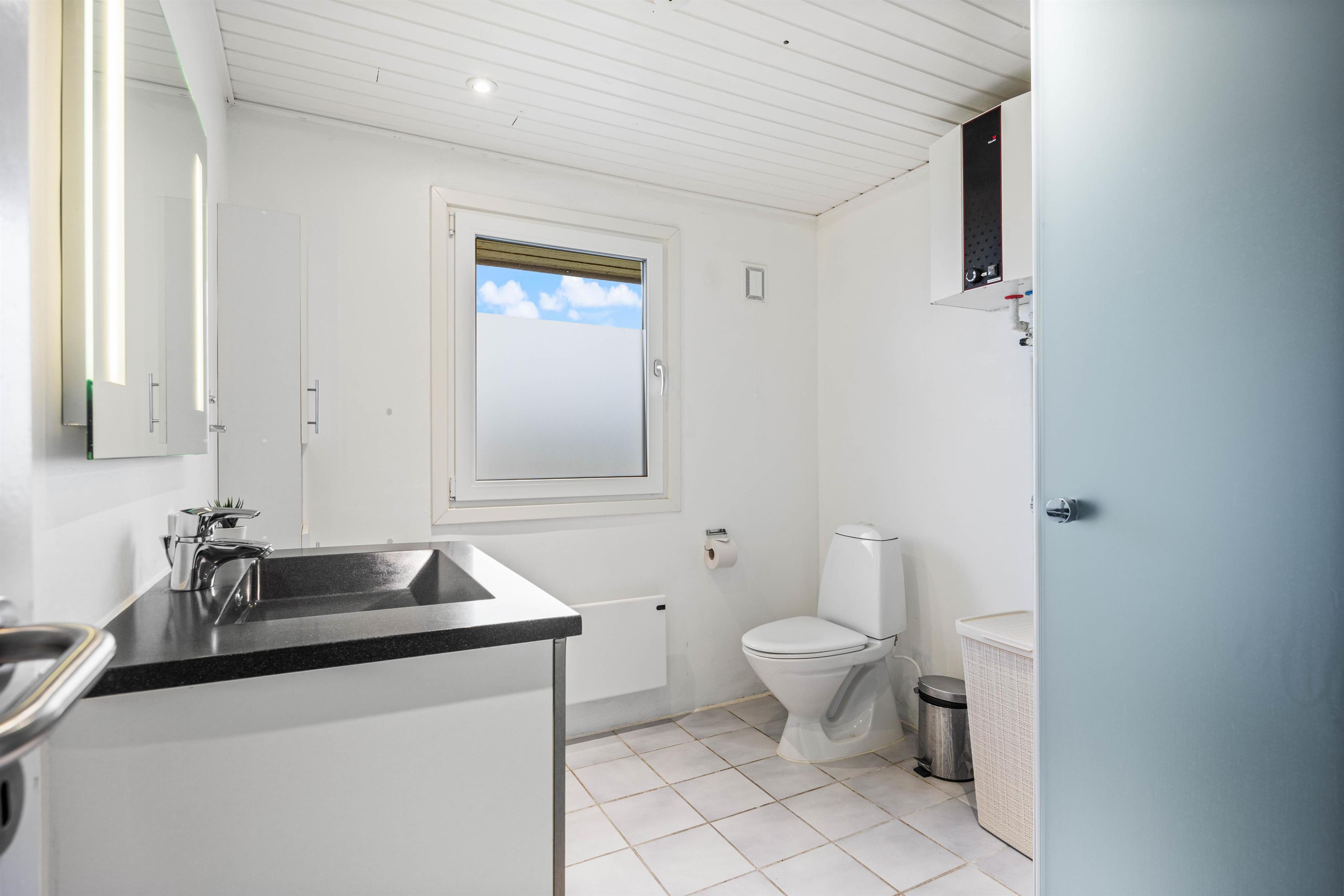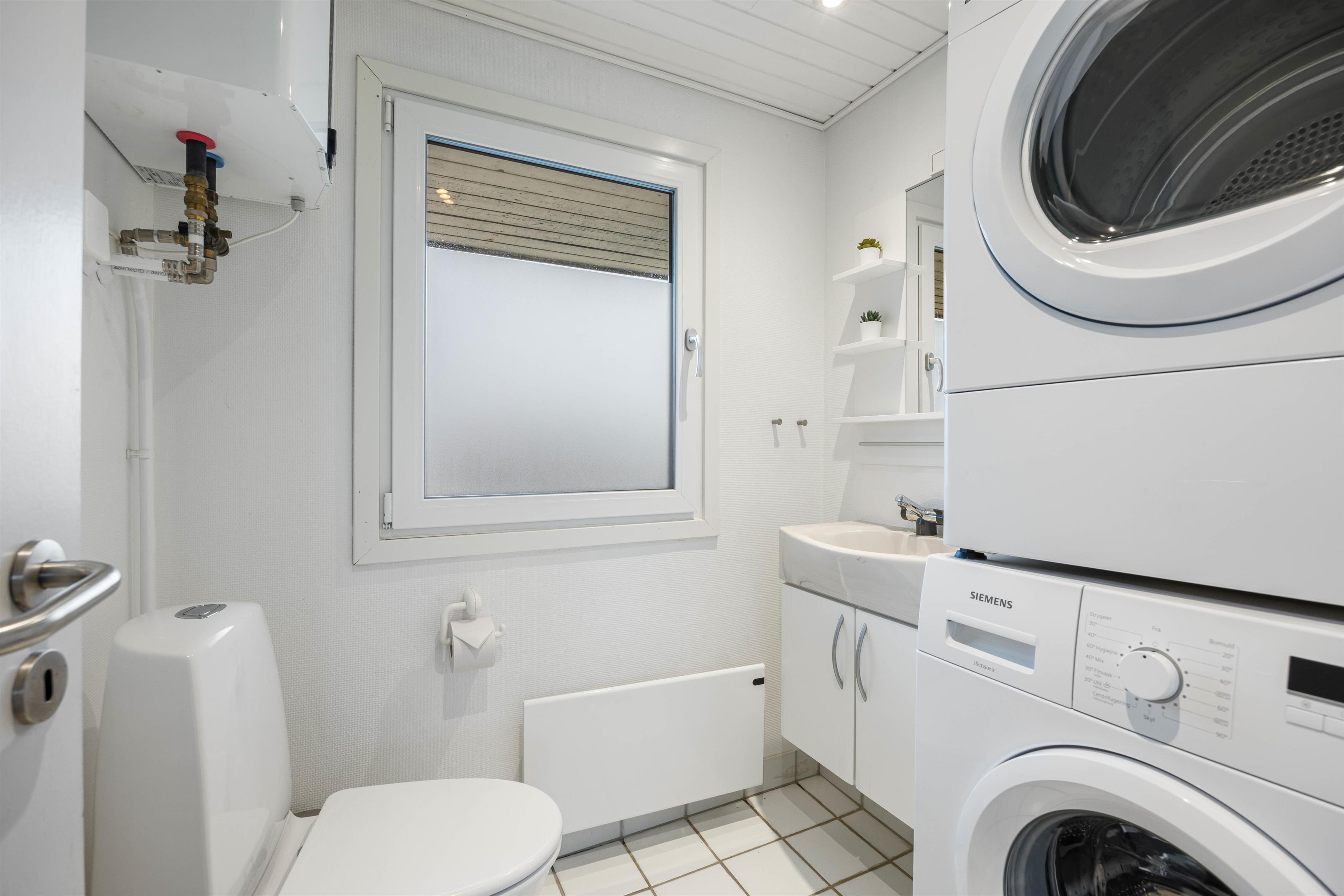 Sommerhuset har et stort badværelse med bruser og gulvvarme samt et mindre gæstetoilet med vaskemaskine og tørretumbler.
