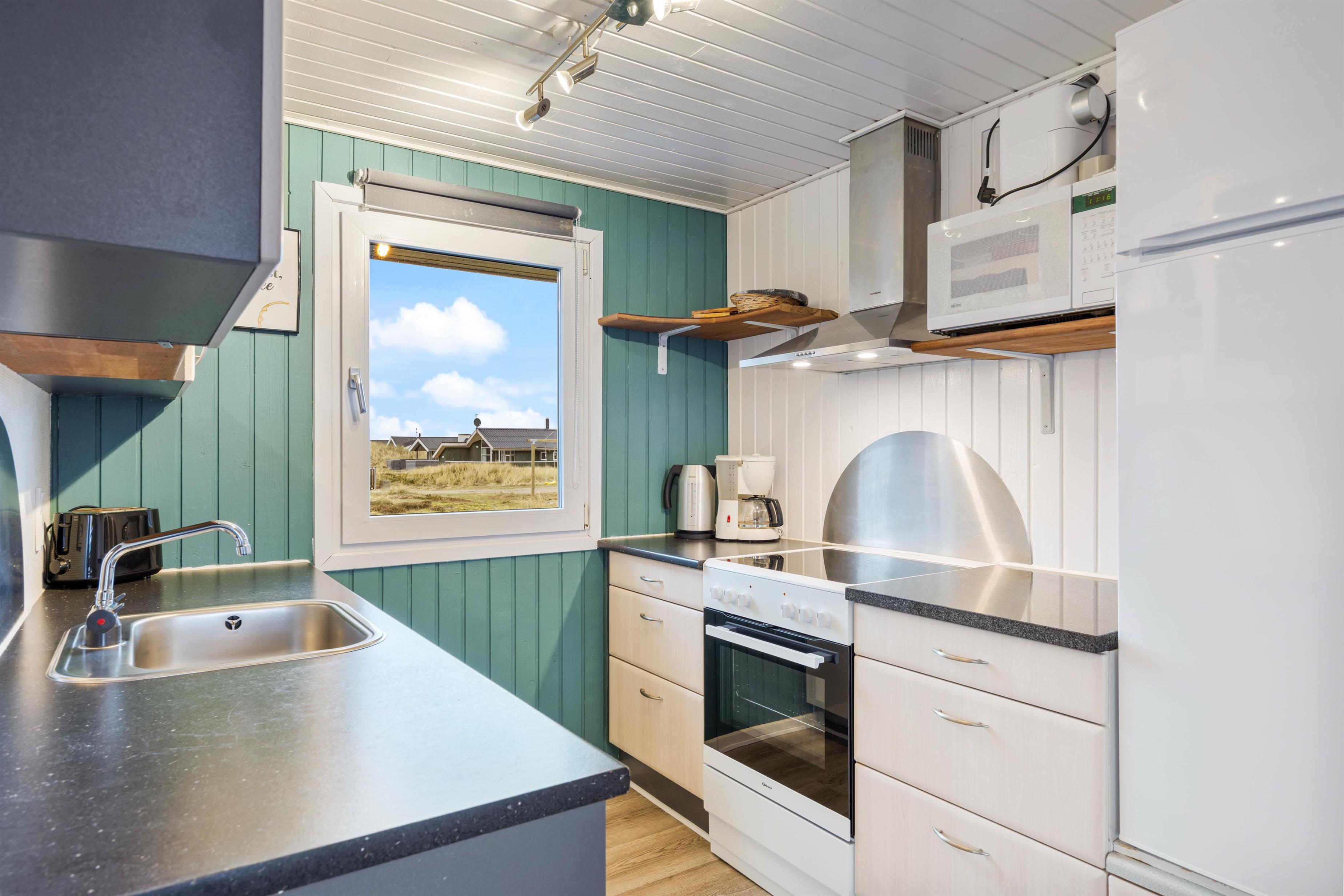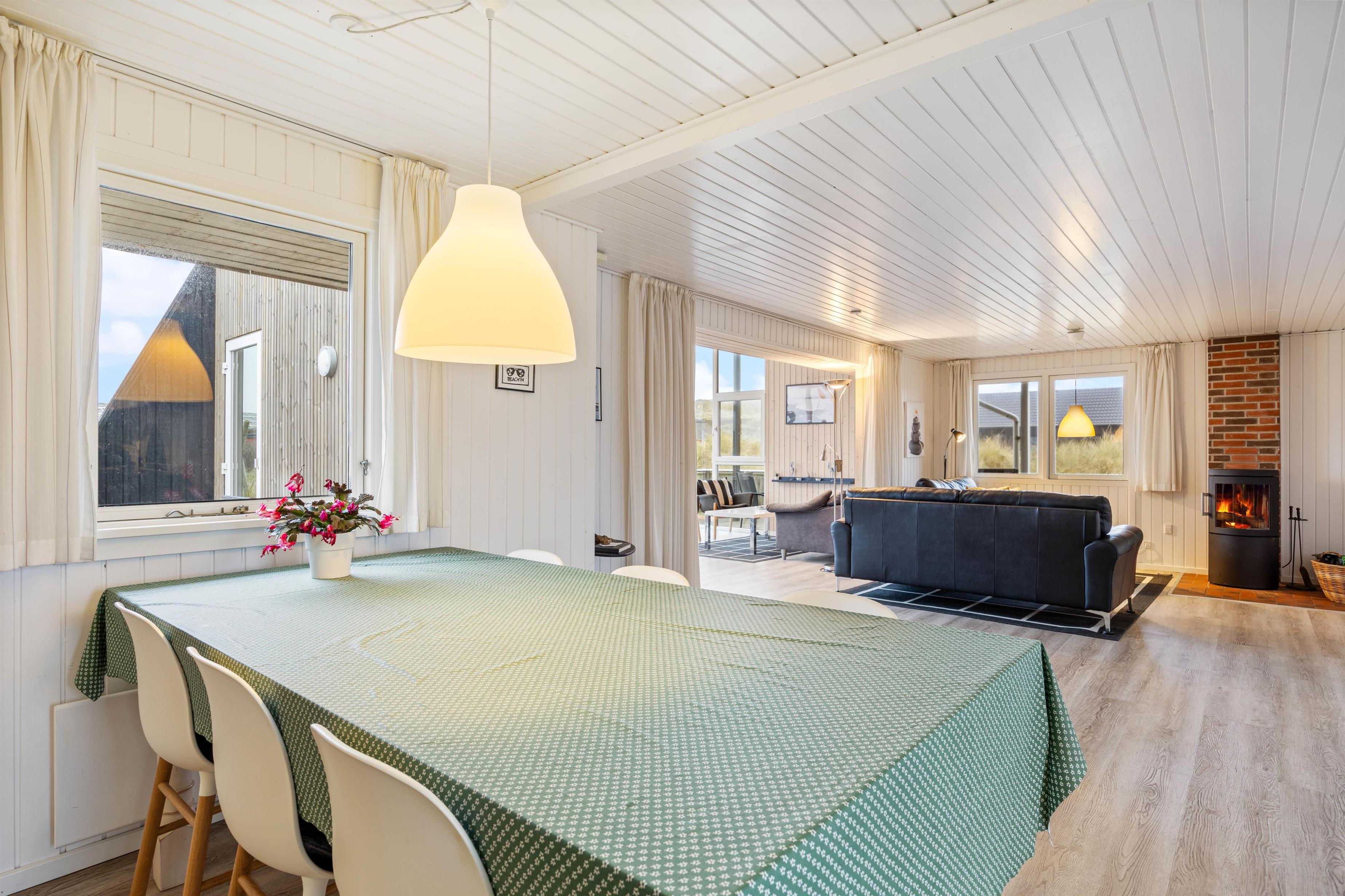 Dette feriehus har en fin indretning med masser af plads. Dejlig entre, der byder dig velkommen. Køkkenet er funktionelt indrettet, med alt i hvidevarer, praktisk spiseafdeling, som støder op til hyggelig TV-stue med brændeovn og varmepumpe.