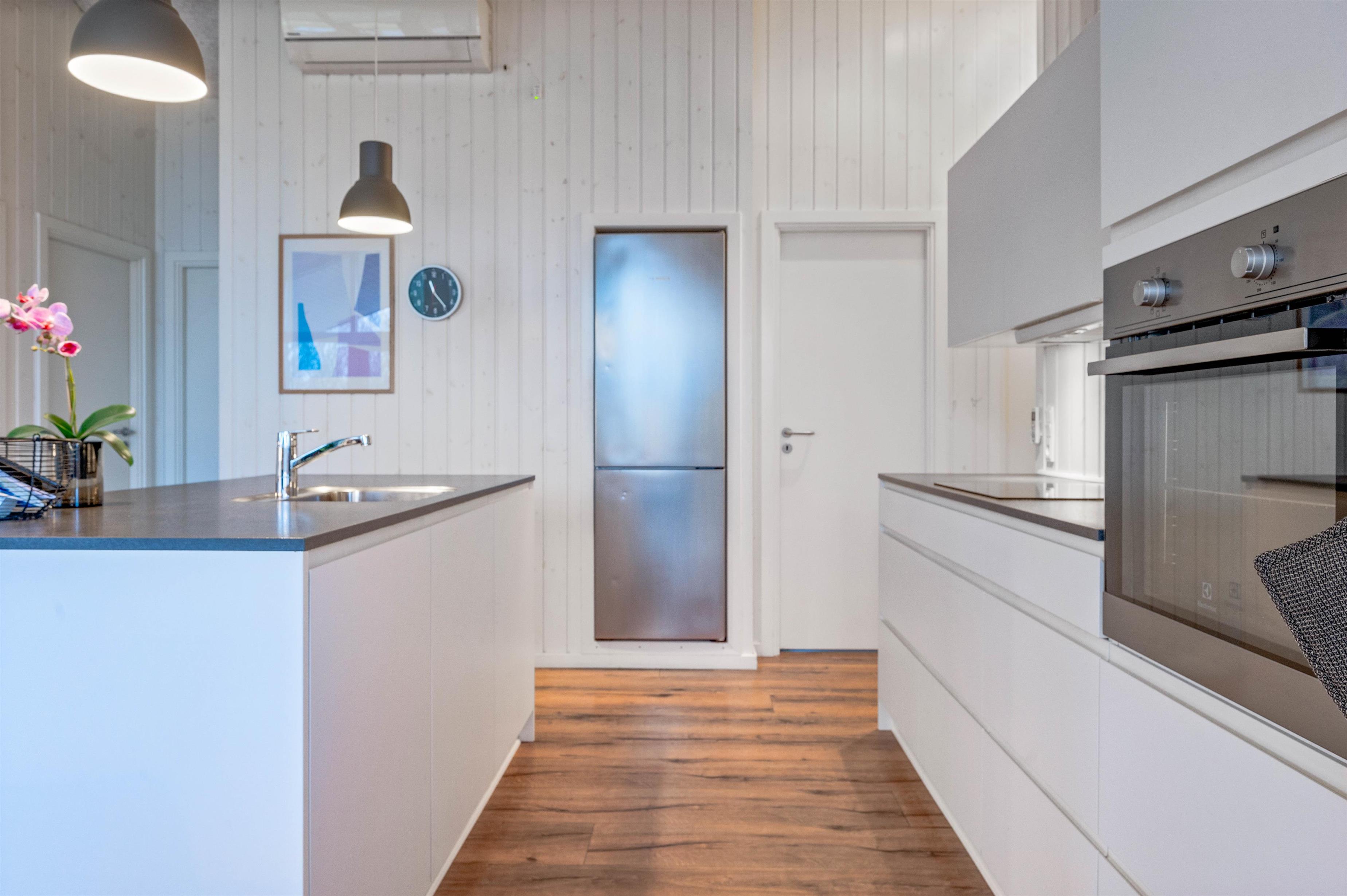 Et dejligt feriehus til otte personer, hvor jeres to firbenede venner også er velkomne. Den enkelte og moderne indretning skaber et feriehus, hvor man føler sig tilpas og har lyst til at være. Hjerterummet er det åbne køkken-alrum, hvor de store vinduer inviterer naturen indenfor. Her kan I koncentrere jer om hinanden og hygge jer med fælles madlavning, filmaftener i sofakrogen, sjove spil og planlægningen af feriens udflugter.