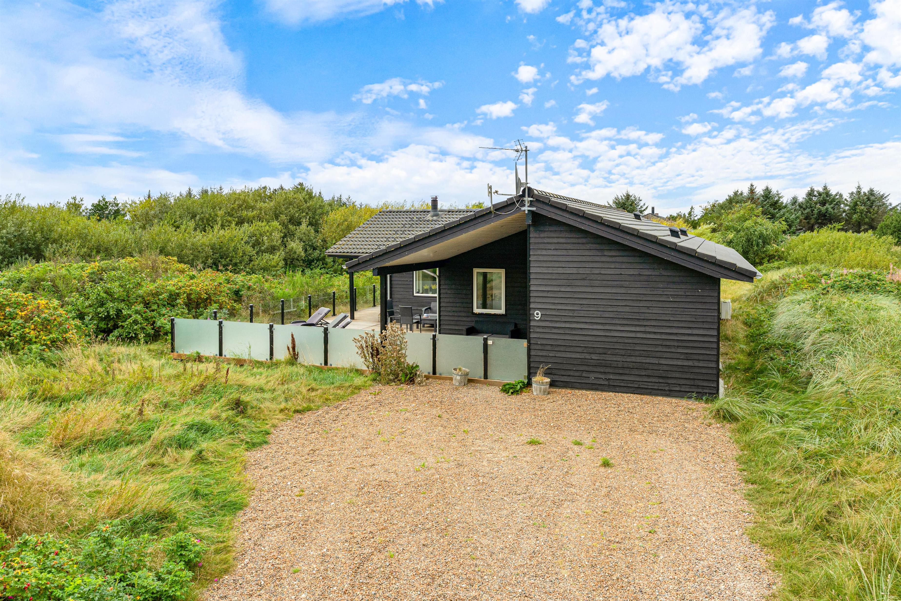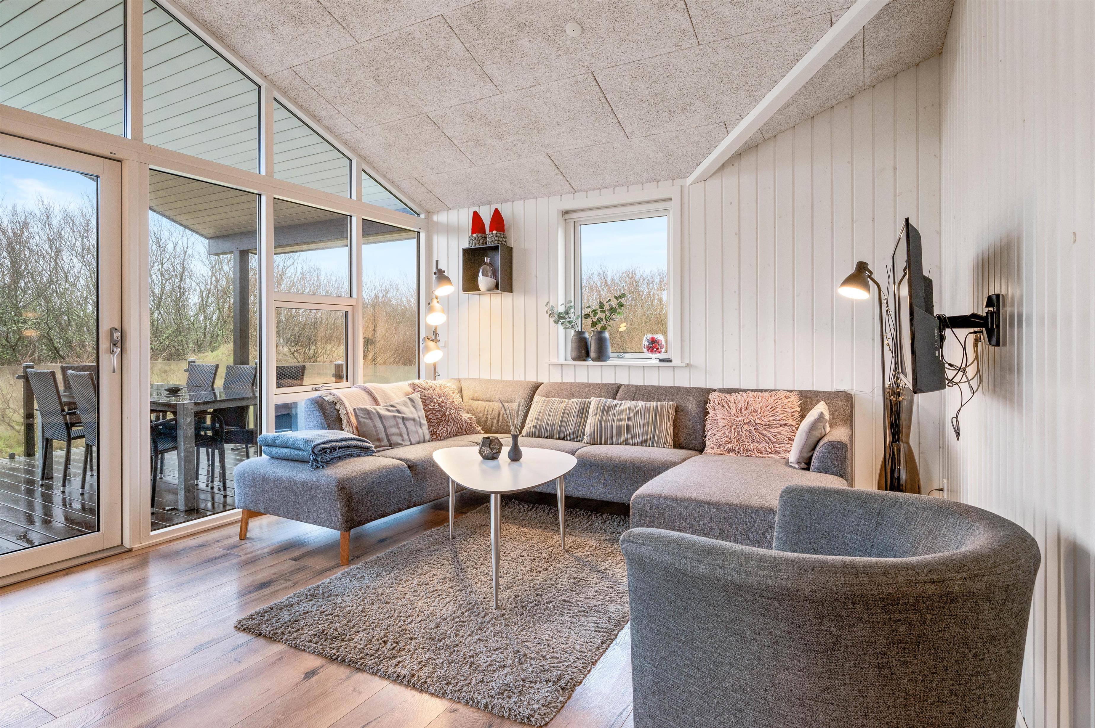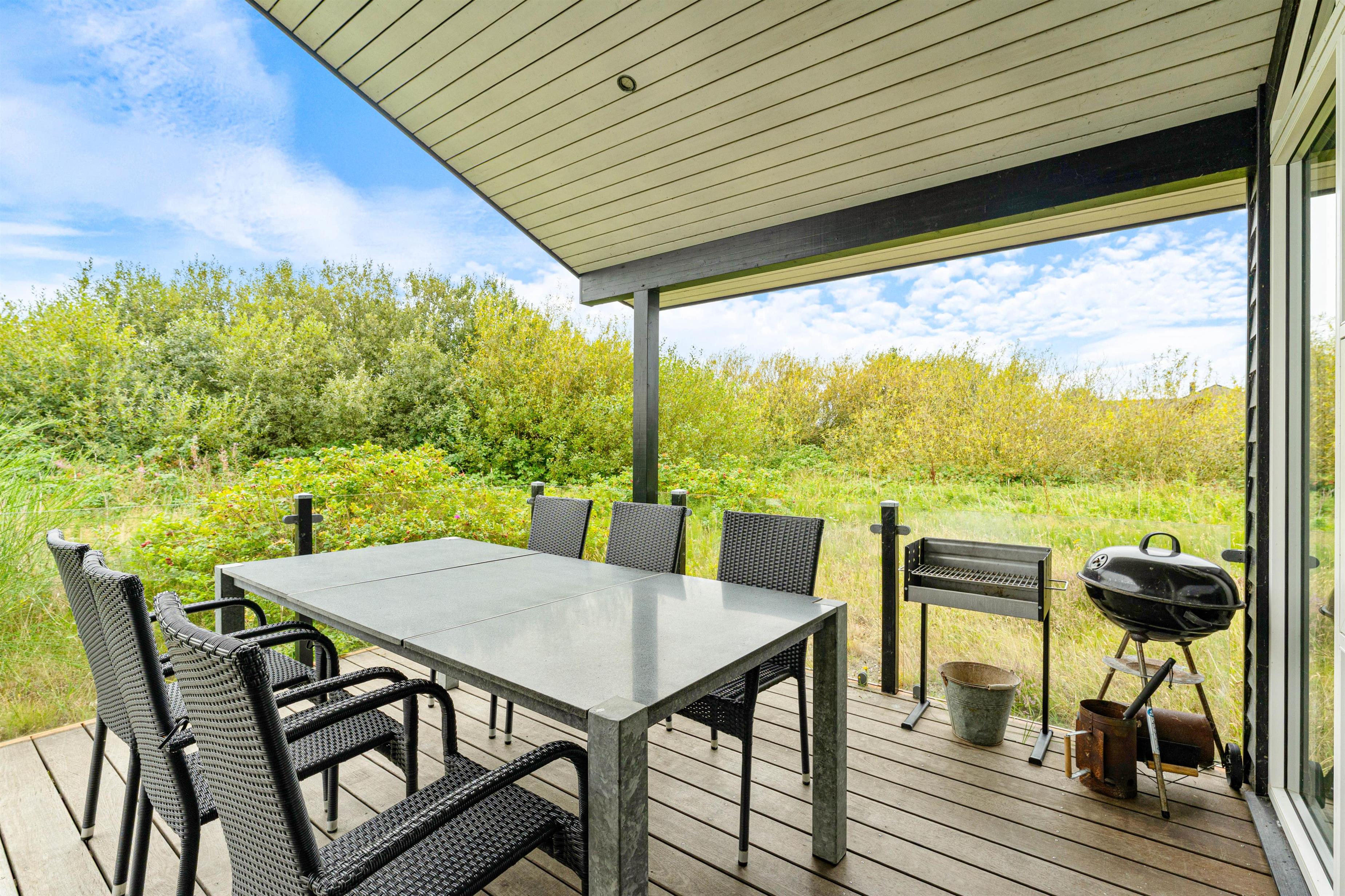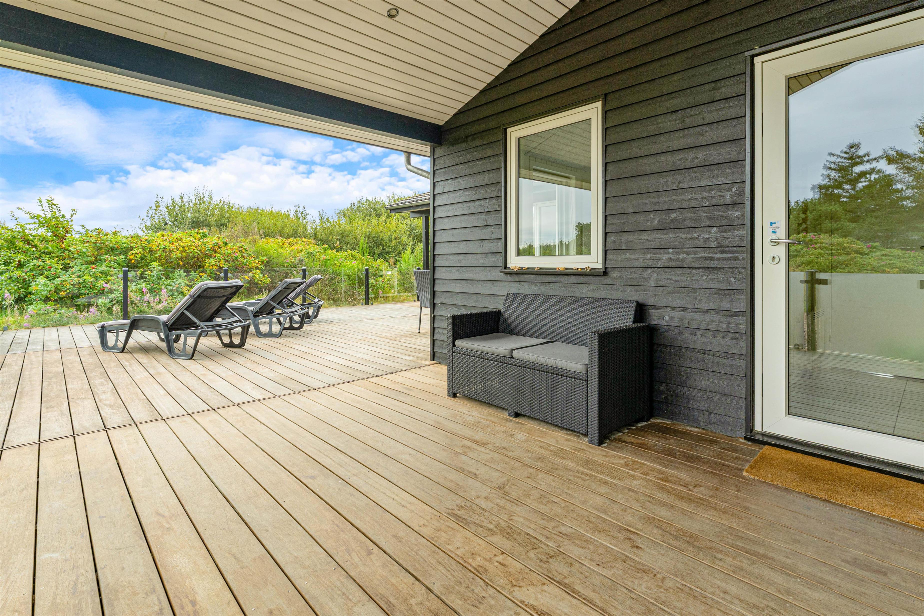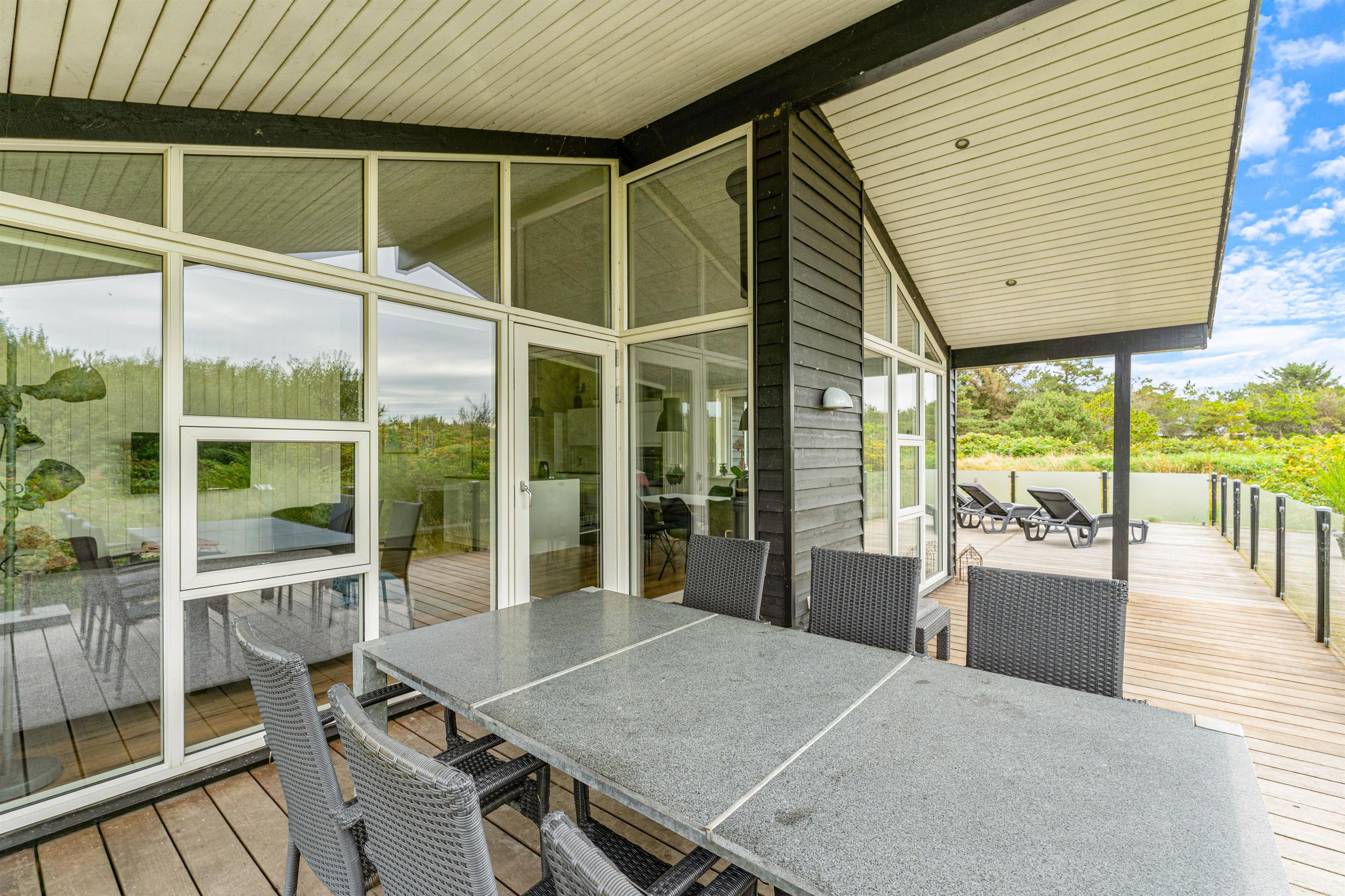 På østsiden af feriehuset finder I den dejligste terrasse med udsigt udover det fredede naturareal lige ved siden. Terrassen er lukket, delvist overdækket og tilmed inddelt i mange fine zoner, hvor der er plads til udendørshygge; alt fra solbadning på solsengene til en lækker drink i det skønne loungeområde.