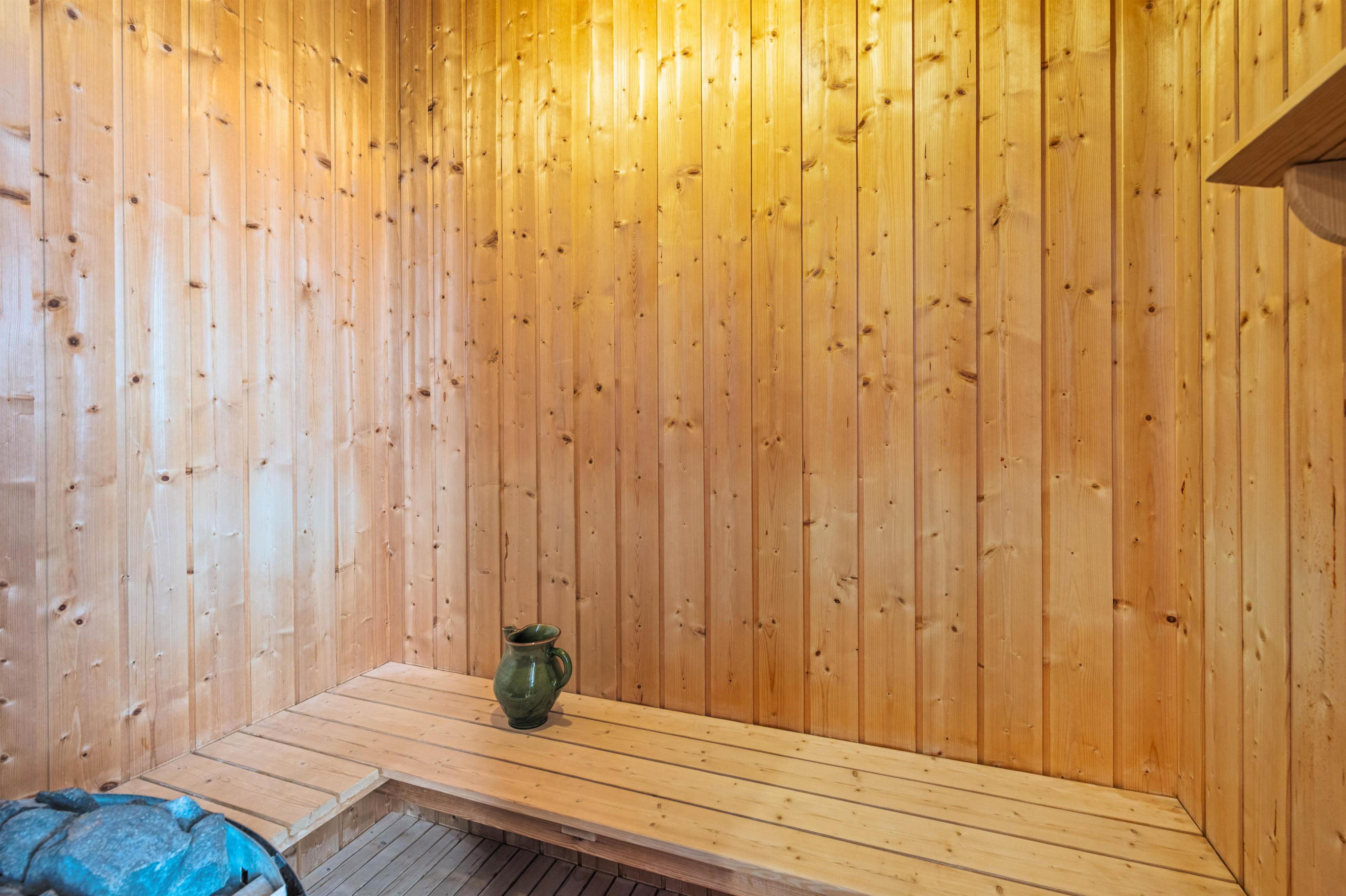 Det store badeværelse med marmorfliser har gulvvarme, så ingen fryser fødderne om morgenen. Herfra har I adgang til sommerhusets sauna, som indbyder til afslapning og velvære efter en god og oplevelsesrig feriedag.