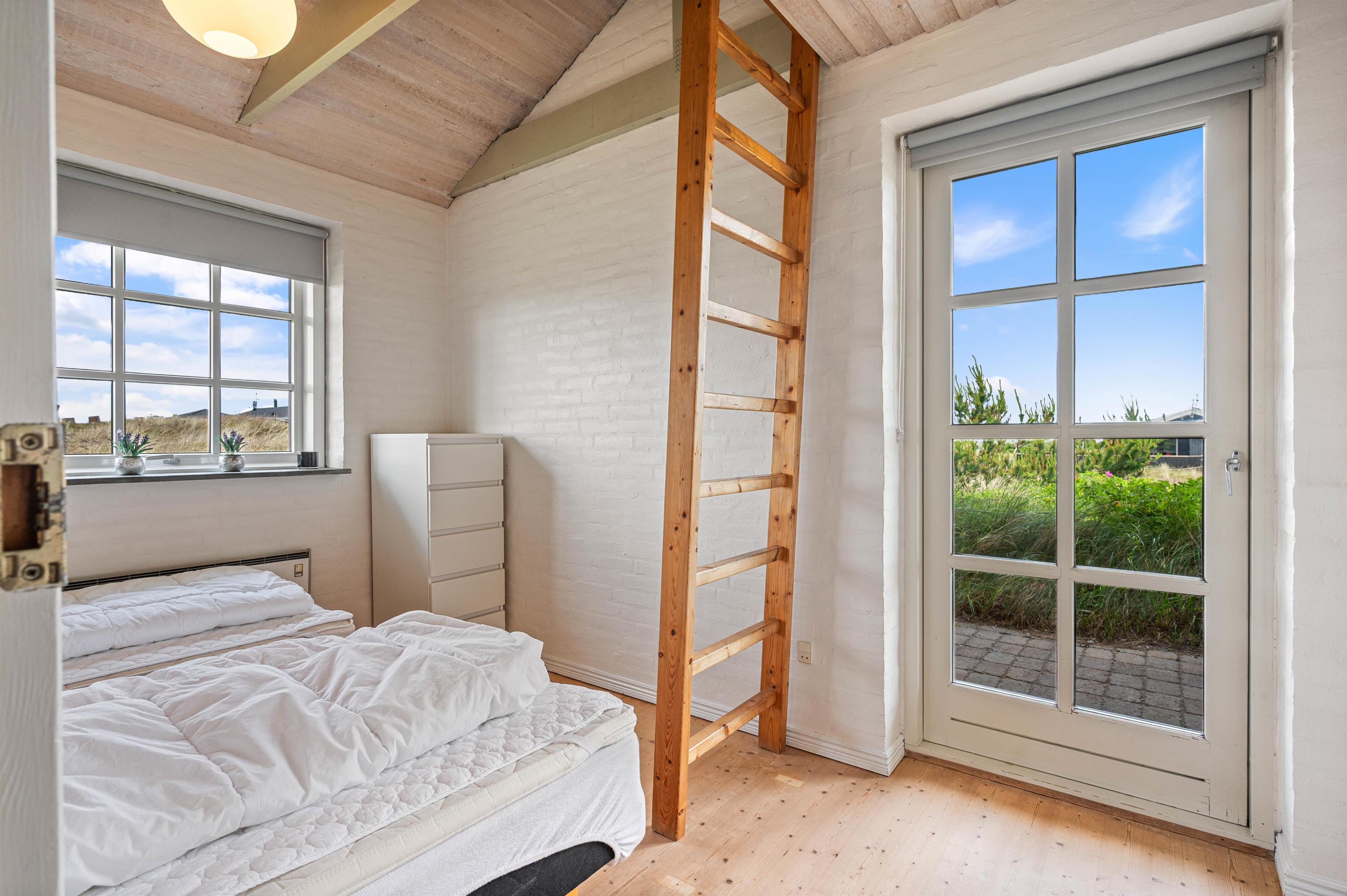 Sommerhuset har 3 gode soveværelser, hvoraf det ene er indrettet med en dobbeltseng. De sidste værelser er indrettet med komfortable enkeltsenge, og fra det ene har I adgang til hemsen.
