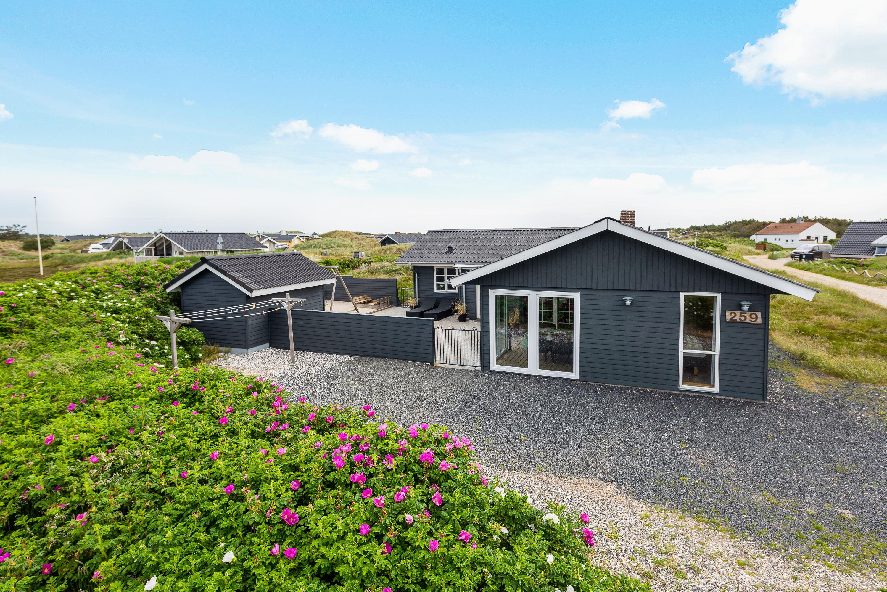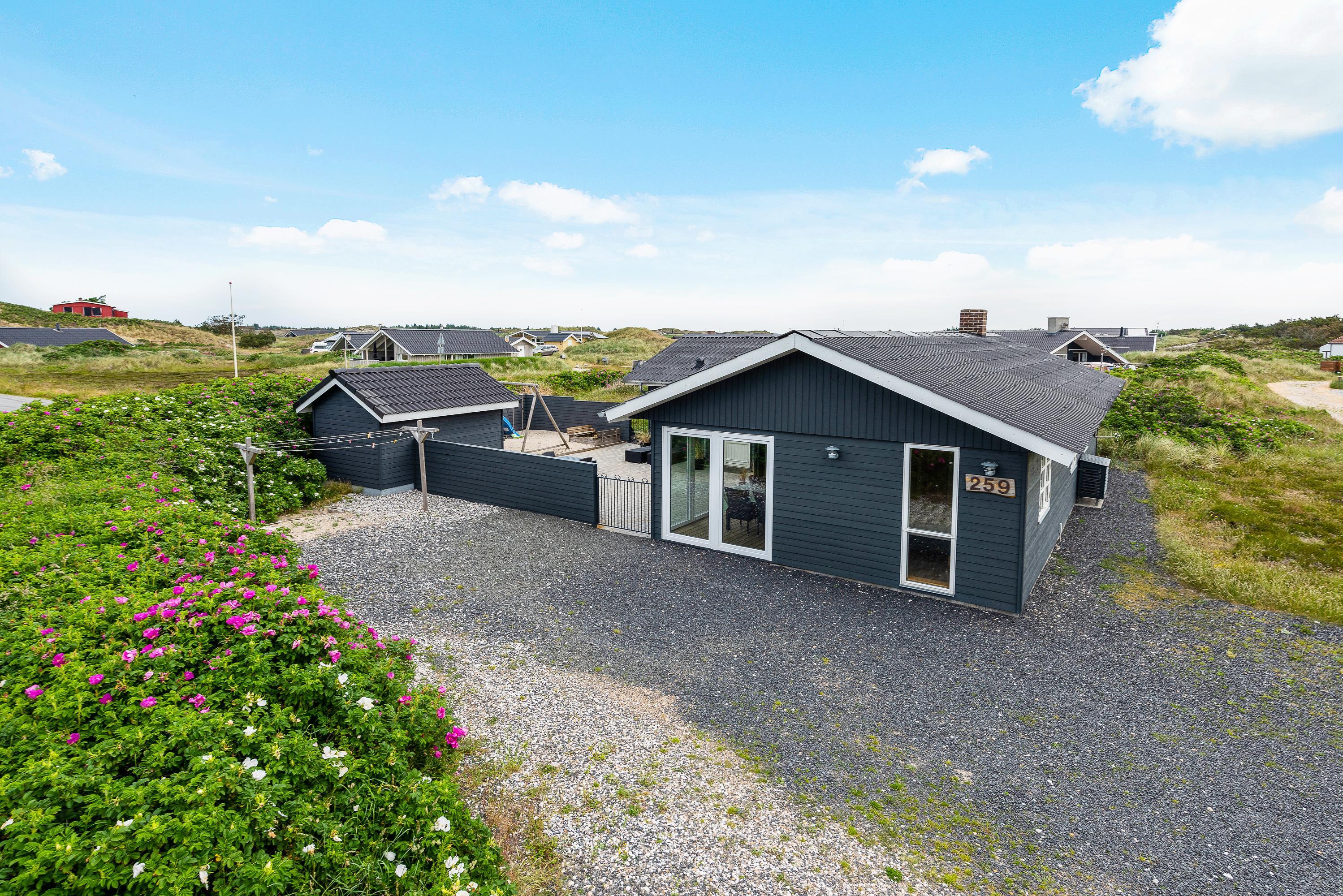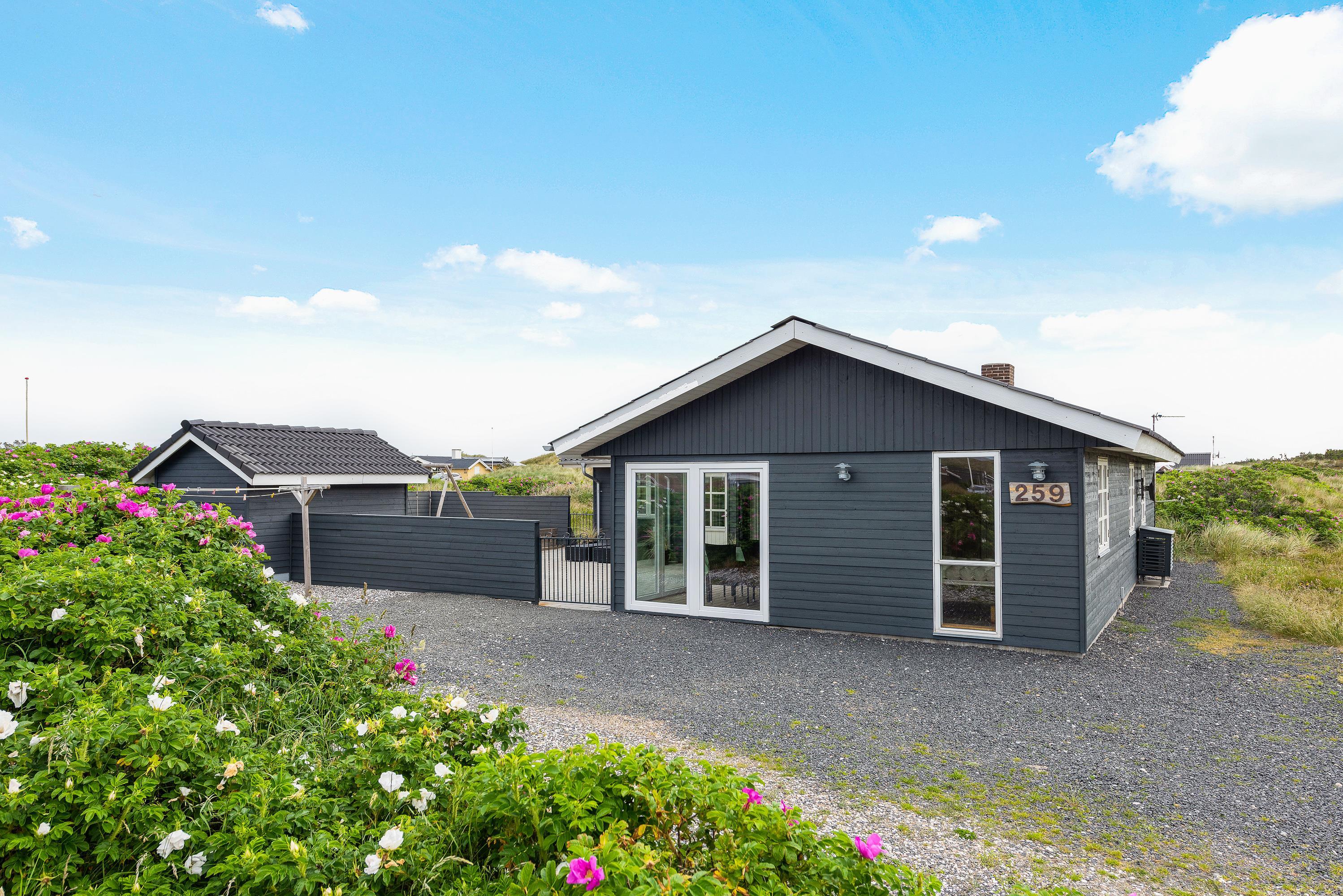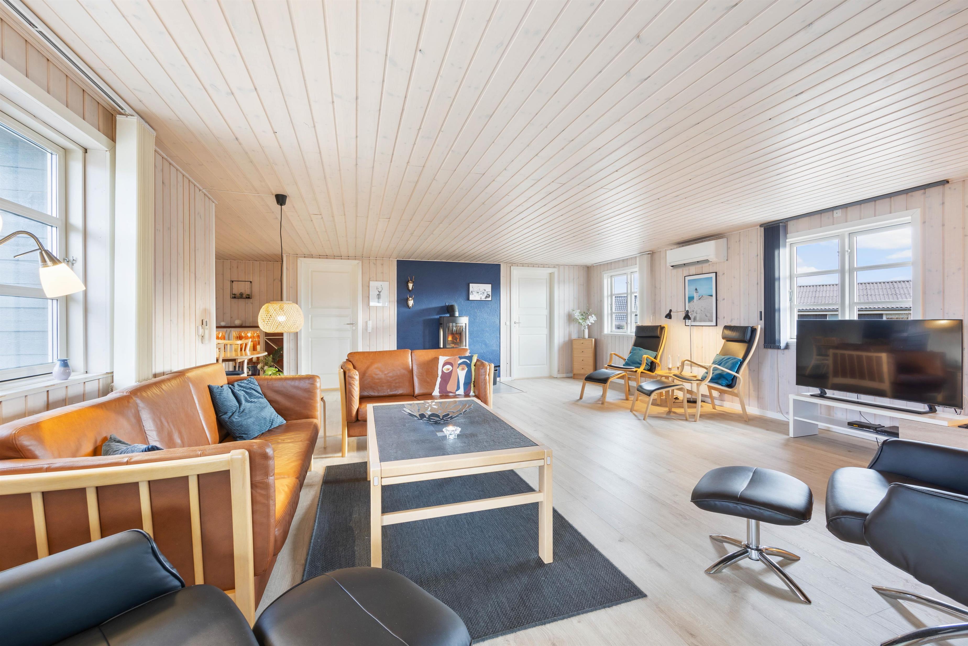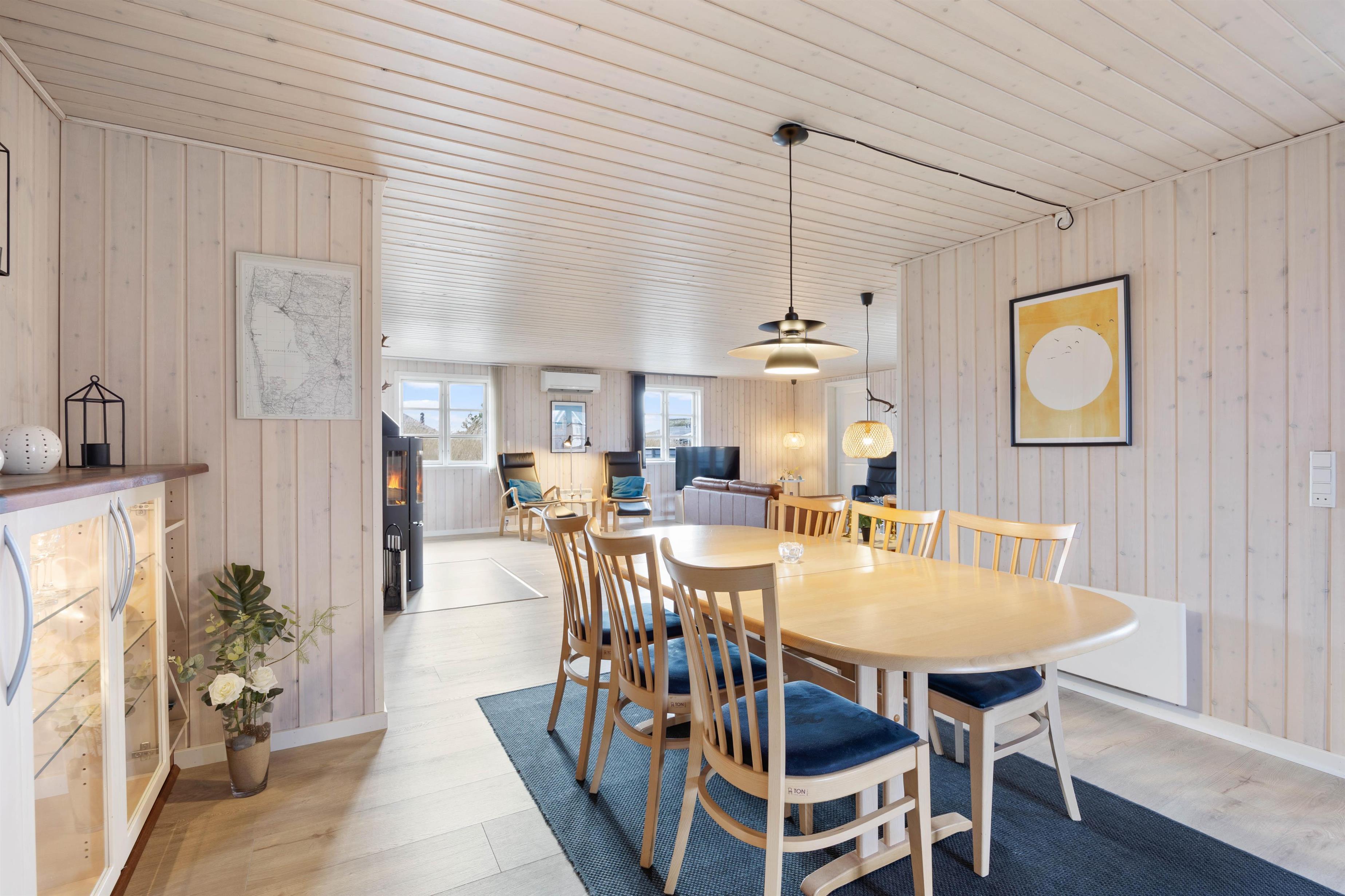 Det hyggelige 6 personers-træferiehus på Bjerregårdsvej 259 er flot og moderne indrettet med lyse vægge og lofter samt behagelige møbler. Det store åbne køkken- og stueområde er sommerhusets hjerte – og her kan alle være med i fællesskabet.
