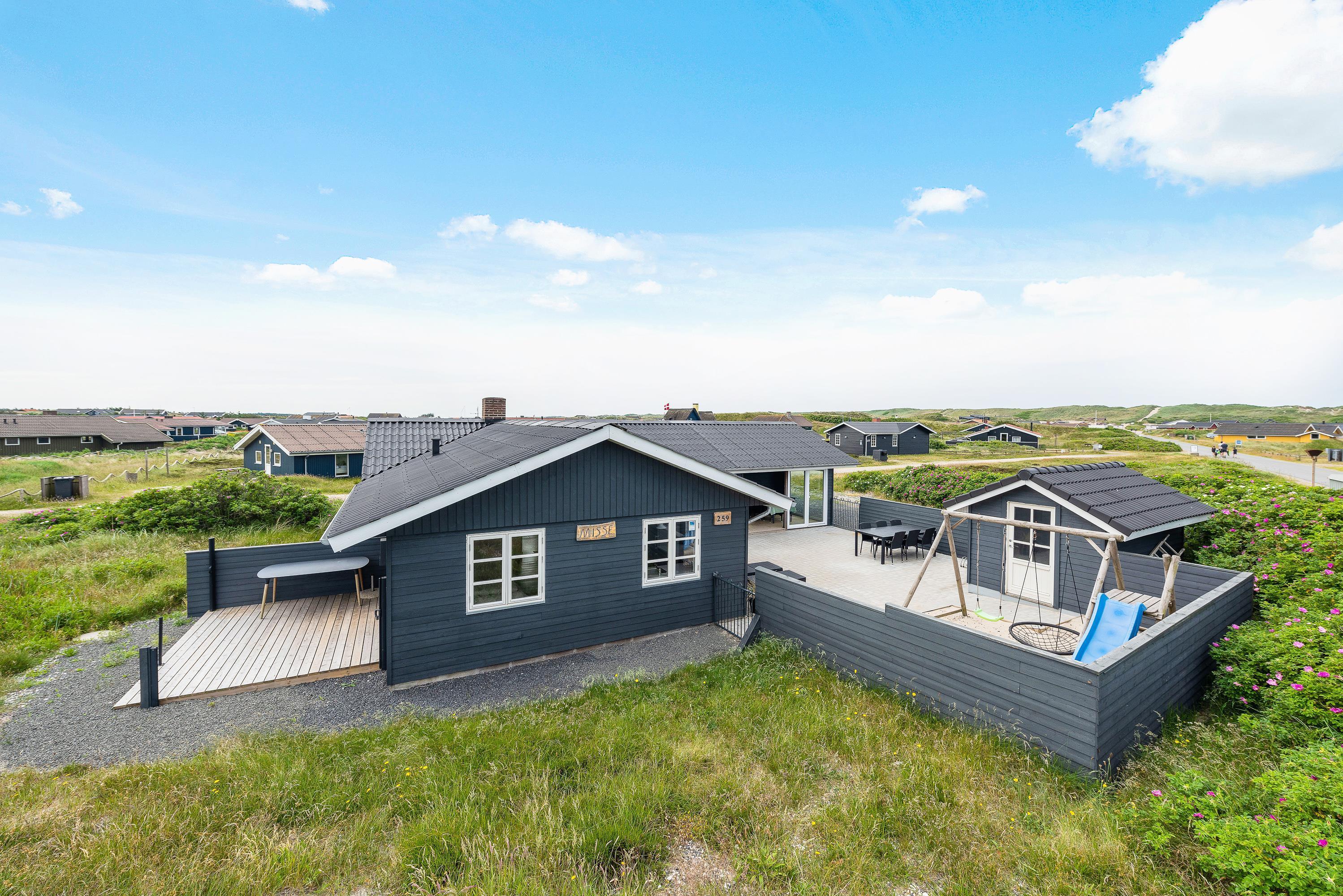 Slap af på den store lukkede terrasse mod nordvest. Her kan I uden bekymring lade børnene og hundene lege frit, mens I slapper af i liggestolene. Her er et stort legeområde med sandkasse, gynger og rutsjebane, som alle børn vil elske.