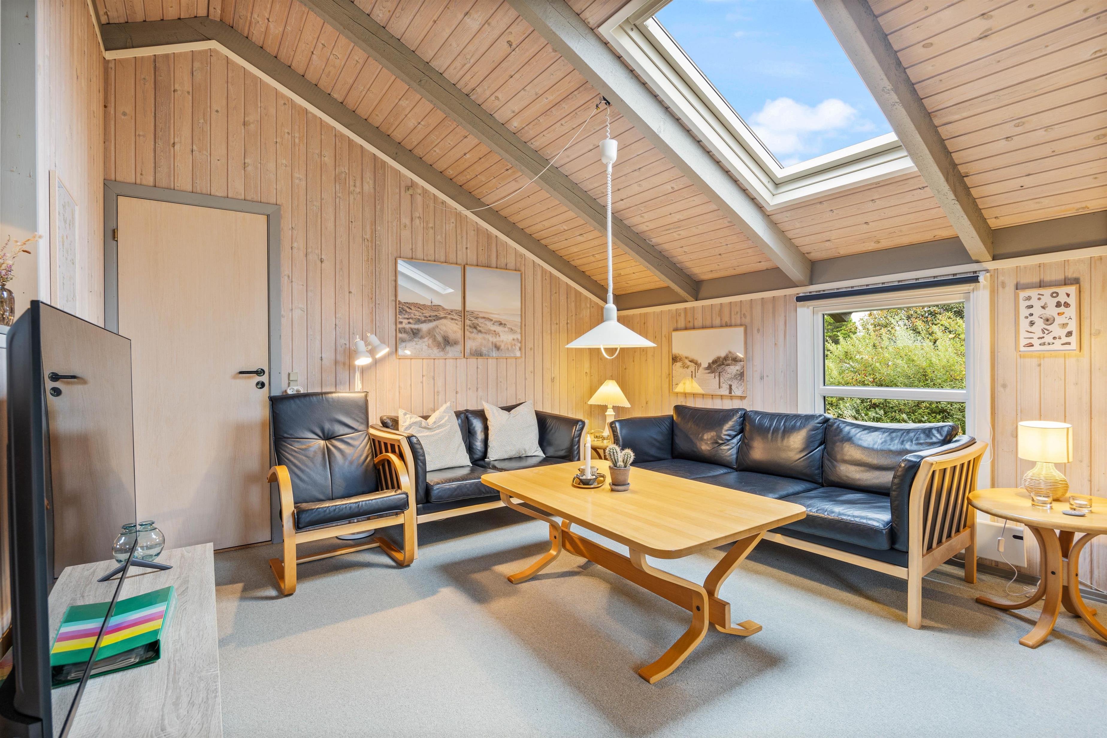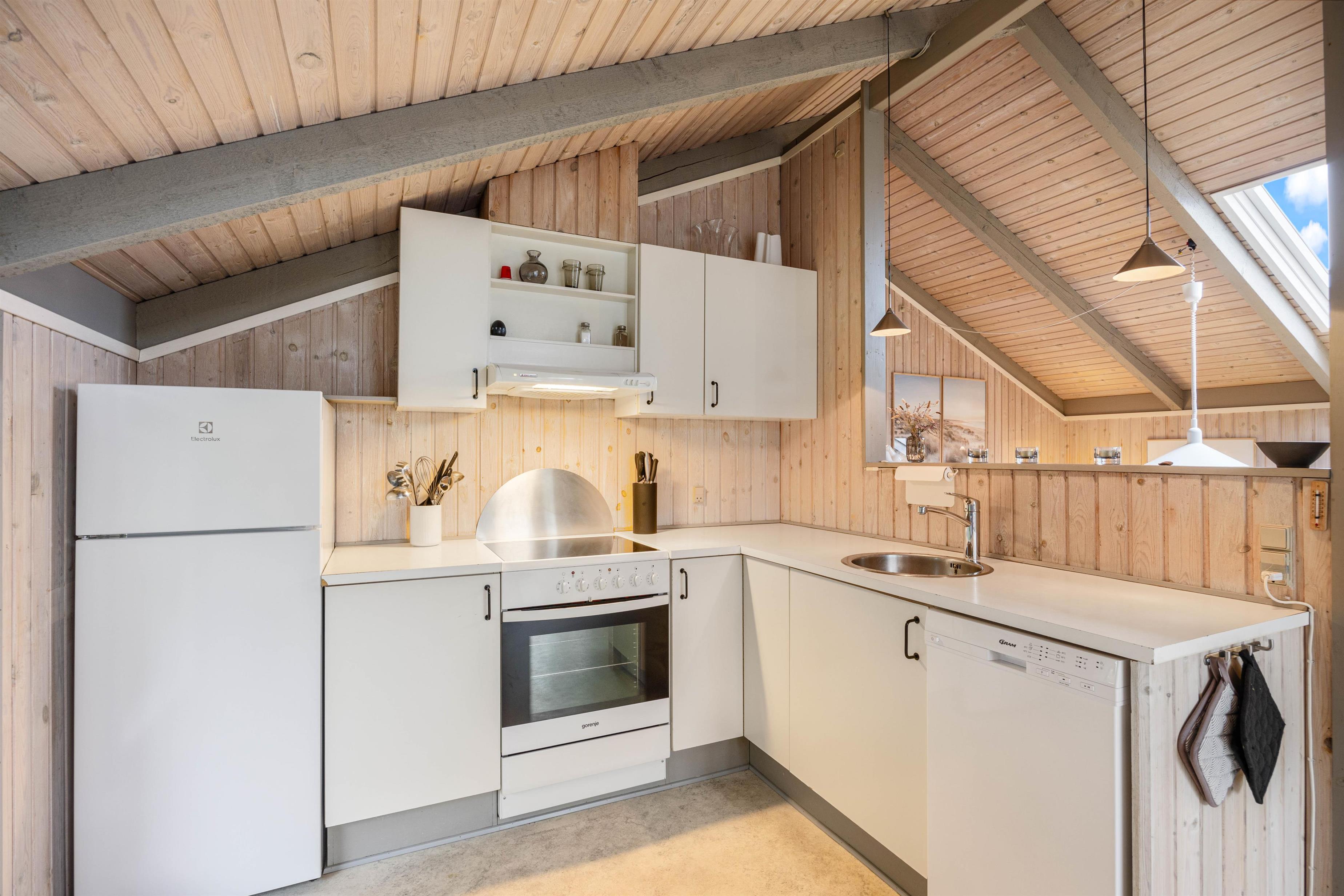 Man føler sig hjemme, straks man træder ind i den hyggelige stue med brændeovn. Køkkenet er fuldt udstyret, blandt andet med opvaskemaskine, hvilket gør hverdagen dejlig enkel. Arrangér en fælles madlavningsaften eller forkæl hinanden med lækre, hjemmelavede retter. Den omkostnings- og energibesparende varmepumpe sørger for behagelige temperaturer i feriehuset.