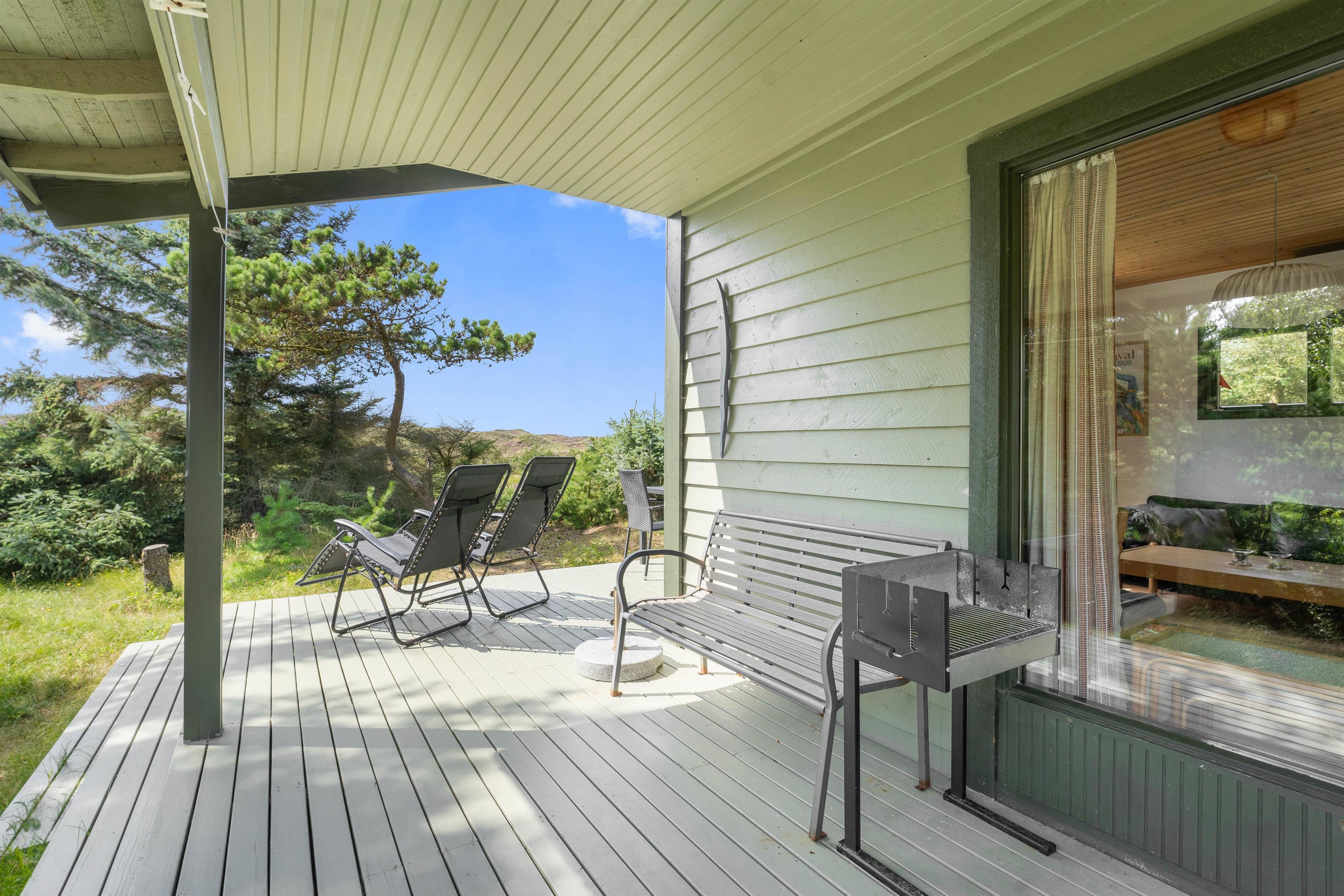 Fra stuen er der udgang til en dejlig sydvestvendt træterrasse, der er delvist overdækket. Herfra kan I fylde sanserne med den malerisk smukke natur og dyrelivet, der sikkert gerne besøger denne uforstyrrede oase. Der er mulighed for såvel sol som skygge, og de lange sommeraftner kan nydes – også efter duggens fald.