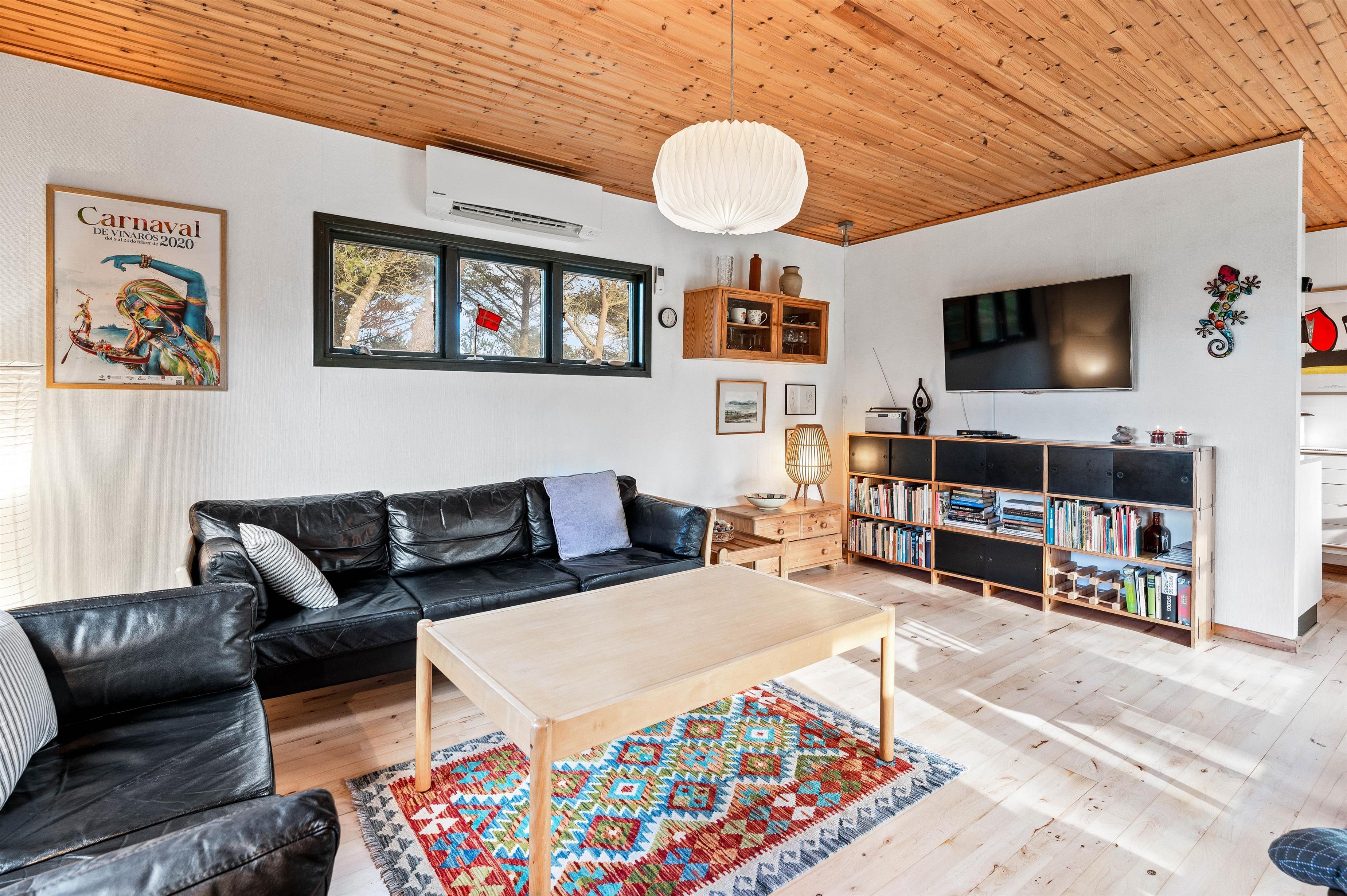 Sommerhuset er indrettet med trælofter og trægulve, der går igen i alle rum. I stuen er der fra de store panoramavinduer et flot lysindfald, og herfra er der en flot udsigt til den skønne naturgrund, der omkranser sommerhuset. I stuen finder I også den praktiske varmepumpe, der gør det nemt at holde en fin temperatur i sommerhuset.