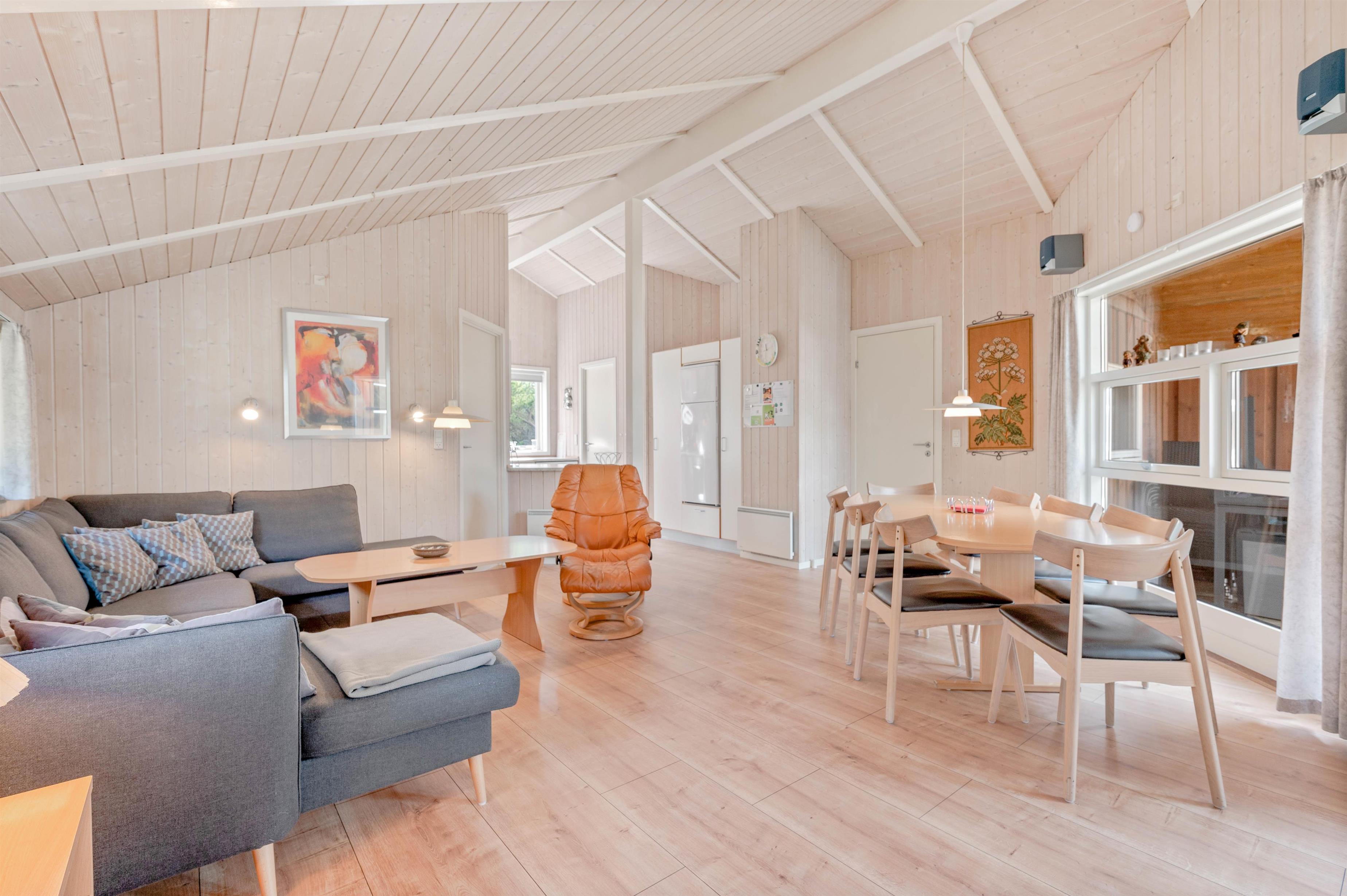 Stuen er hyggelig og lyst indrettet med varme træsorter og højt til loftet. Her kan I slå benene op og slappe af med en god bog i sofaen og på de køligere aftener, kan I samles om et spil ved spisebordet, mens brændeovnen knitrer i baggrunden. Fra stuen er der adgang til terrassen, og der er åbnet op indtil det velfungerende køkken.