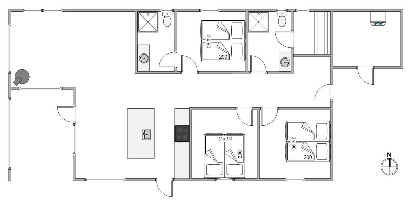 Feriehuset er udstyret med to fine badeværelser med stor bruseniche og gulvvarme. Fra det ene badeværelse har I tilmed adgang til jeres helt egen sauna – så mon ikke der skal bruges et par afslappende timer i varmen i løbet af ferien? Det andet badeværelse hører såmænd til det ene af de tre soveværelser – alle soveværelser er indrettet med komfortable dobbeltsenge og med god skabsplads.