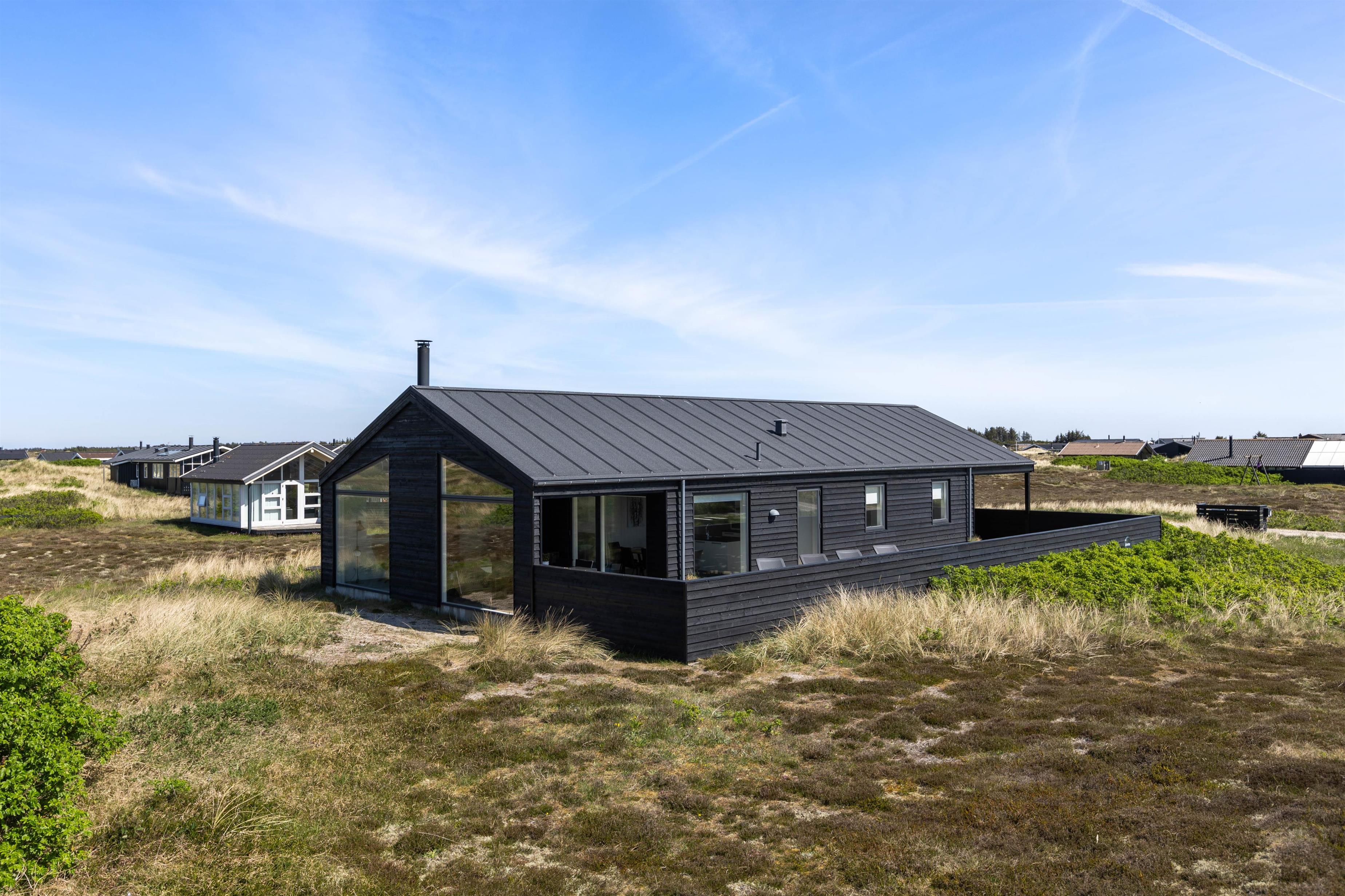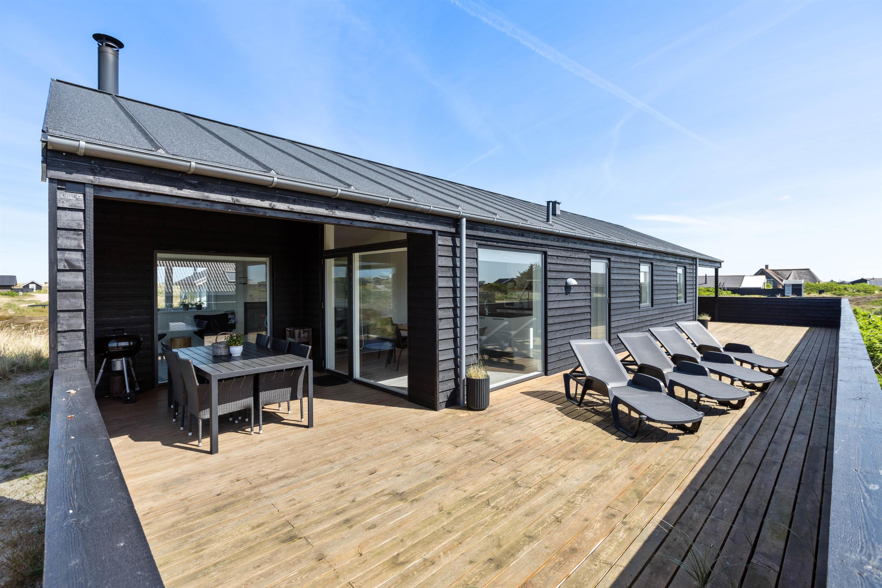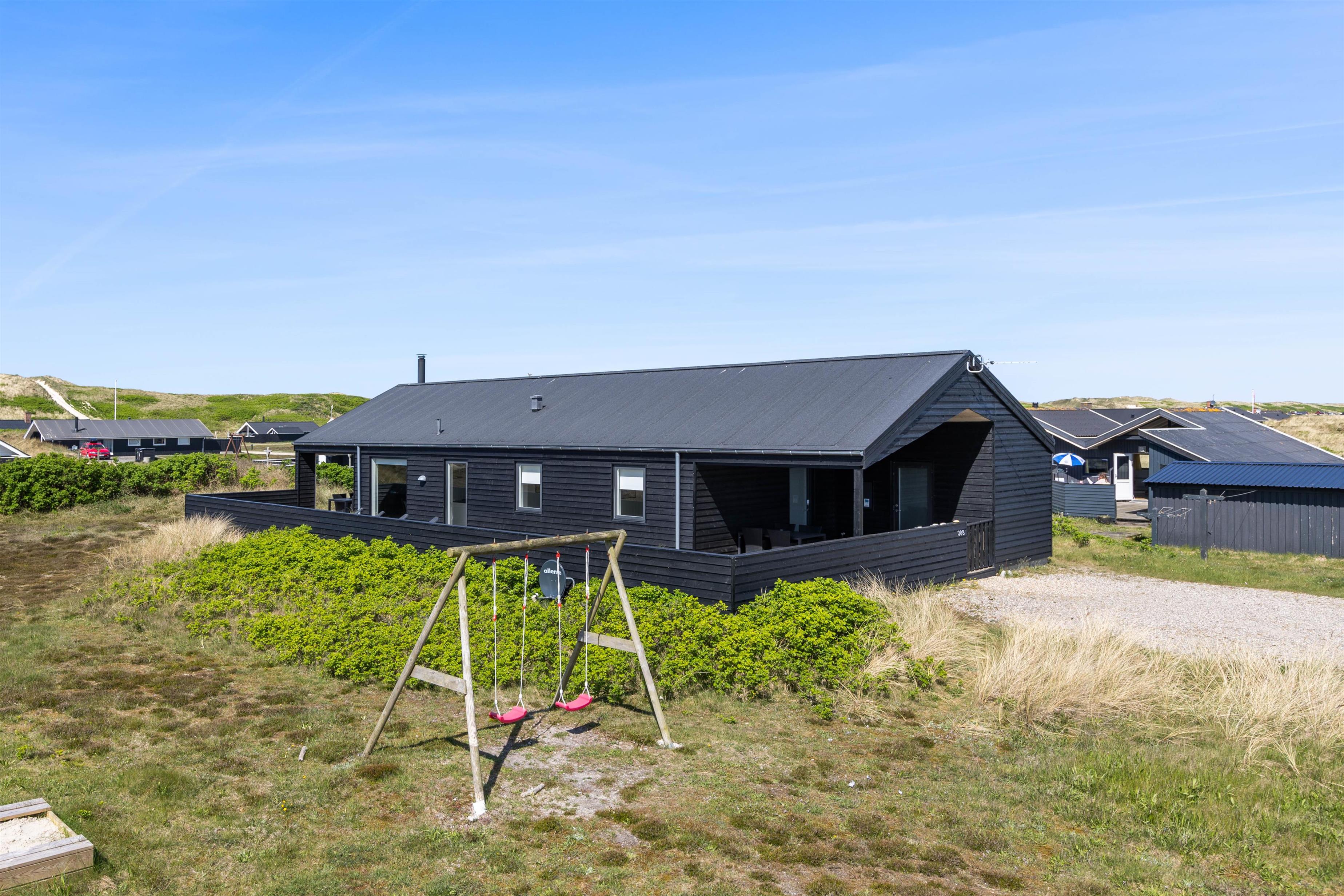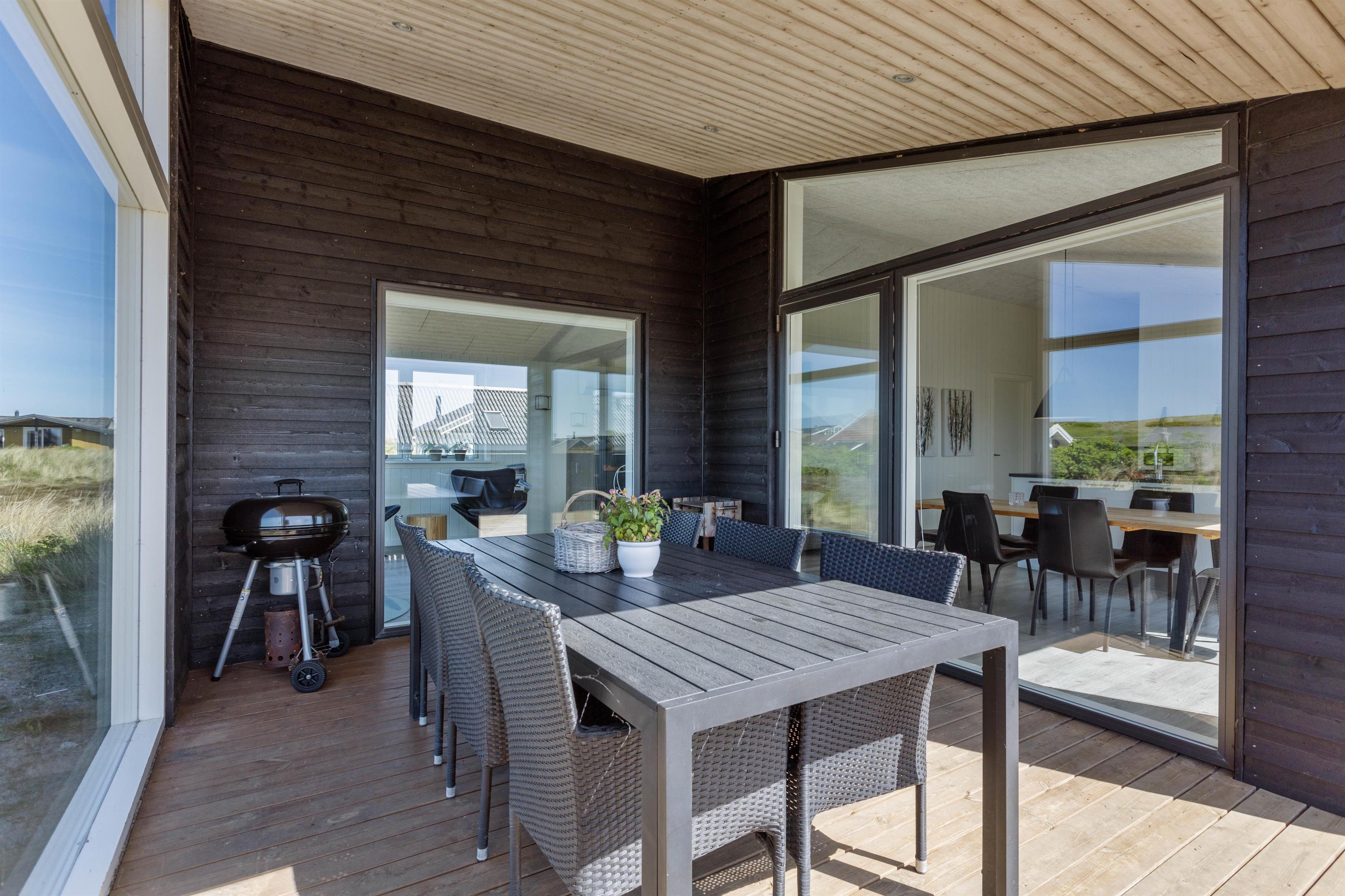 Den store terrasse har mange kvaliteter og er både lukket, delvist overdækket og delvist afskærmet med glasparti mod vest. Her kan I altid sidde i både læ og ly og nyde den friske luft og den flotte udsigt ud over klitlandskabet. Helt perfekt kan I lade småbørn og hunde bevæge sig frit rundt på terrassen. Til familiens mindste er der desuden også opsat et gyngestativ.
