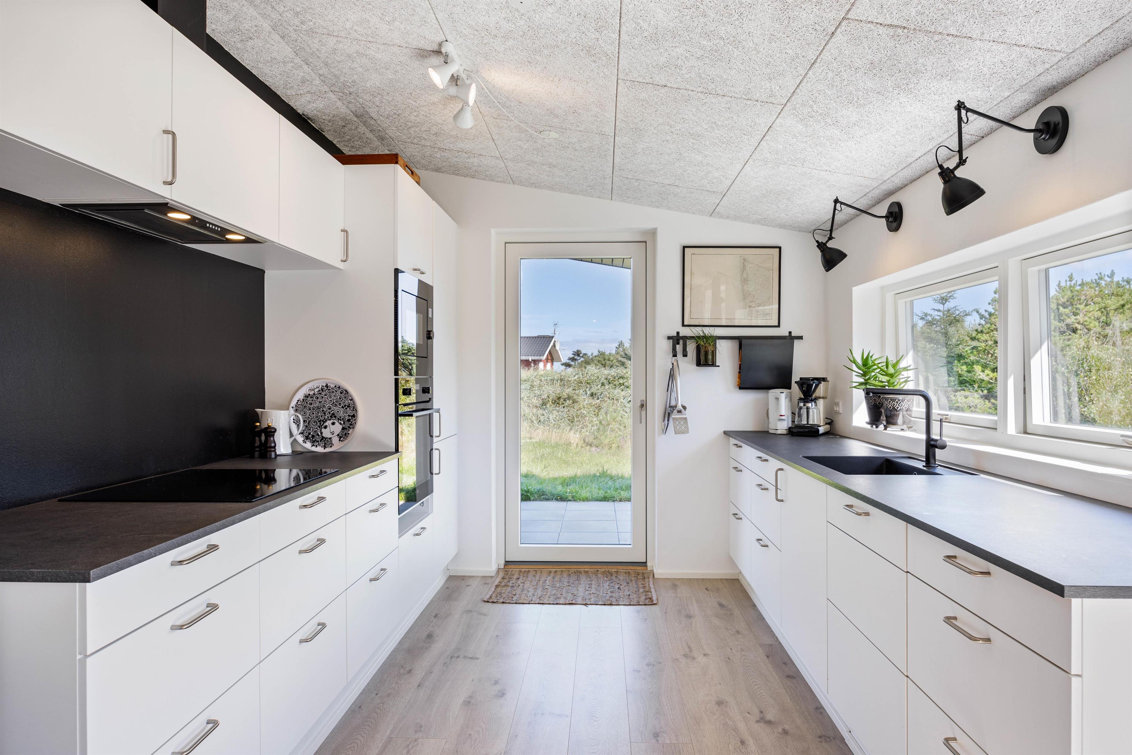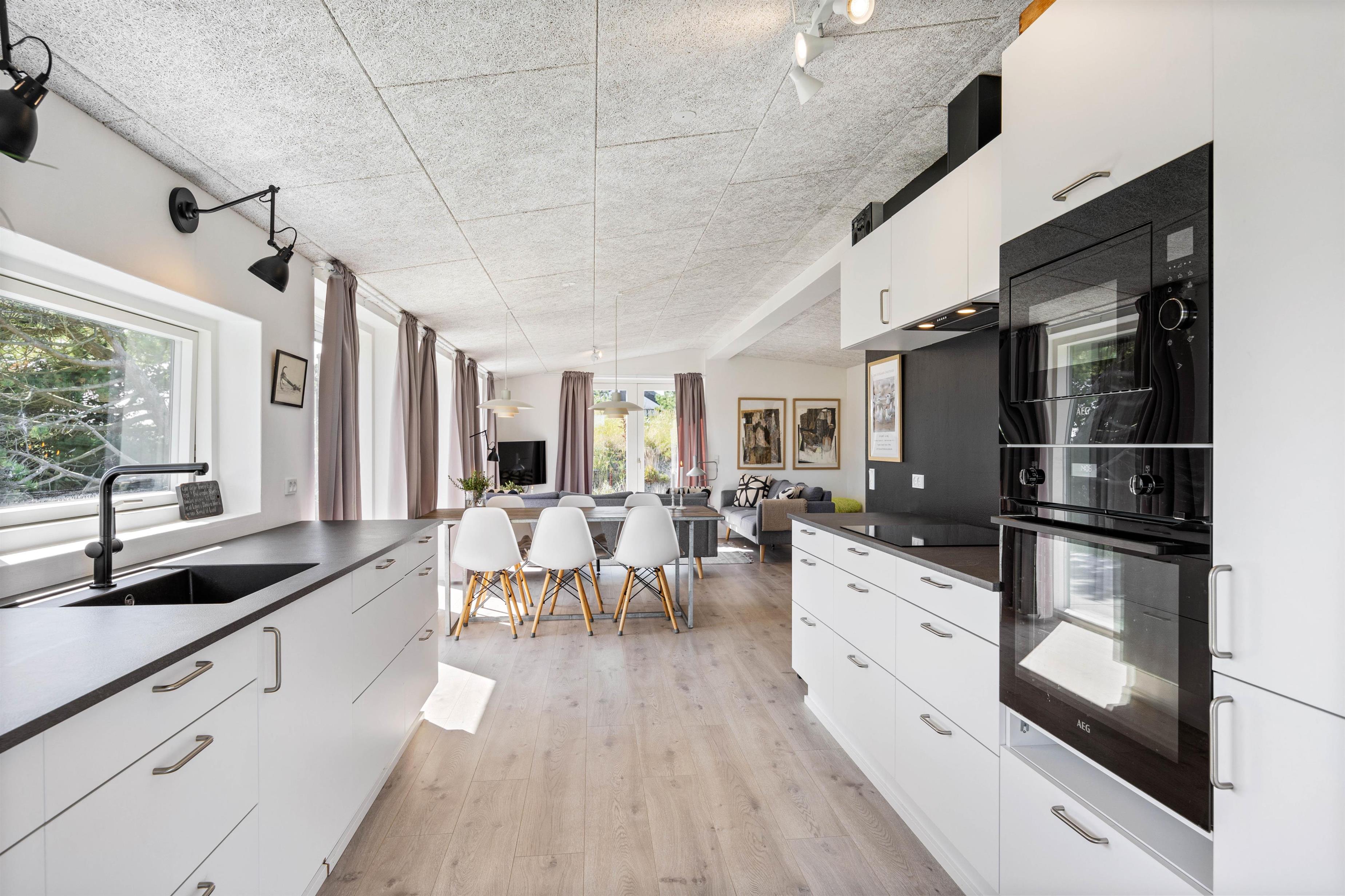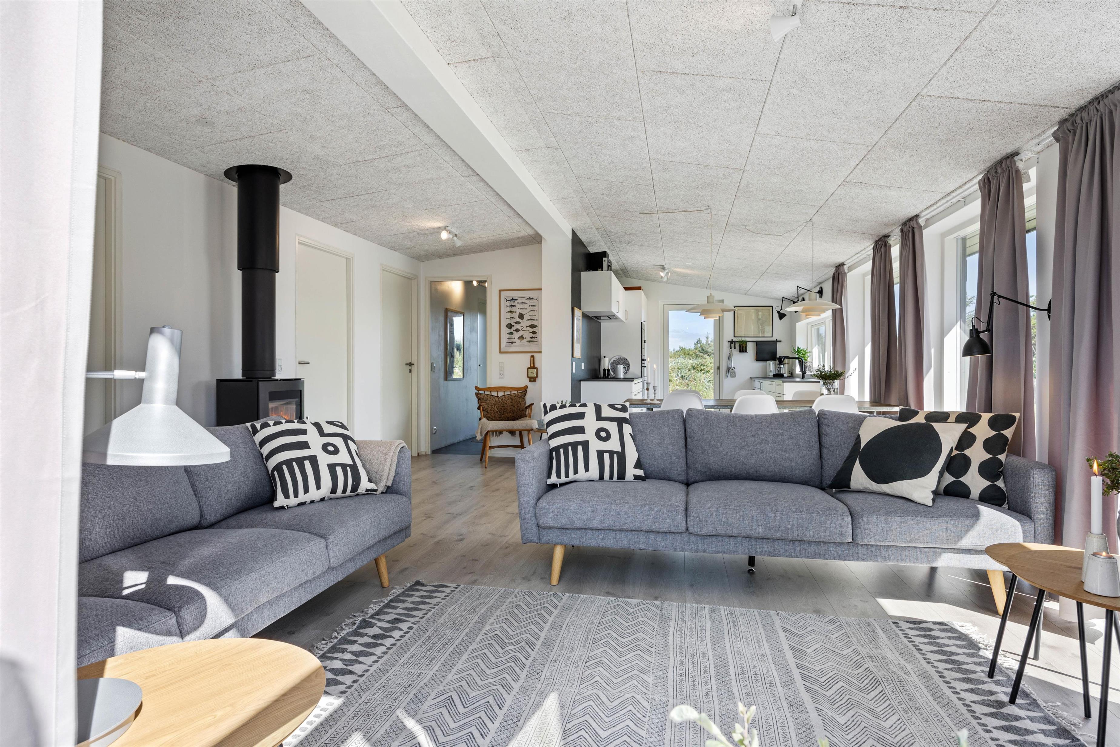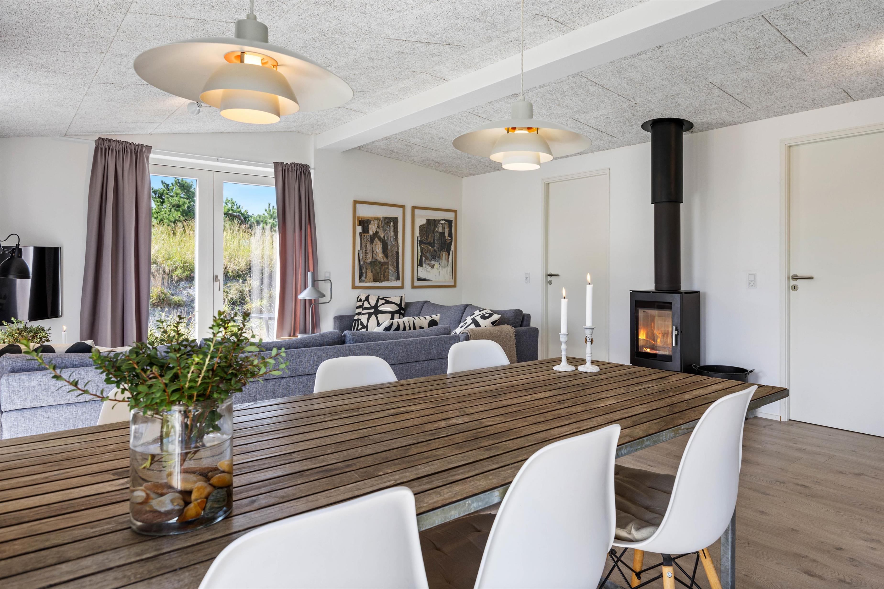 Ilden i brændeovnen skaber en afslappende atmosfære, men I kan også bruge den energibesparende varmepumpe til opvarmning. Det praktiske, åbne køkken er udstyret med alt, hvad du behøver for at tilberede lækre måltider.
