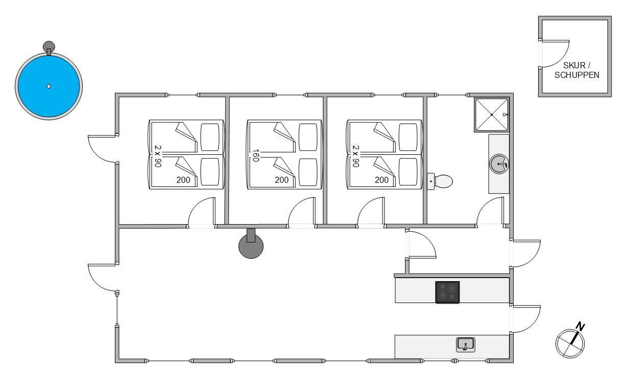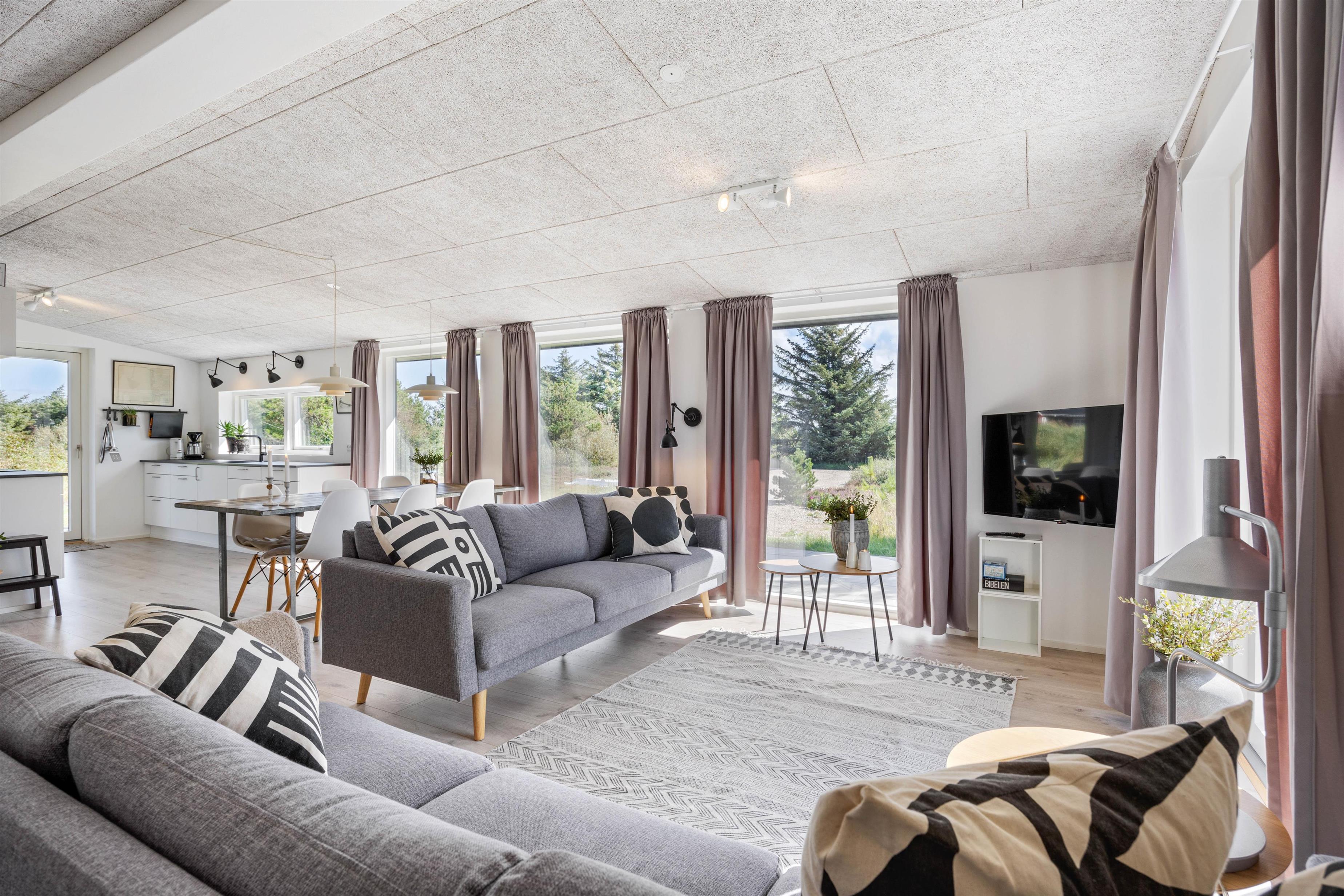 Stue, spiseplads og køkken er samlet i ét rum, så I kan tilbringe meget tid sammen, selv om I laver forskellige ting. Mens nogle af jer sætter jer til rette i den hyggelige sofa og ser tv, kan andre spille et brætspil ved spisebordet eller læse en bog foran brændeovnen.