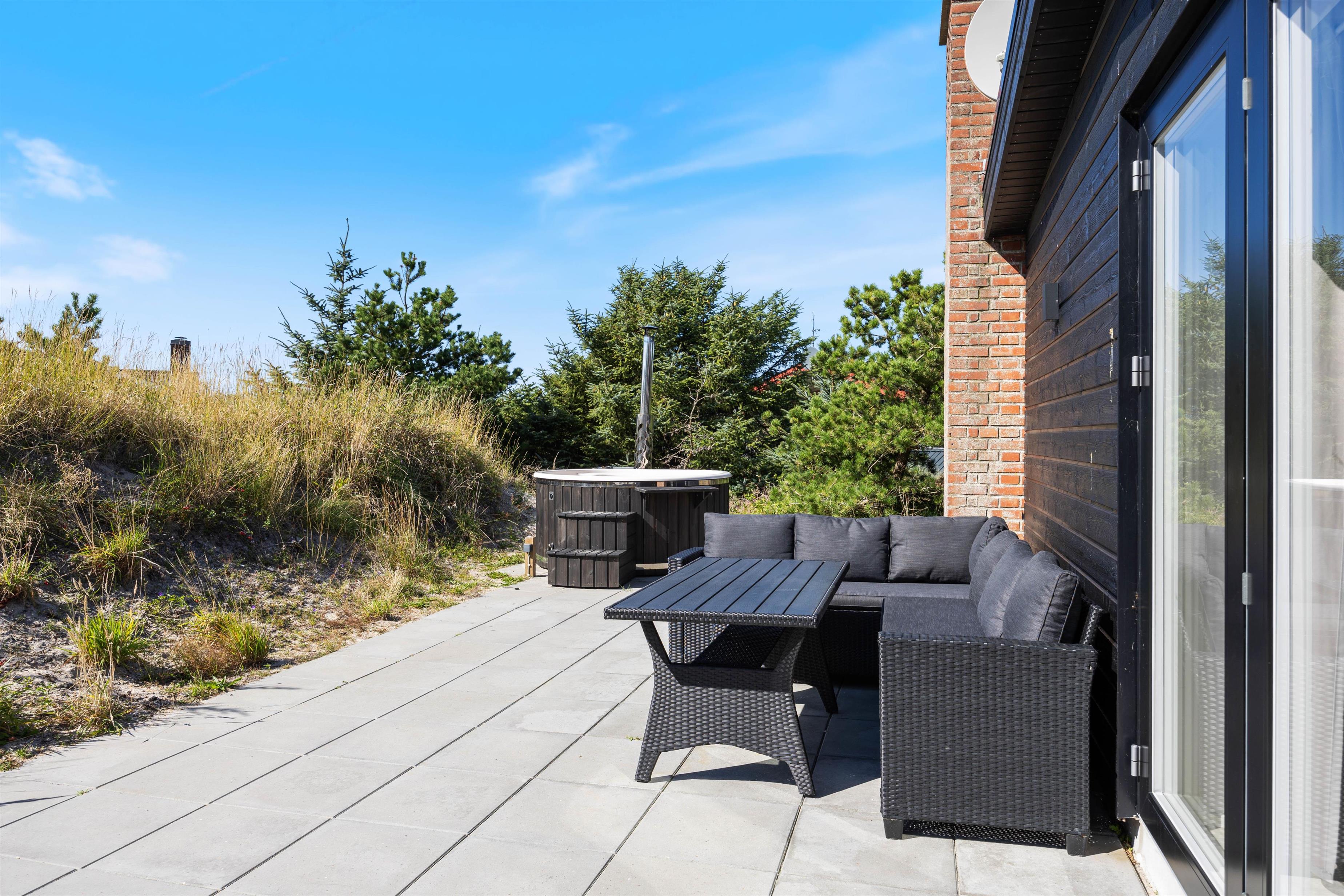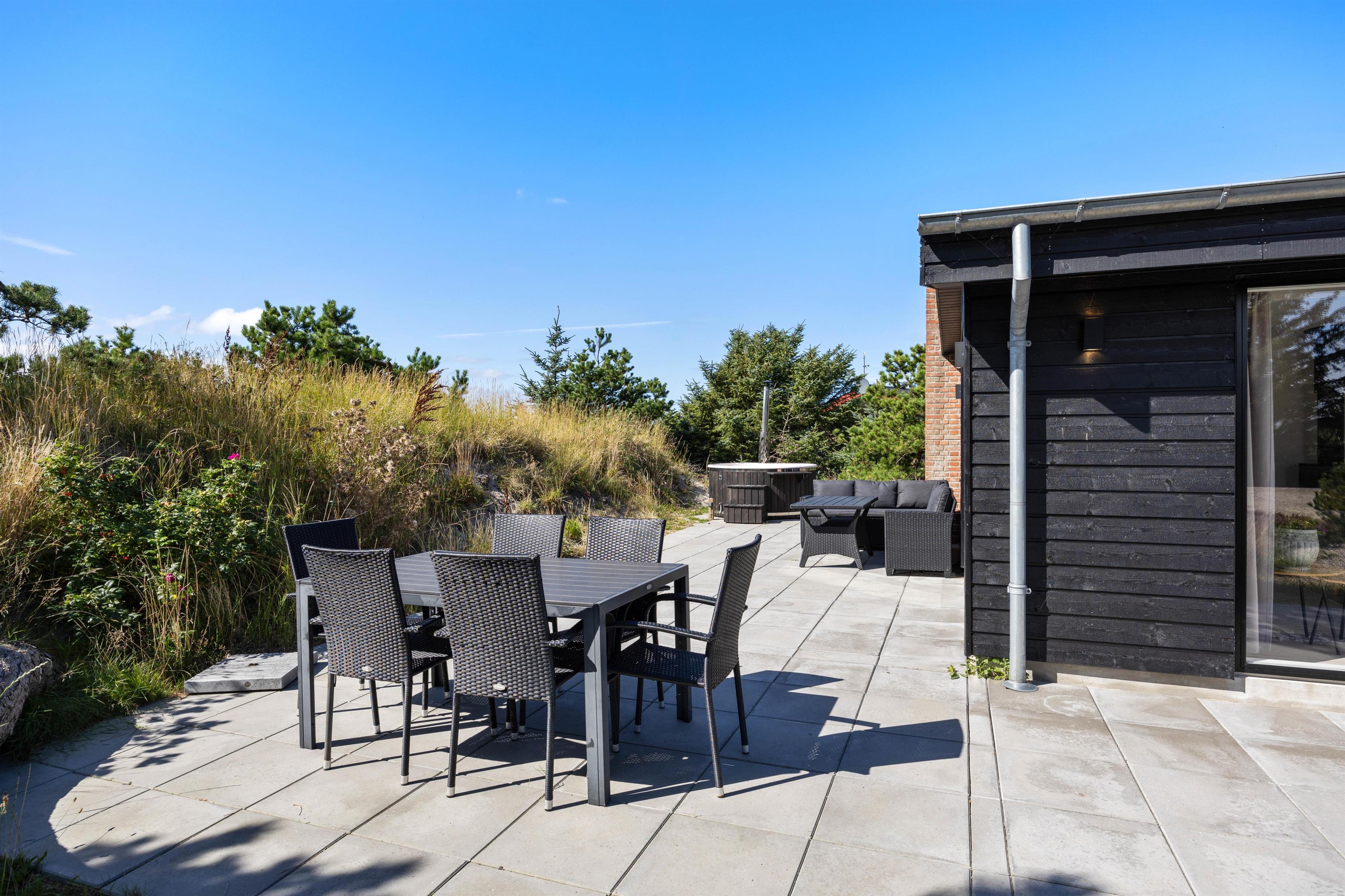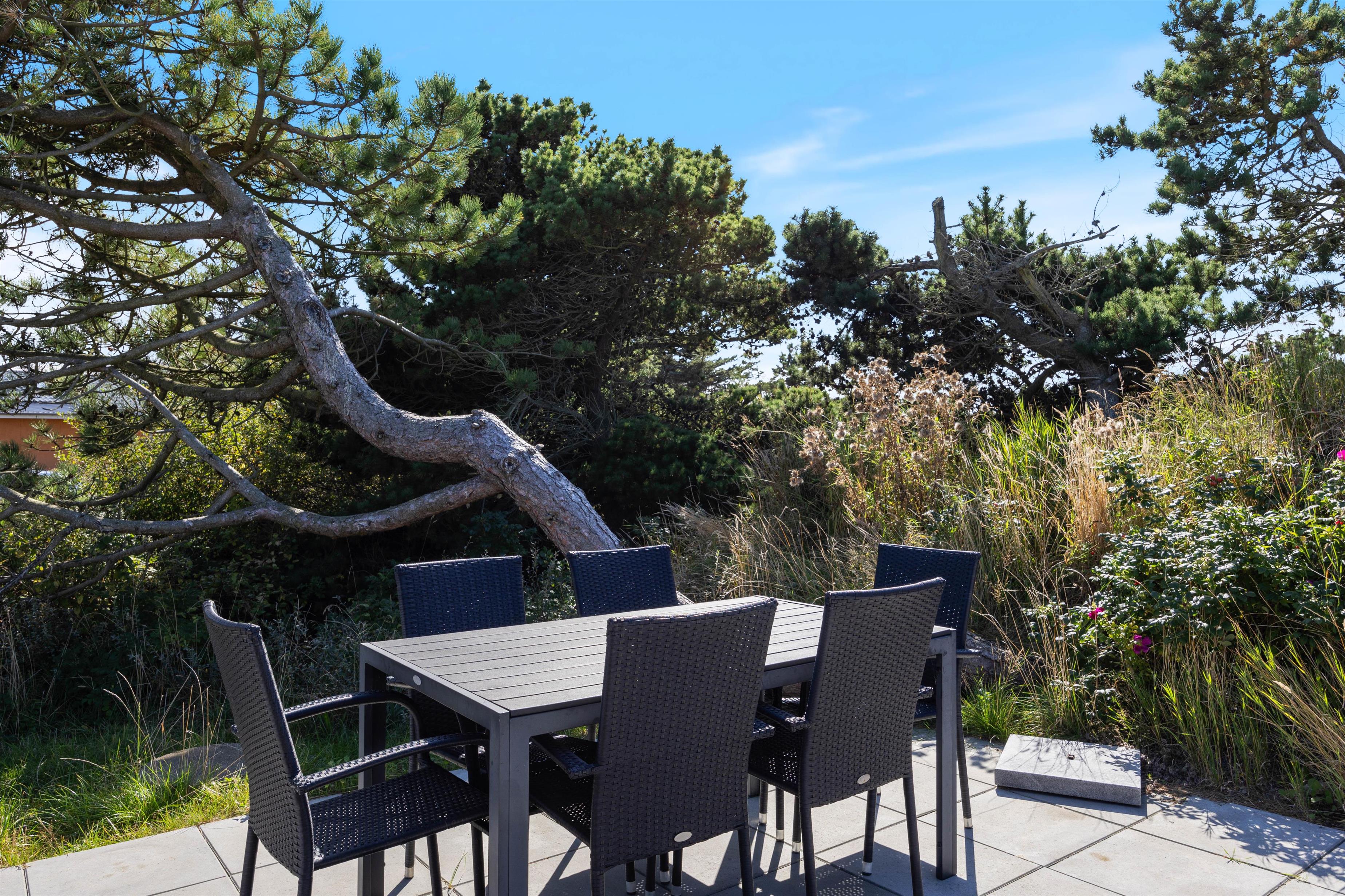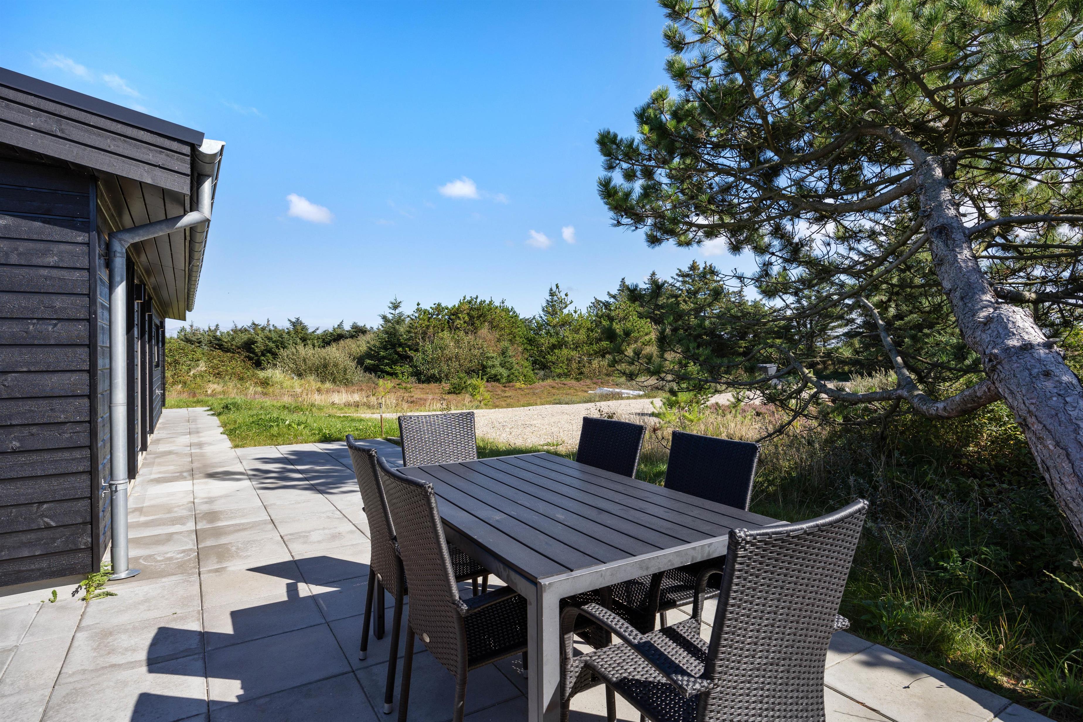 Feriehuset ligger på en knap 1.300 kvadratmeter stor naturgrund, som er delvist omgivet af buske og træer. Terrassen går langs 3 sider af feriehuset og er delvist overdækket, så du altid kan finde en hyggelig og rolig plet i den friske havluft, afhængigt af solens position og vindens retning.