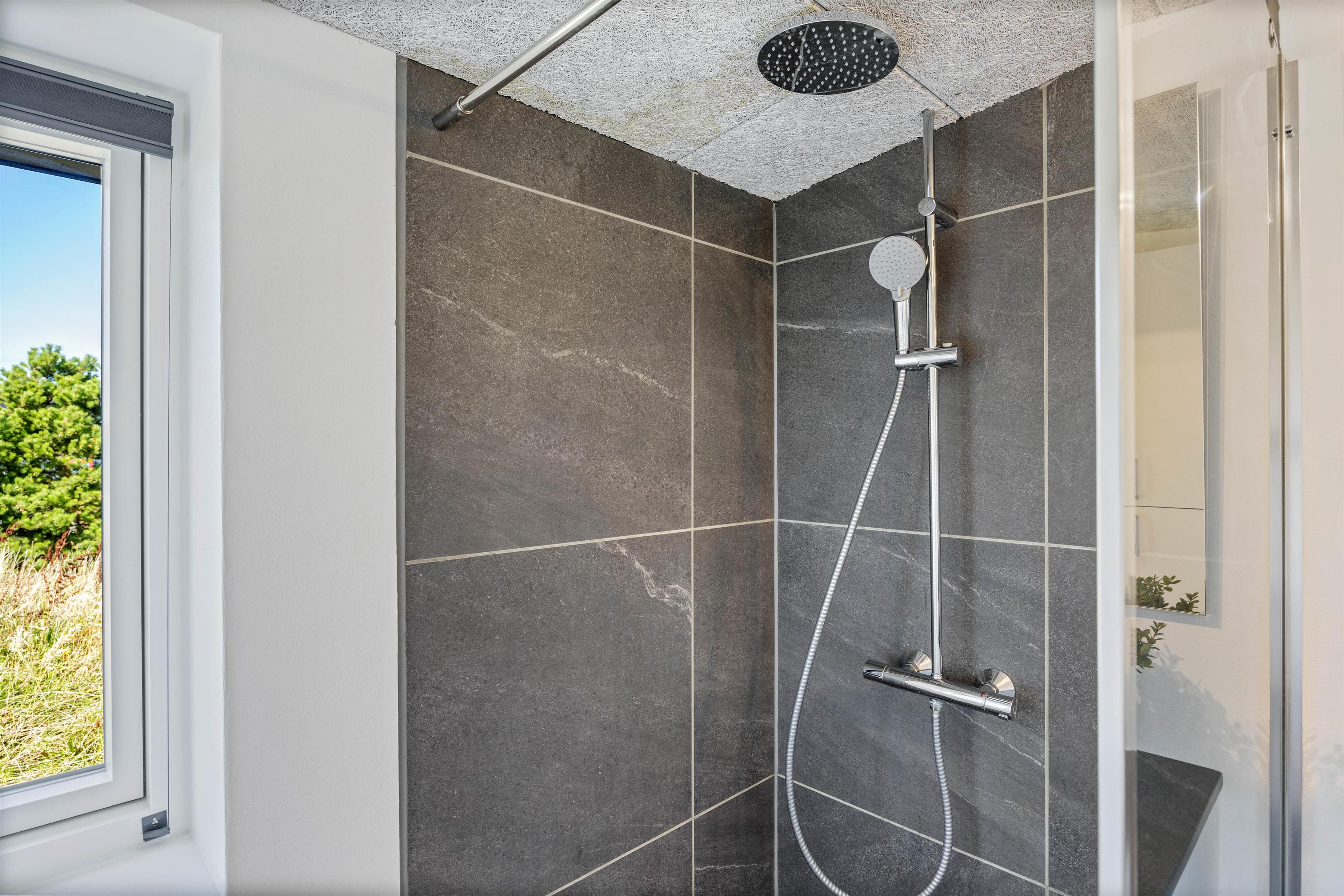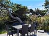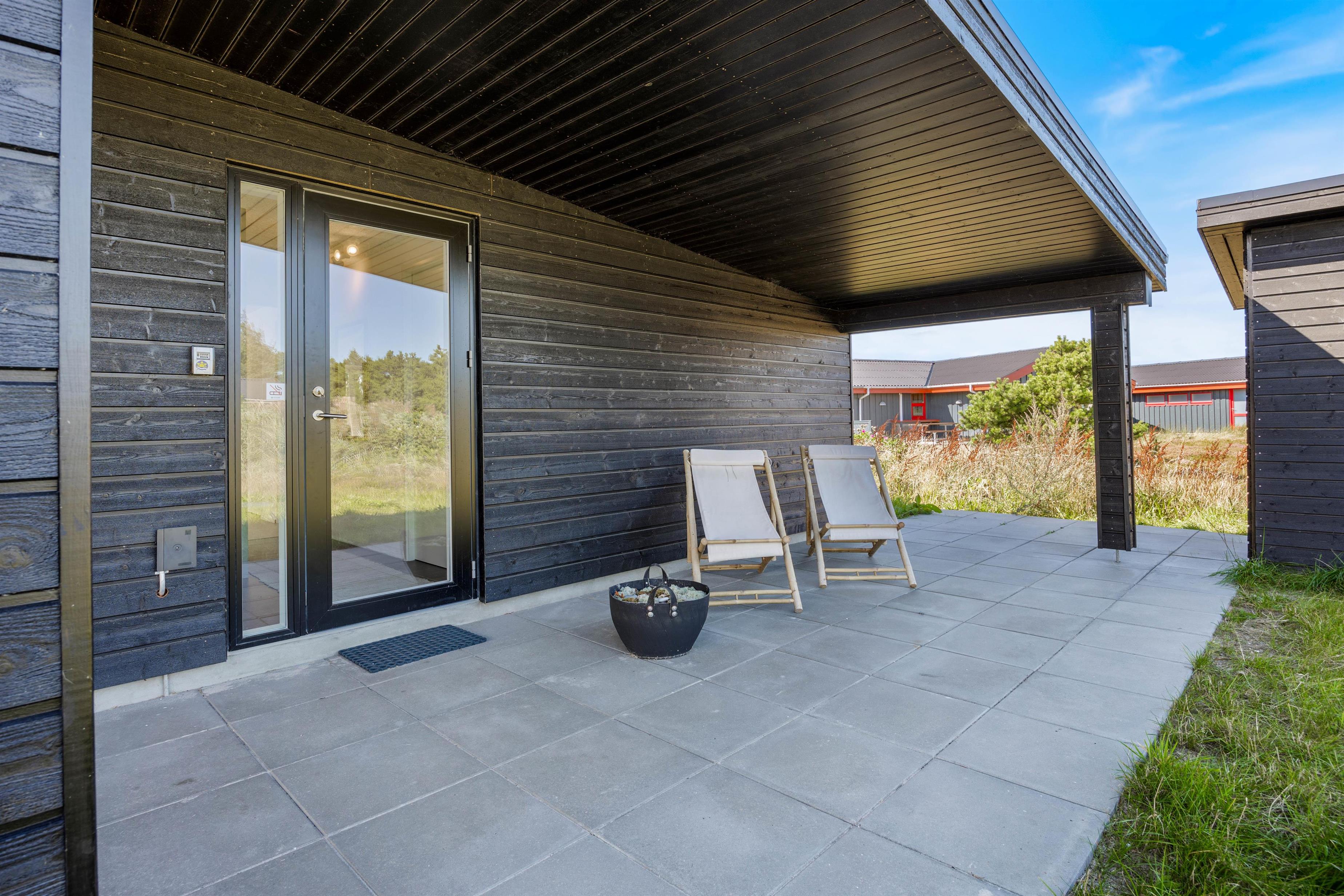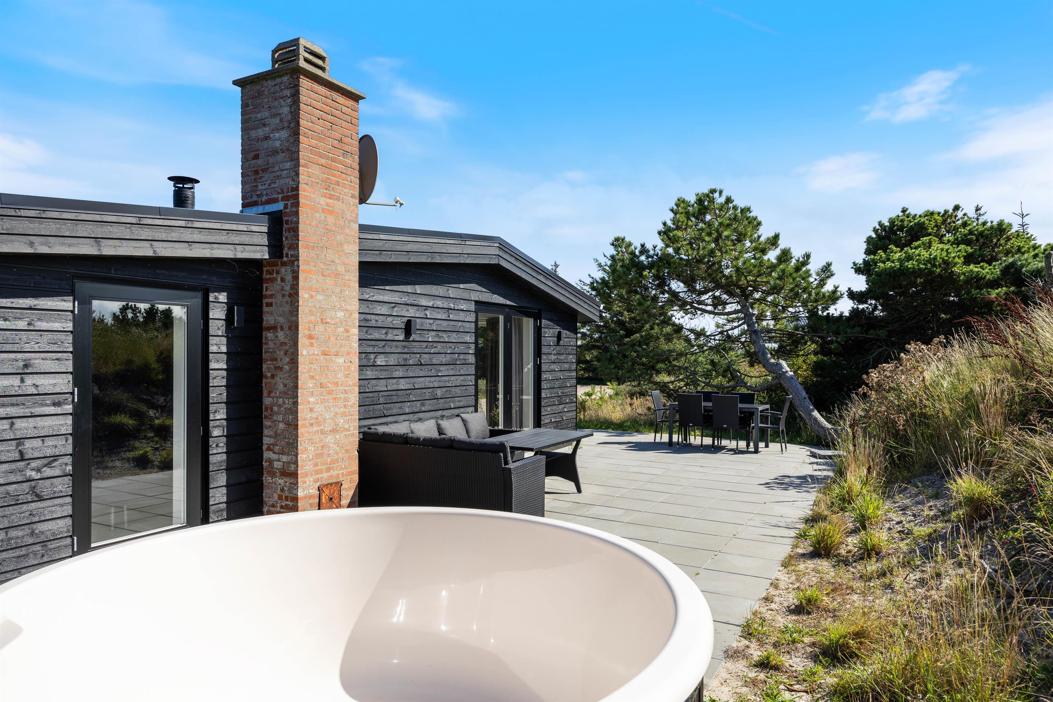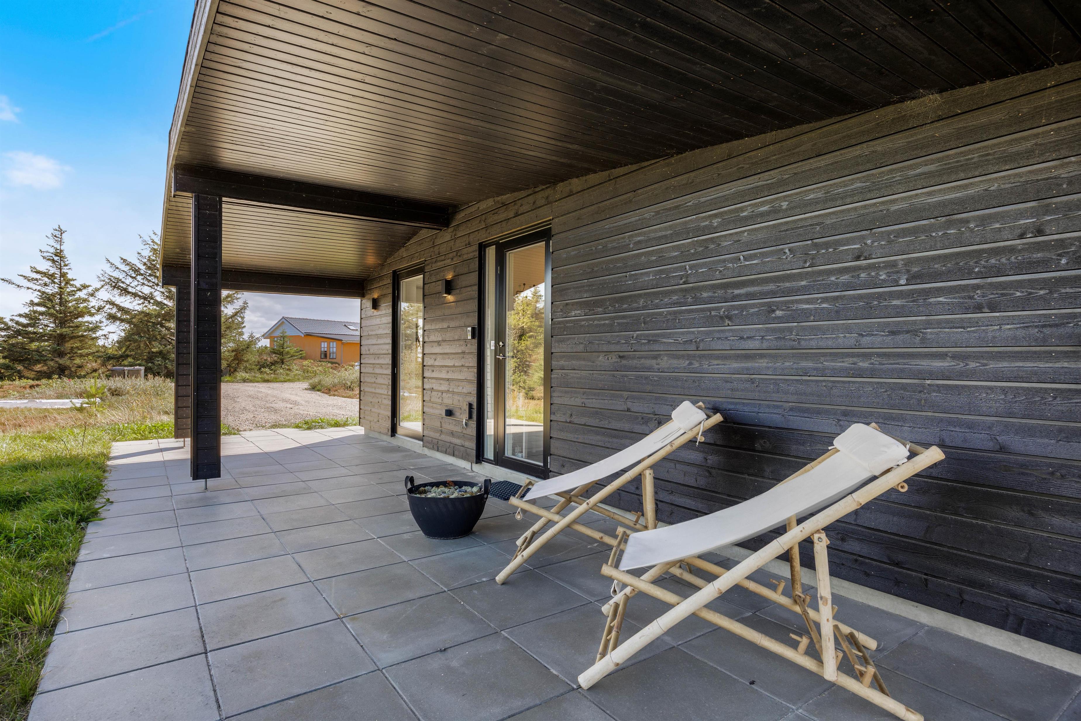 Feriehuset ligger på en knap 1.300 kvadratmeter stor naturgrund, som er delvist omgivet af buske og træer. Terrassen går langs 3 sider af feriehuset og er delvist overdækket, så du altid kan finde en hyggelig og rolig plet i den friske havluft, afhængigt af solens position og vindens retning.