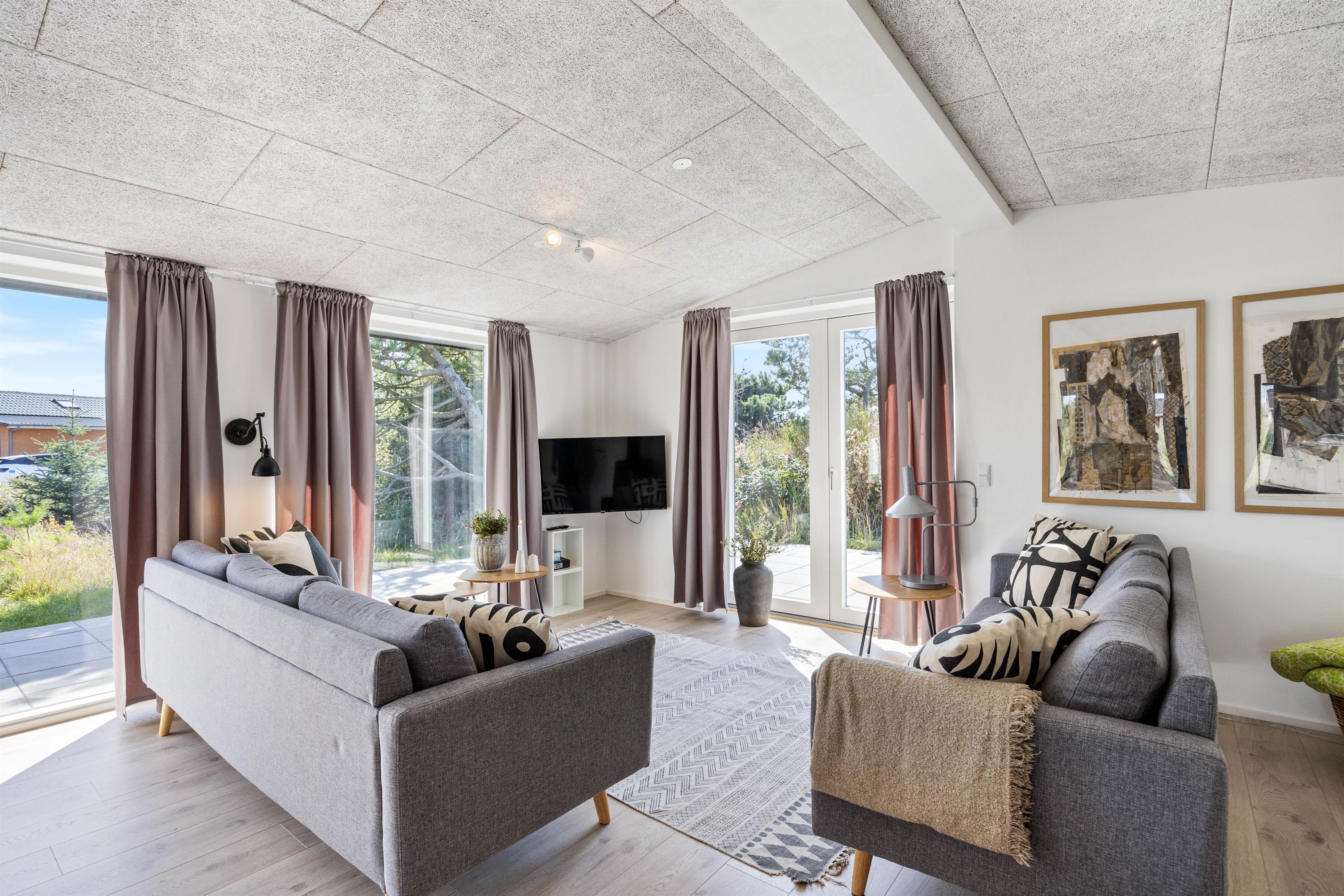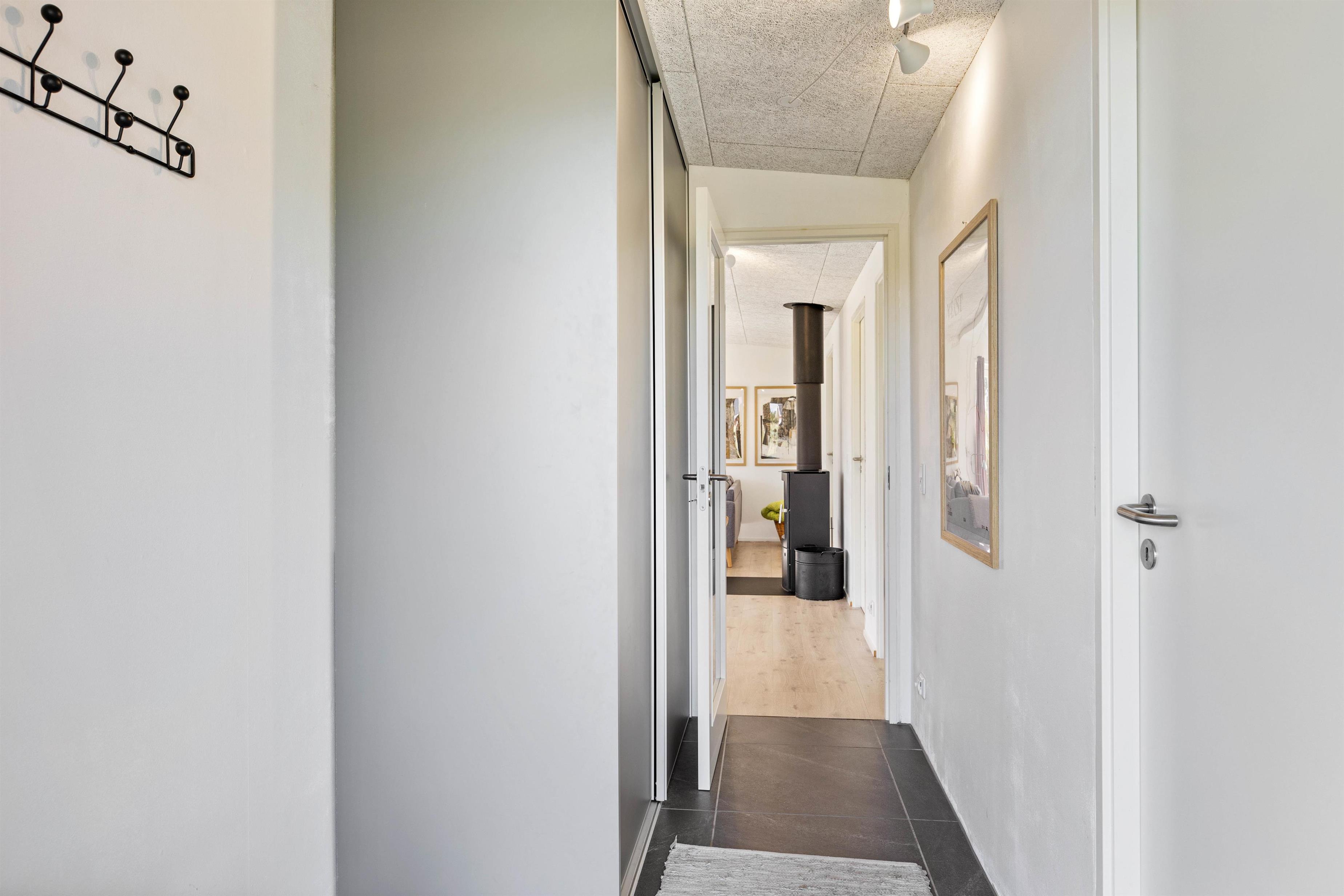 I det smukke, lyse feriehus på P Chr Dahls Vej 8 føler man sig hjemme, så snart man træder ind. En lille entre fungerer som praktisk opbevaringsplads til jakker og sko. Herfra er der adgang til det moderne badeværelse med bruser, gulvvarme og vaskemaskine samt hjertet i det moderne feriehus - den hyggelige og lyse stue.