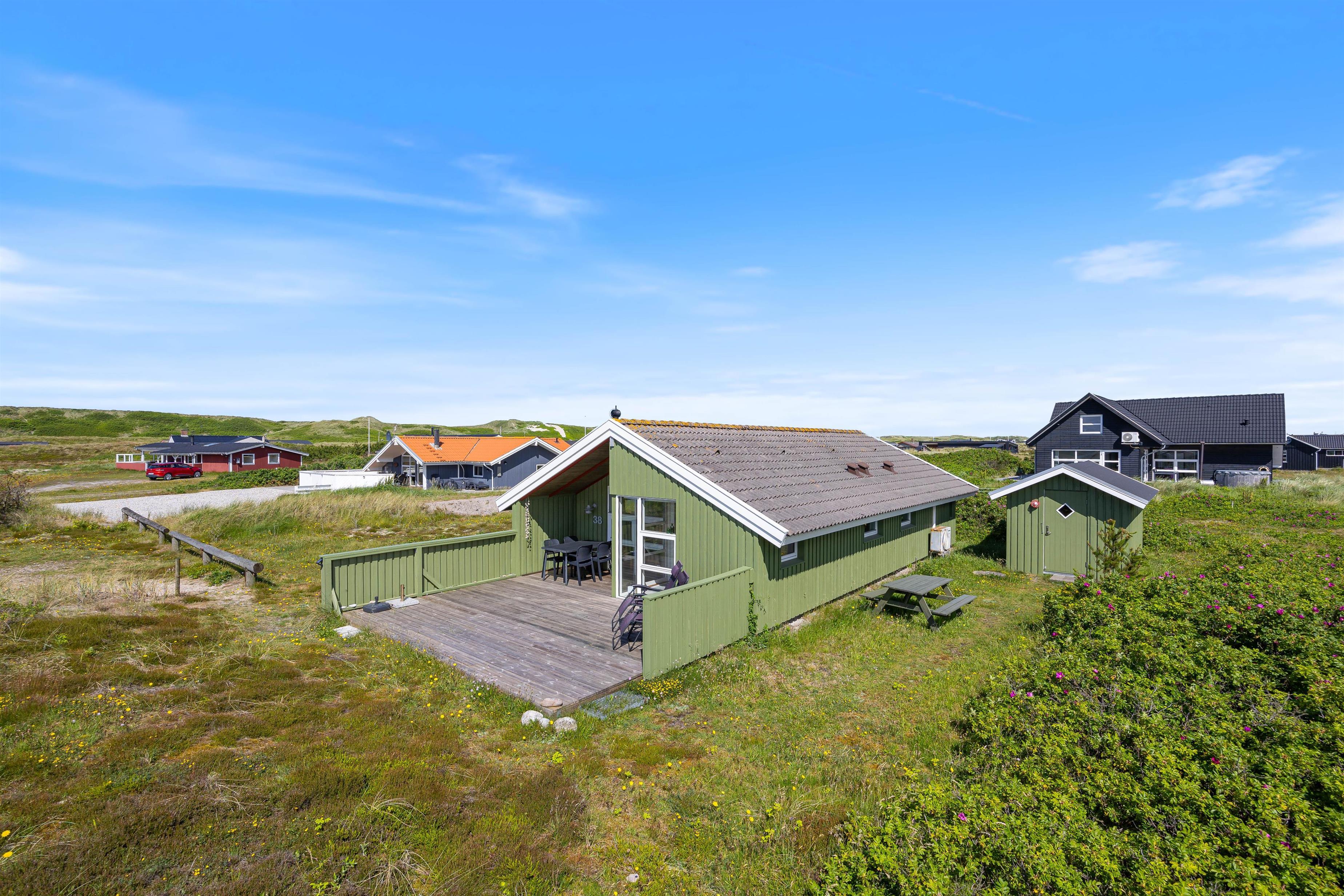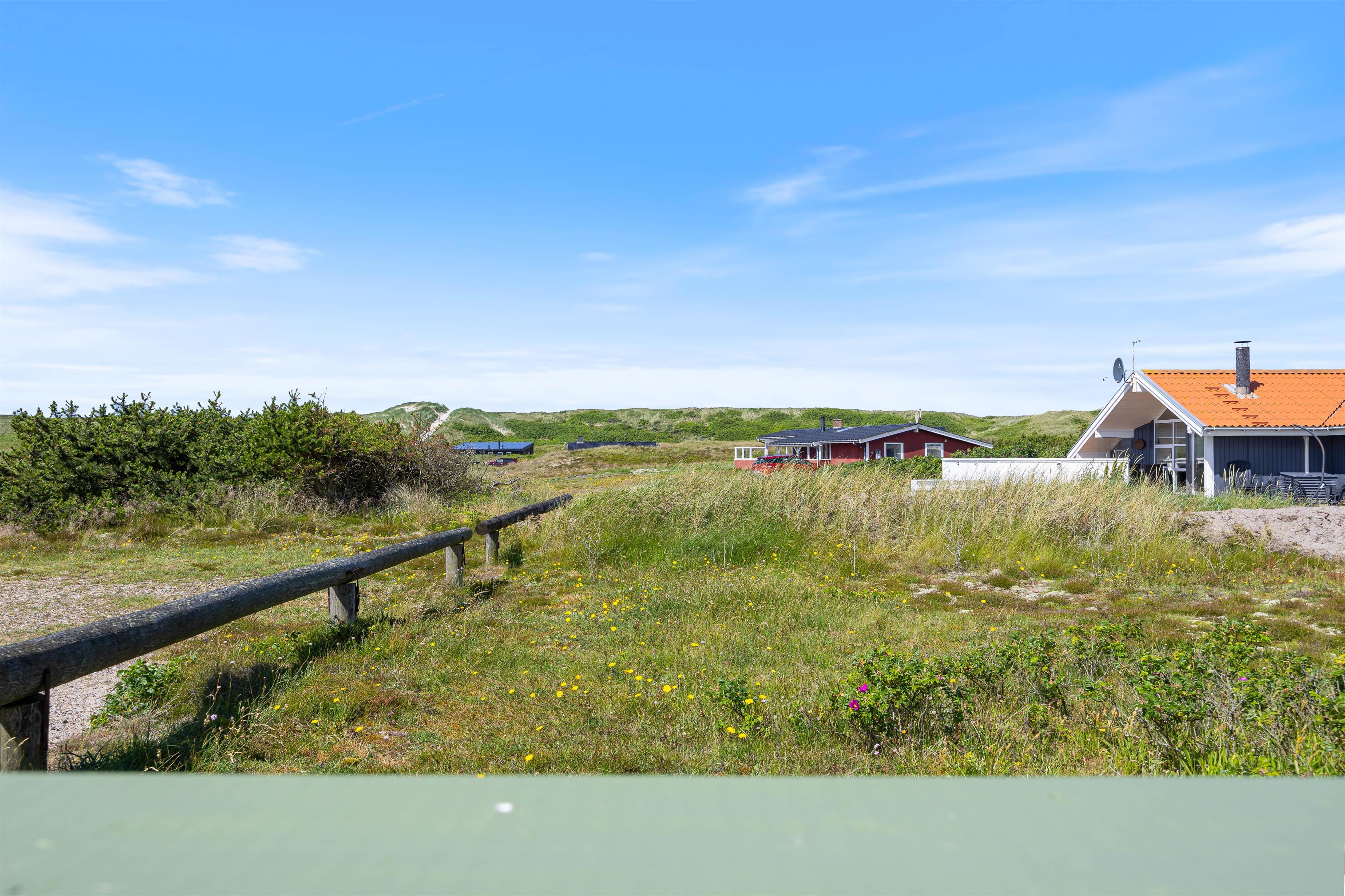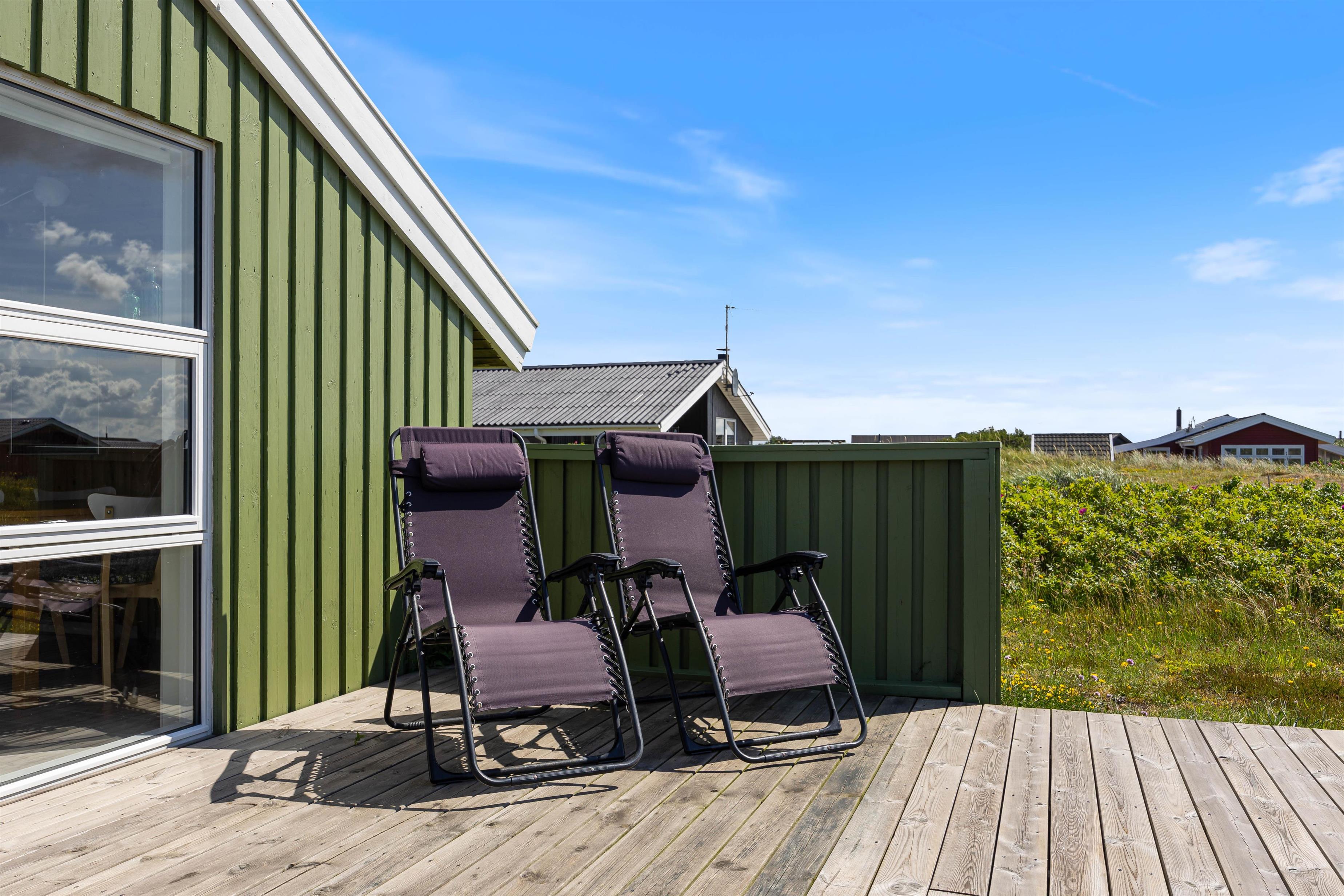 Feriehuset er beliggende på en 1265 m2 stor klitgrund, og her er det muligt at parkere 2 biler. Fra stuen er der adgang til sommerhusets terrasse. Her står havemøbler, liggestole og grillen klar, så I rigtig kan nyde de varme sommerdage. Rund sammen dagen af med en lækker grillmiddag og planlæg morgendagens aktiviteter. I redskabsrummet finder I et ekstra køleskab, som I kan benytte jer af.