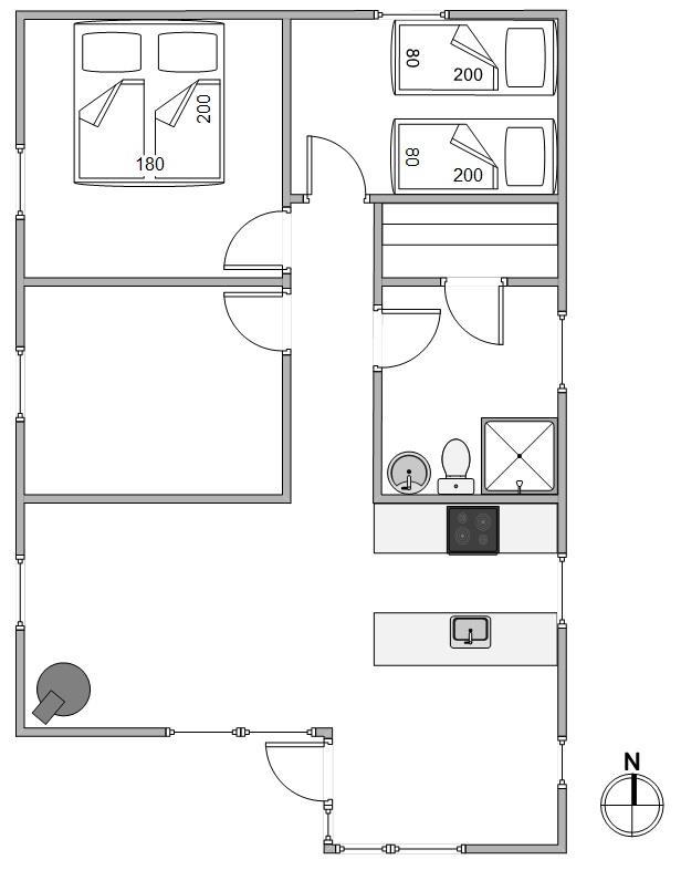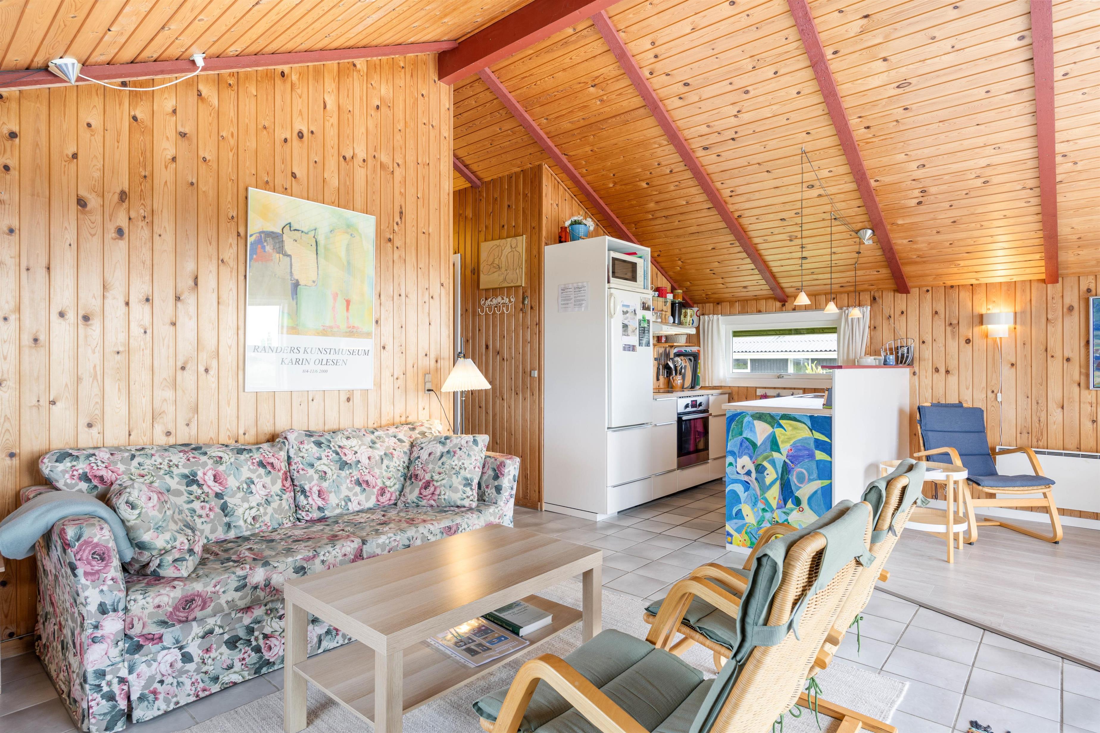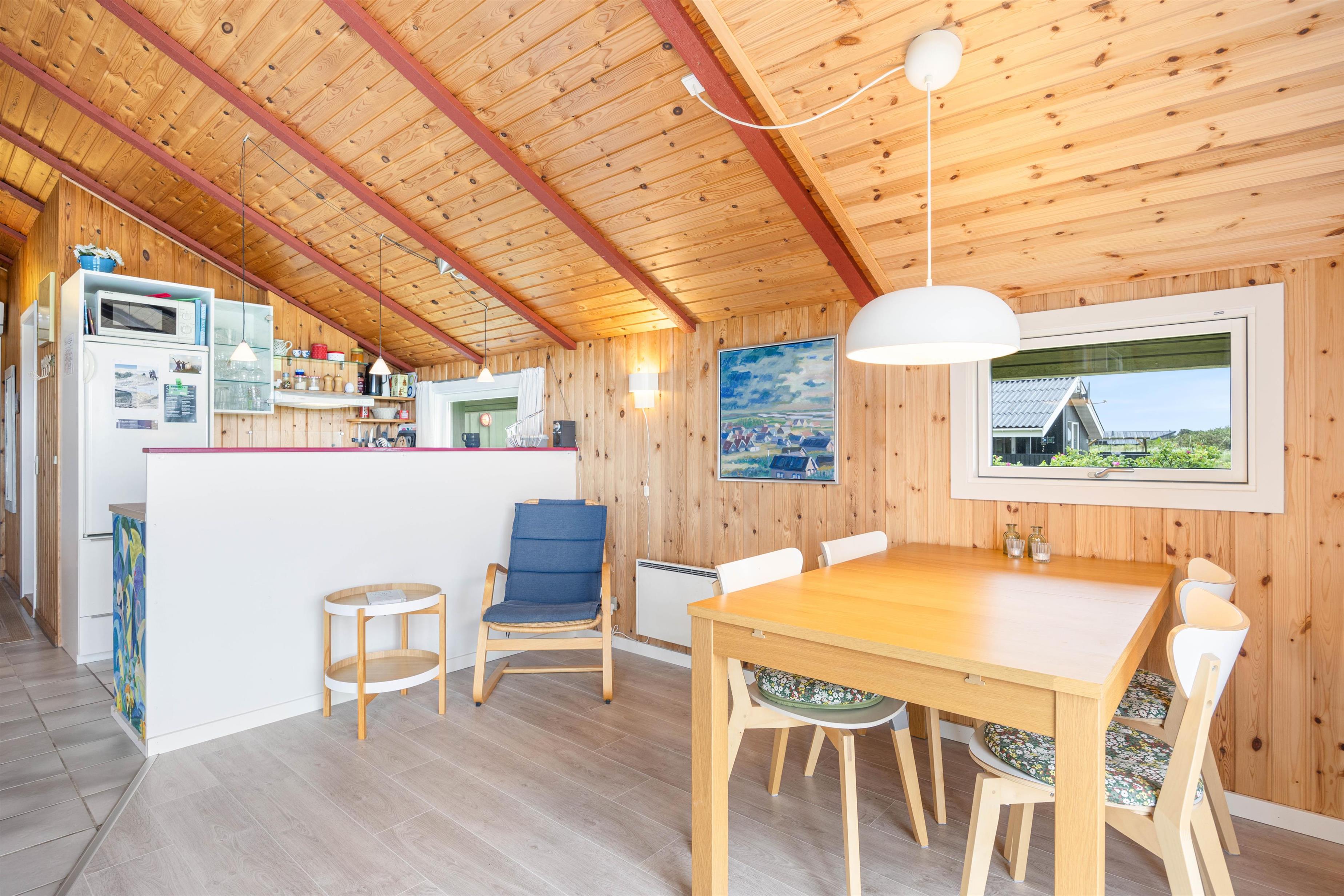 Feriehuset på 70 m2 har plads til 4 gæster og indbyder til hygge med de nærmeste. Hjerterummet er stuen, med bl.a. spiseplads, som ligger i åben forbindelse med det funktionelle køkken. Her er plads til hygge og god mad. Indretningen er rolig og holdt i naturlige materialer, og dagslyset brager gennem de store vinduer. Brændeovnen sørger for god stemning, og den energibesparende varmepumpe sørger for et behageligt indeklima.