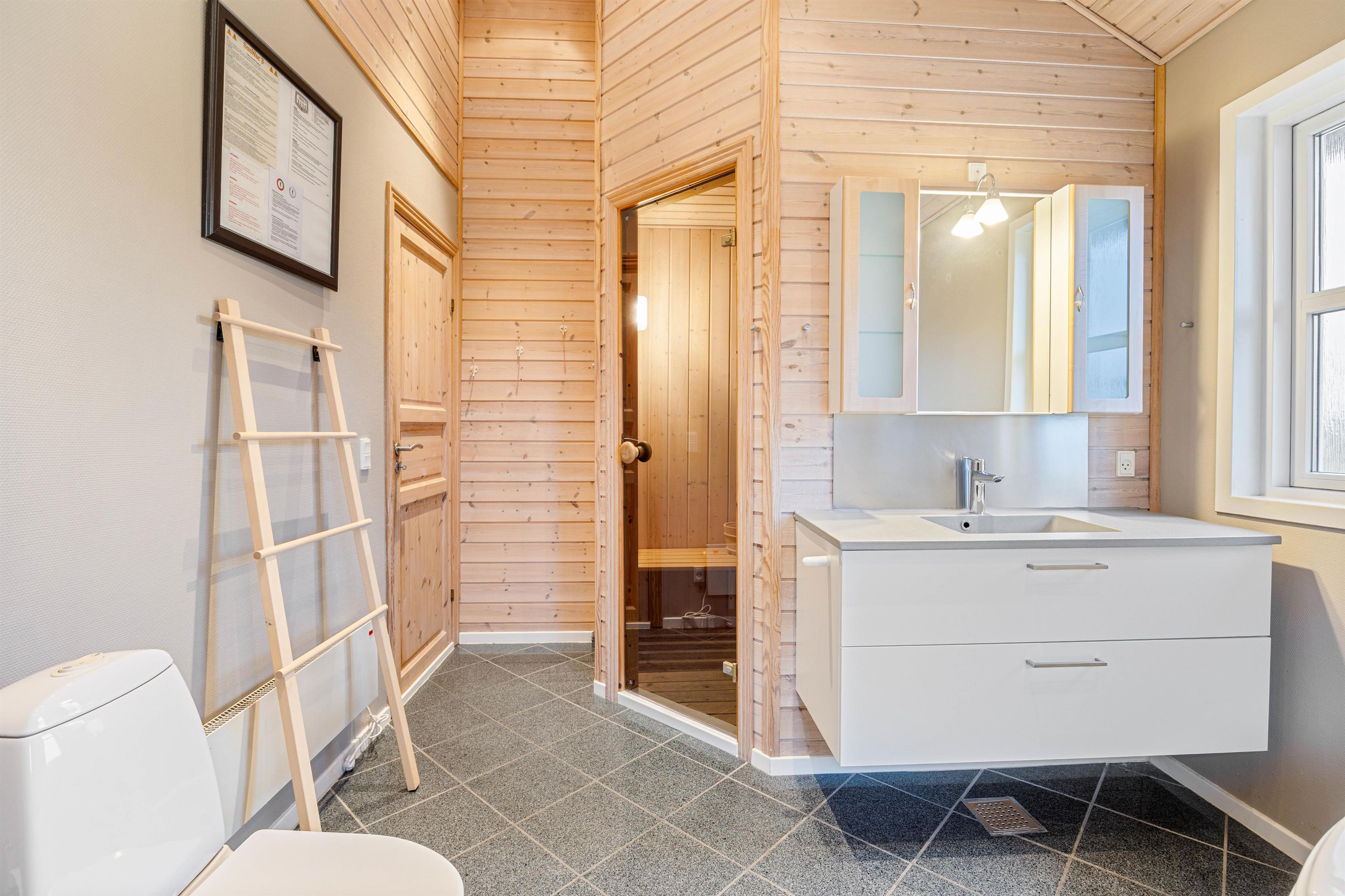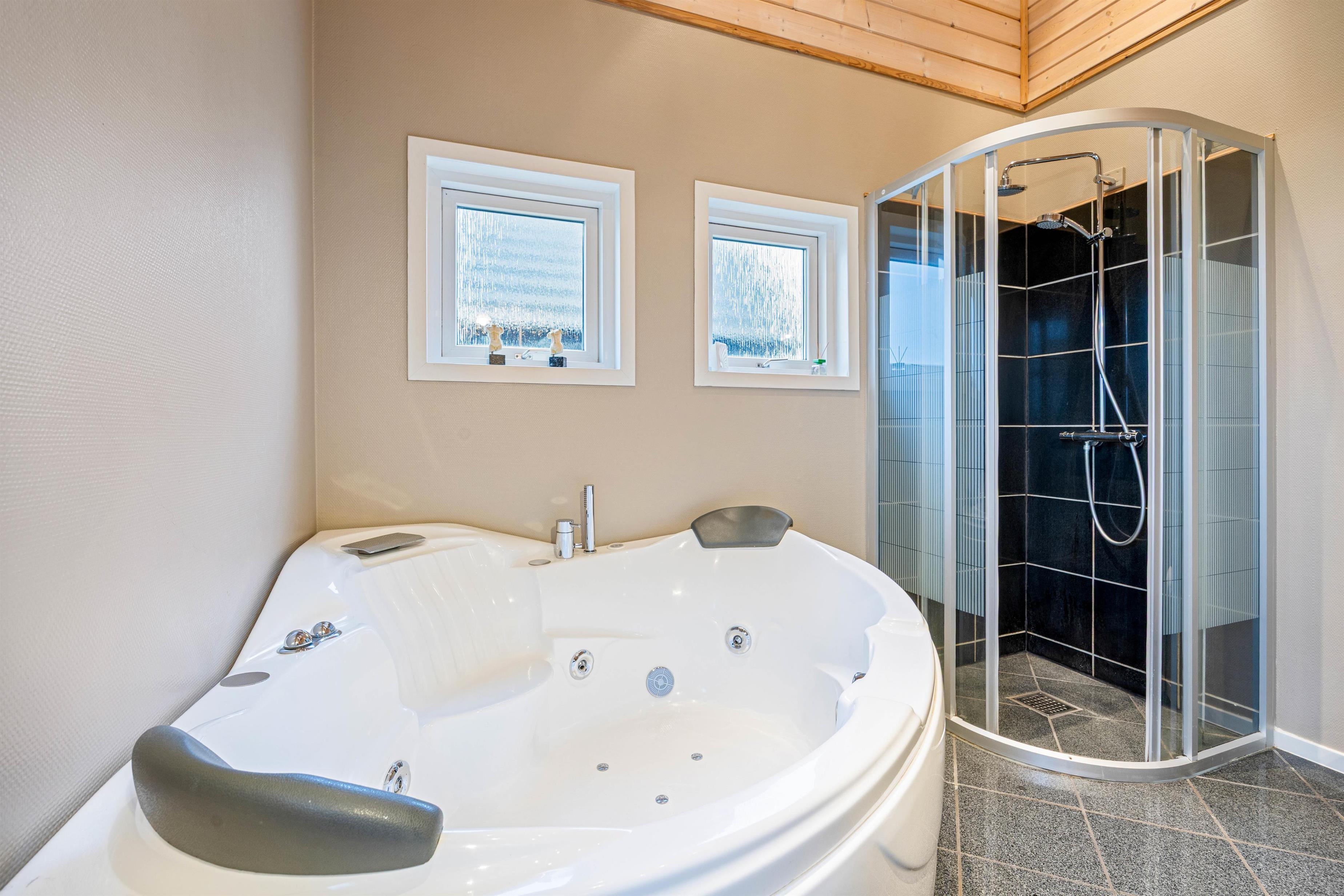 Udover et stort og lækkert badeværelse er der også et gæstetoilet med gulvvarme. På badeværelset er der gulvvarme, bruseniche, 2 personers hjørnespa og en sauna. Køkkenet er stort og godt indrettet med alle de moderne hjælpemidler, man kan ønske sig. Stuen er placeret i den vestlige del af feriehuset og er hyggeligt indrettet med gode møbler.
