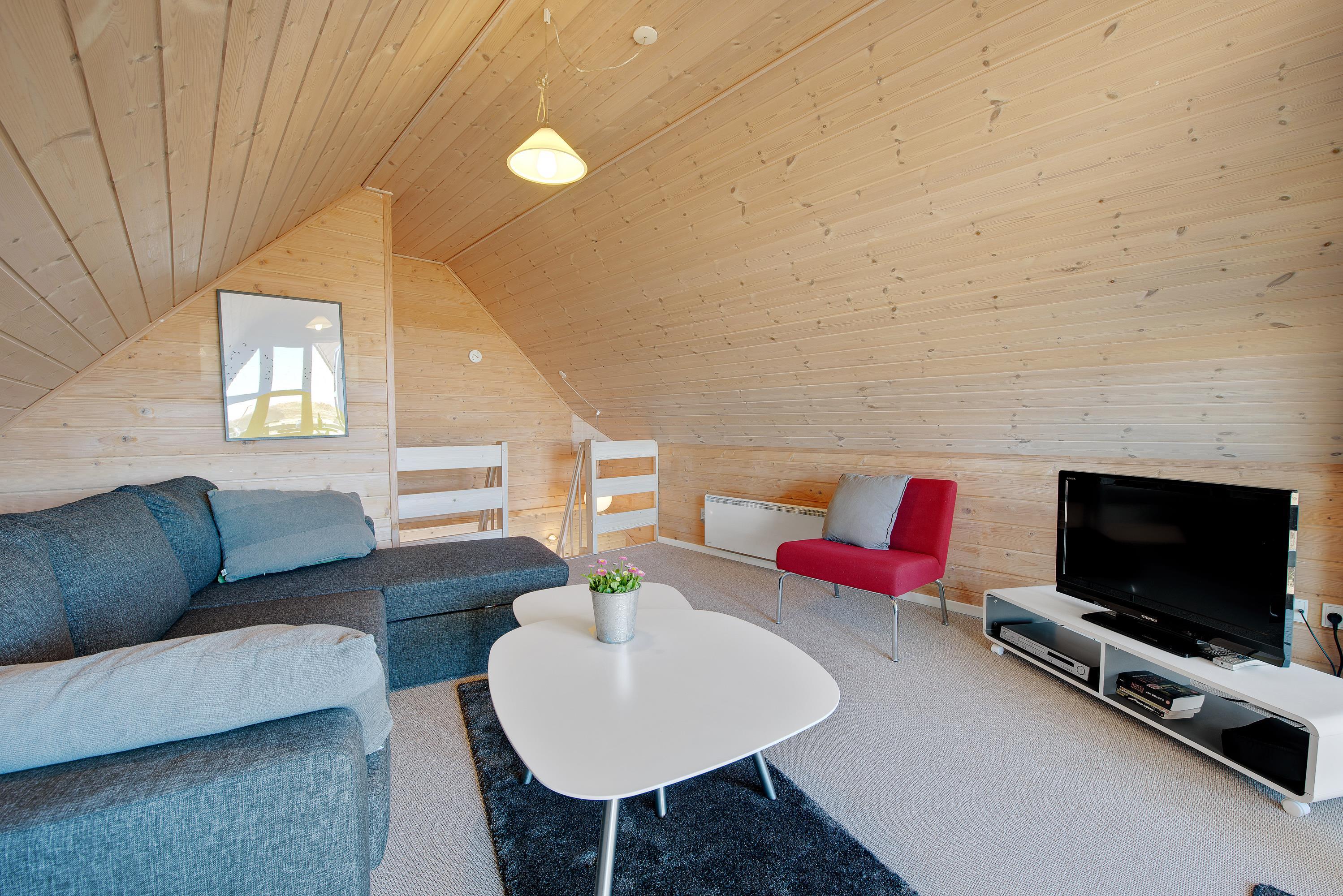 På 1. sal er der en lille stue med en sofa og et TV, og fra stuen og fra den lille altan er der en helt uovertruffen udsigt mod syd og mod sydvest. Slap af med en god kop kaffe - eller et glas vin - mens I nyder klitlandskabet og solnedgangen over klitterne. Det er tilladt at medbringe 2 hunde i dette sommerhus.