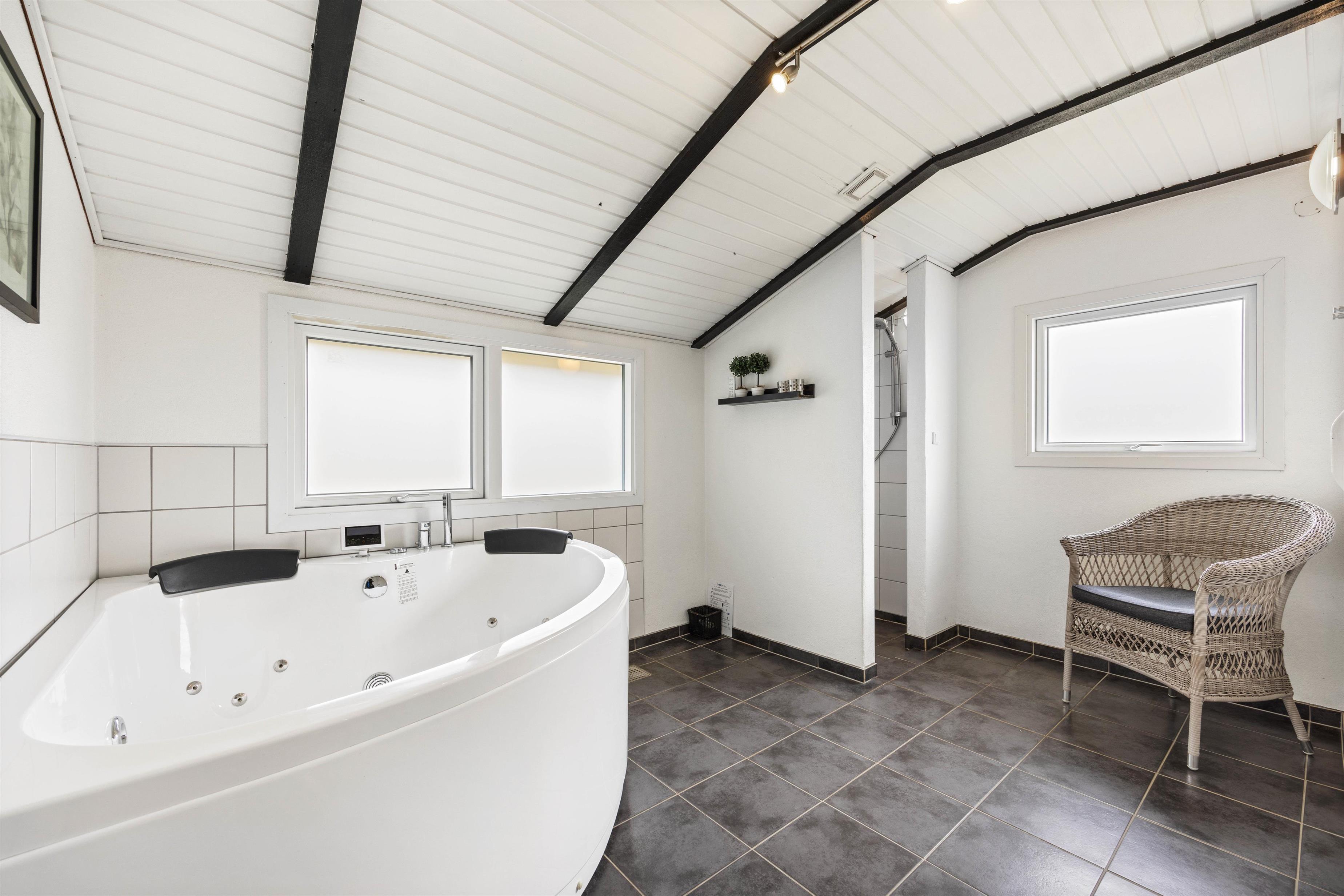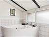 De 2 badeværelser har begge en bruseniche og det store har endvidere gulvvarme. Her finder I desuden en skøn wellnessafdeling med både spabad og sauna. Her er altså rig mulighed for afslapning og velvære i løbet af ferien. Gæstebadeværelset er renoveret med fliser og toiletmøbler.