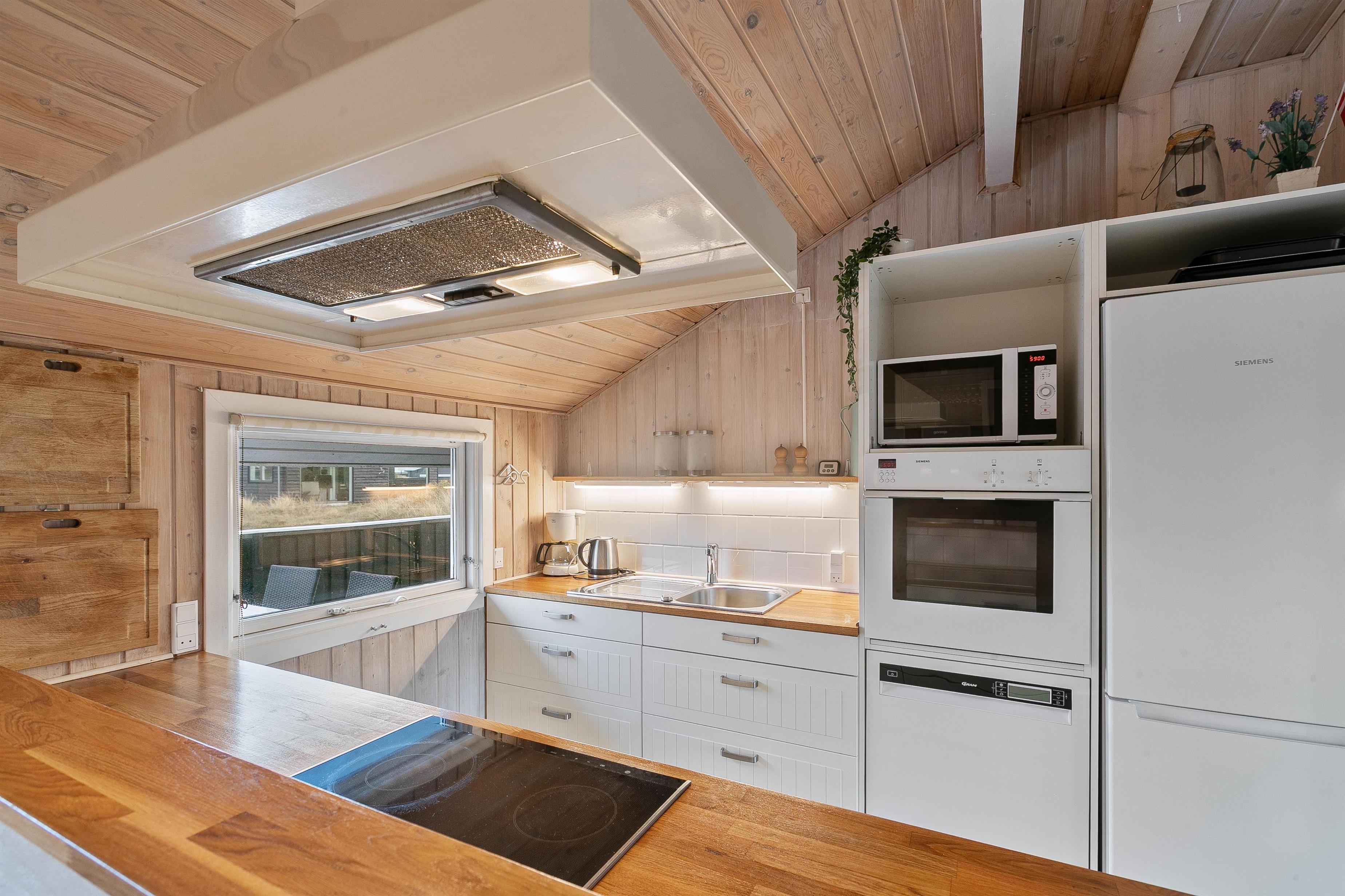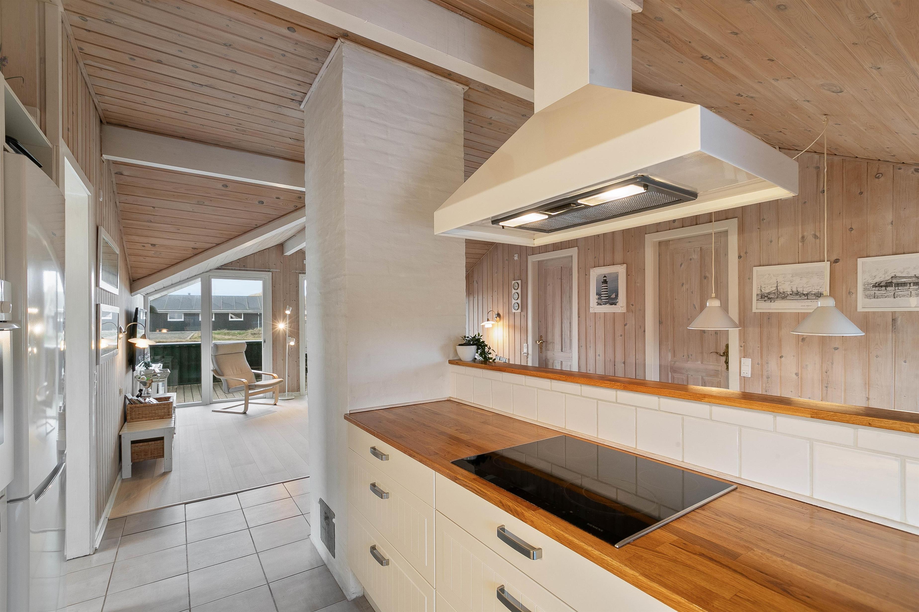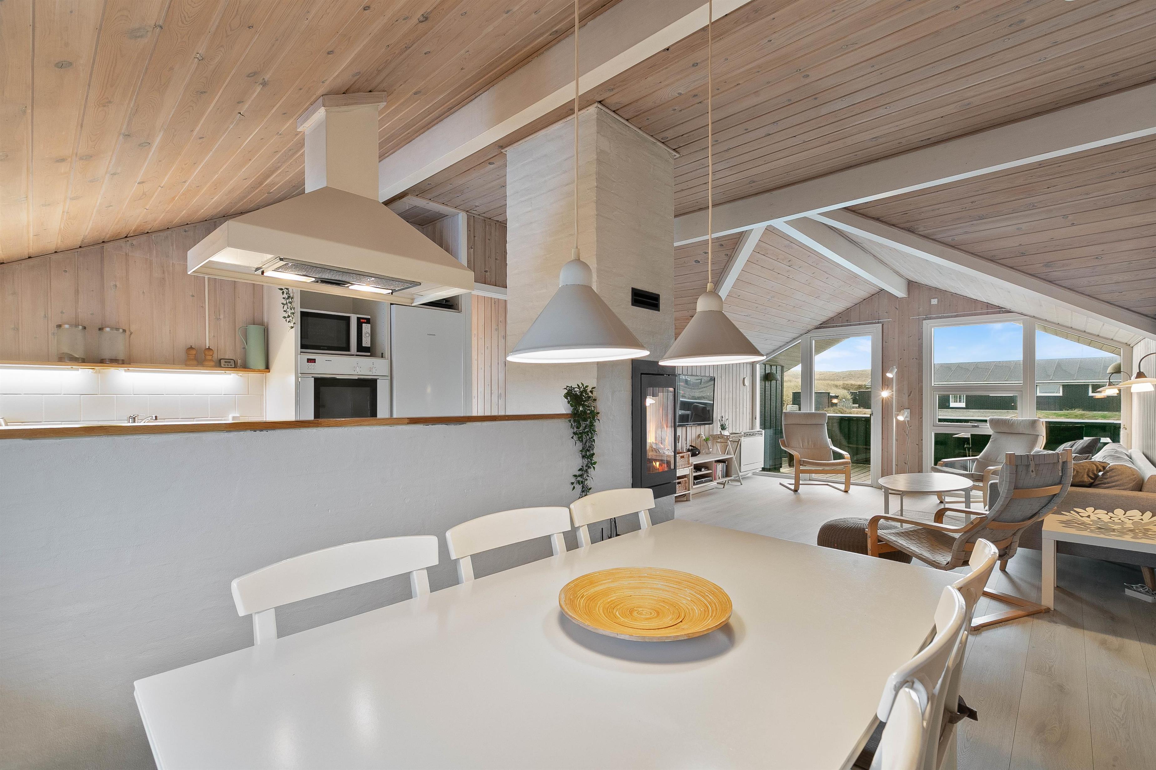 Feriehuset er renoveret i 2020 med bl.a. nyt køkken og bad. Den hyggelige stue indbyder til total afslapning og er feriehusets centrum, med den hyggelige spisekrog og åbent ind til køkkenafdelingen. Herfra kan man nemt være en del af selskabet i stuen – også under madlavningen. Køkkenet er praktisk indrettet med bl.a. opvaskemaskine og mikroovn.