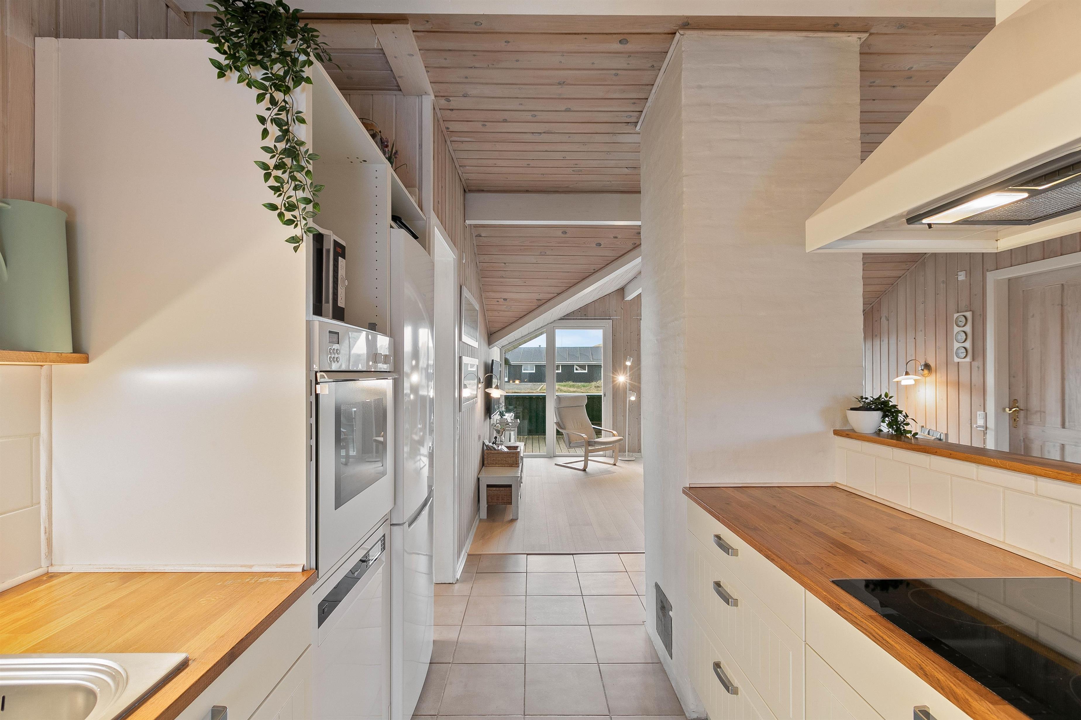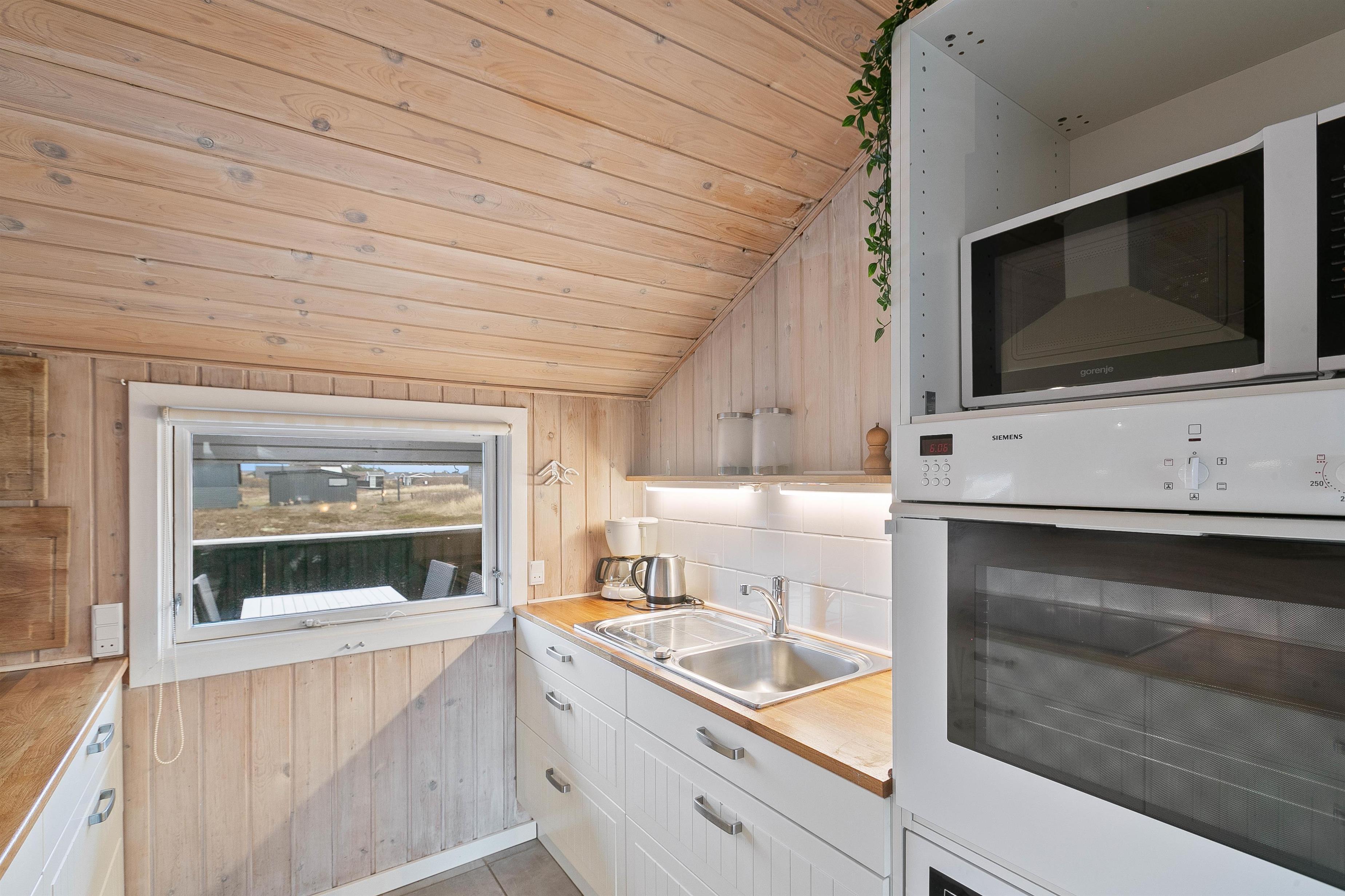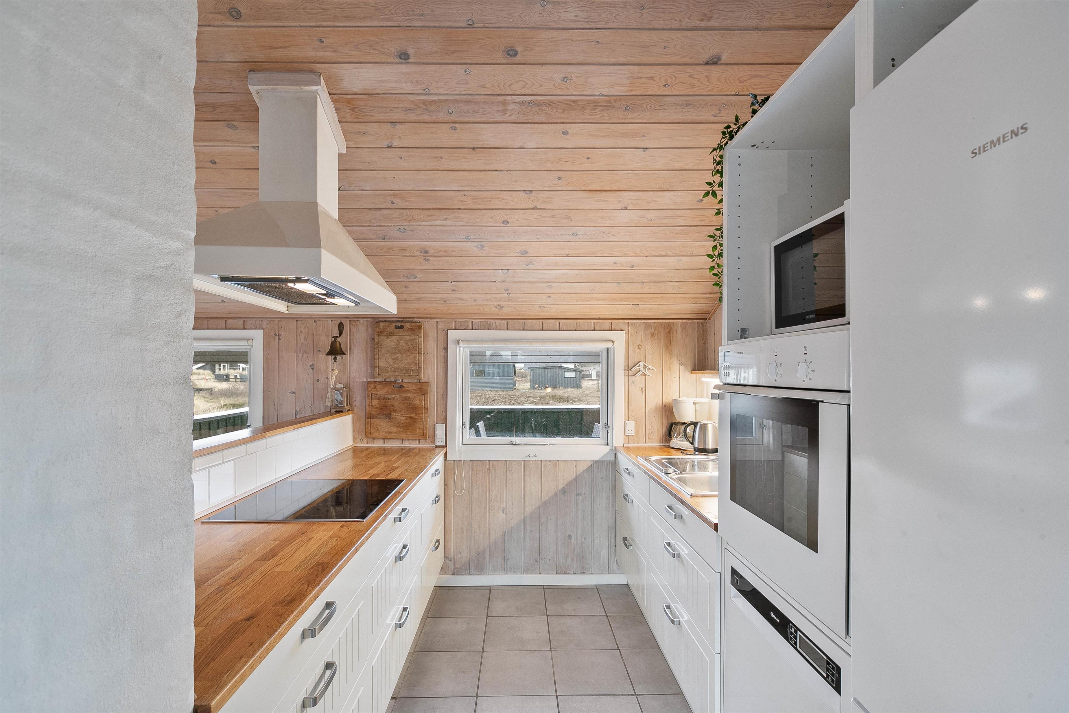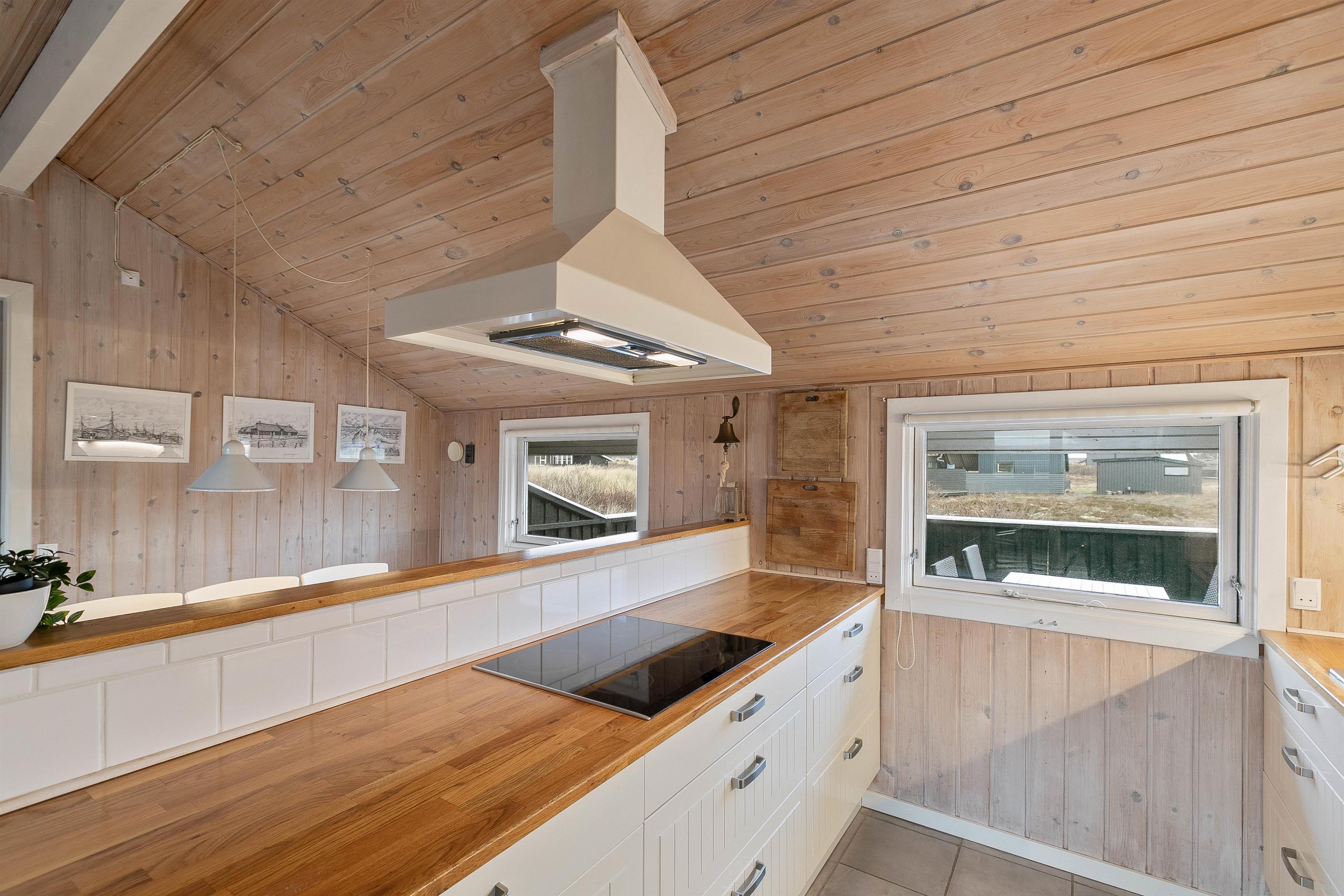 Feriehuset er renoveret i 2020 med bl.a. nyt køkken og bad. Den hyggelige stue indbyder til total afslapning og er feriehusets centrum, med den hyggelige spisekrog og åbent ind til køkkenafdelingen. Herfra kan man nemt være en del af selskabet i stuen – også under madlavningen. Køkkenet er praktisk indrettet med bl.a. opvaskemaskine og mikroovn.