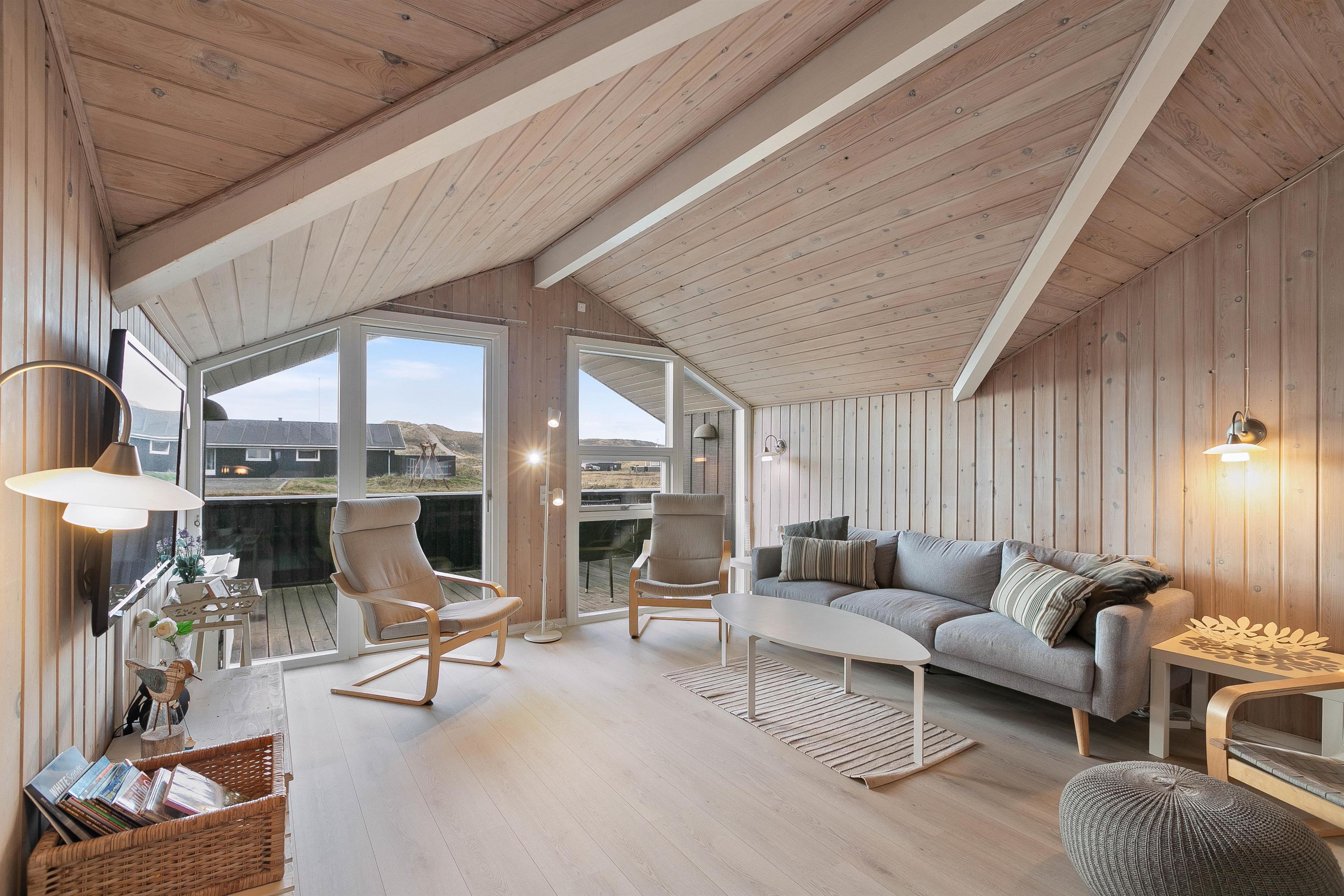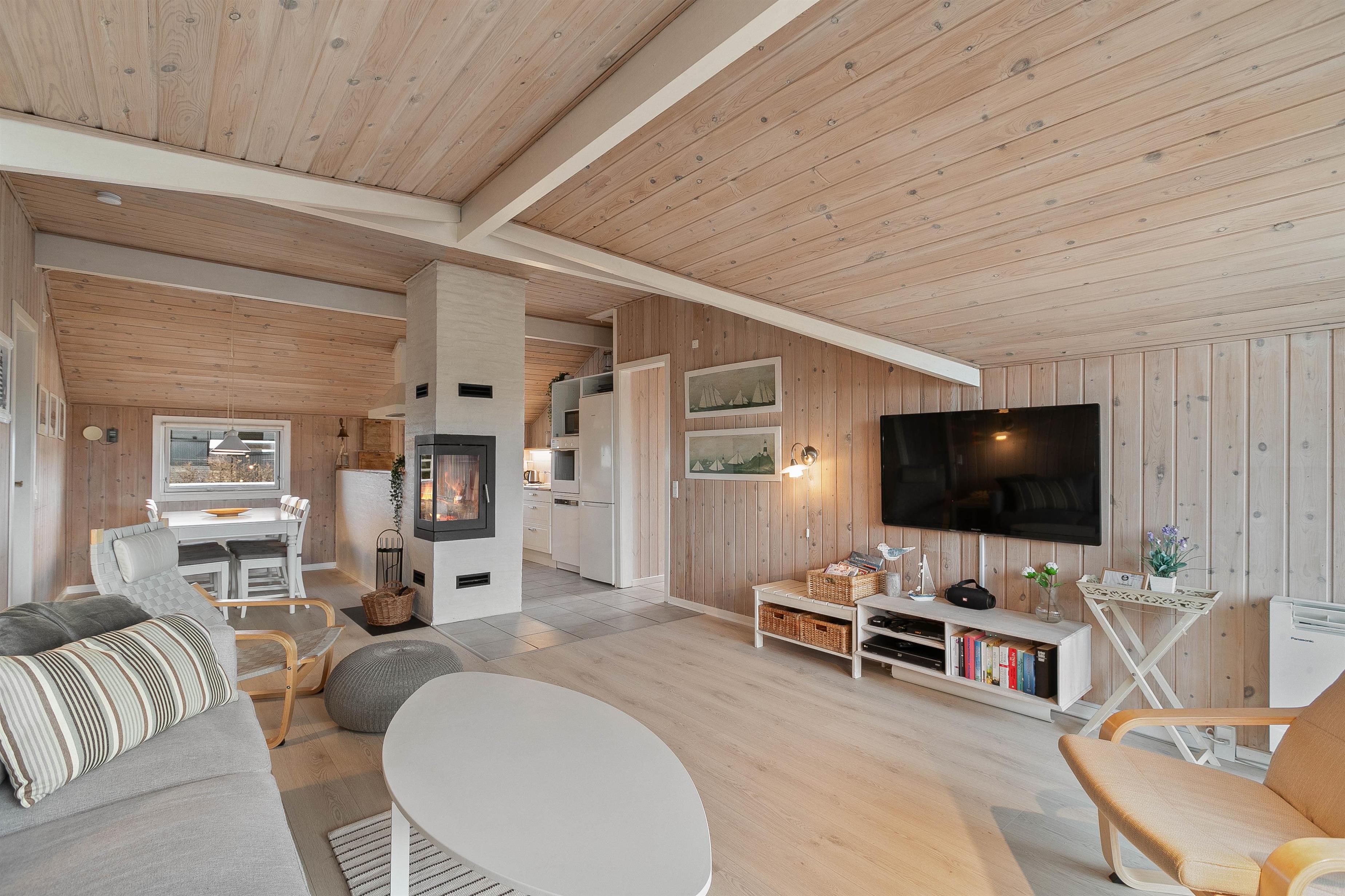 Indretningen er overalt holdt i lyse farver og hyggelig skandinavisk stil. På de køligere dage kan man nyde en spændende bog eller en god film – og tænde op i brændeovnen eller varmepumpen. TVét i stuen er et Apple TV, hvor du kan streame dine yndlingskanaler direkte.