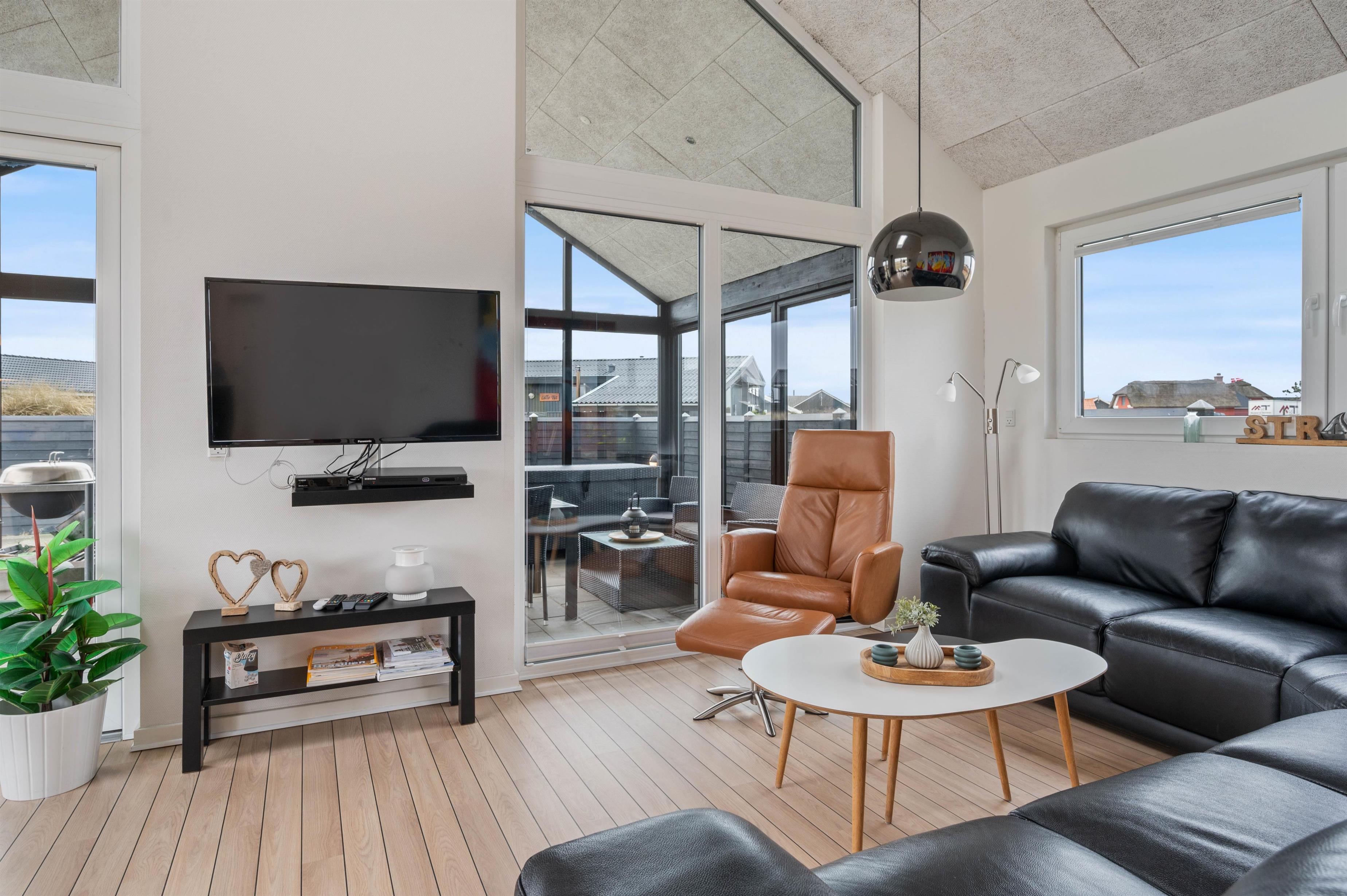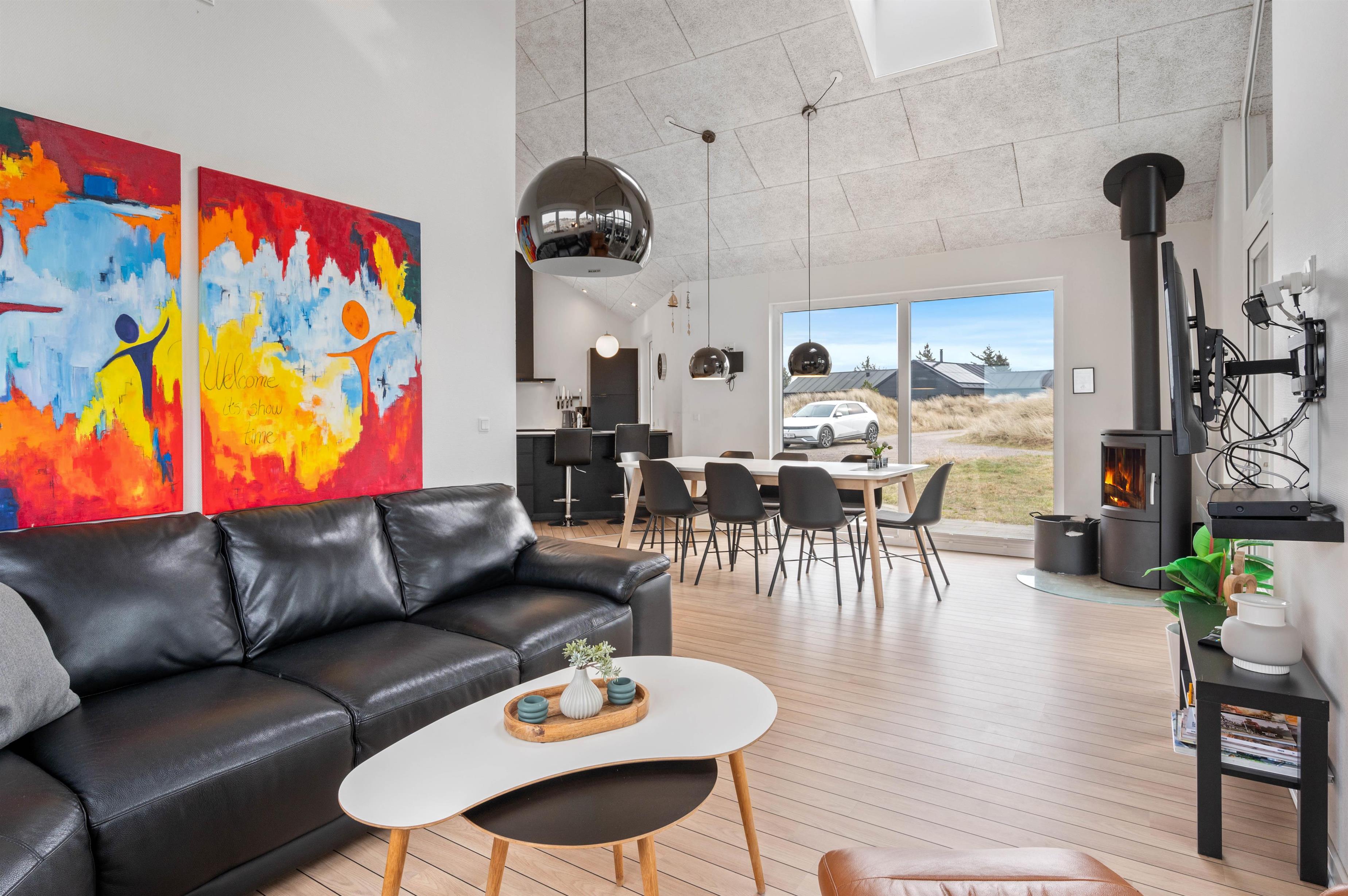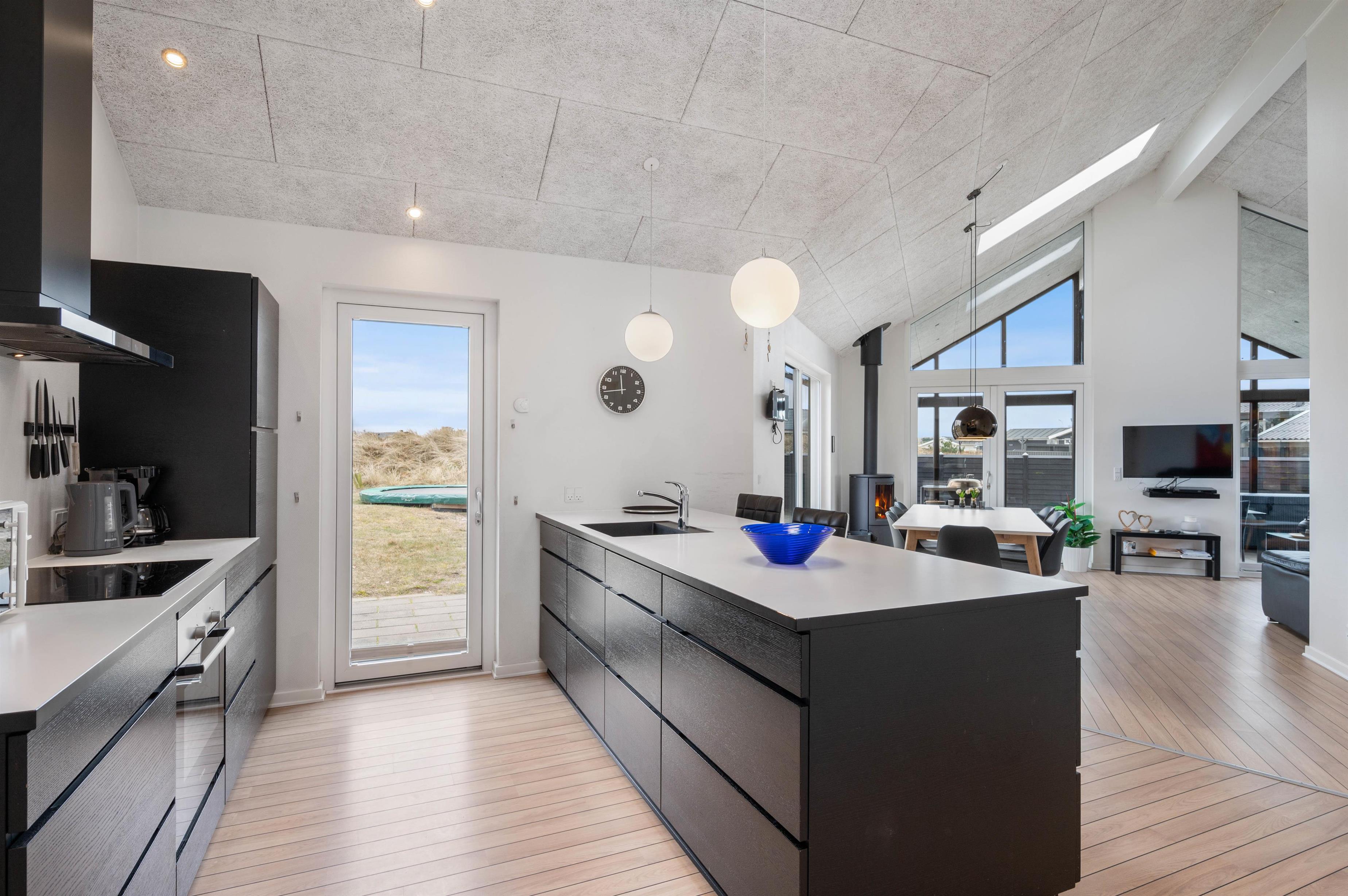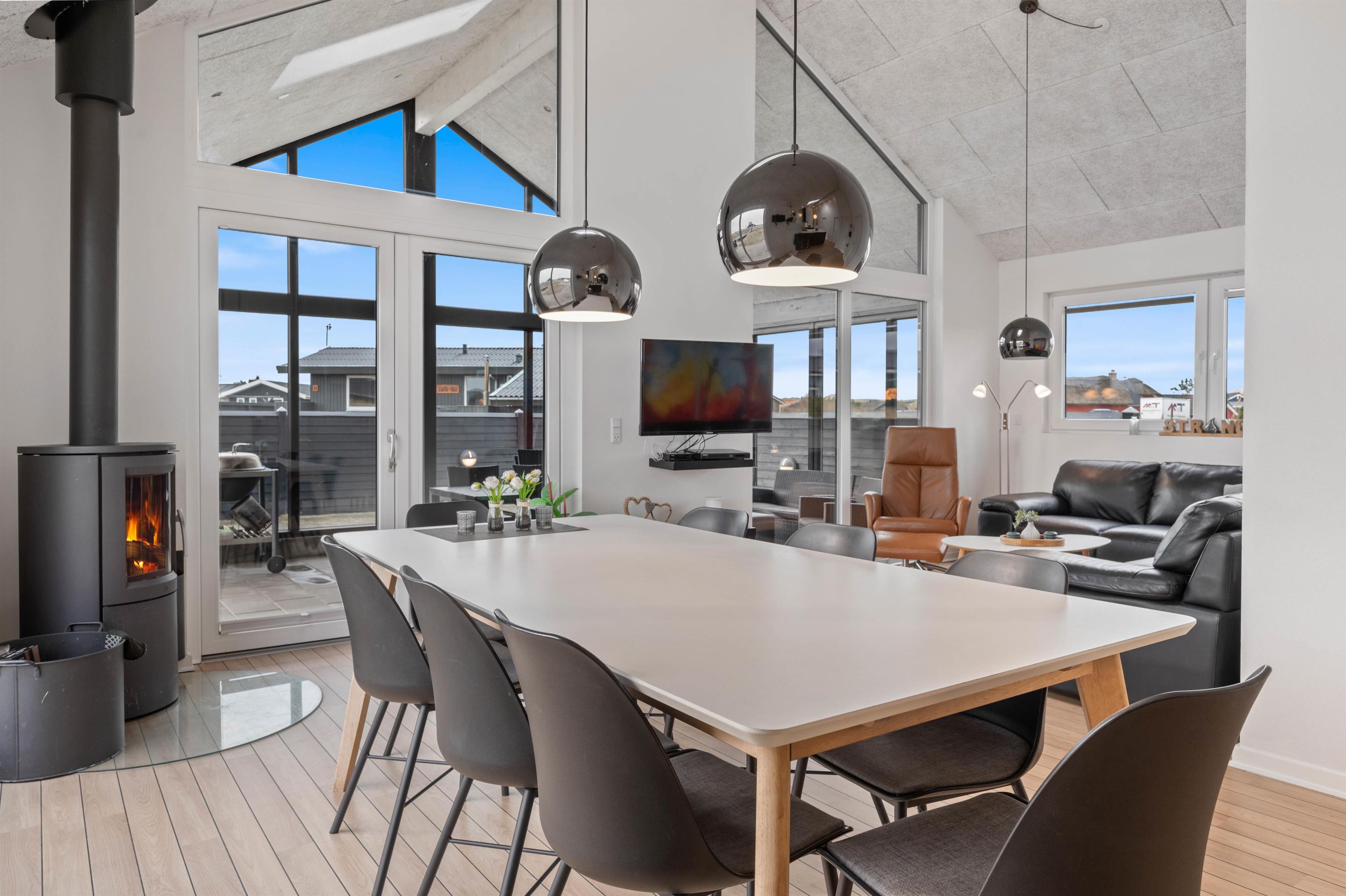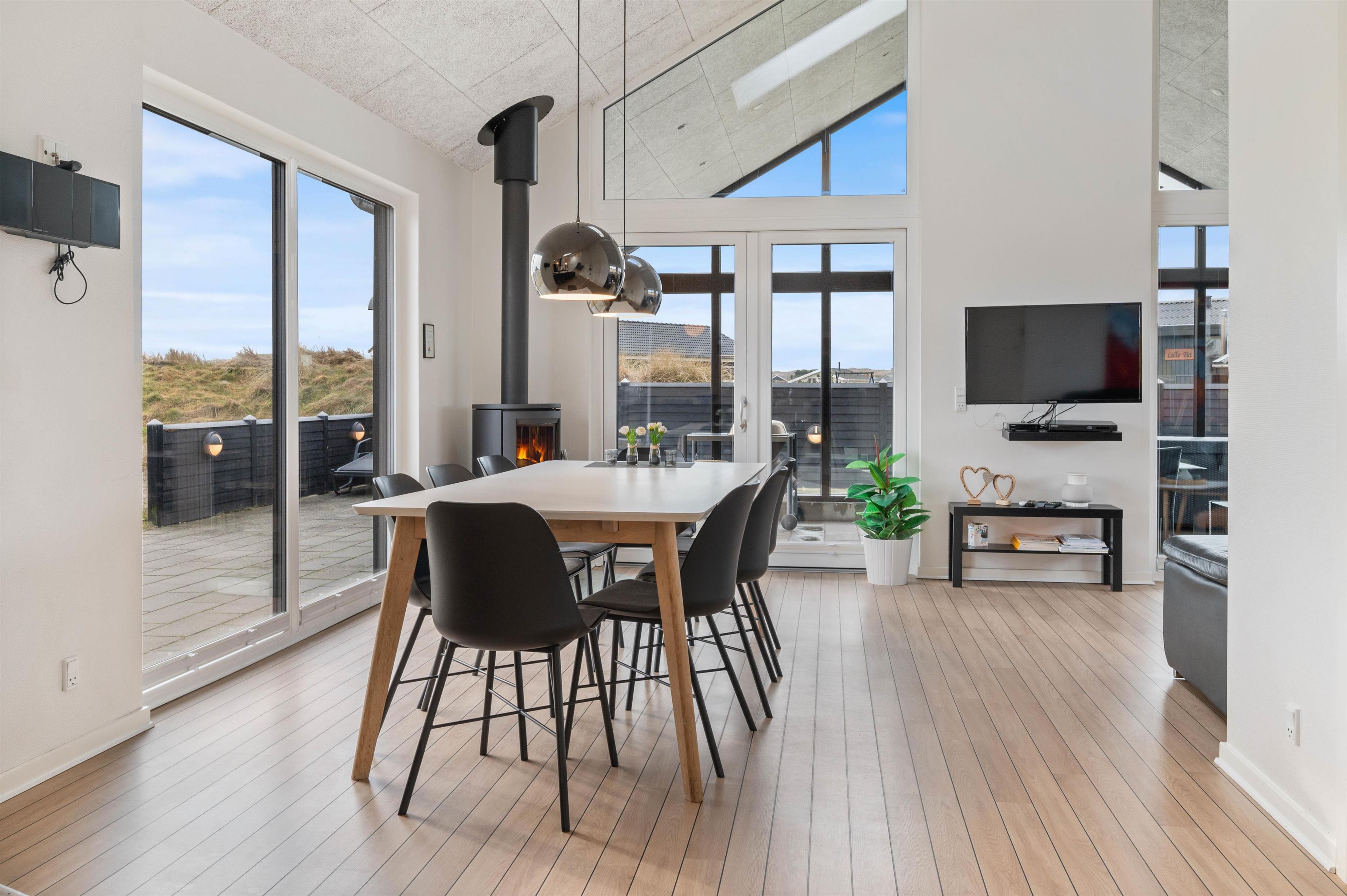 Sommerhusets indretning er moderne og meget lyst, hvilket lader feriehuset virke endnu større. Det åbne køkken ligger i forbindelse med opholdsrummet og skaber hermed et stort rum, hvor I sammen kan lave mad eller hygge på sofaen med en god film. Om aftenen kan du fyre op for brændeovnen, mens dagen afsluttes med et dejligt glas vin. Sommerhuset har fire gode soverum med egen fladskærm. To værelser har dobbeltsenge og to værelser har hver to enkeltsenge. Fra et af værelserne med dobbeltseng er der direkte adgang til et af feriehusets tre badeværelser. I det store badeværelse finder du spaen, hvor du efter en lang gåtur ved stranden rigtig kan slappe af. Fra samme badeværelse har du også adgang til sommerhusets sauna.