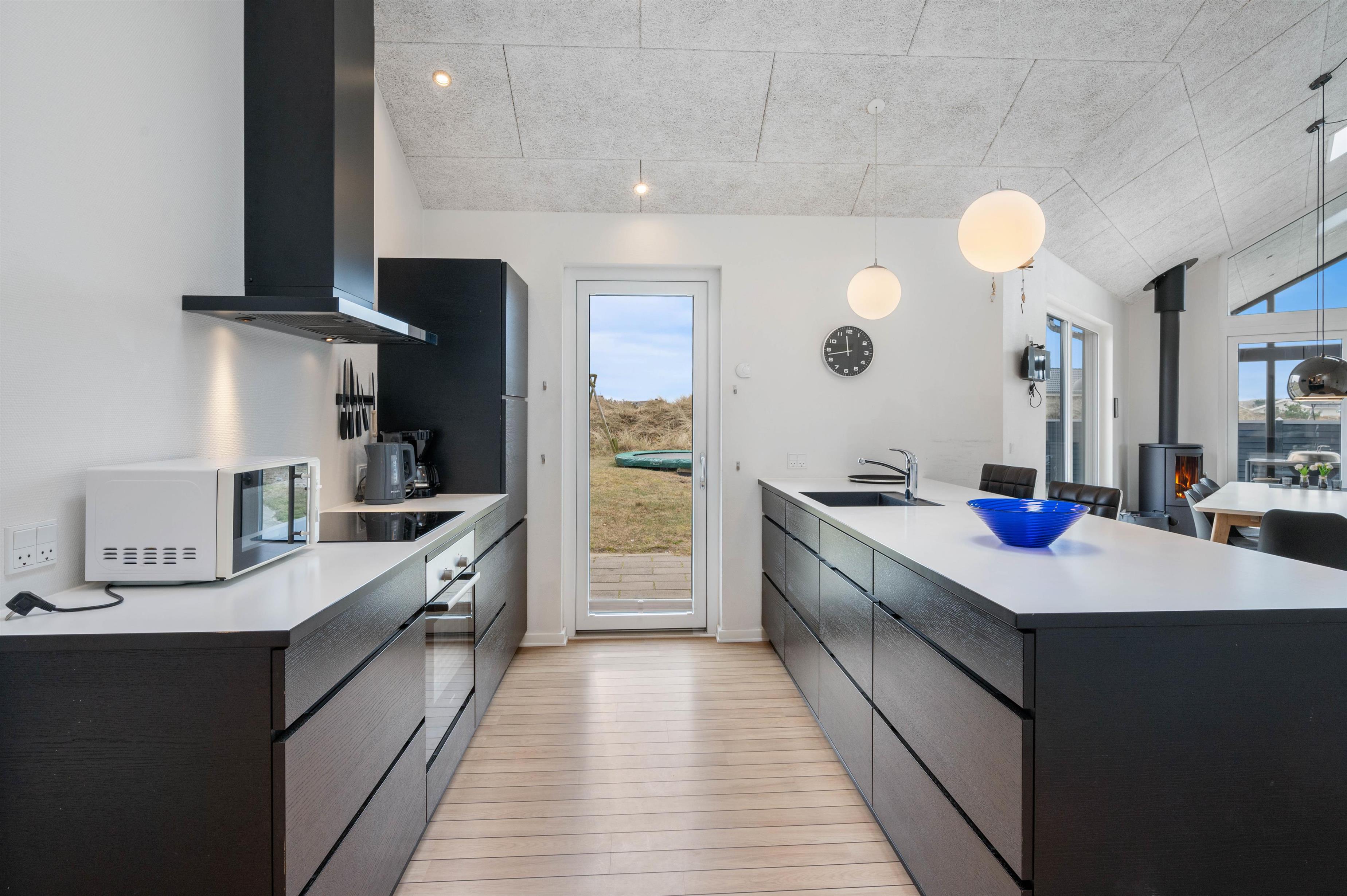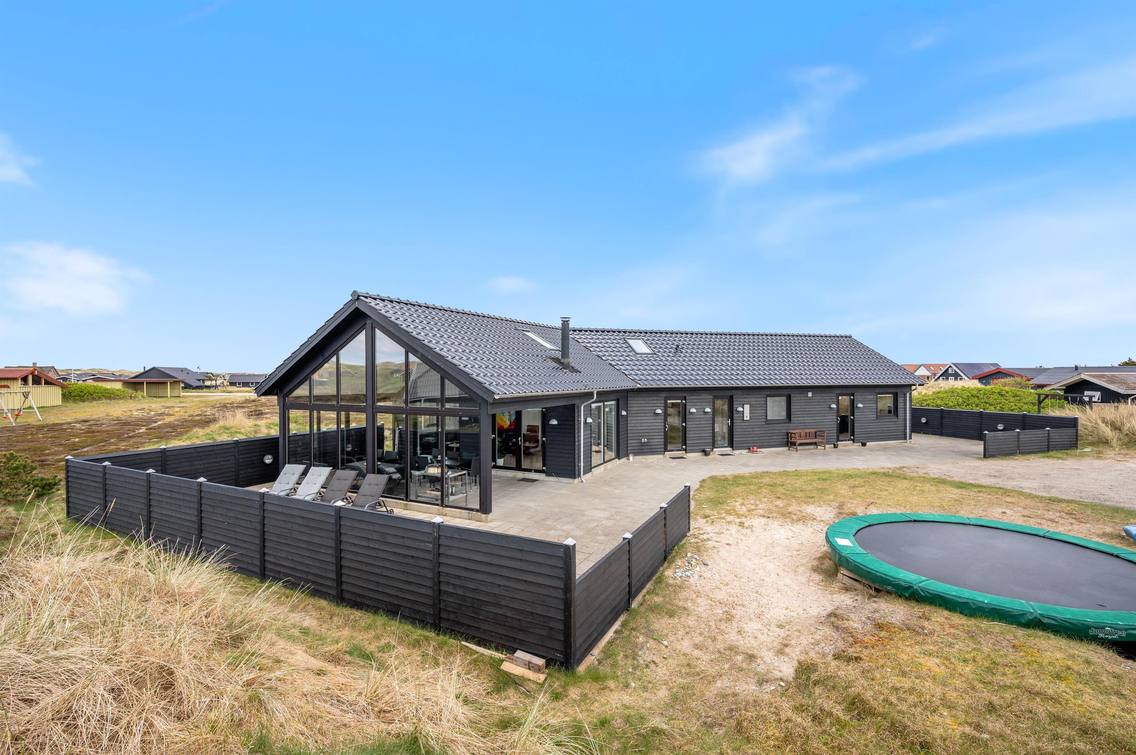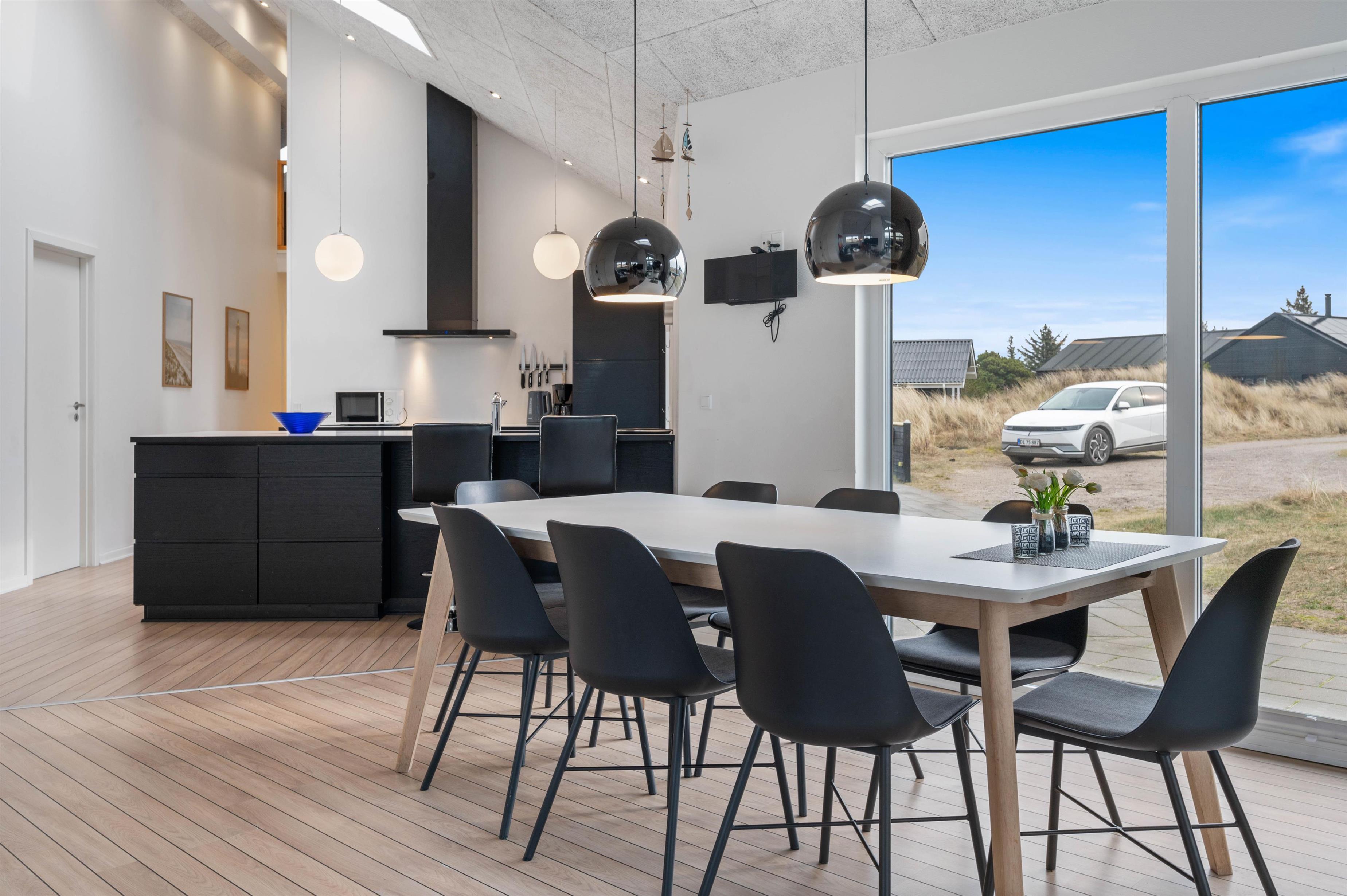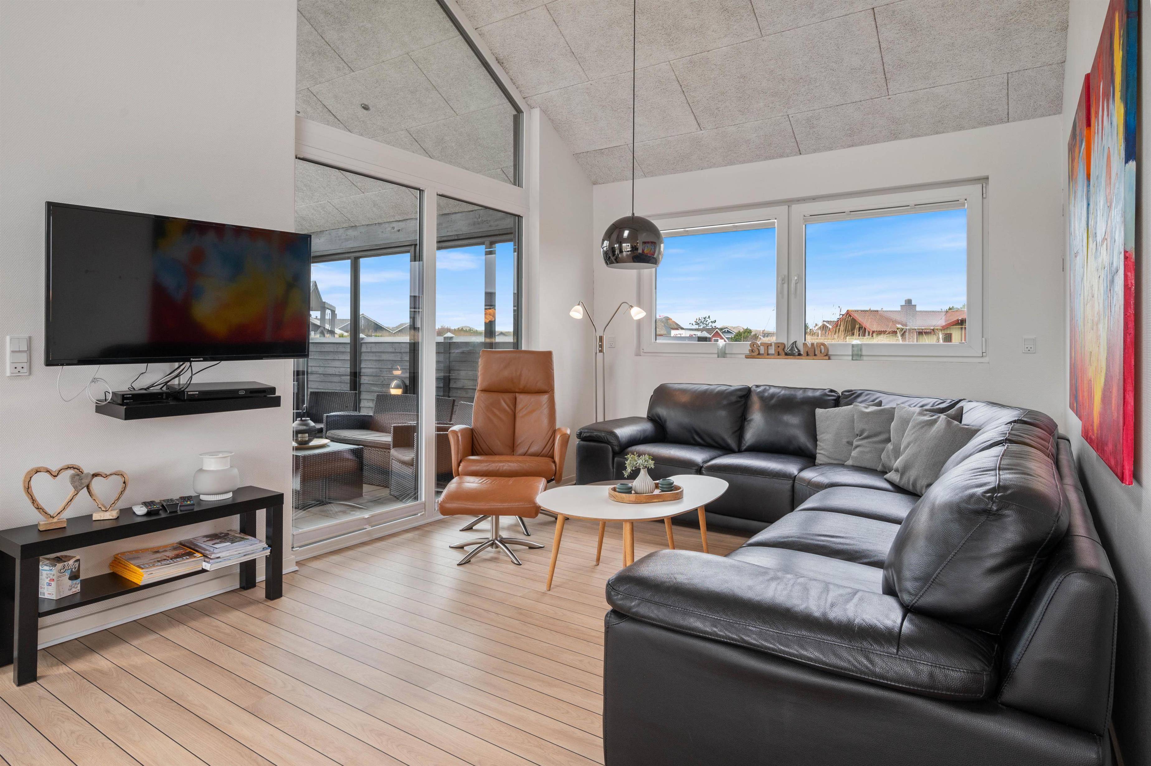 Sommerhusets indretning er moderne og meget lyst, hvilket lader feriehuset virke endnu større. Det åbne køkken ligger i forbindelse med opholdsrummet og skaber hermed et stort rum, hvor I sammen kan lave mad eller hygge på sofaen med en god film. Om aftenen kan du fyre op for brændeovnen, mens dagen afsluttes med et dejligt glas vin. Sommerhuset har fire gode soverum med egen fladskærm. To værelser har dobbeltsenge og to værelser har hver to enkeltsenge. Fra et af værelserne med dobbeltseng er der direkte adgang til et af feriehusets tre badeværelser. I det store badeværelse finder du spaen, hvor du efter en lang gåtur ved stranden rigtig kan slappe af. Fra samme badeværelse har du også adgang til sommerhusets sauna.