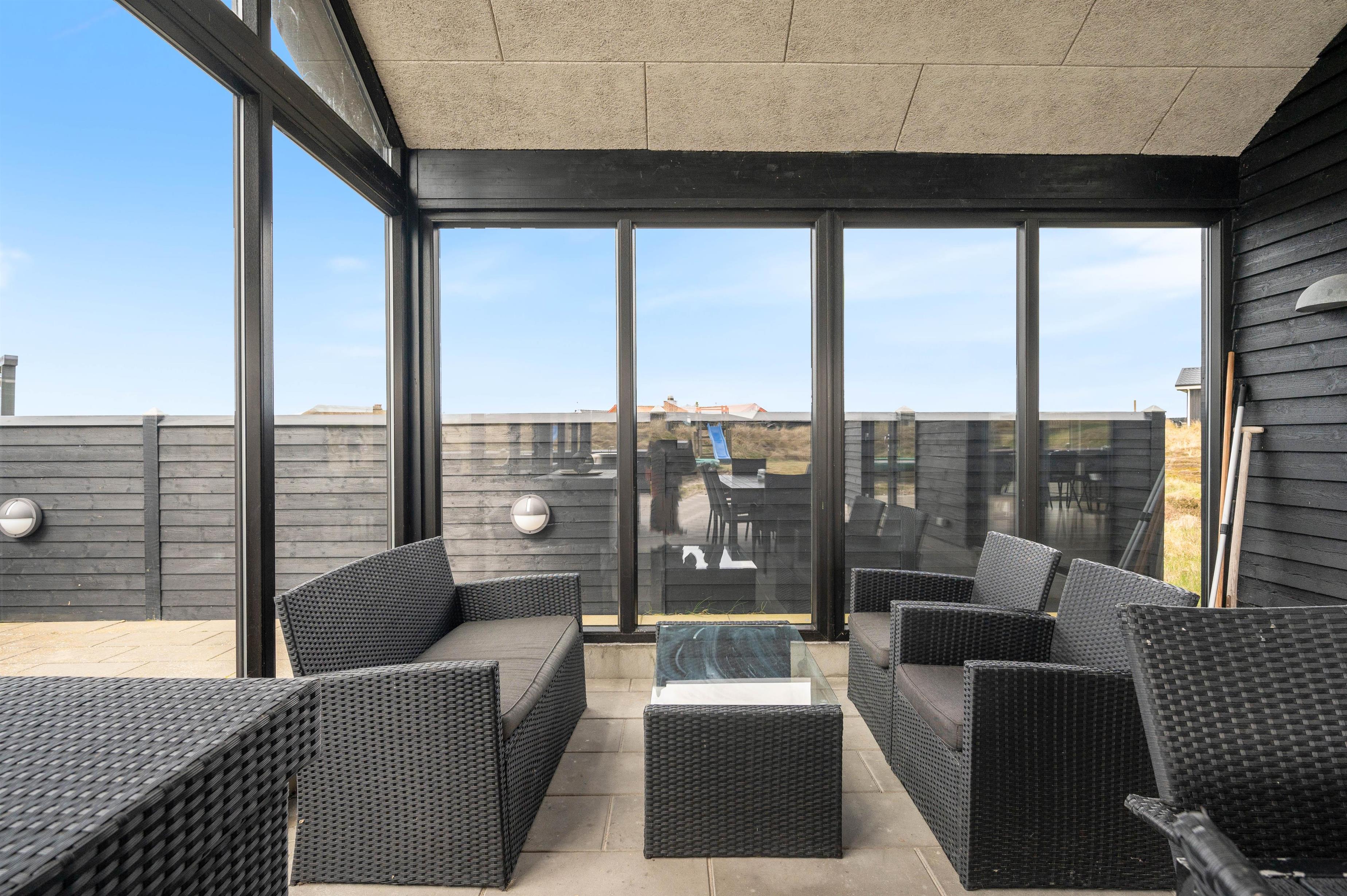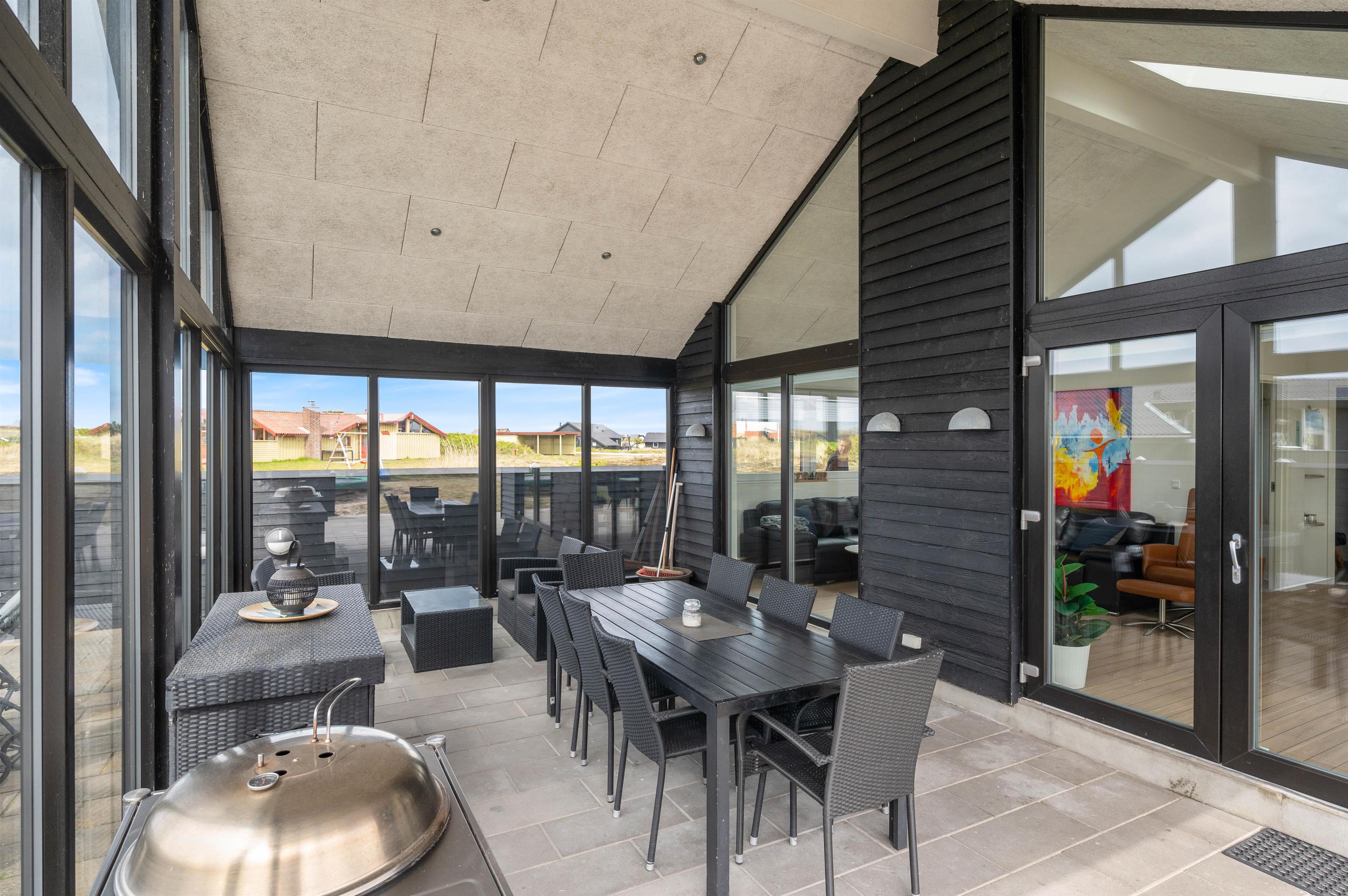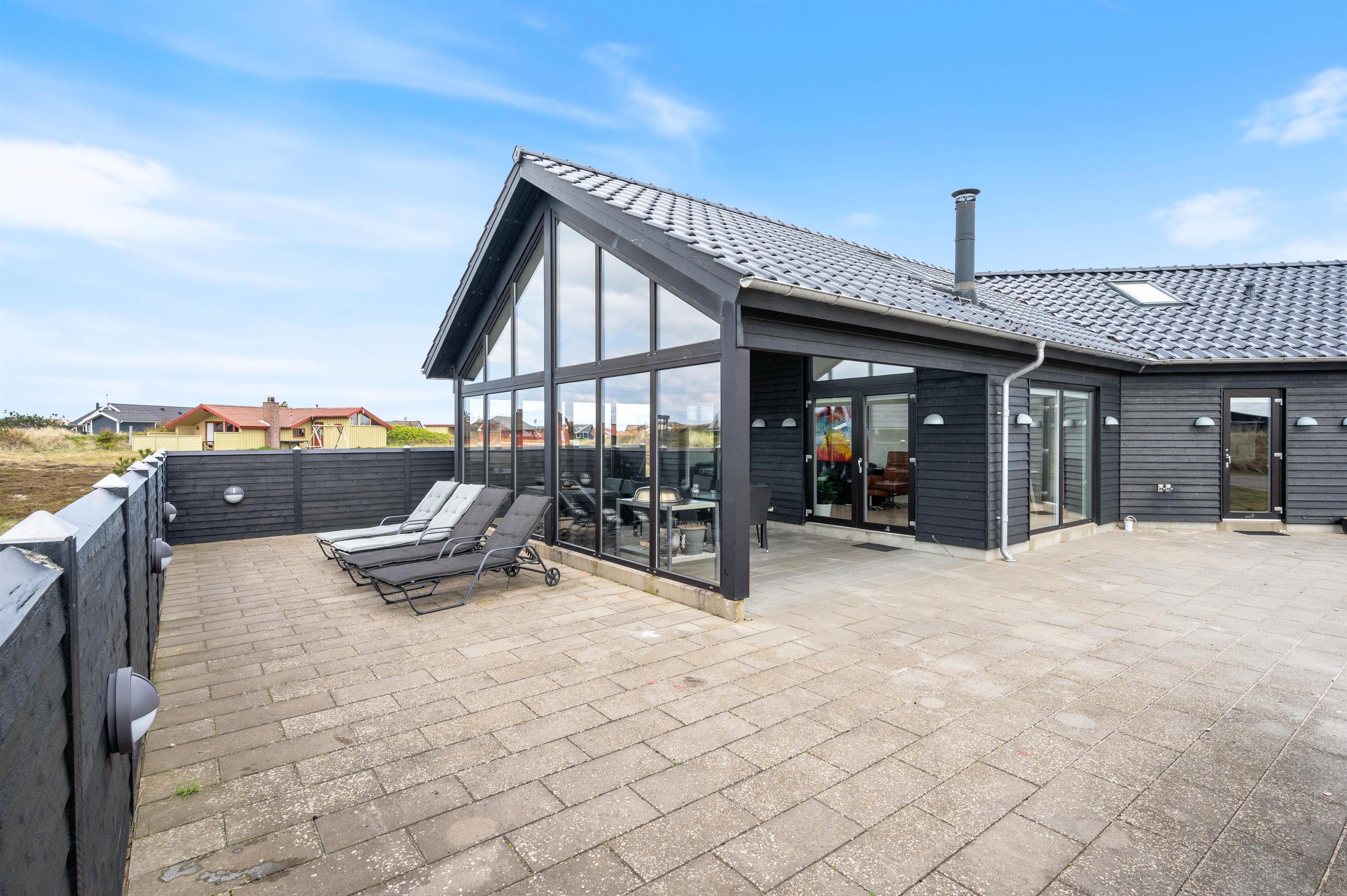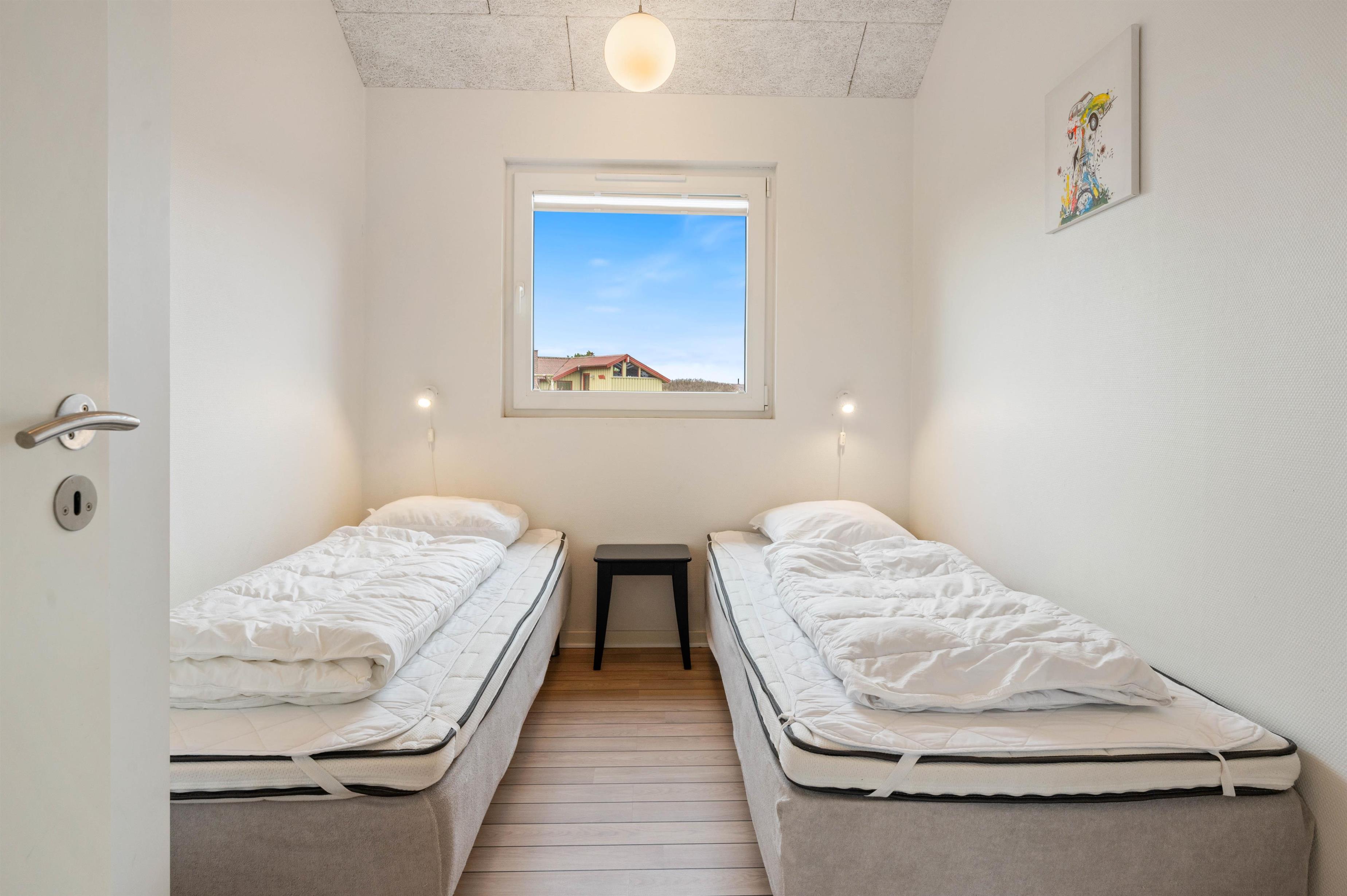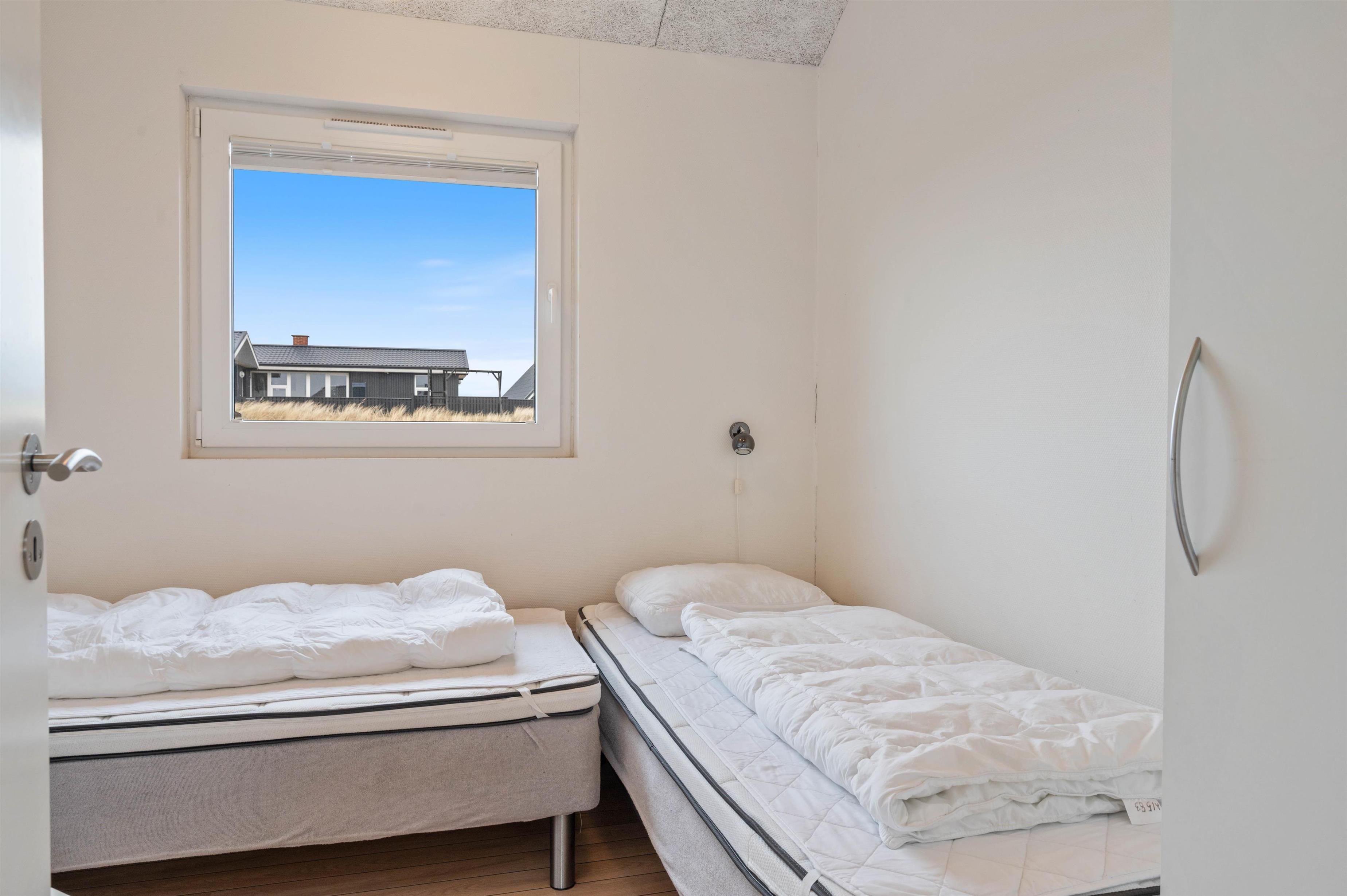 Sommerhusets indretning er moderne og meget lyst, hvilket lader feriehuset virke endnu større. Det åbne køkken ligger i forbindelse med opholdsrummet og skaber hermed et stort rum, hvor I sammen kan lave mad eller hygge på sofaen med en god film. Om aftenen kan du fyre op for brændeovnen, mens dagen afsluttes med et dejligt glas vin. Sommerhuset har fire gode soverum med egen fladskærm. To værelser har dobbeltsenge og to værelser har hver to enkeltsenge. Fra et af værelserne med dobbeltseng er der direkte adgang til et af feriehusets tre badeværelser. I det store badeværelse finder du spaen, hvor du efter en lang gåtur ved stranden rigtig kan slappe af. Fra samme badeværelse har du også adgang til sommerhusets sauna.