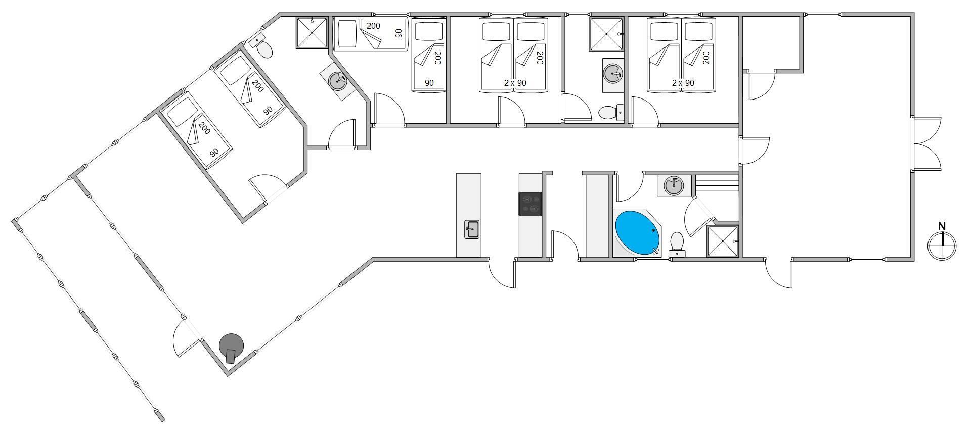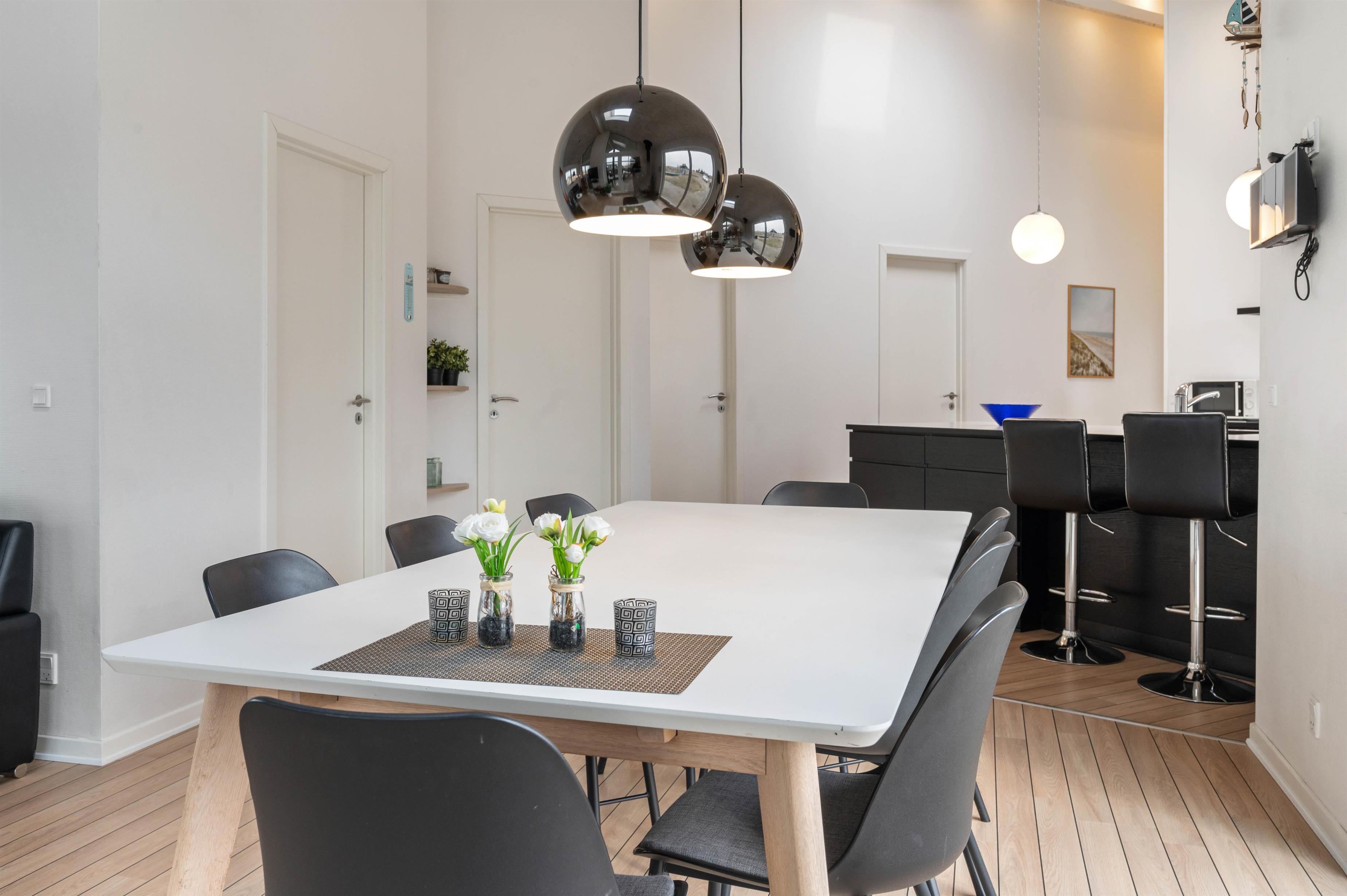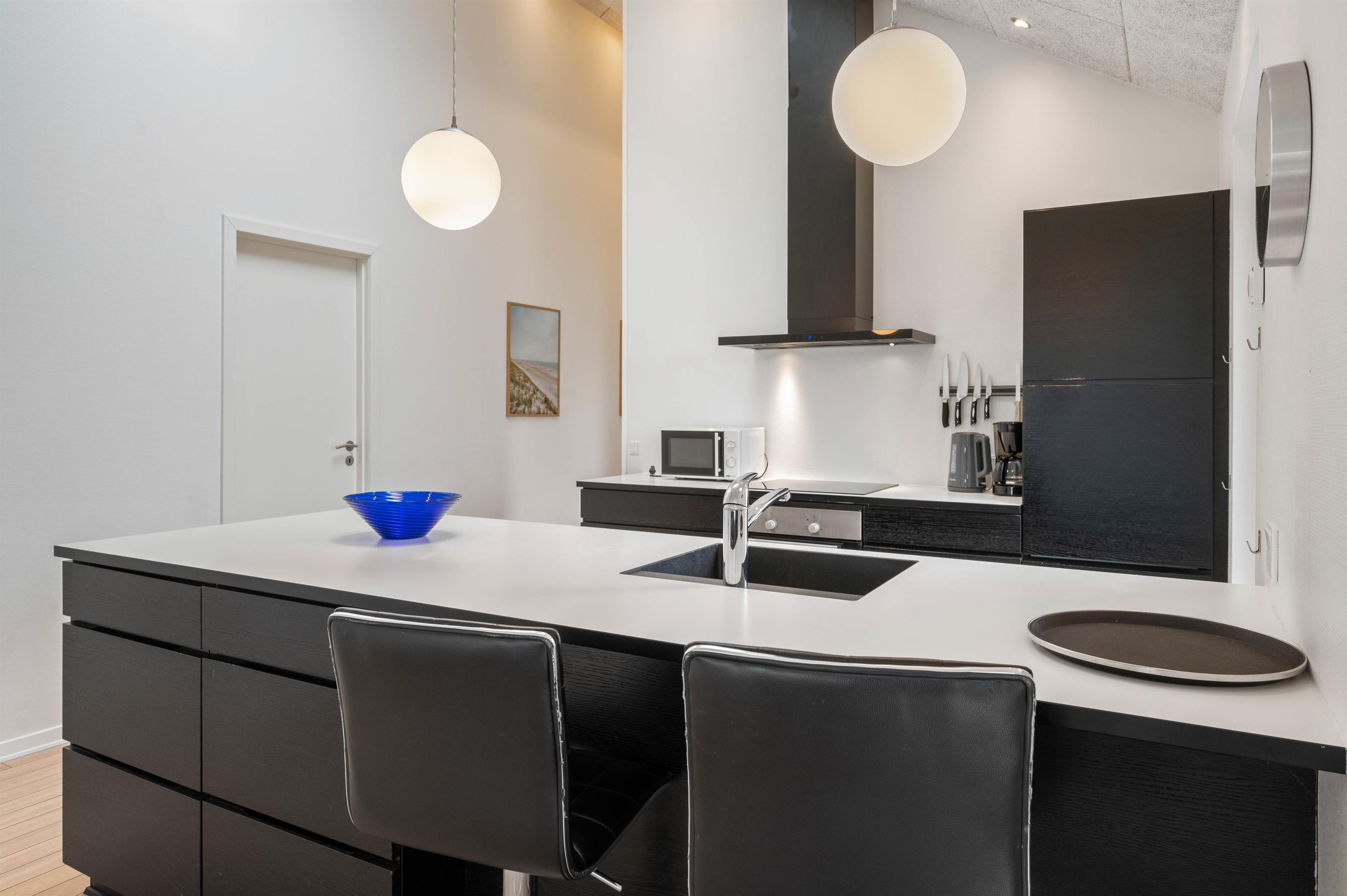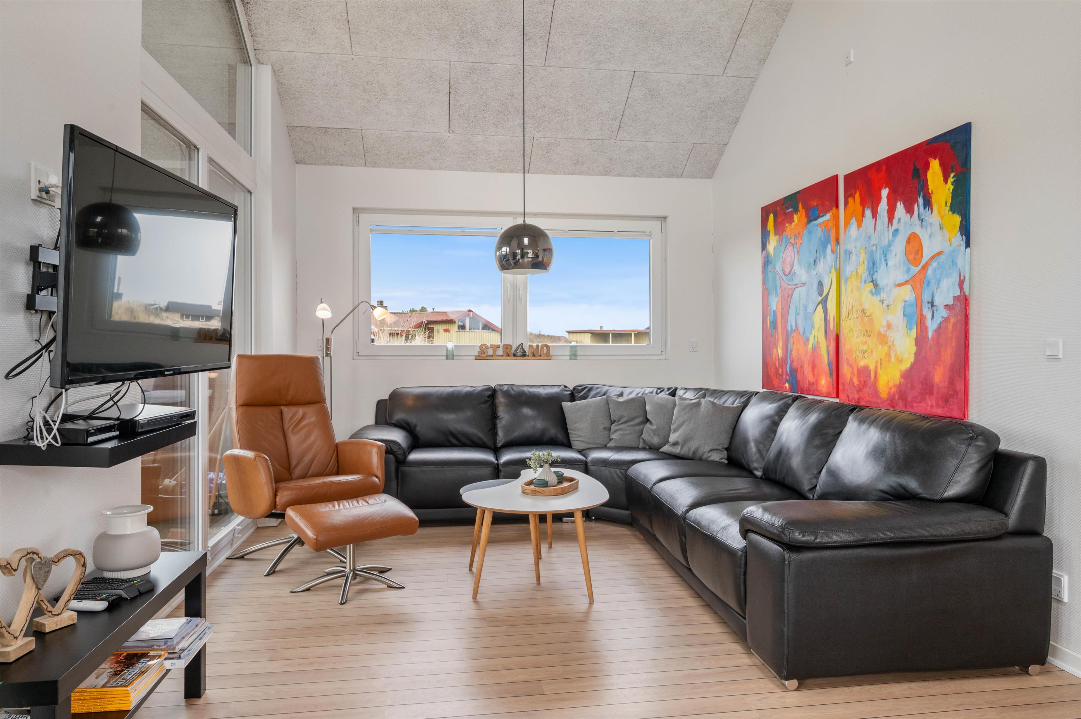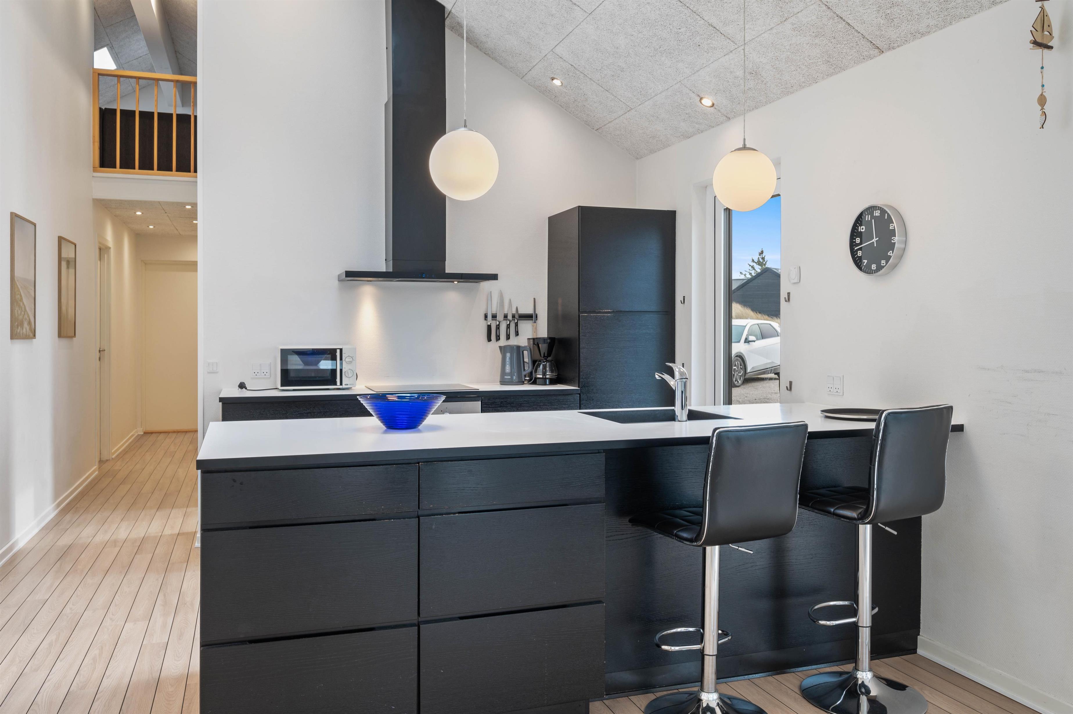 Sommerhusets indretning er moderne og meget lyst, hvilket lader feriehuset virke endnu større. Det åbne køkken ligger i forbindelse med opholdsrummet og skaber hermed et stort rum, hvor I sammen kan lave mad eller hygge på sofaen med en god film. Om aftenen kan du fyre op for brændeovnen, mens dagen afsluttes med et dejligt glas vin. Sommerhuset har fire gode soverum med egen fladskærm. To værelser har dobbeltsenge og to værelser har hver to enkeltsenge. Fra et af værelserne med dobbeltseng er der direkte adgang til et af feriehusets tre badeværelser. I det store badeværelse finder du spaen, hvor du efter en lang gåtur ved stranden rigtig kan slappe af. Fra samme badeværelse har du også adgang til sommerhusets sauna.