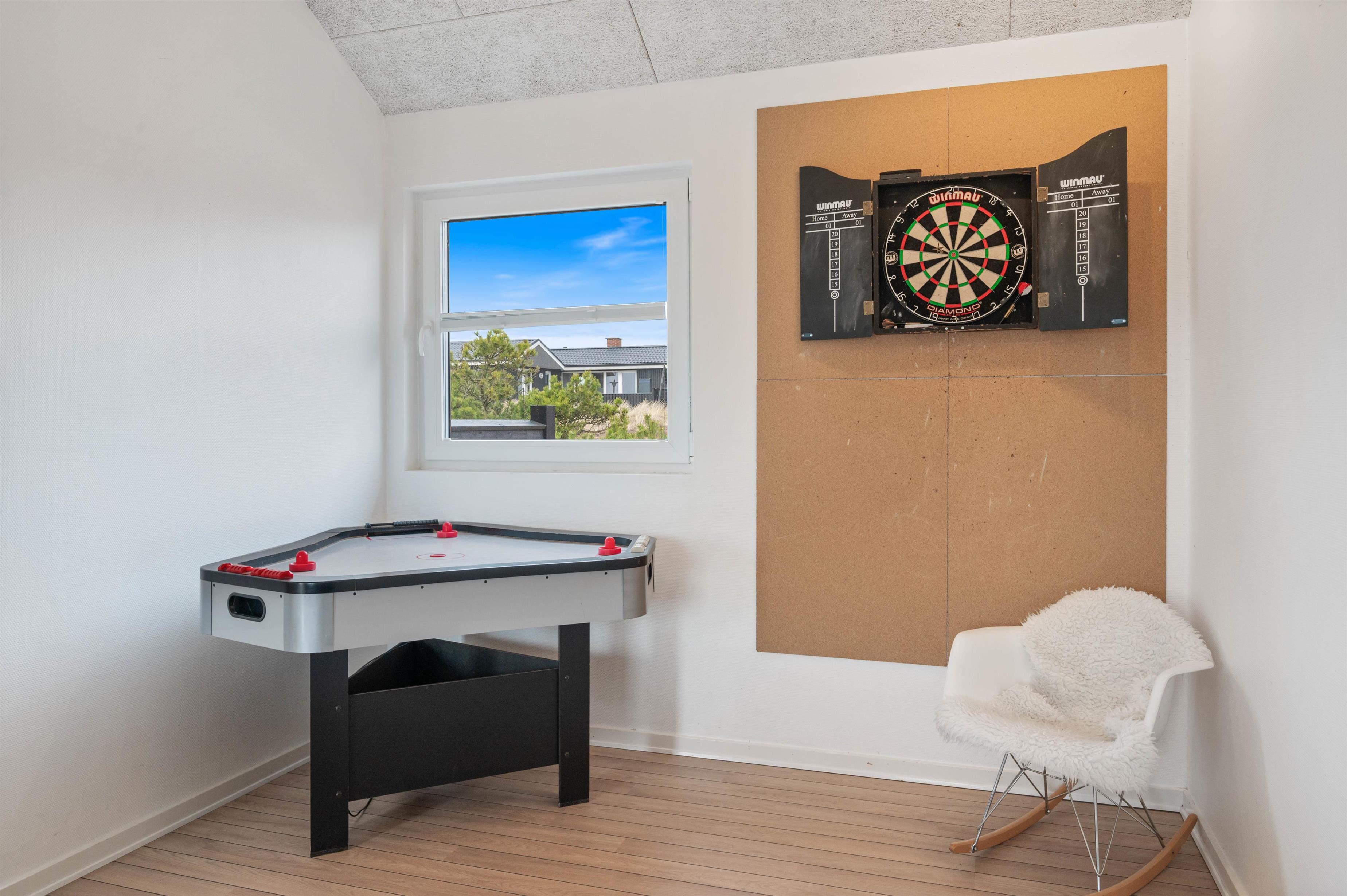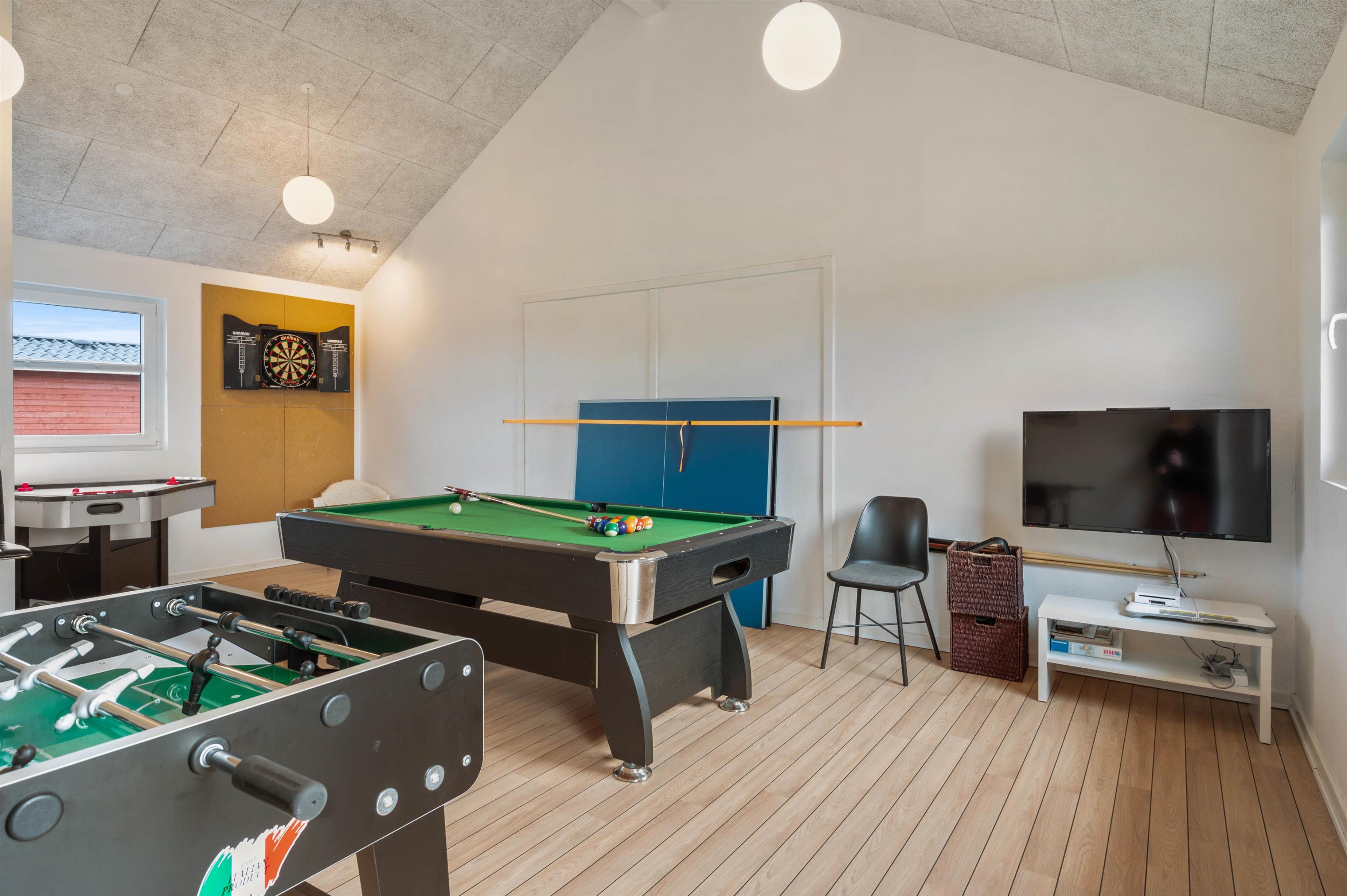 På en regnvejrsdag kan du og din familie også tilbringe mange sjove timer indenfor. Feriehusets har nemlig et stort aktivitetsrum, hvor I blandt andet kan udfordre hinanden i pool, dart eller bordfodbold. Der findes også en fladskærm her, hvor du kan tilslutte jeres medbragte spillekonsol.